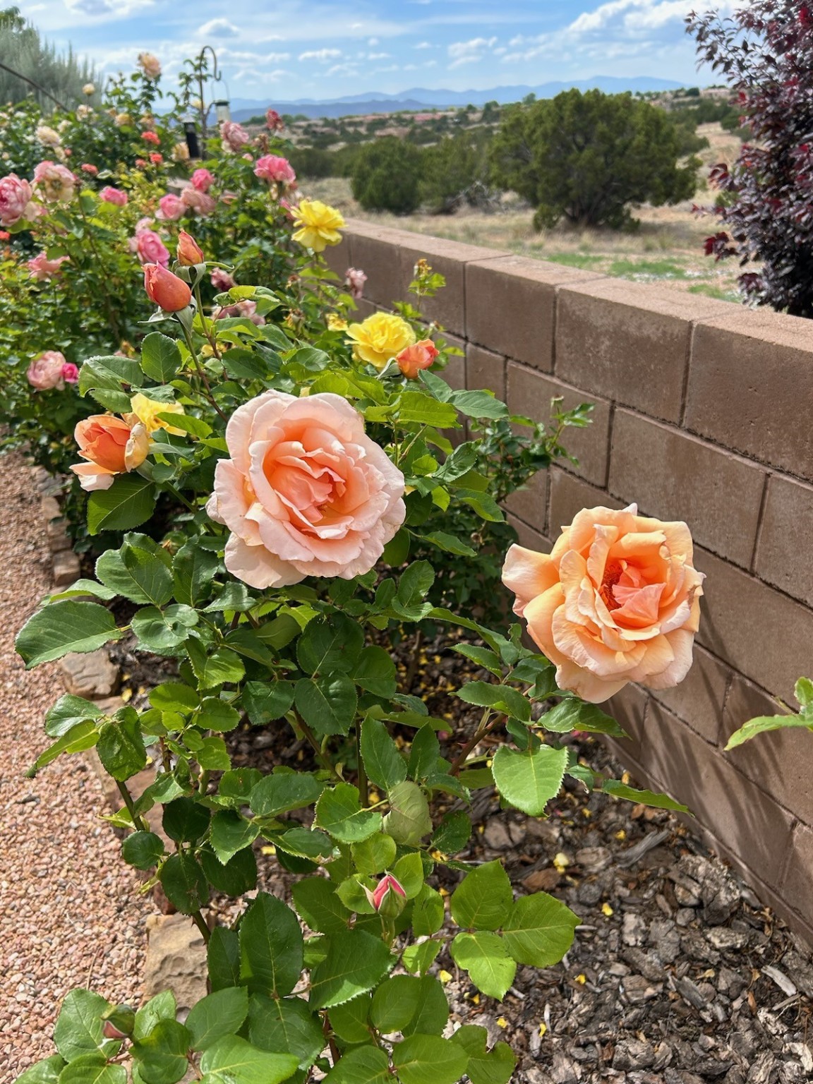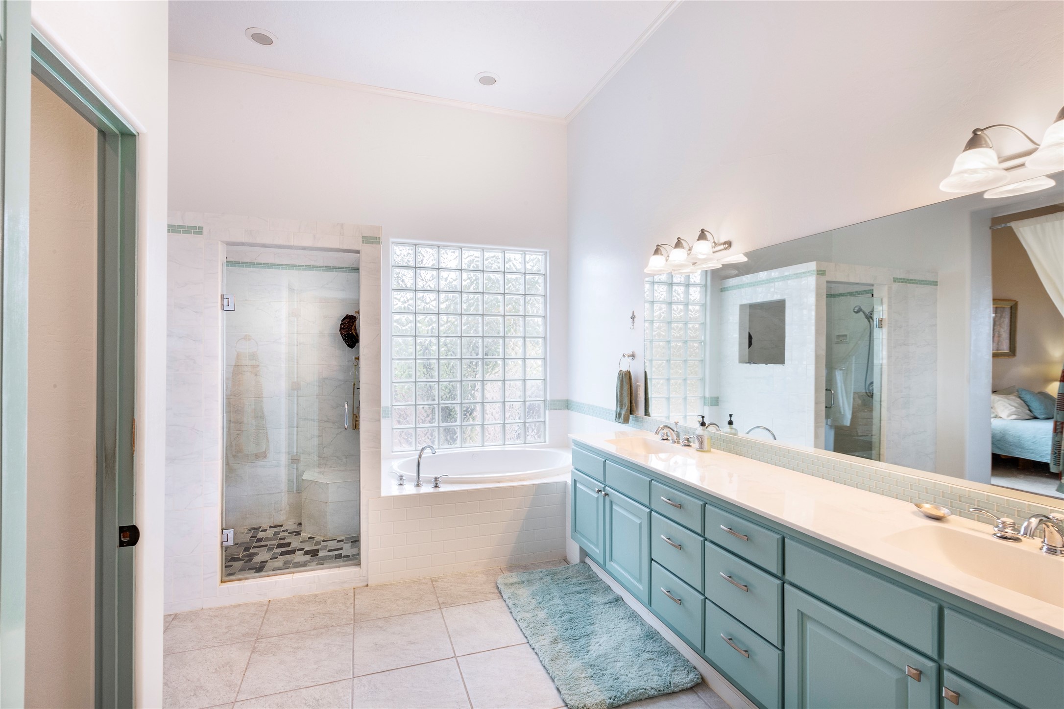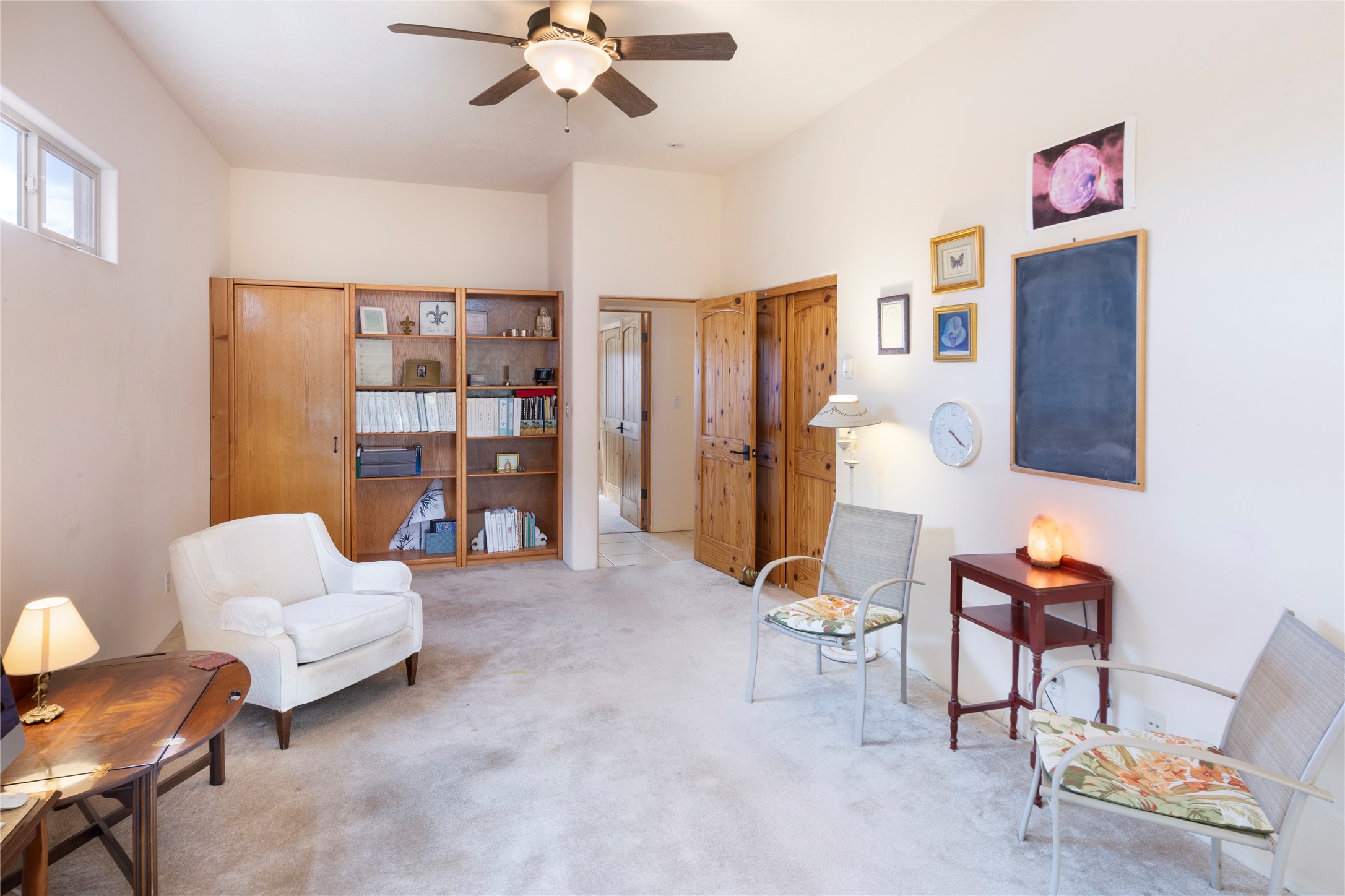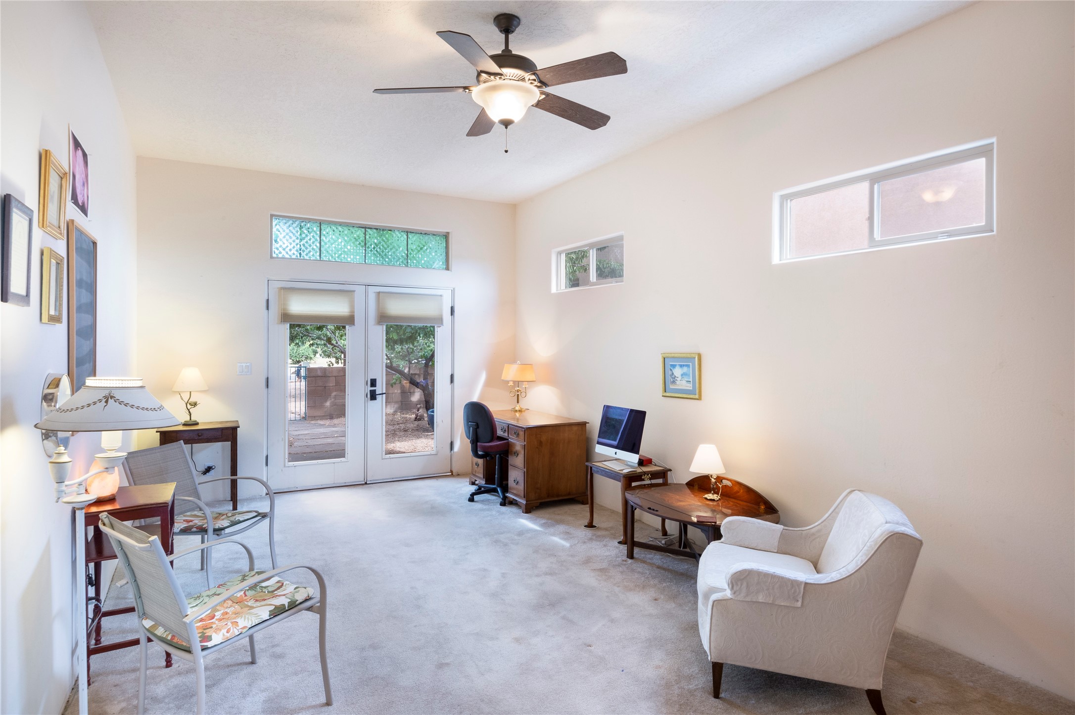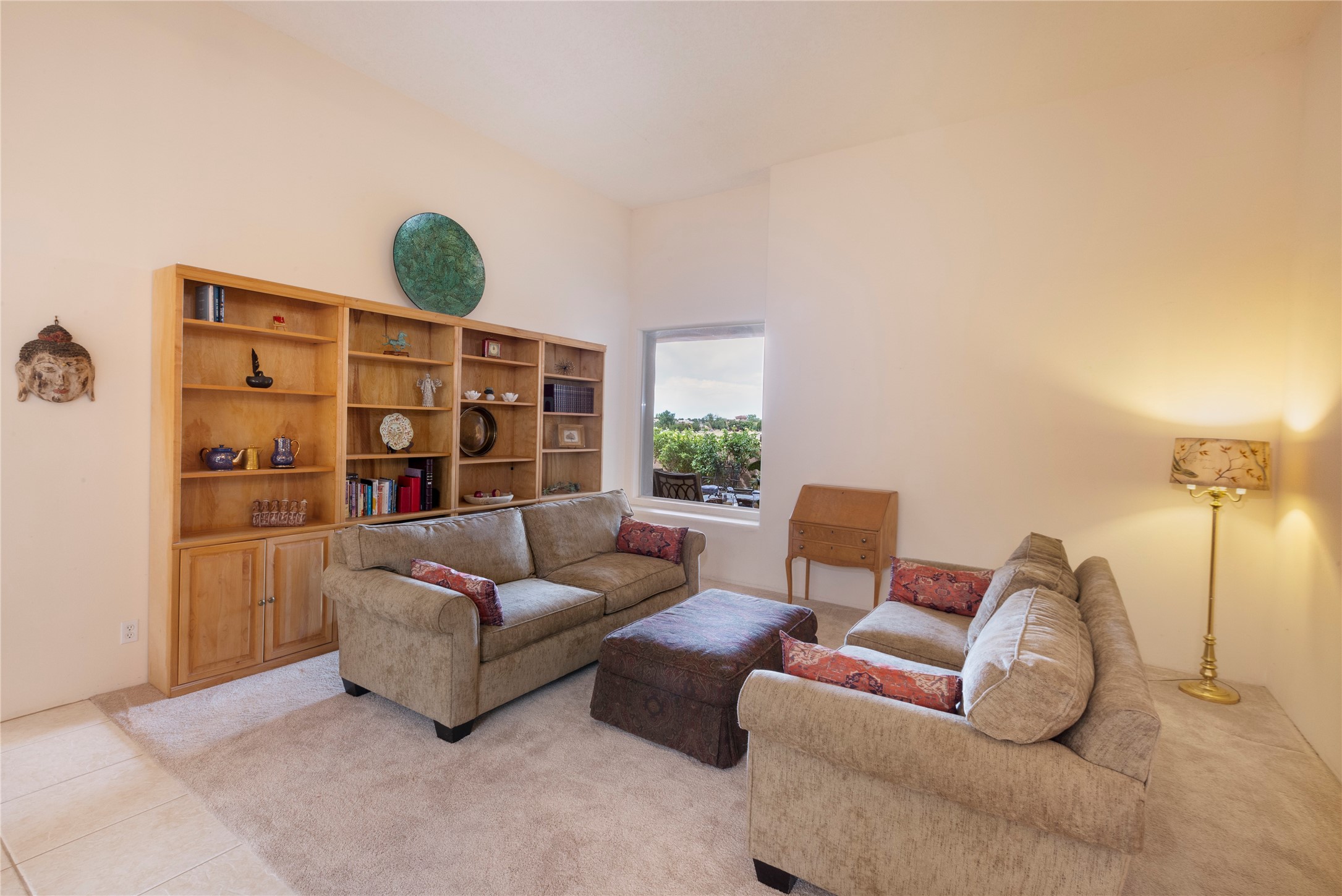 MOTIVATED SELLER! This beautifully appointed Rancho Viejo home has pueblo touches such as plaster, vigas and a kiva fireplace. The floorplan is excellent with the ensuite primary bedroom on one end and the guest rooms on the other end of the common areas of dining, living and kitchen. With 5 bedrooms, 2 bathrooms and a powder room and outdoor portal there is room for company. The open living concept has a breakfast bar and is part of the kitchen/living. The kitchen has been upgraded with granite countertops, 4 burner gas range, double hung ovens, and built in wine rack. Formal dining is bright with natural light. Unobstructed mountain and sunset views are enjoyed in the nicely landscaped back yard with nectarine, peach, apple and cherry trees, all with irrigation, water capture system and a fountain. There are 3 large raised garden beds with a drip system. This great property borders the common area greenbelt and is steps away from the neighborhood park. A two- car garage has direct access to this residence. 5 year roof warranty.