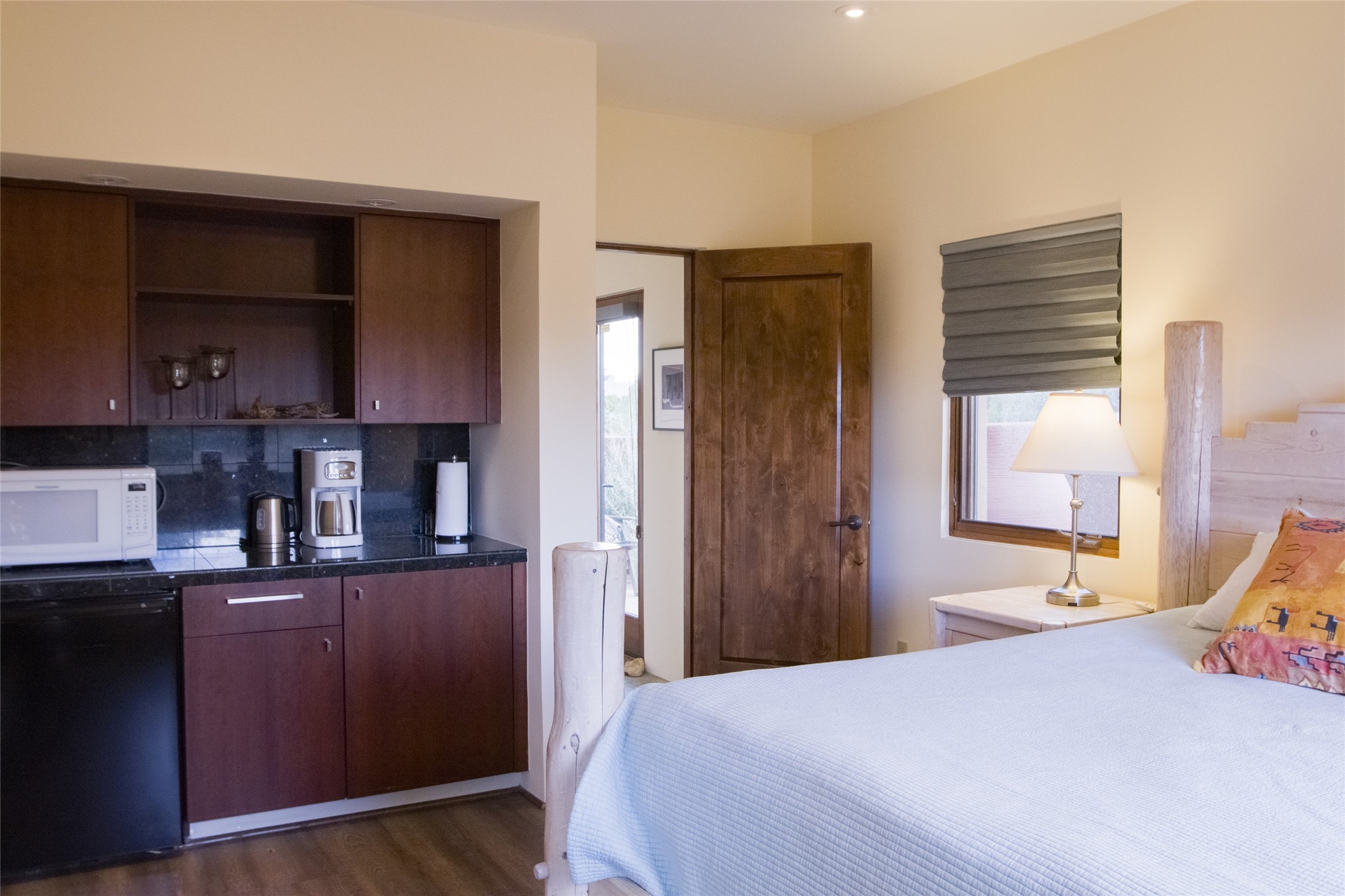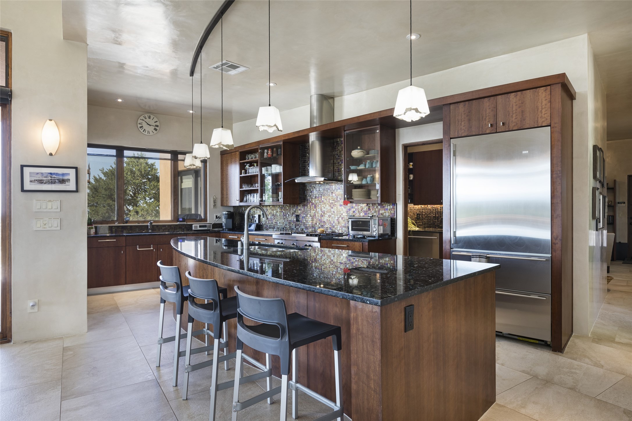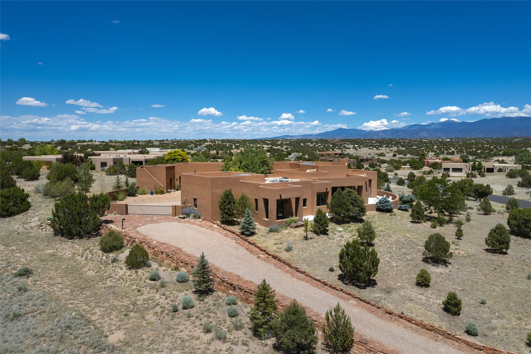 Experience the ultimate Santa Fe lifestyle. This rare, triumphant Tour de Force residence excites with the ultimate blend of sophisticated design and spectacular Sangre De Cristo, Ortiz and Sandia Mountain views. Perfectly sited on an elevated 1.8 acre view lot, this exquisite, single level residence with an independent guest house, roof deck, and a 5-car garage, built by renowned builder, Dave Jansen, designed by Richard Martinez, exemplifies the unique blend of extraordinary modern design with the true essence of Santa Fe. Upon entering through the welcoming, front entrance courtyard with a tranquil water feature, this home impresses and captivates with the stunning surround mountain views and a flexible floor plan, which seamlessly incorporates indoor and outdoor living at its finest. Ideal for guests and entertaining, the main residence offers 4,448 square feet, featuring a spacious open concept living room and dining room, with surround view windows, a glassed viewing room with a fireplace, and a well-appointed island kitchen complete with Wolf and Sub Zero appliances, a breakfast bar, butler's pantry, and an ideal wine room located directly off of the kitchen. The owner's suite delights with an intimate sitting room, fireplace, a private enclosed patio, and an updated luxurious bath with a soaking tub, walk-in shower, towel warming bars, and two large walk-in closets. The separate guest wing features its own living room with two private guest bedrooms, each with their own portal and a shared bath. Detached from the main residence is a spacious two-bedroom guest house, complete with its own bath, barista area, two enclosed patios and access to the roof deck. Exceptional features include 3,000 square feet of walled portal spaces, plaster walls, updated modern porcelain flooring throughout the main living areas and located within minutes to all facilities at The Club at Las Campanas.