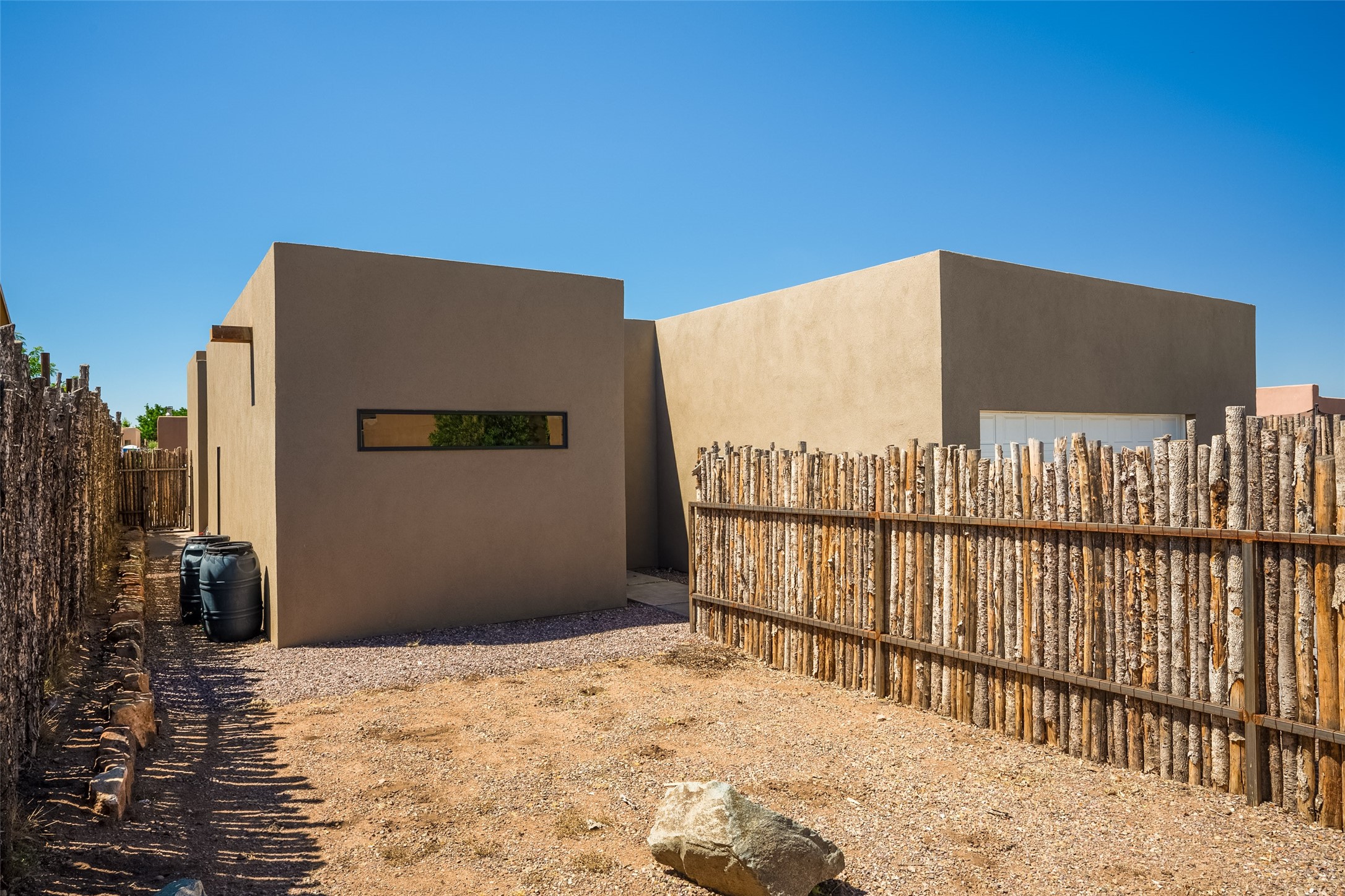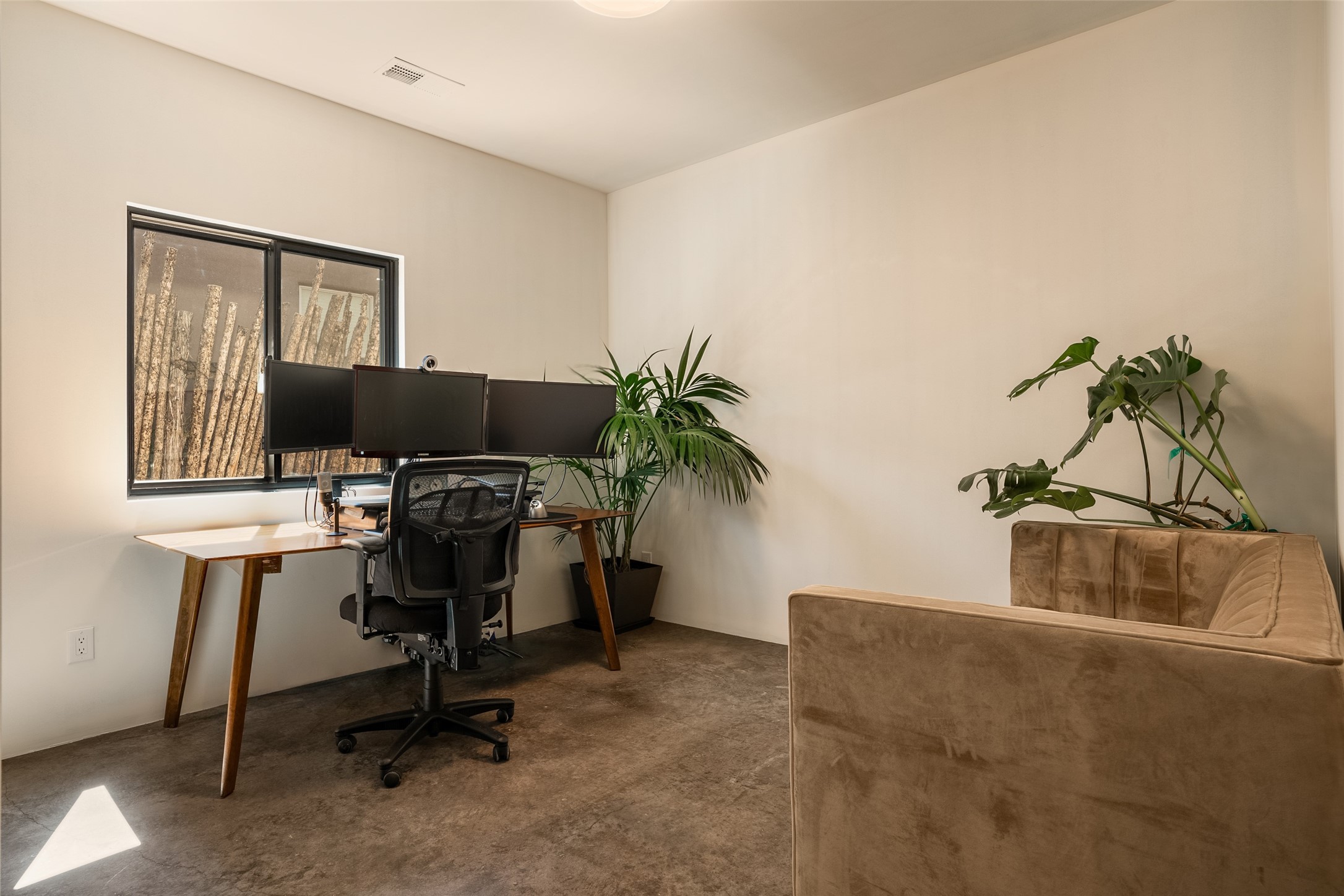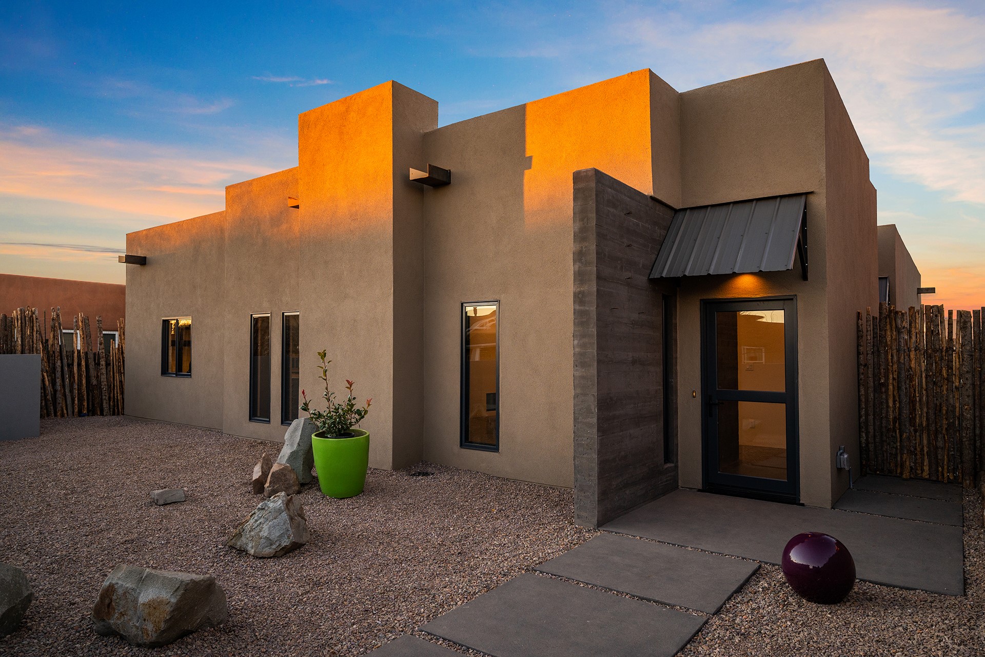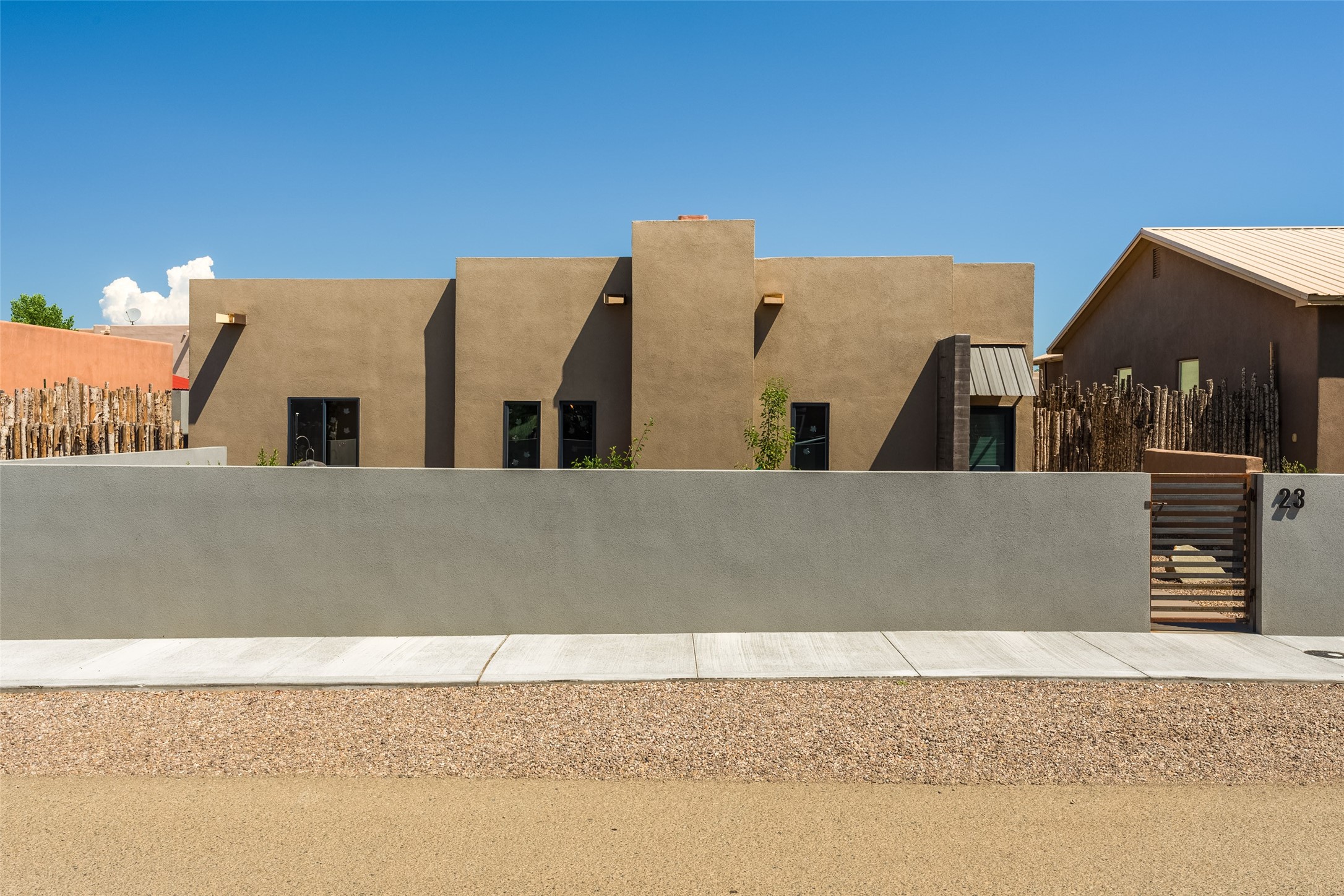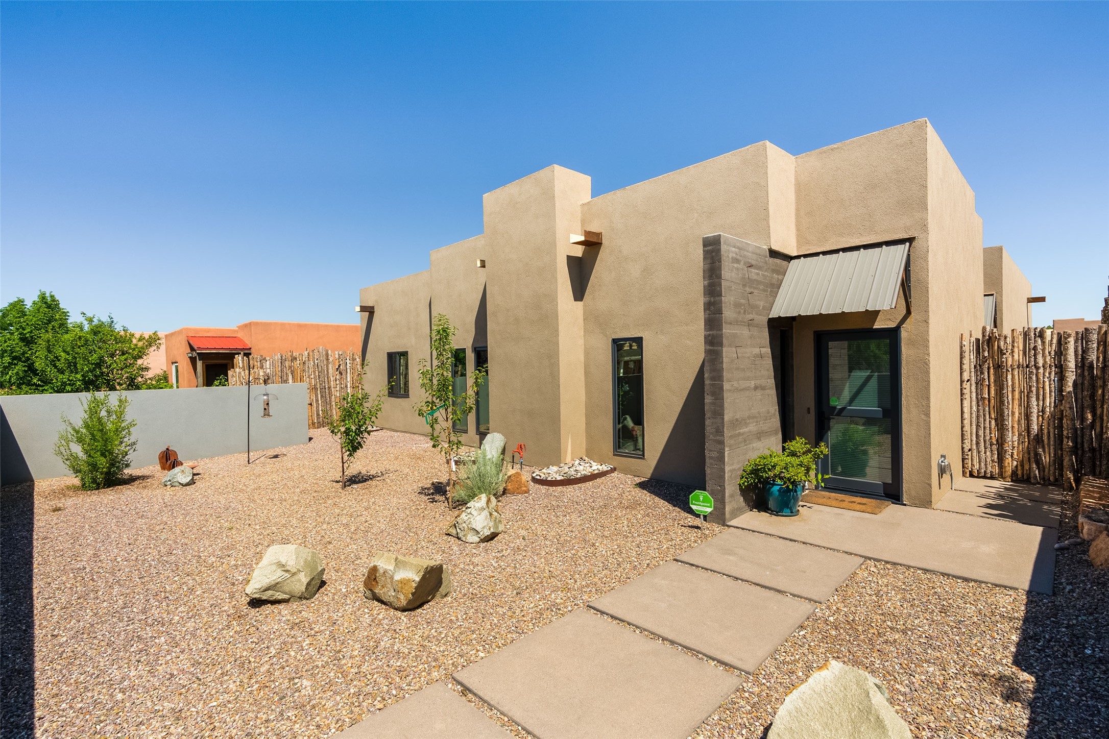 Built in 2021 by local builders, Acacia Builders, this home offers eye-catching contemporary, high-end finishes and amenities. Enter through an enclosed front yard to discover a gorgeous chef's kitchen / living area with gas insert fireplace (fireplace is hand built by a local artist and features ceramic glass doors), three bedrooms (2 ensuite), plus a dedicated office/bonus room with private entrance. The home is single level throughout, wired for high speed internet cat5 cables (in the office and one guest bedroom), has central heat & AC, energy efficient lighting and dimmers in hallways/all rooms, large windows that allow in abundant natural light, skylights throughout the house and garage, sleek bathroom and kitchen touches - including concrete & steel accents and gleaming white Quartz countertops. The open concept kitchen has an oversized Quartz island for food prep and hosting gatherings, there is warm colored concrete flooring throughout (no carpet), spacious laundry room, a secluded portal off of the primary suite & kitchen, extra high coyote and finished wall fencing, and an attached, spacious two car garage with an upgraded concrete parking apron. All of this in Oshara, a green built community convenient to the Community College district, Rodeo/Cerrillos Road area businesses and shopping. *Showings Available 7 days a week, 10am to 5pm, 3 hour notice. See remarks.*