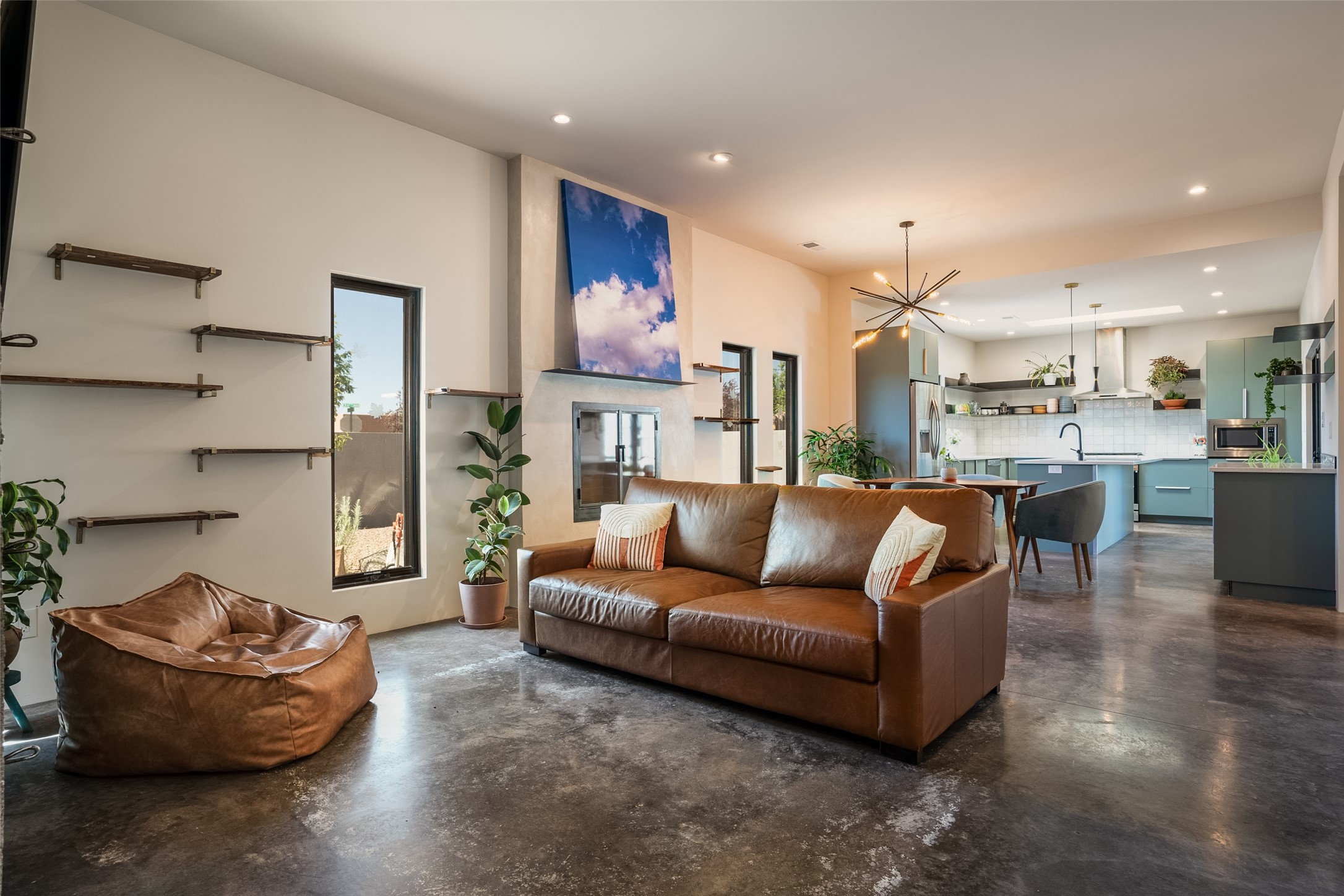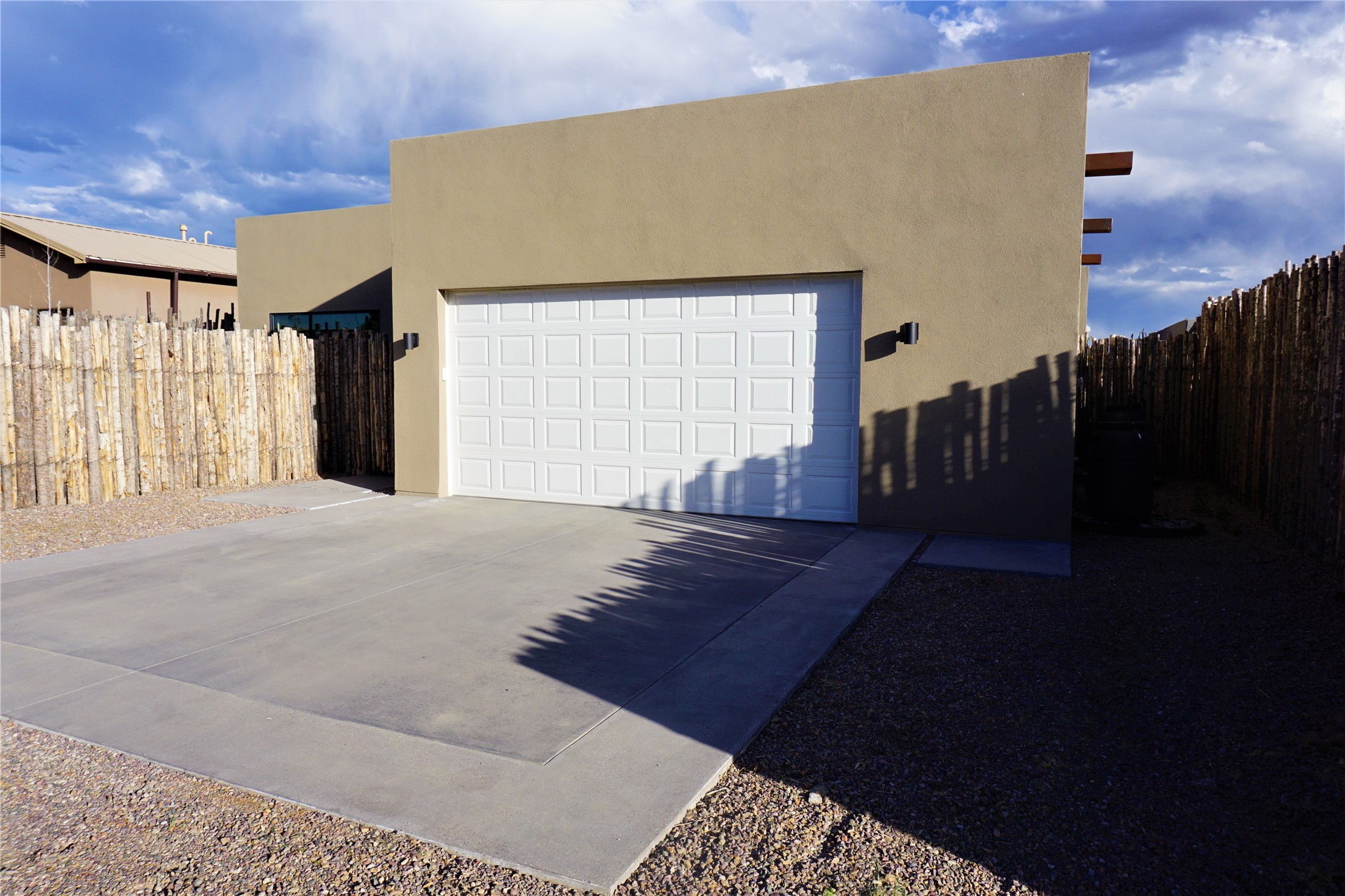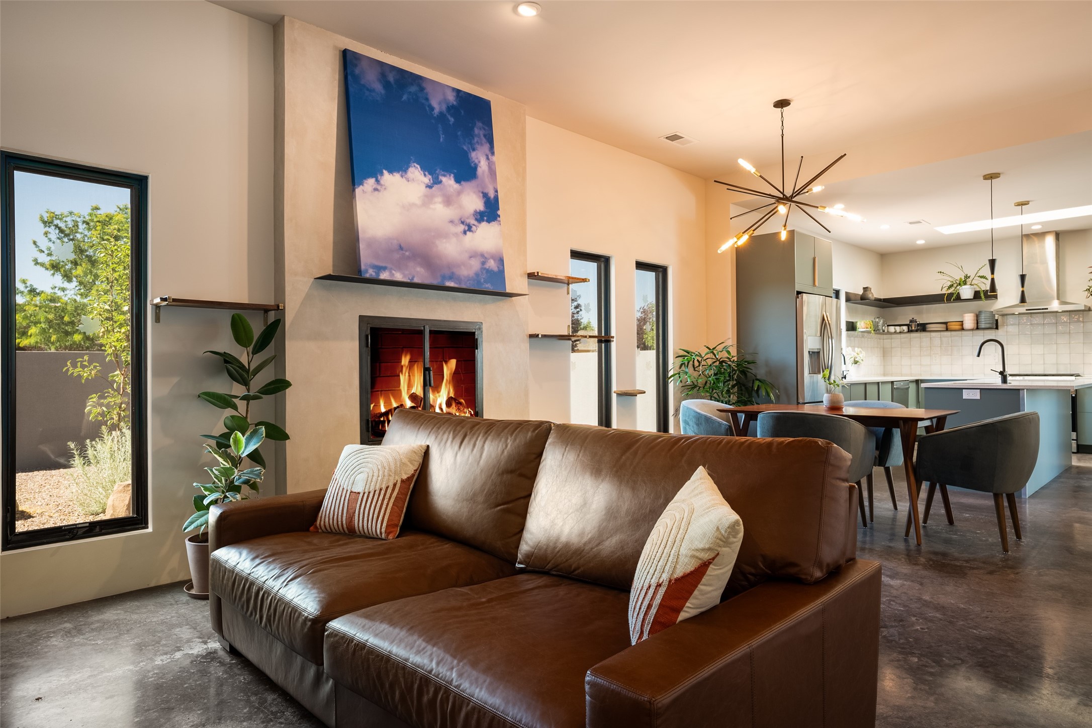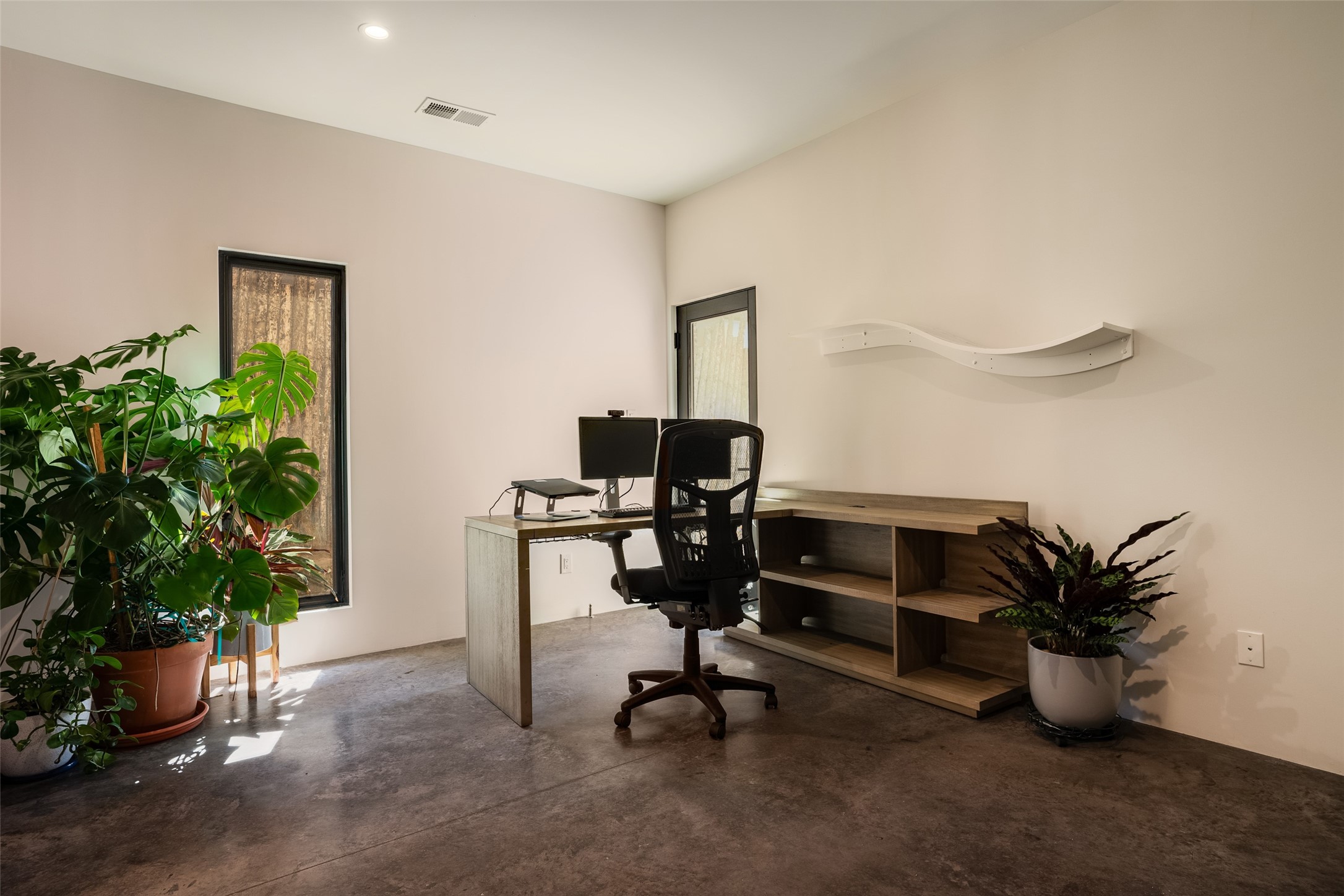 Built in 2021 by local builders, Acacia Builders, this home offers eye-catching contemporary, high-end finishes and amenities. Enter through an enclosed front yard to discover a gorgeous chef's kitchen / living area with gas insert fireplace (fireplace is hand built by a local artist and features ceramic glass doors), three bedrooms (2 ensuite), plus a dedicated office/bonus room with private entrance. The home is single level throughout, wired for high speed internet cat5 cables (in the office and one guest bedroom), has central heat & AC, energy efficient lighting and dimmers in hallways/all rooms, large windows that allow in abundant natural light, skylights throughout the house and garage, sleek bathroom and kitchen touches - including concrete & steel accents and gleaming white Quartz countertops. The open concept kitchen has an oversized Quartz island for food prep and hosting gatherings, there is warm colored concrete flooring throughout (no carpet), spacious laundry room, a secluded portal off of the primary suite & kitchen, extra high coyote and finished wall fencing, and an attached, spacious two car garage with an upgraded concrete parking apron. All of this in Oshara, a green built community convenient to the Community College district, Rodeo/Cerrillos Road area businesses and shopping. *Showings Available 7 days a week, 10am to 5pm, 3 hour notice. See remarks.*