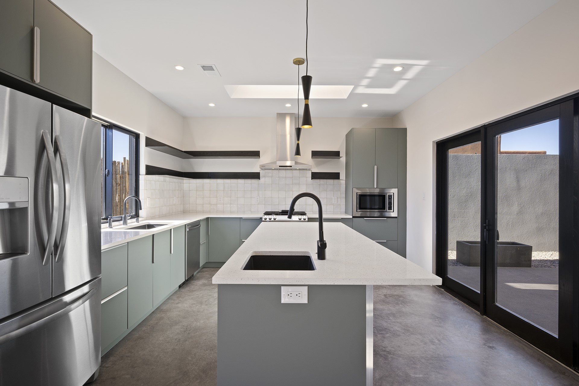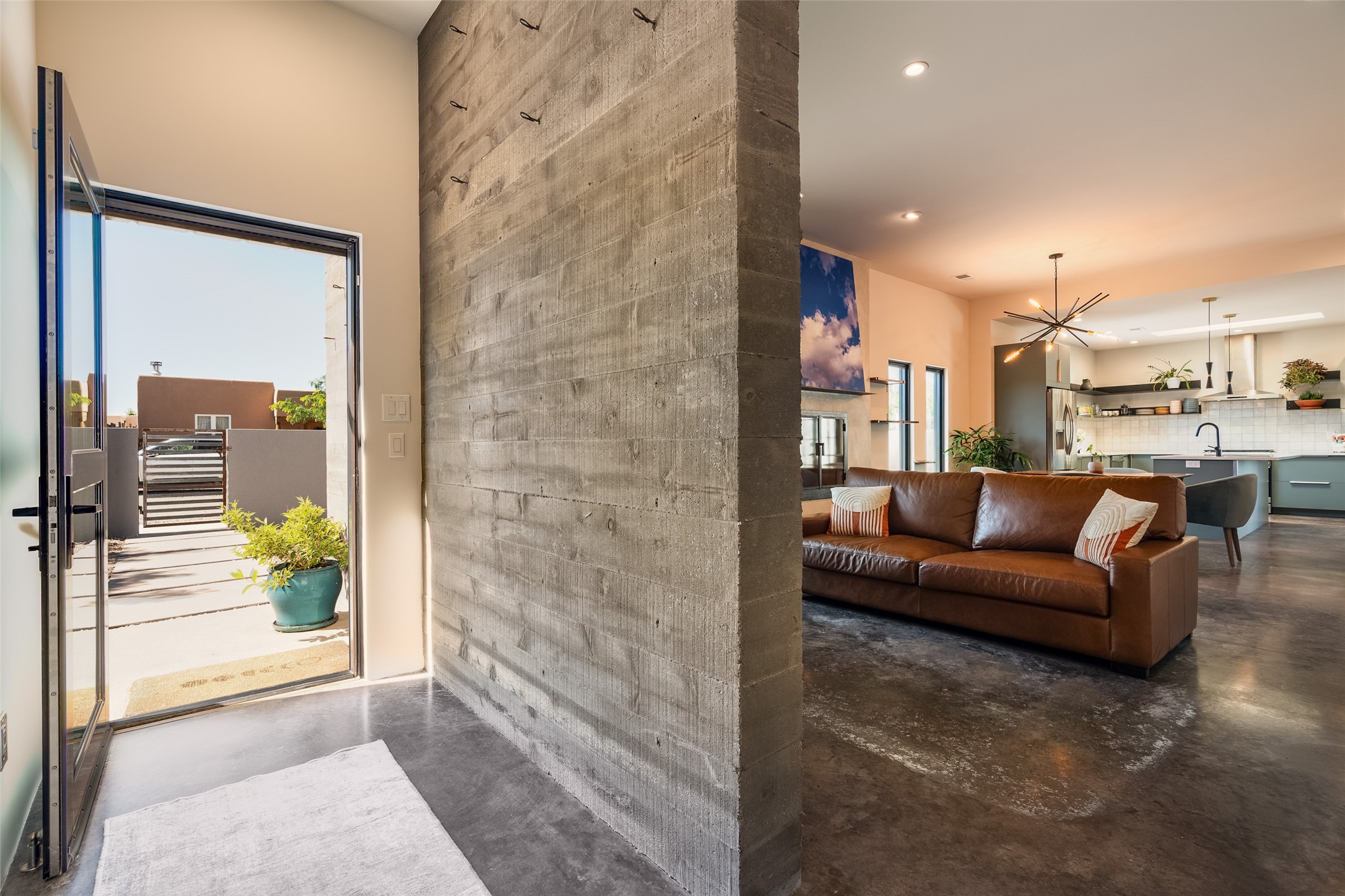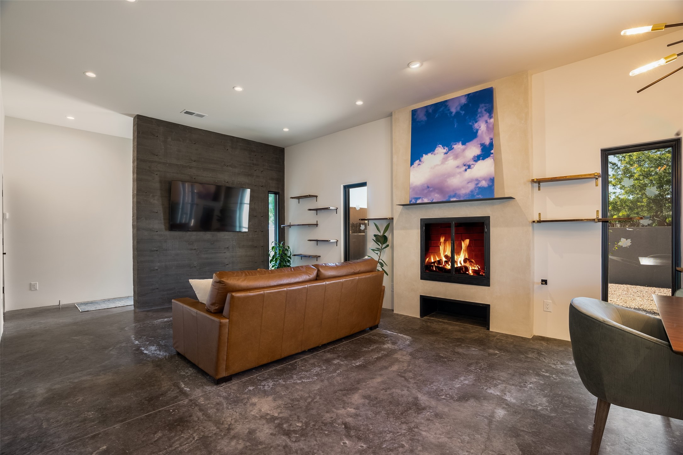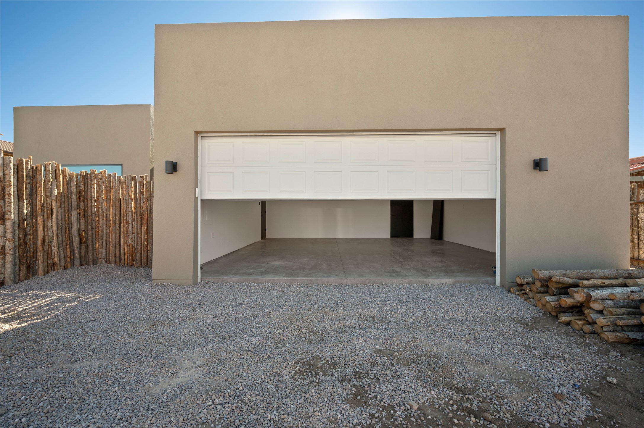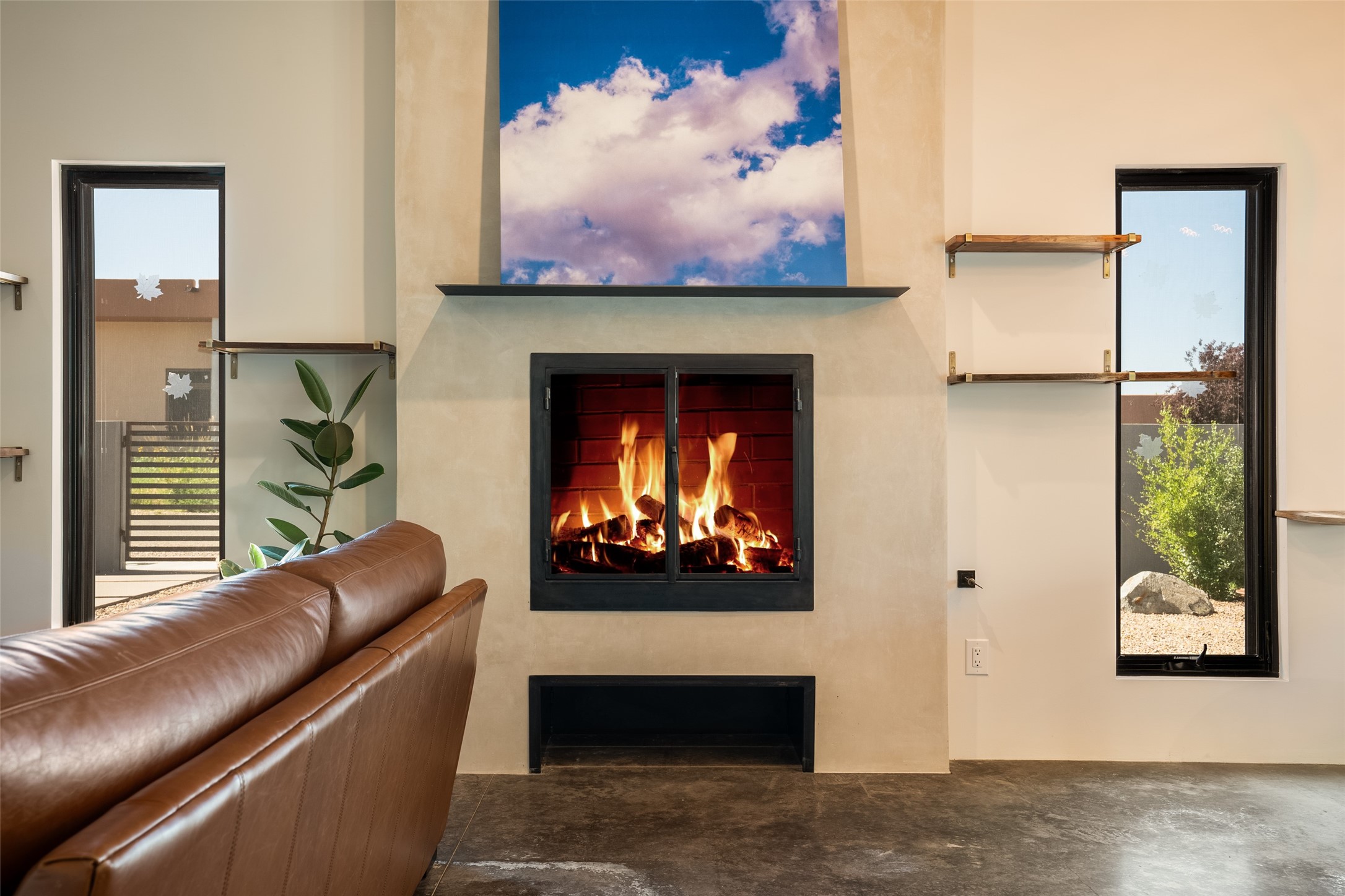Built in 2021 by local builders, Acacia Builders, this home offers eye-catching contemporary, high-end finishes and amenities. Enter through an enclosed front yard to discover a gorgeous chef's kitchen / living area with gas insert fireplace (fireplace is hand built by a local artist and features ceramic glass doors), three bedrooms (2 ensuite), plus a dedicated office/bonus room with private entrance. The home is single level throughout, wired for high speed internet cat5 cables (in the office and one guest bedroom), has central heat & AC, energy efficient lighting and dimmers in hallways/all rooms, large windows that allow in abundant natural light, skylights throughout the house and garage, sleek bathroom and kitchen touches - including concrete & steel accents and gleaming white Quartz countertops. The open concept kitchen has an oversized Quartz island for food prep and hosting gatherings, there is warm colored concrete flooring throughout (no carpet), spacious laundry room, a secluded portal off of the primary suite & kitchen, extra high coyote and finished wall fencing, and an attached, spacious two car garage with an upgraded concrete parking apron. All of this in Oshara, a green built community convenient to the Community College district, Rodeo/Cerrillos Road area businesses and shopping. *Showings Available 7 days a week, 10am to 5pm, 3 hour notice. See remarks.*