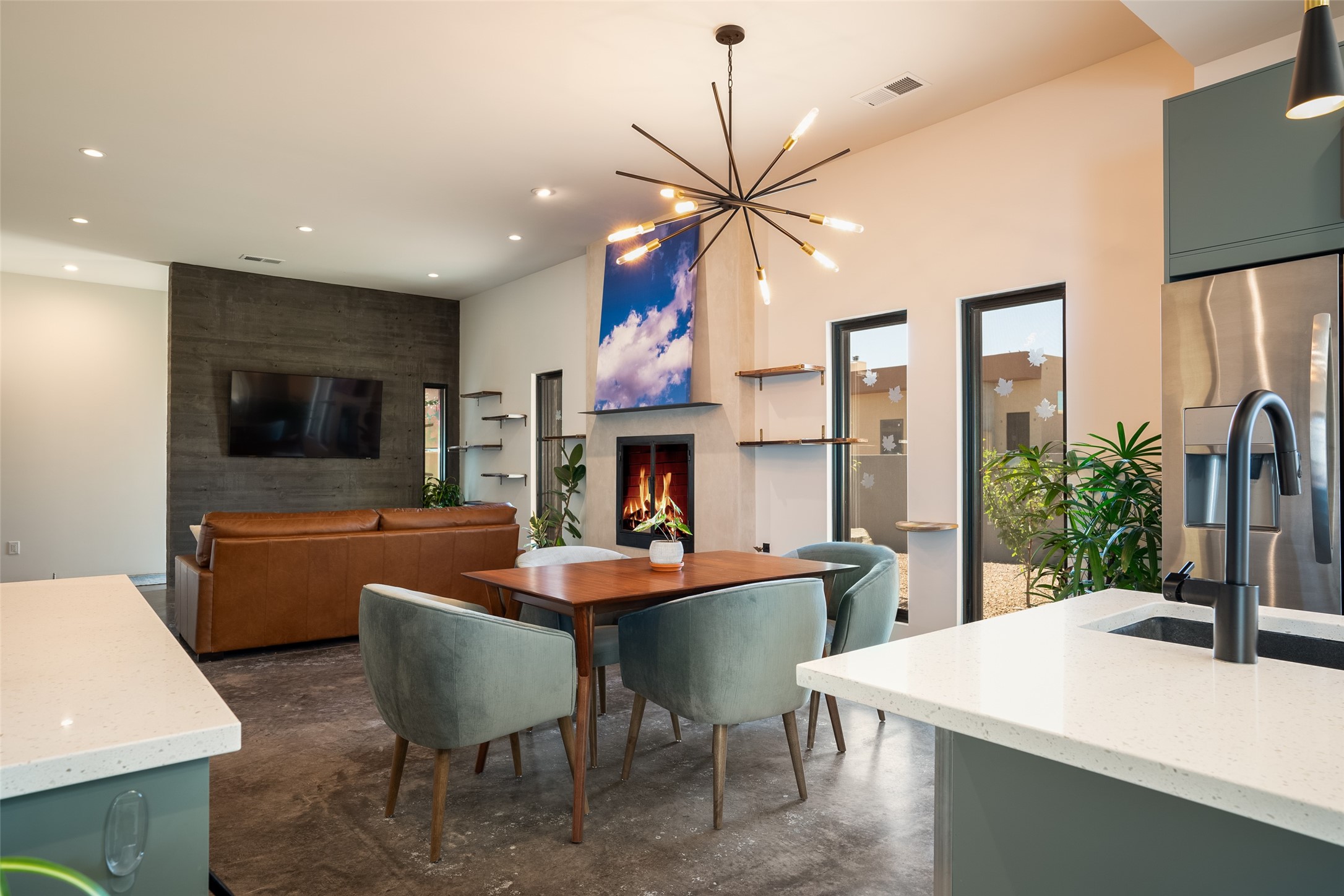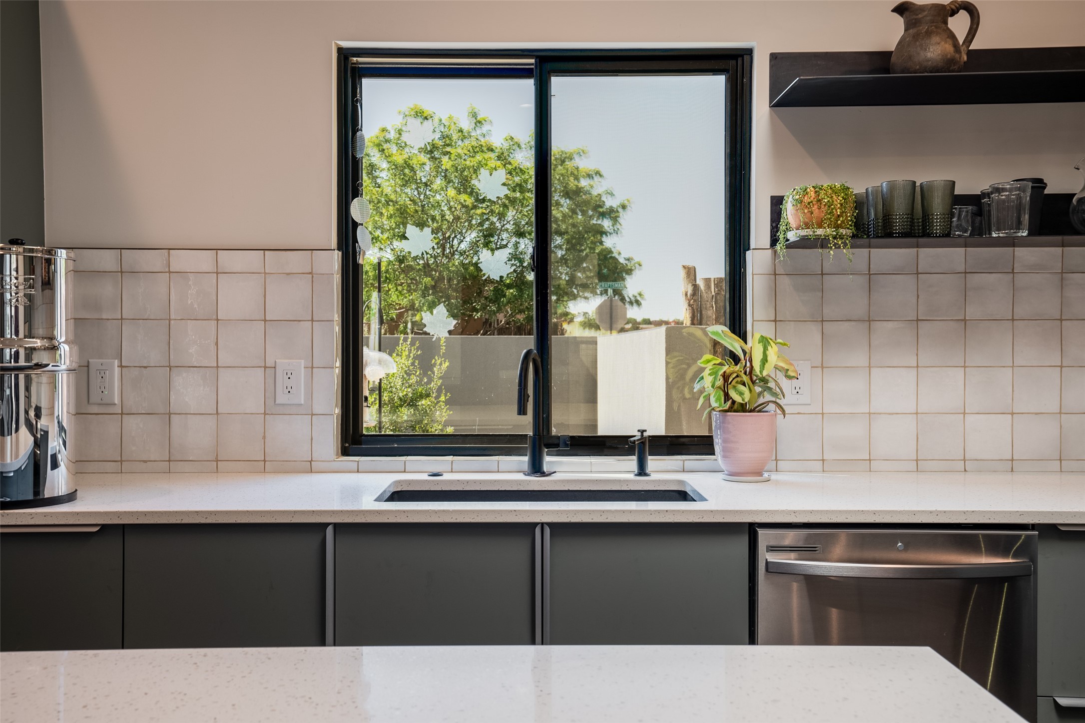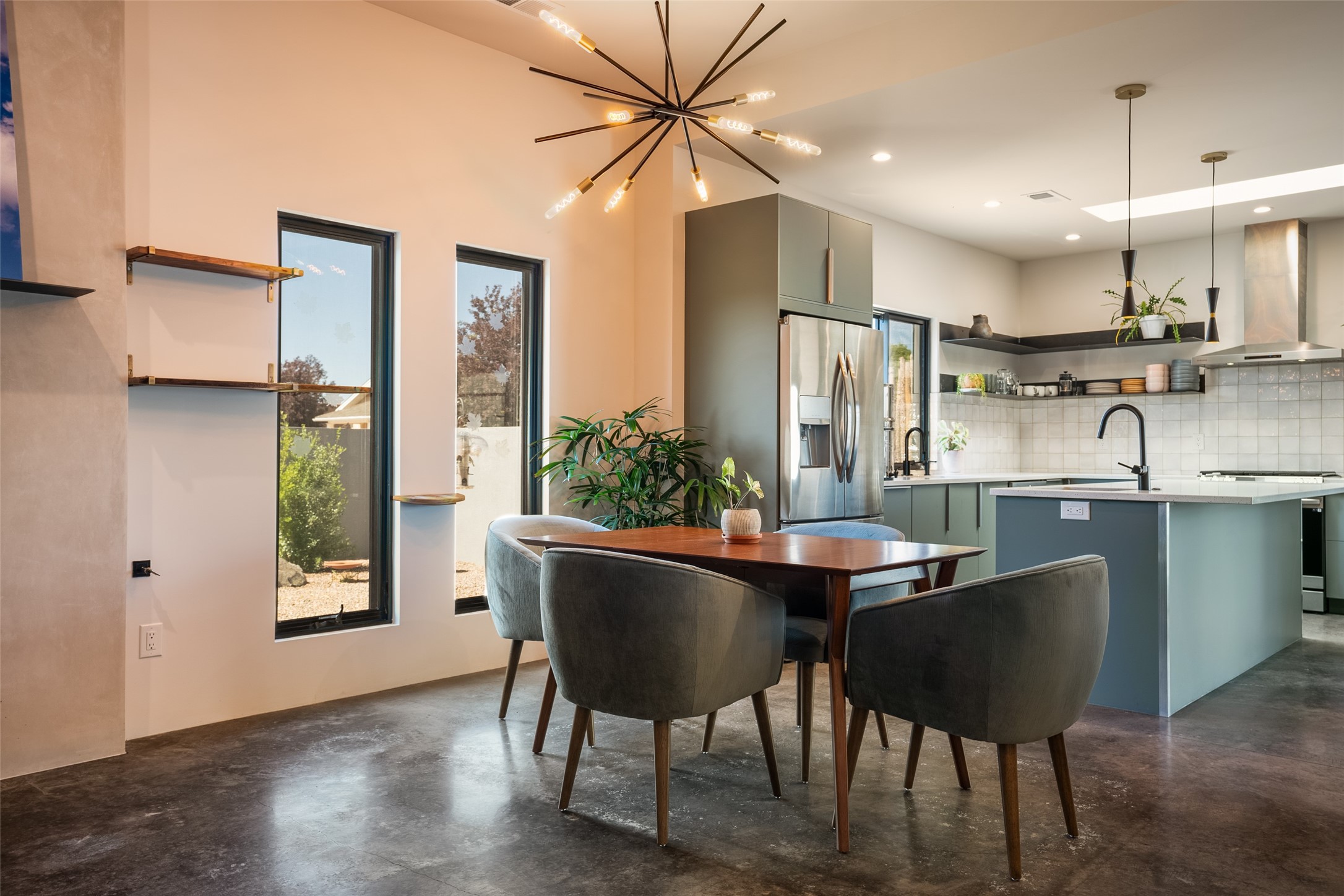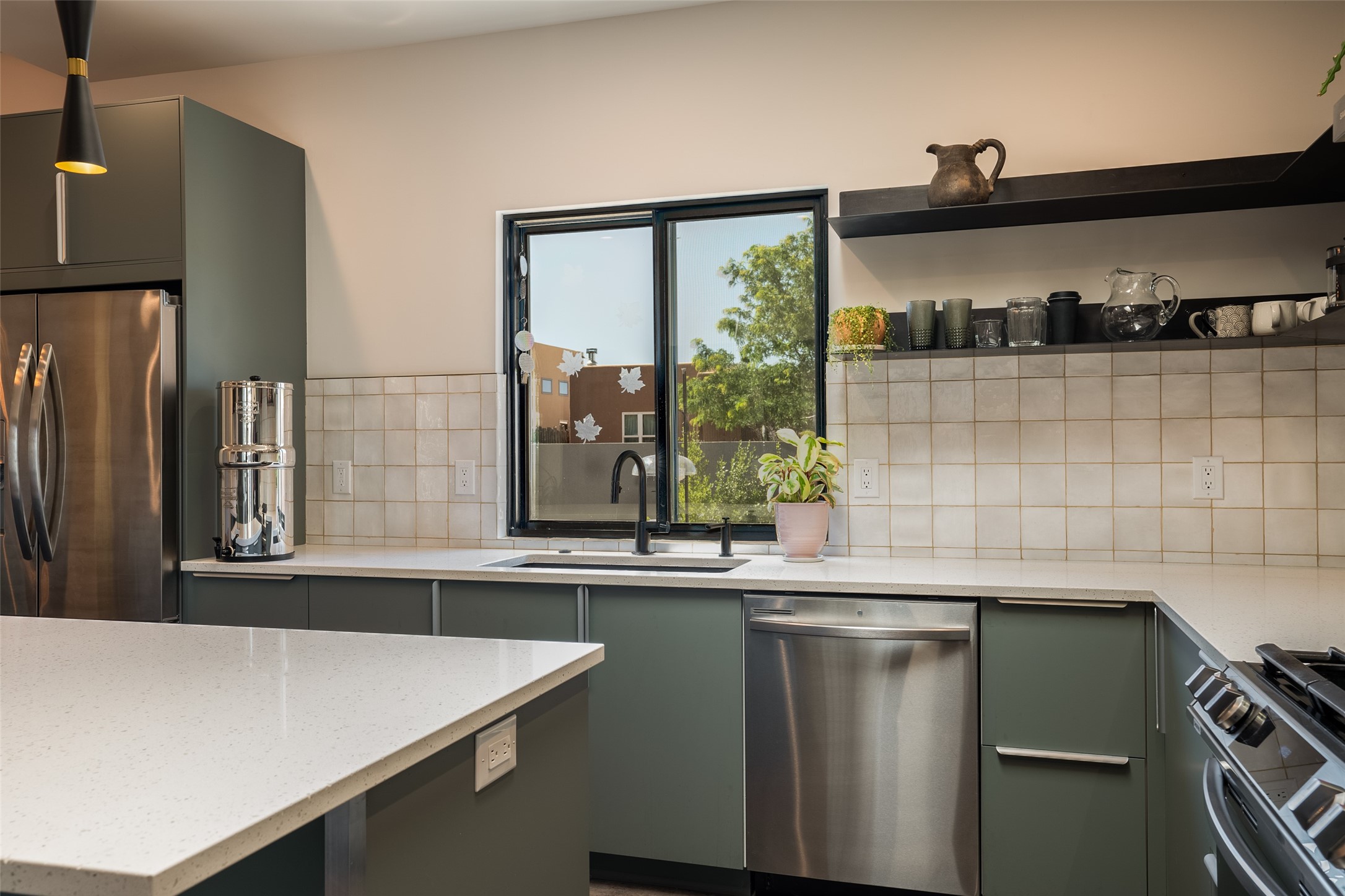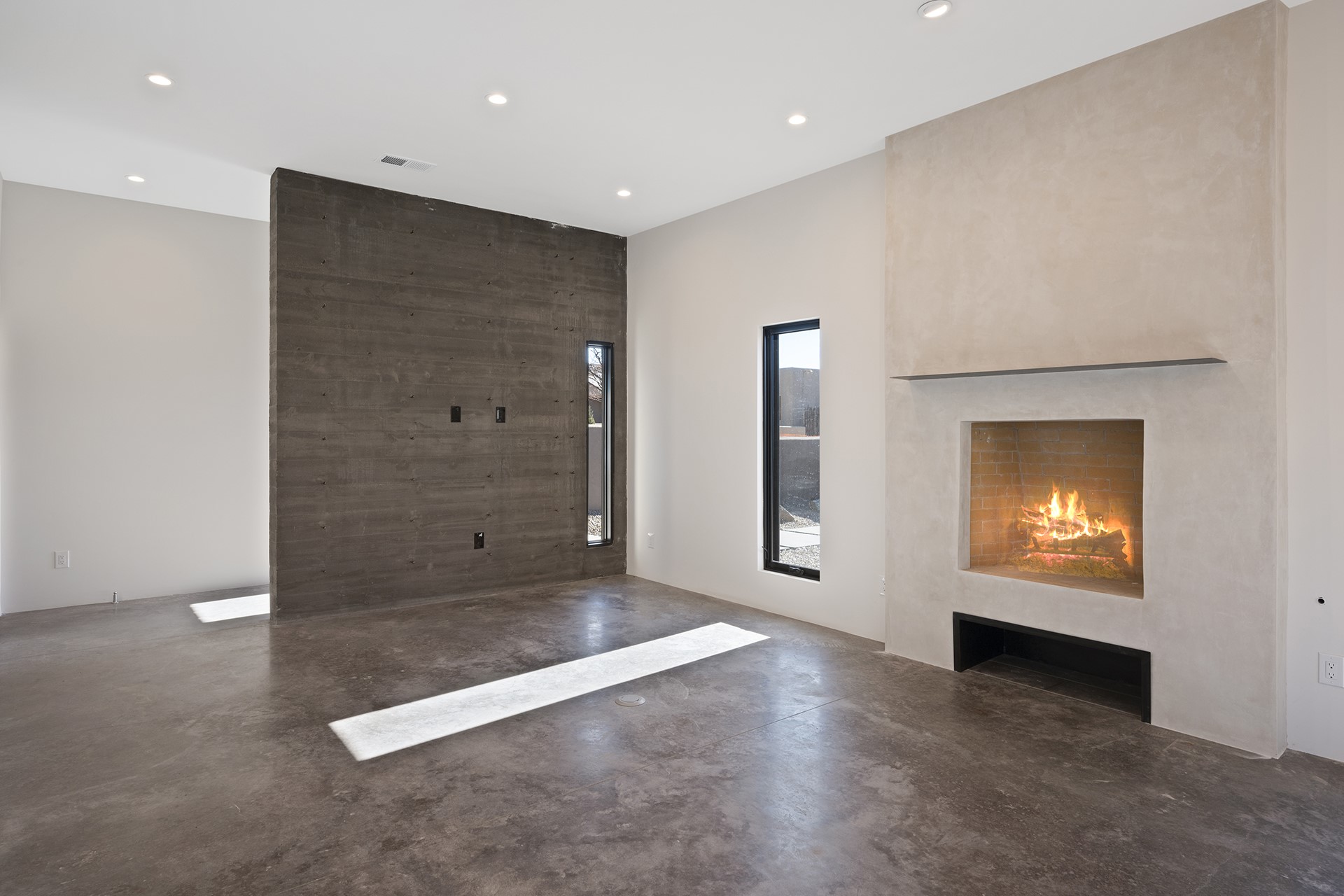 Built in 2021 by local builders, Acacia Builders, this home offers eye-catching contemporary, high-end finishes and amenities. Enter through an enclosed front yard to discover a gorgeous chef's kitchen / living area with gas insert fireplace (fireplace is hand built by a local artist and features ceramic glass doors), three bedrooms (2 ensuite), plus a dedicated office/bonus room with private entrance. The home is single level throughout, wired for high speed internet cat5 cables (in the office and one guest bedroom), has central heat & AC, energy efficient lighting and dimmers in hallways/all rooms, large windows that allow in abundant natural light, skylights throughout the house and garage, sleek bathroom and kitchen touches - including concrete & steel accents and gleaming white Quartz countertops. The open concept kitchen has an oversized Quartz island for food prep and hosting gatherings, there is warm colored concrete flooring throughout (no carpet), spacious laundry room, a secluded portal off of the primary suite & kitchen, extra high coyote and finished wall fencing, and an attached, spacious two car garage with an upgraded concrete parking apron. All of this in Oshara, a green built community convenient to the Community College district, Rodeo/Cerrillos Road area businesses and shopping. *Showings Available 7 days a week, 10am to 5pm, 3 hour notice. See remarks.*