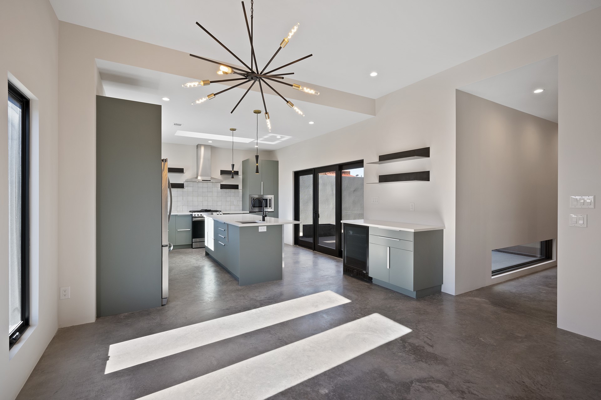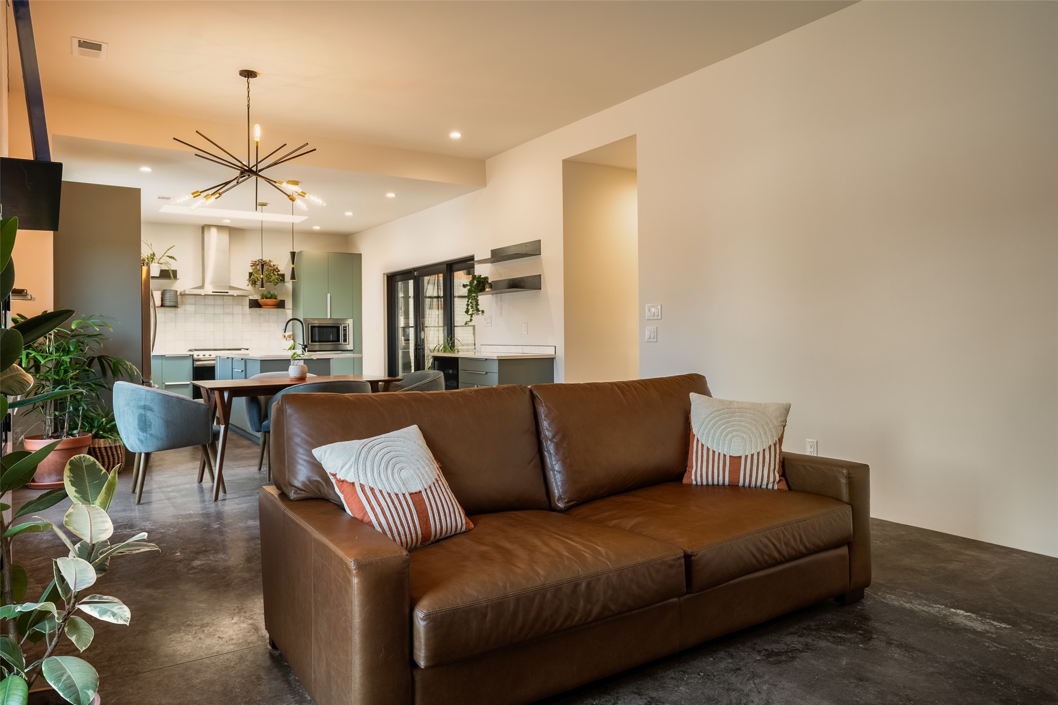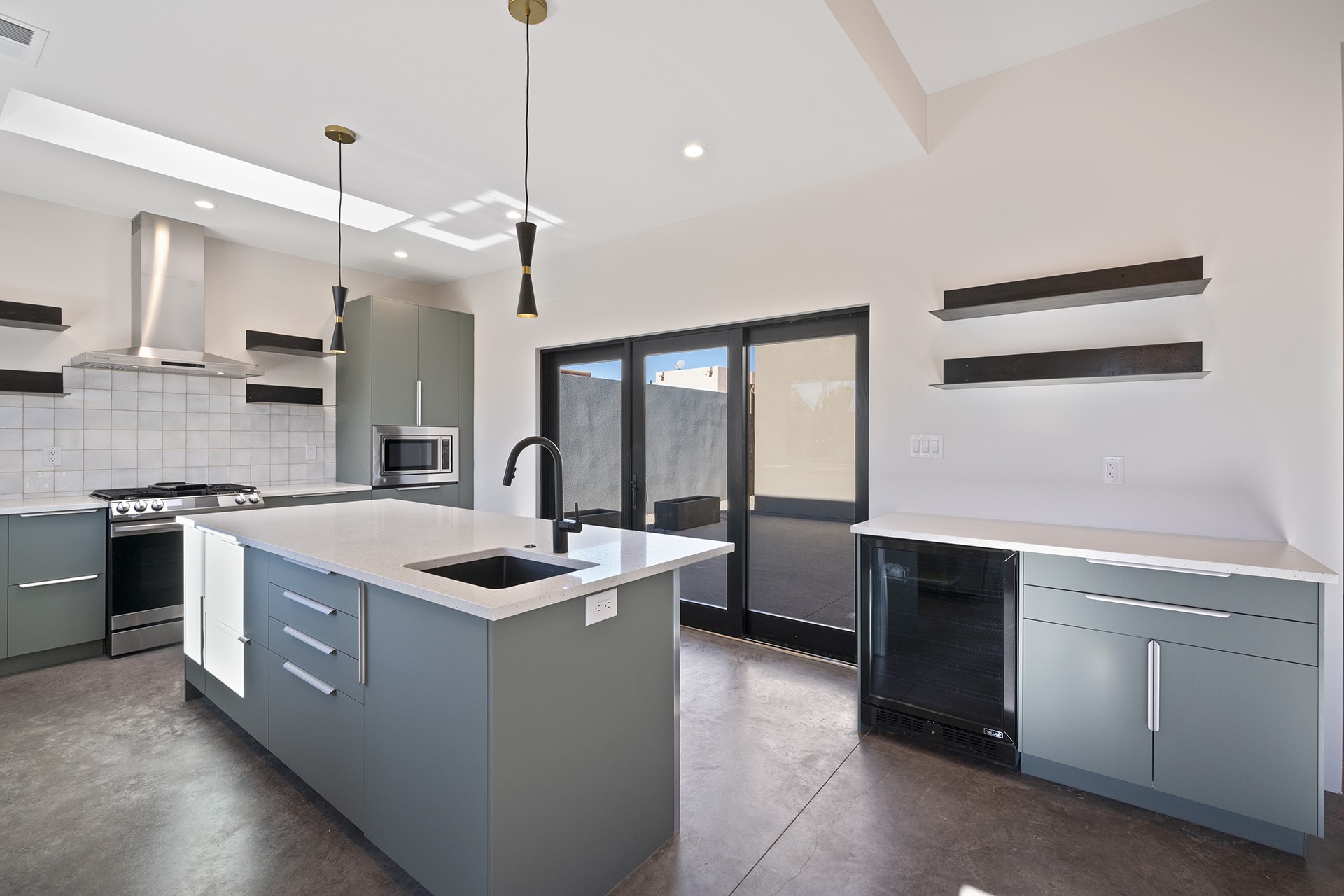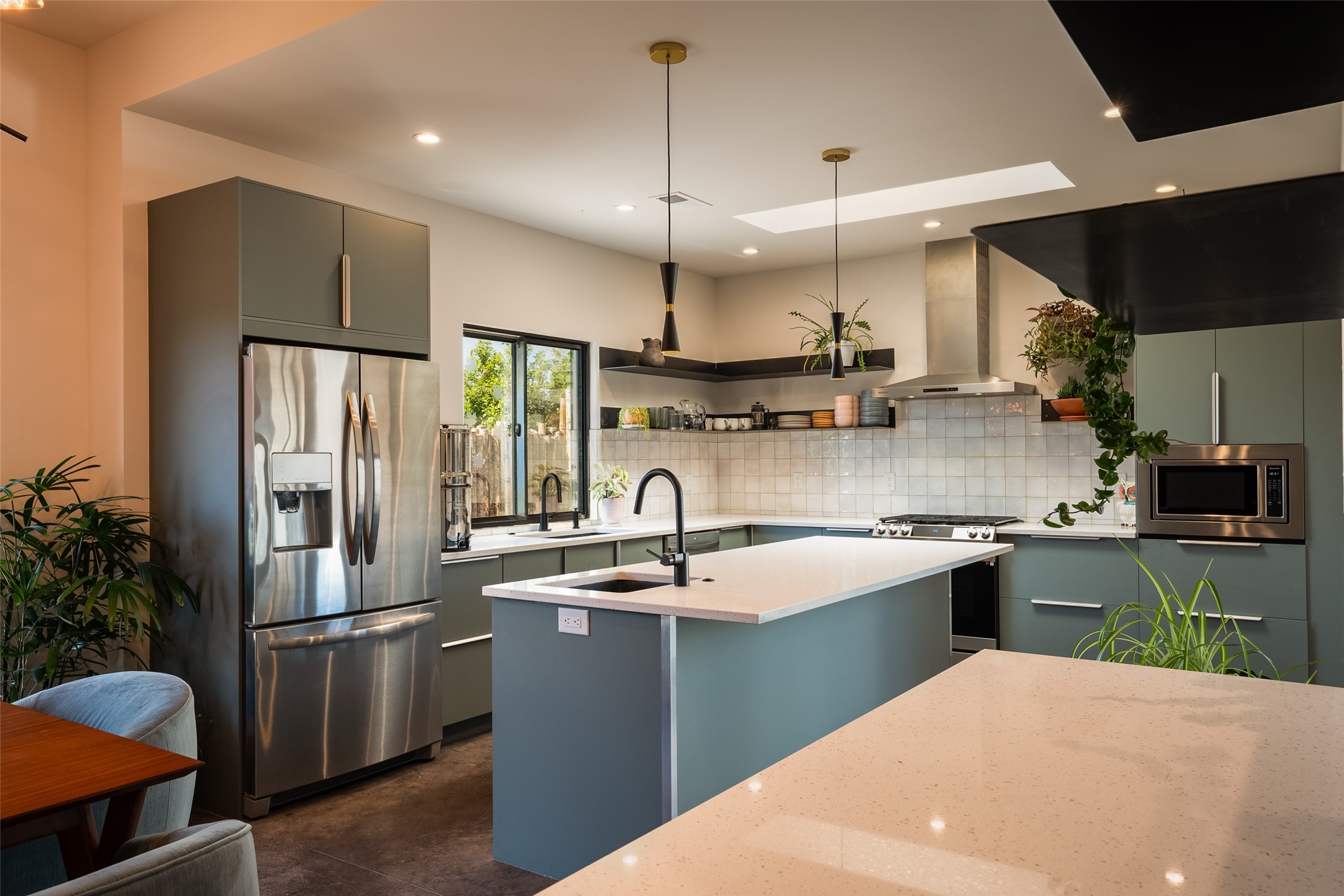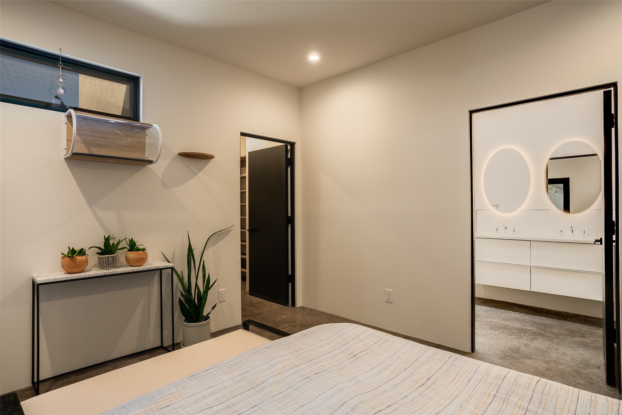 Built in 2021 by local builders, Acacia Builders, this home offers eye-catching contemporary, high-end finishes and amenities. Enter through an enclosed front yard to discover a gorgeous chef's kitchen / living area with gas insert fireplace (fireplace is hand built by a local artist and features ceramic glass doors), three bedrooms (2 ensuite), plus a dedicated office/bonus room with private entrance. The home is single level throughout, wired for high speed internet cat5 cables (in the office and one guest bedroom), has central heat & AC, energy efficient lighting and dimmers in hallways/all rooms, large windows that allow in abundant natural light, skylights throughout the house and garage, sleek bathroom and kitchen touches - including concrete & steel accents and gleaming white Quartz countertops. The open concept kitchen has an oversized Quartz island for food prep and hosting gatherings, there is warm colored concrete flooring throughout (no carpet), spacious laundry room, a secluded portal off of the primary suite & kitchen, extra high coyote and finished wall fencing, and an attached, spacious two car garage with an upgraded concrete parking apron. All of this in Oshara, a green built community convenient to the Community College district, Rodeo/Cerrillos Road area businesses and shopping. *Showings Available 7 days a week, 10am to 5pm, 3 hour notice. See remarks.*