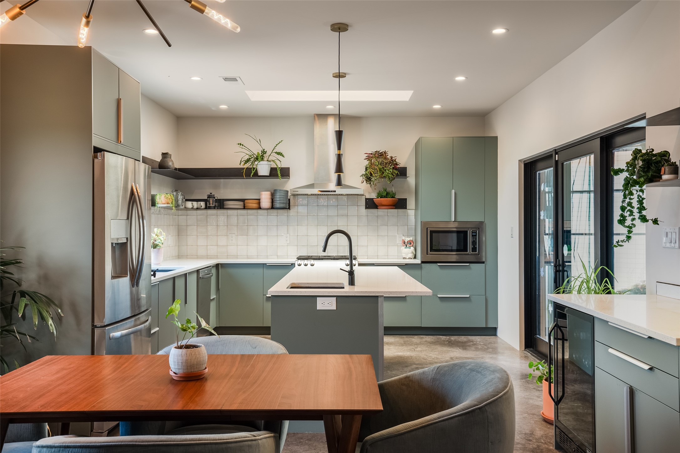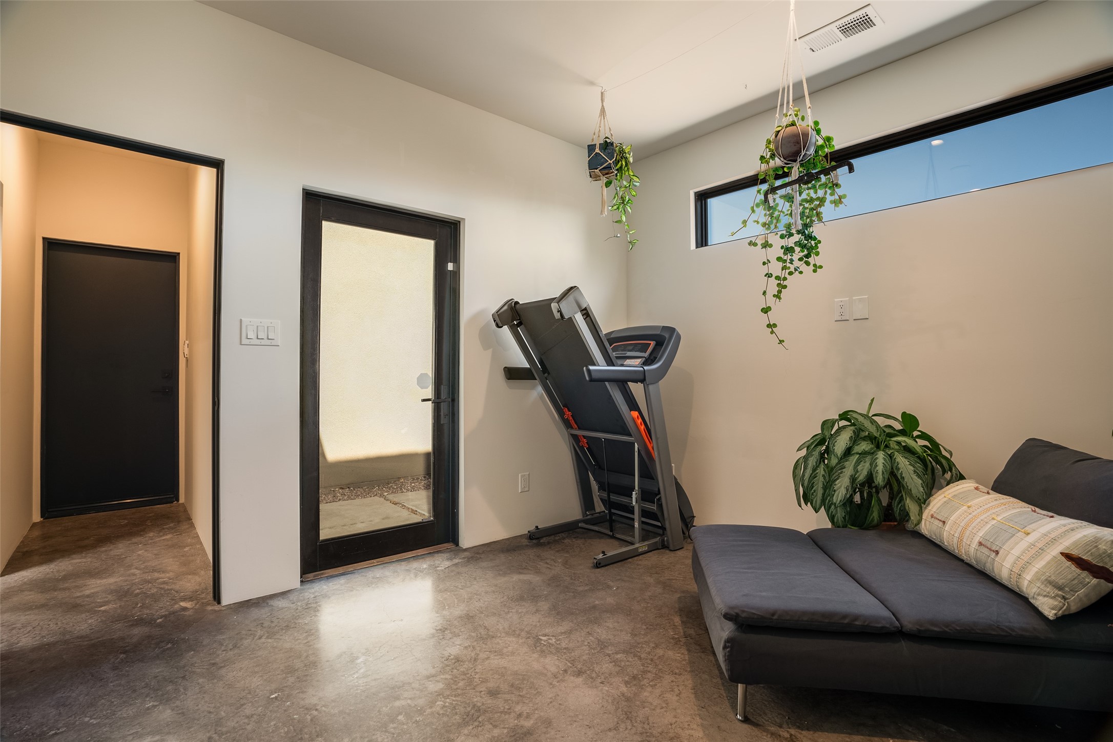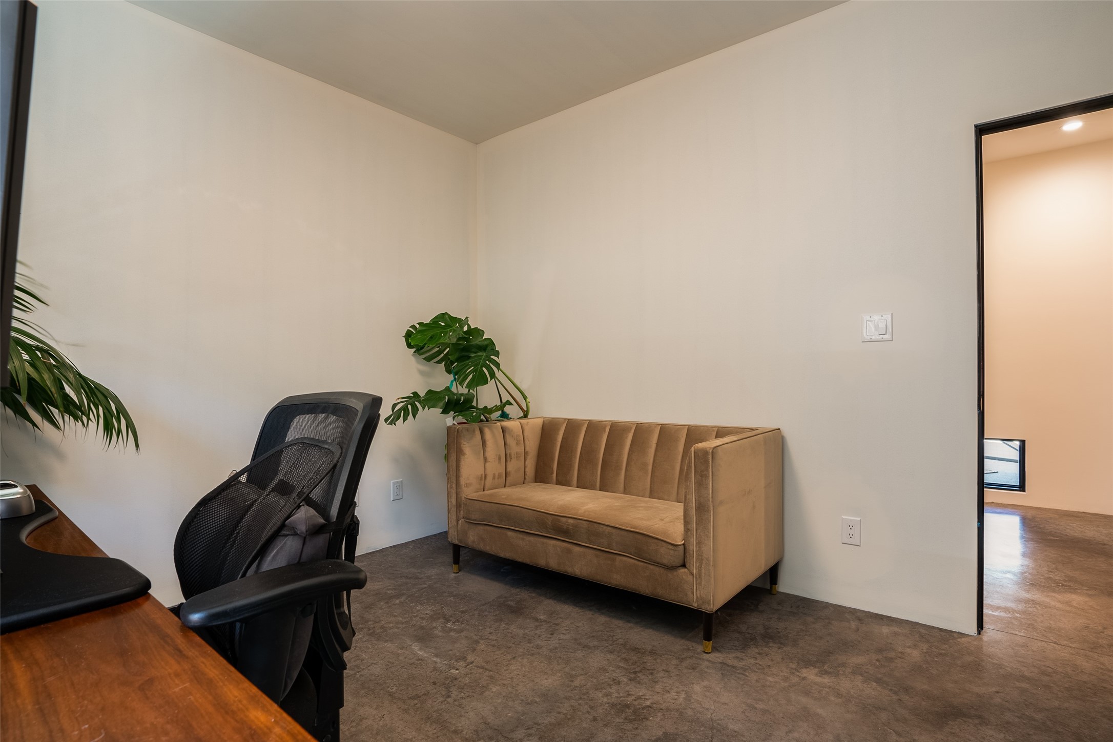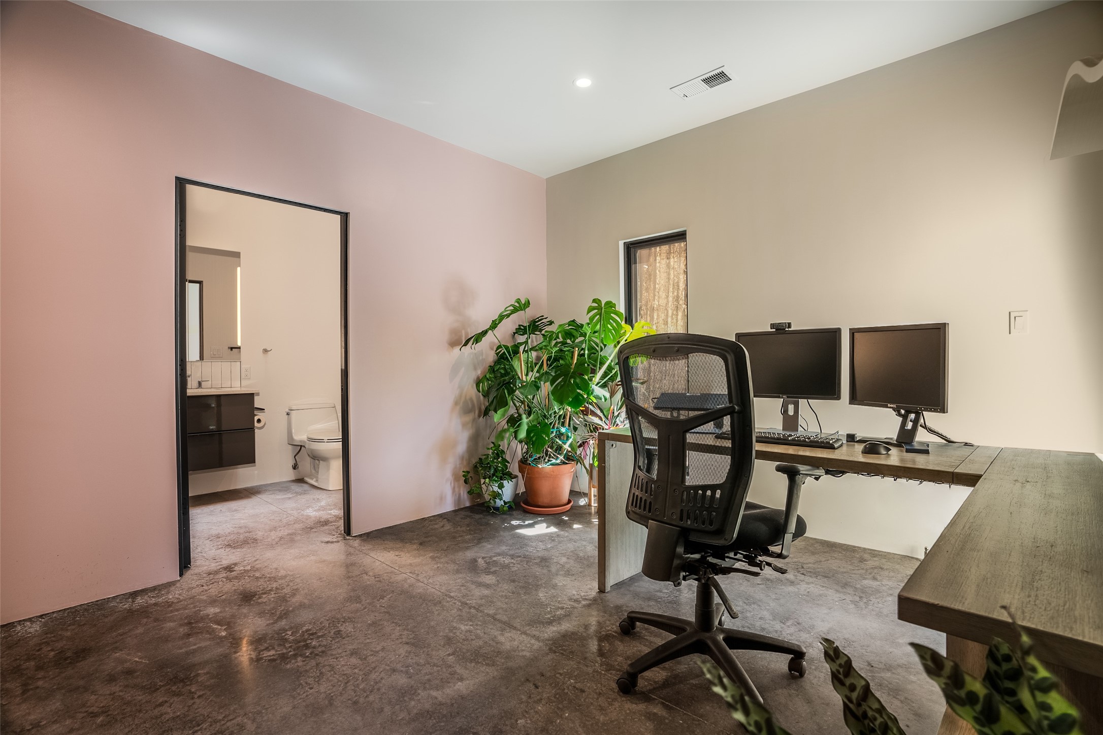 Built in 2021 by local builders, Acacia Builders, this home offers eye-catching contemporary, high-end finishes and amenities. Enter through an enclosed front yard to discover a gorgeous chef's kitchen / living area with gas insert fireplace (fireplace is hand built by a local artist and features ceramic glass doors), three bedrooms (2 ensuite), plus a dedicated office/bonus room with private entrance. The home is single level throughout, wired for high speed internet cat5 cables (in the office and one guest bedroom), has central heat & AC, energy efficient lighting and dimmers in hallways/all rooms, large windows that allow in abundant natural light, skylights throughout the house and garage, sleek bathroom and kitchen touches - including concrete & steel accents and gleaming white Quartz countertops. The open concept kitchen has an oversized Quartz island for food prep and hosting gatherings, there is warm colored concrete flooring throughout (no carpet), spacious laundry room, a secluded portal off of the primary suite & kitchen, extra high coyote and finished wall fencing, and an attached, spacious two car garage with an upgraded concrete parking apron. All of this in Oshara, a green built community convenient to the Community College district, Rodeo/Cerrillos Road area businesses and shopping. *Showings Available 7 days a week, 10am to 5pm, 3 hour notice. See remarks.*