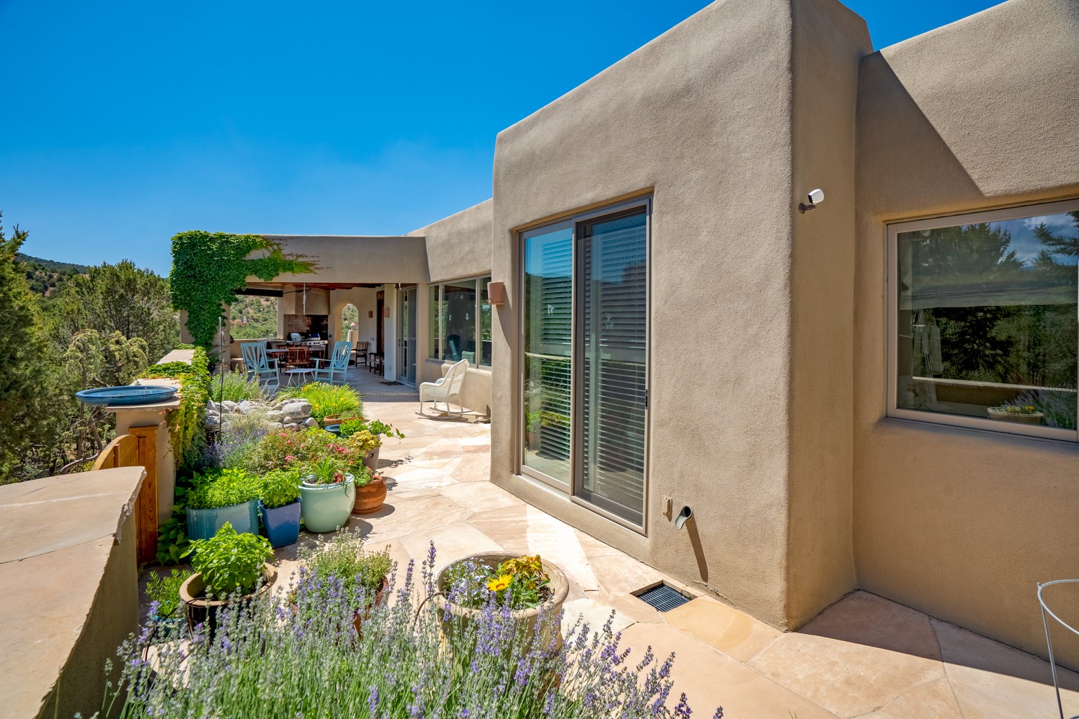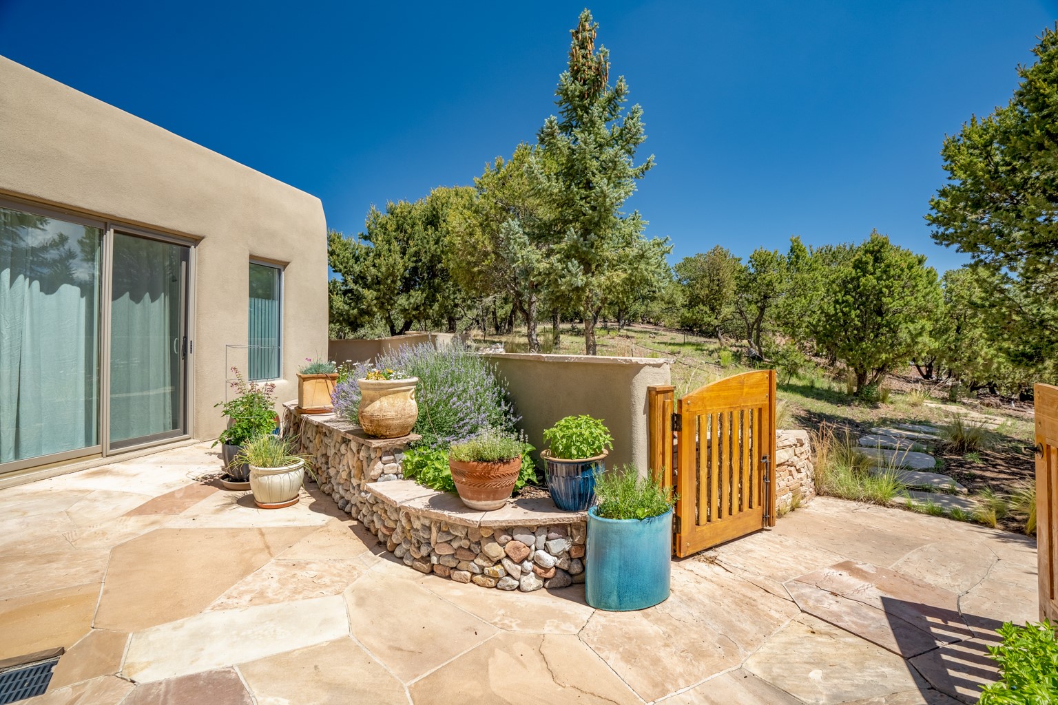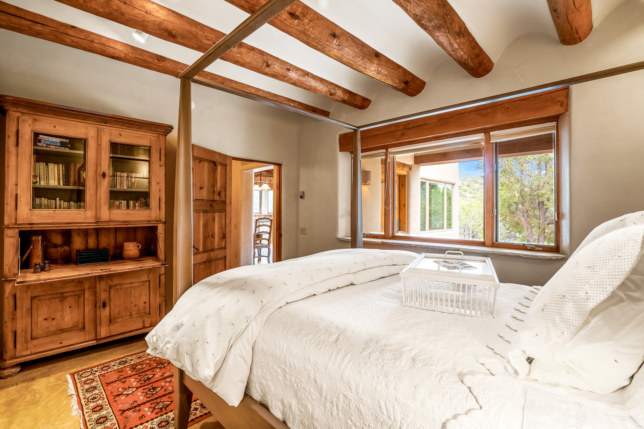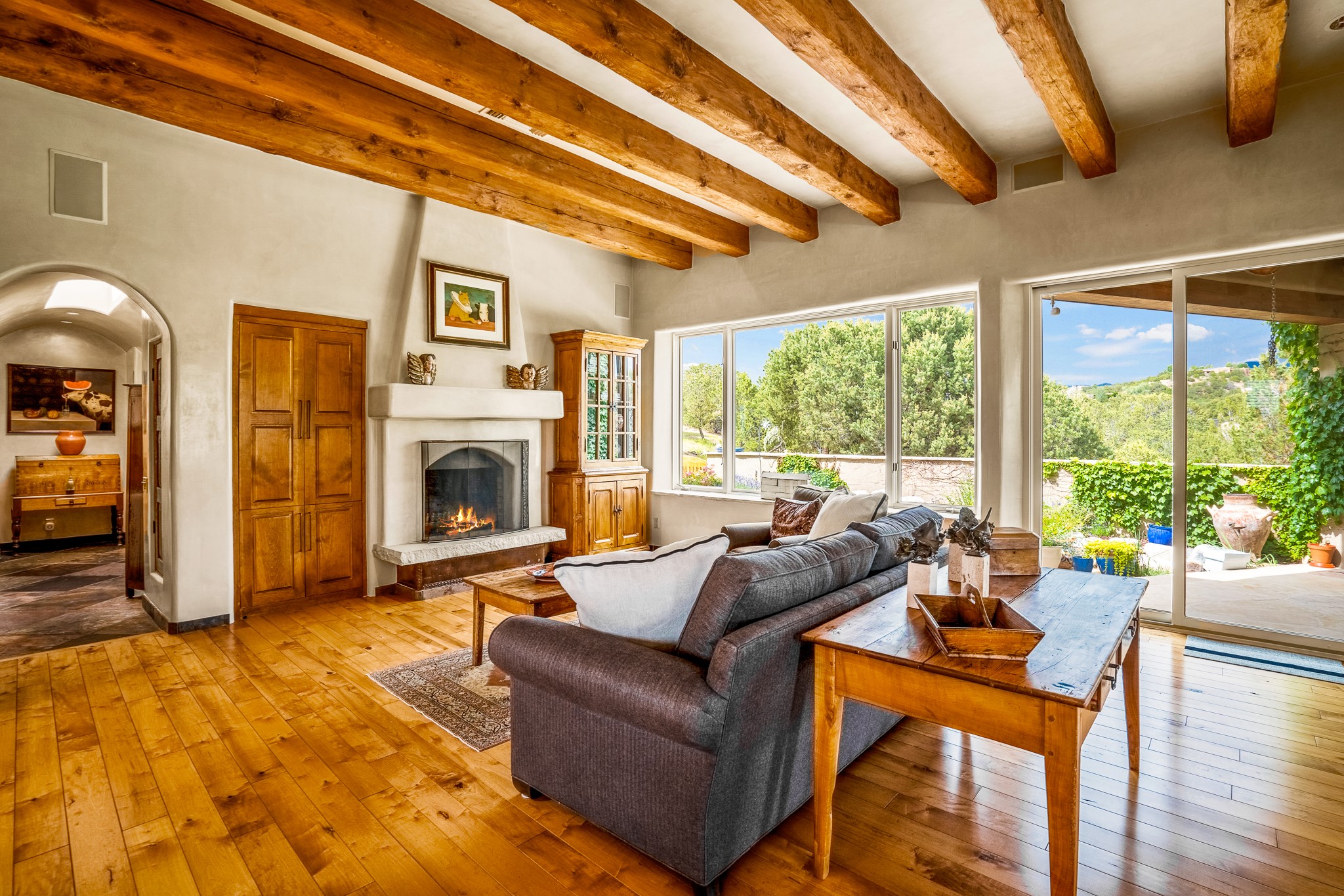 Beautiful and privately located house with guest casita that takes advantages of the mountain views. The main house with two bedrooms/two full baths boasts a cook's kitchen that opens to an airy living room with large windows. Connected to the kitchen is a large portal with gas grill, wet sink, outdoor fireplace, a landscaped courtyard with small pond and elevated deck. Large primary suite with fireplace, marble floor bath with a sliding glass door to the garden, freestanding tub and separate shower, bidet and his and her closets. Included in the house is a cooled wine cellar and four car garage. The private, attached casita with one bedroom/full bath and fully equipped kitchen has a fireplace, patio and dedicated parking. The 1.34 acre property is loaded with pinons which have been lovingly cared for by the owners. And a new roof to top off all the fine details of this house. Located back off Bishop's Lodge Rd and approximately 2 miles north of the Plaza, this home is in an area with large lots with underground utilities to better take advantage of the mountain views.