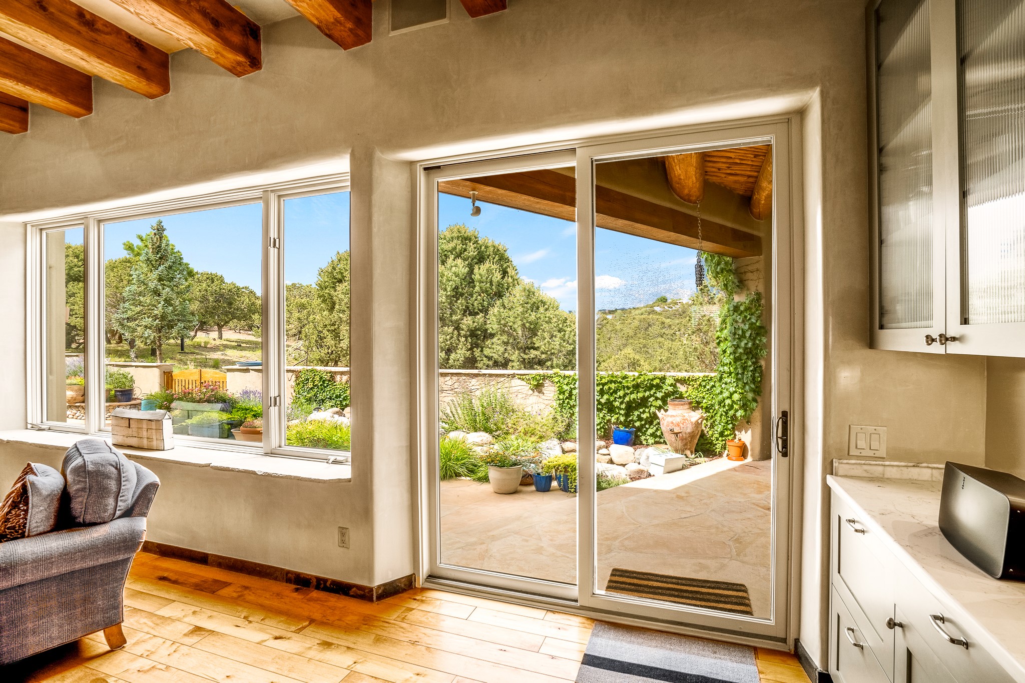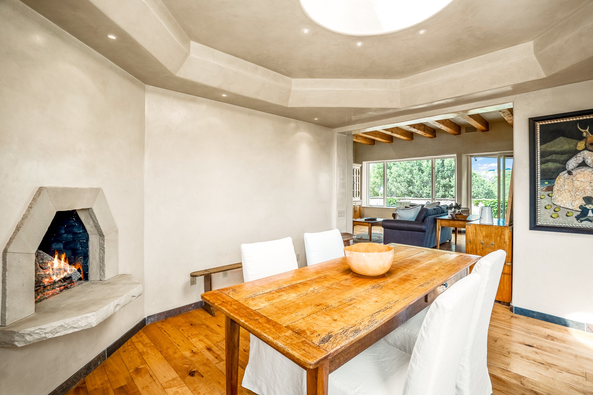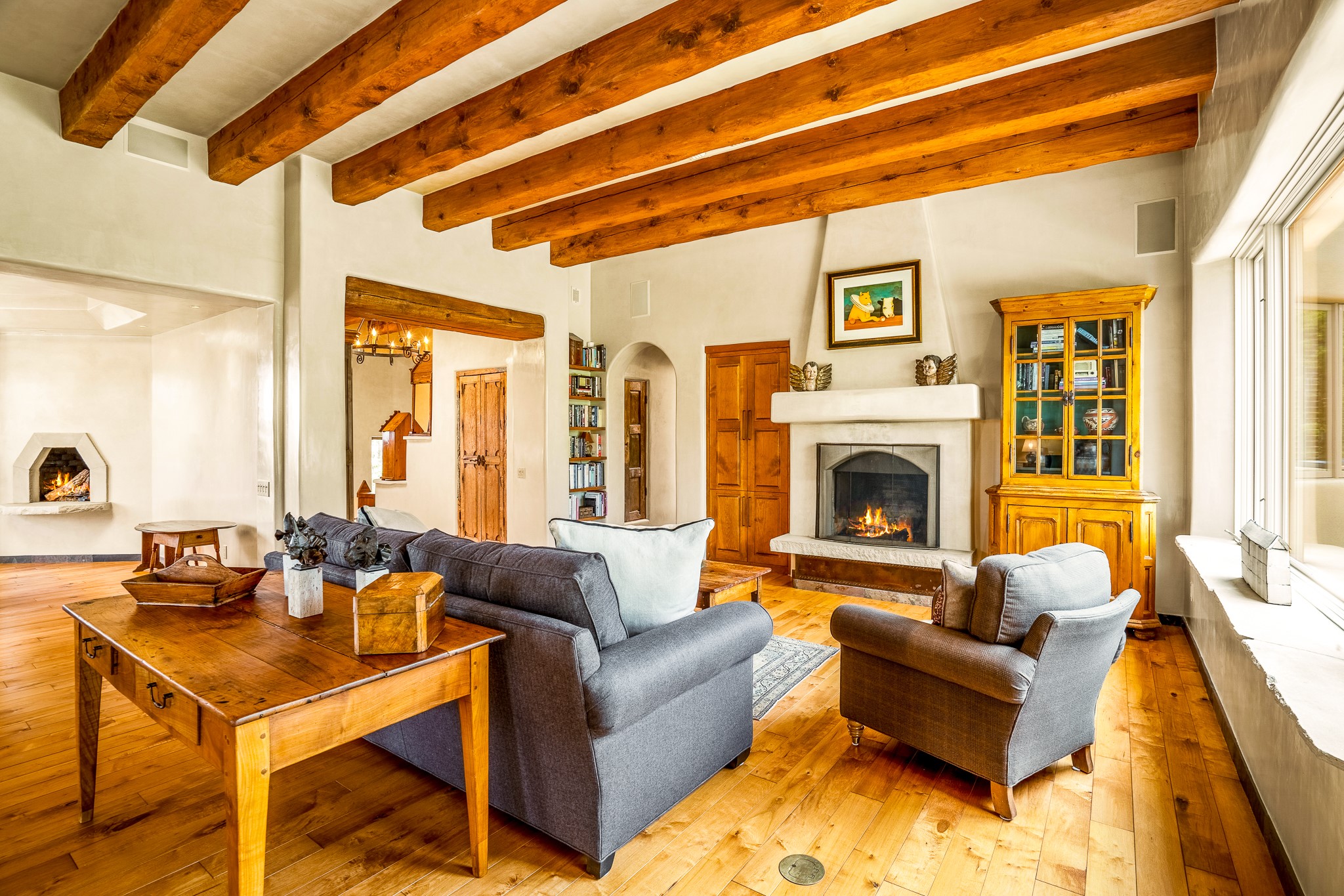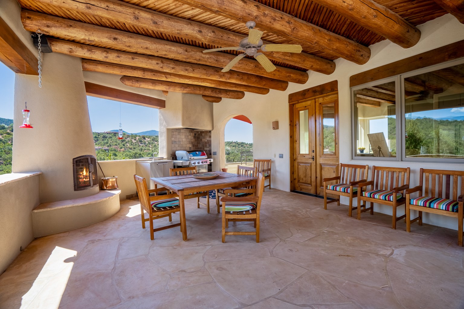 Beautiful and privately located house with guest casita that takes advantages of the mountain views. The main house with two bedrooms/two full baths boasts a cook's kitchen that opens to an airy living room with large windows. Connected to the kitchen is a large portal with gas grill, wet sink, outdoor fireplace, a landscaped courtyard with small pond and elevated deck. Large primary suite with fireplace, marble floor bath with a sliding glass door to the garden, freestanding tub and separate shower, bidet and his and her closets. Included in the house is a cooled wine cellar and four car garage. The private, attached casita with one bedroom/full bath and fully equipped kitchen has a fireplace, patio and dedicated parking. The 1.34 acre property is loaded with pinons which have been lovingly cared for by the owners. And a new roof to top off all the fine details of this house. Located back off Bishop's Lodge Rd and approximately 2 miles north of the Plaza, this home is in an area with large lots with underground utilities to better take advantage of the mountain views.