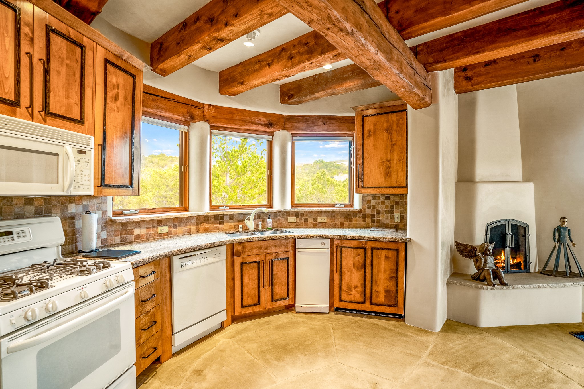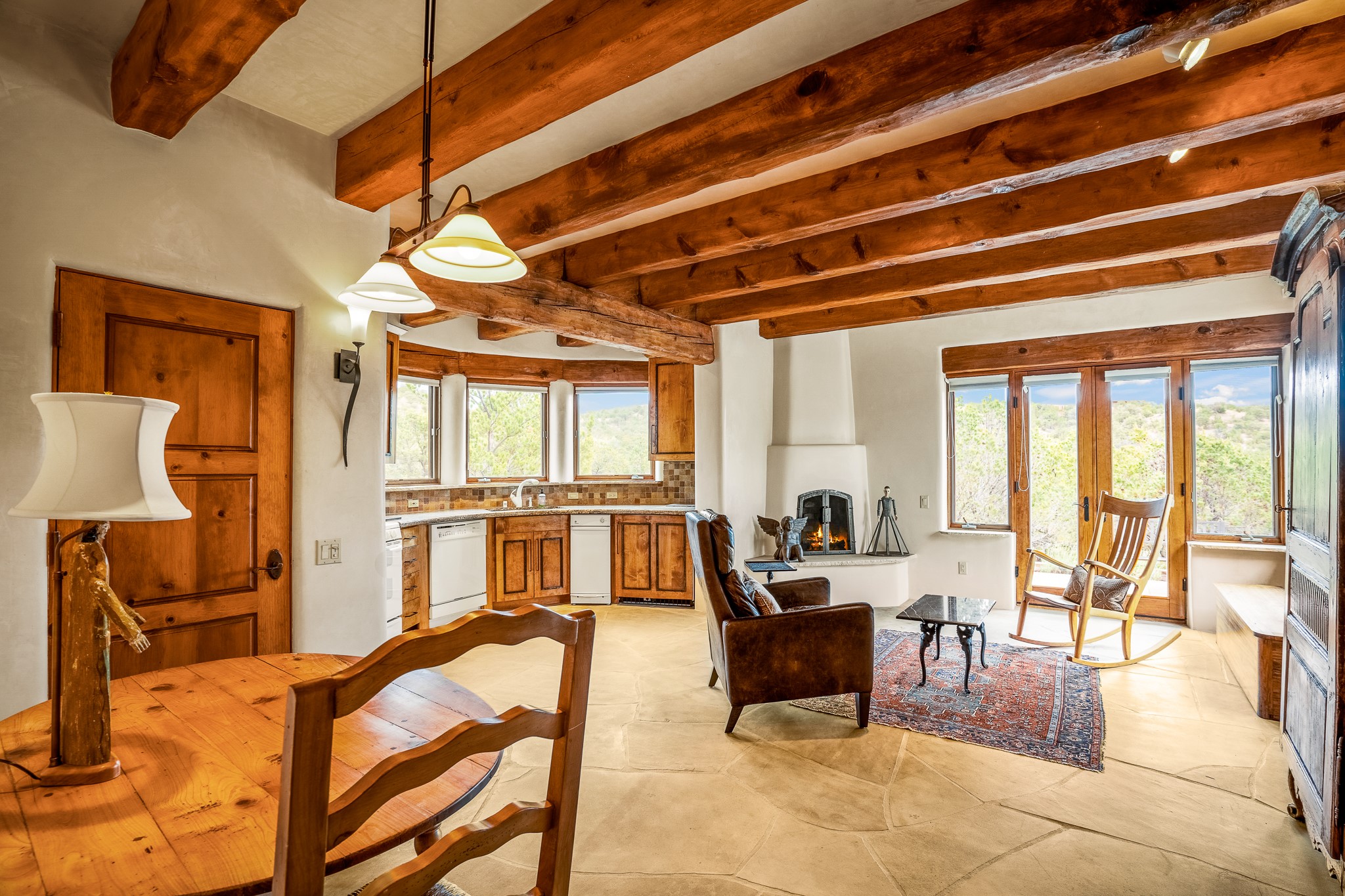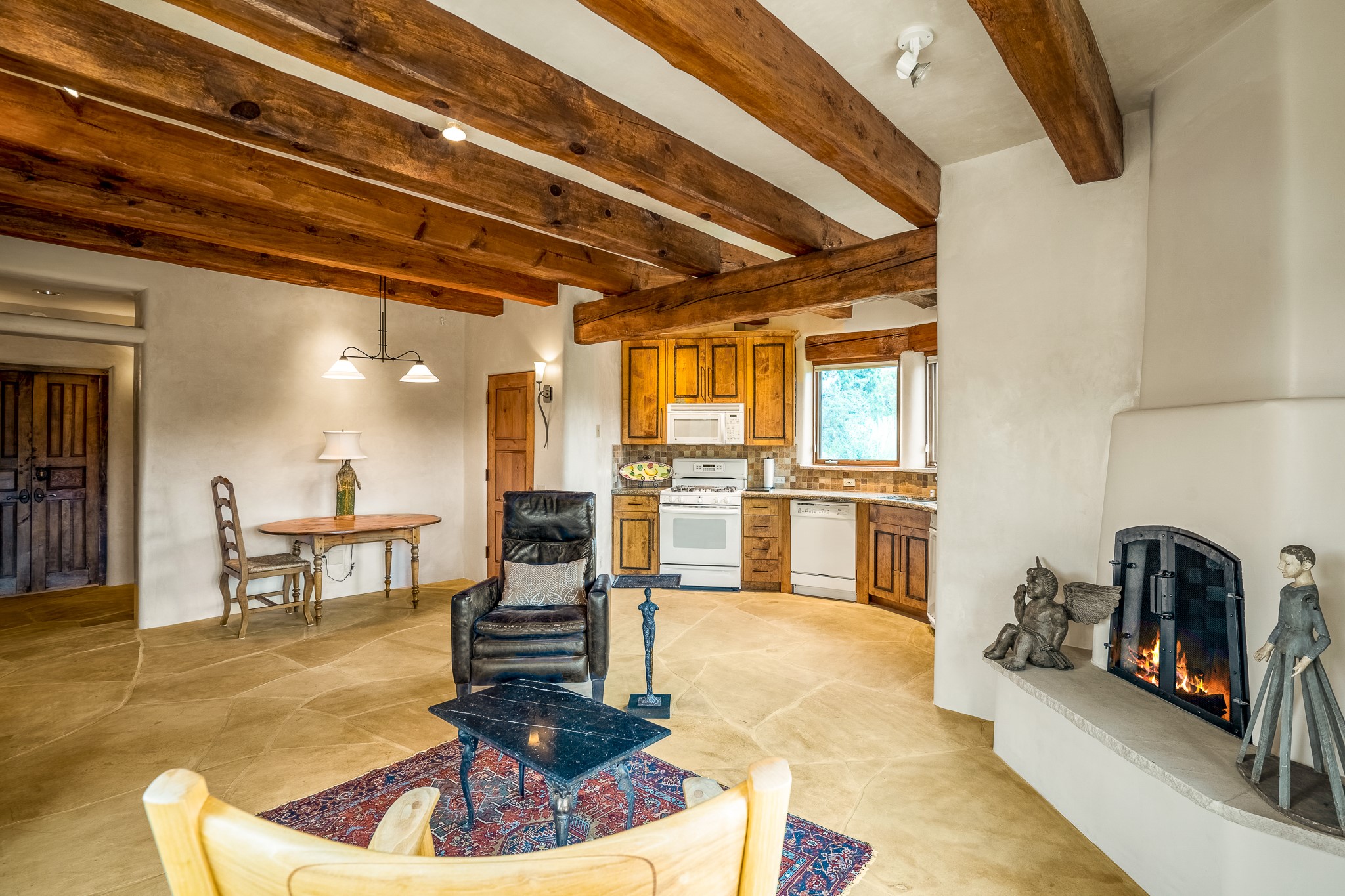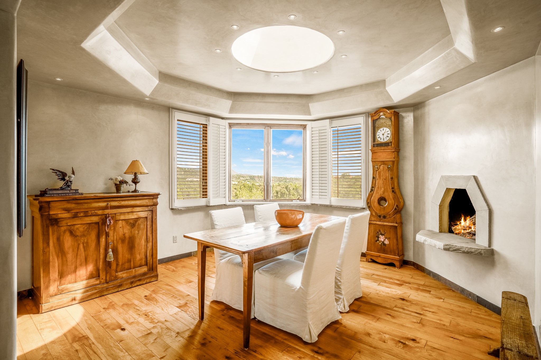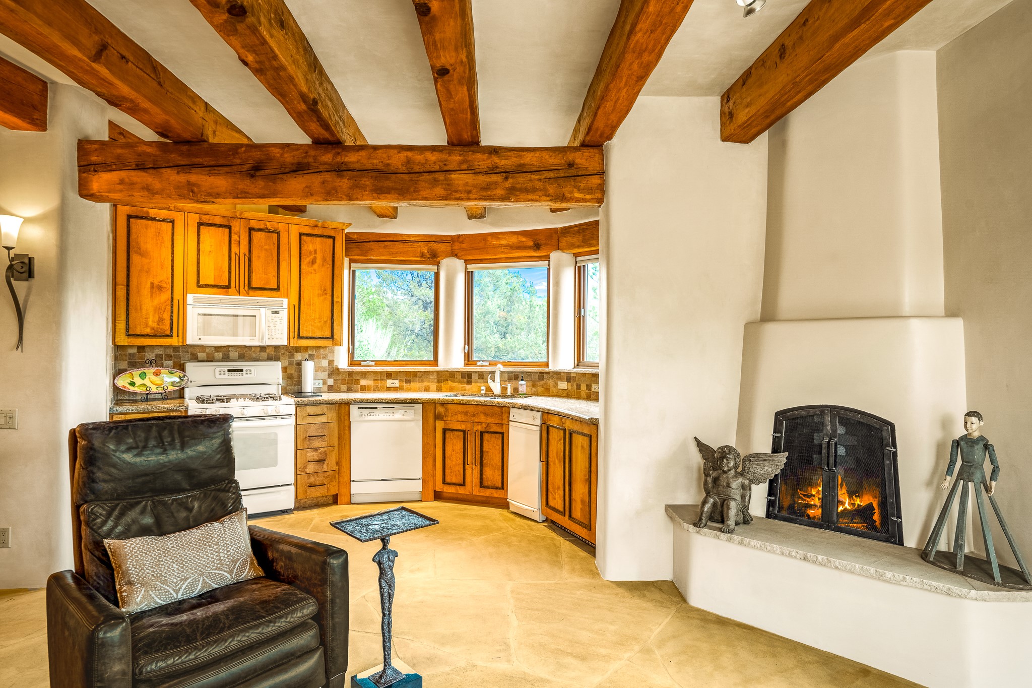Beautiful and privately located house with guest casita that takes advantages of the mountain views. The main house with two bedrooms/two full baths boasts a cook's kitchen that opens to an airy living room with large windows. Connected to the kitchen is a large portal with gas grill, wet sink, outdoor fireplace, a landscaped courtyard with small pond and elevated deck. Large primary suite with fireplace, marble floor bath with a sliding glass door to the garden, freestanding tub and separate shower, bidet and his and her closets. Included in the house is a cooled wine cellar and four car garage. The private, attached casita with one bedroom/full bath and fully equipped kitchen has a fireplace, patio and dedicated parking. The 1.34 acre property is loaded with pinons which have been lovingly cared for by the owners. And a new roof to top off all the fine details of this house. Located back off Bishop's Lodge Rd and approximately 2 miles north of the Plaza, this home is in an area with large lots with underground utilities to better take advantage of the mountain views.