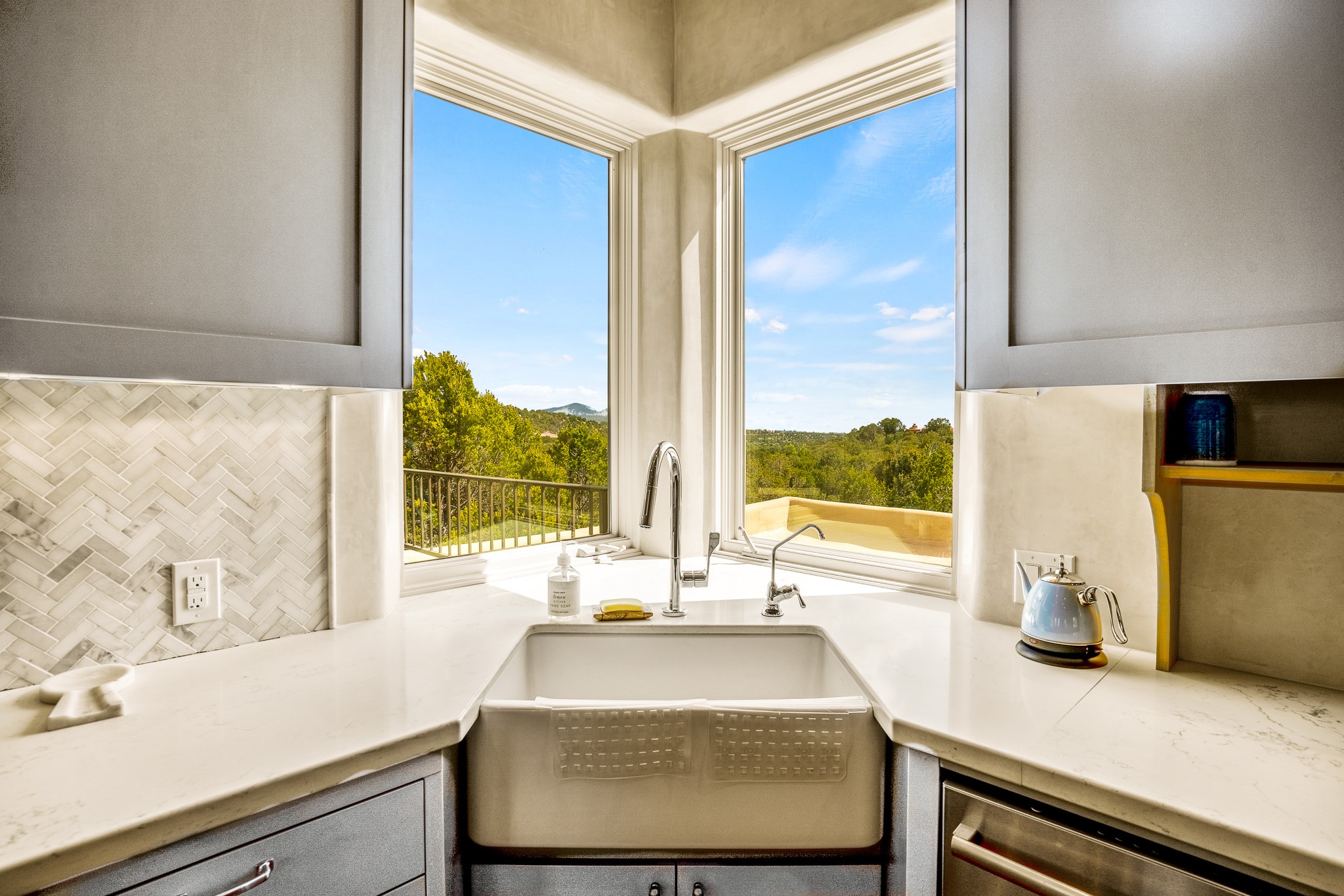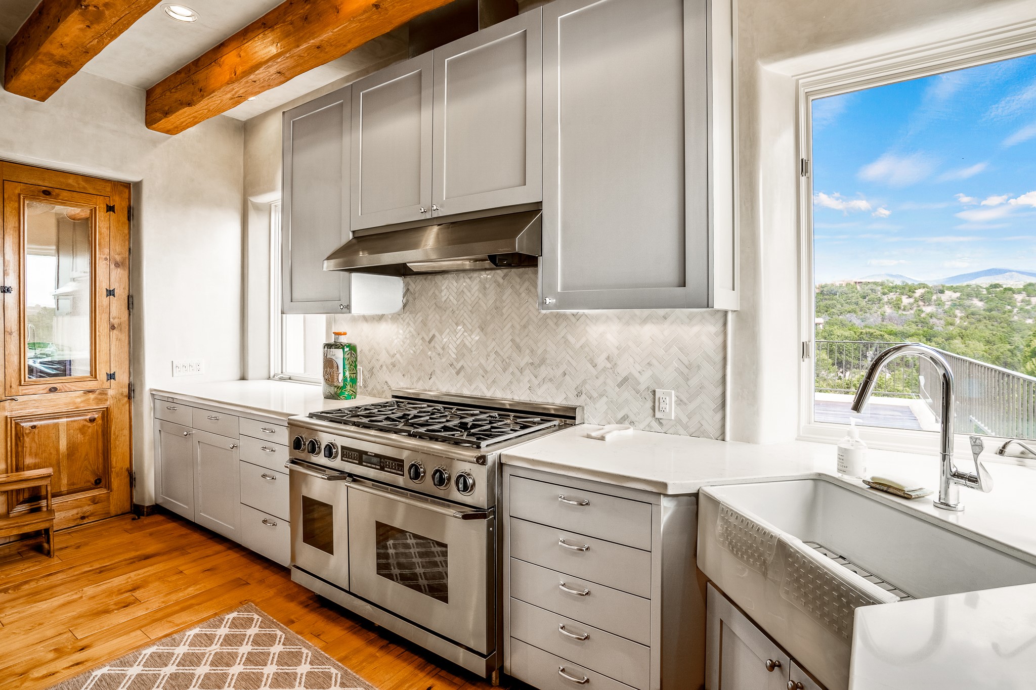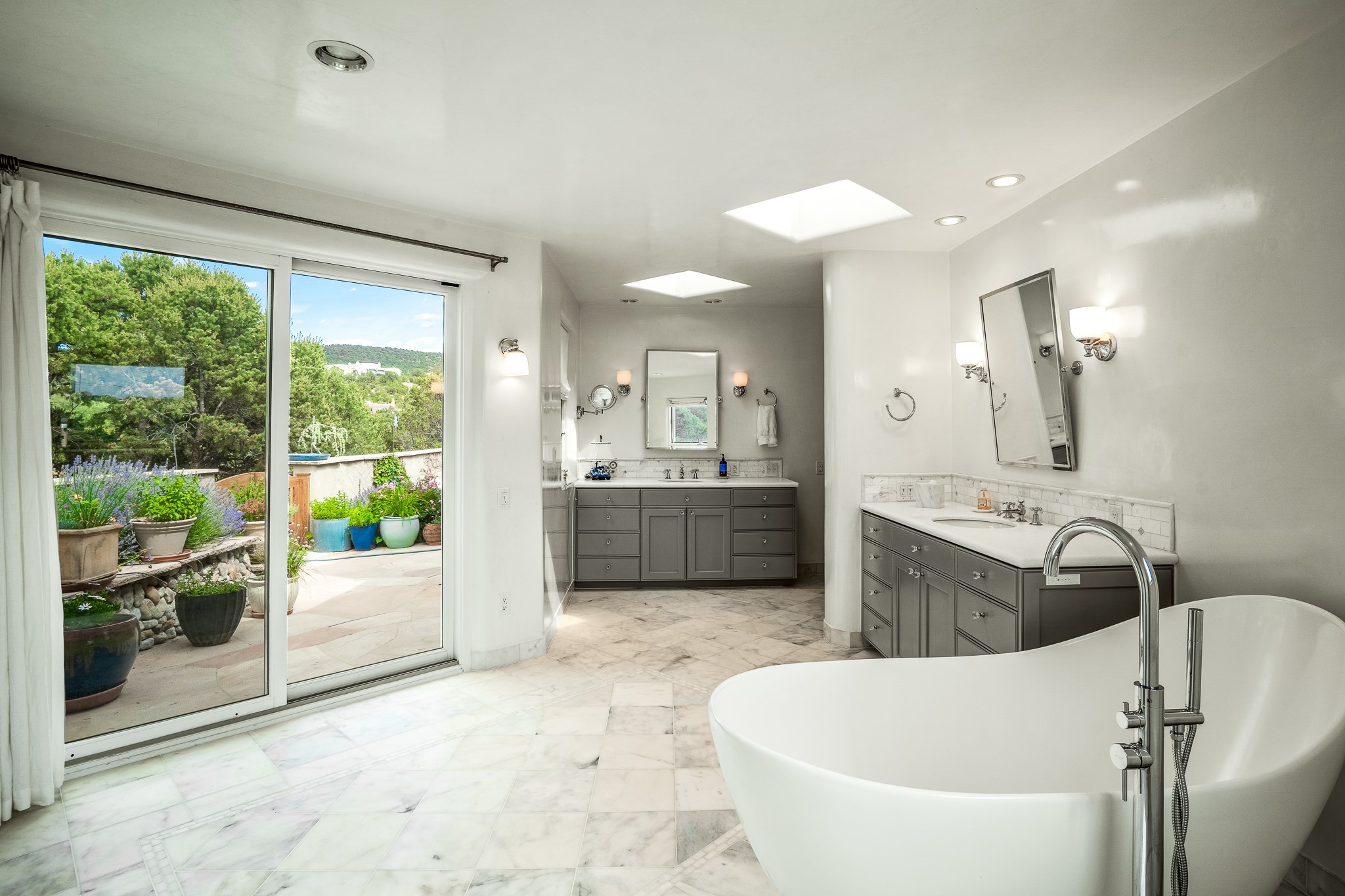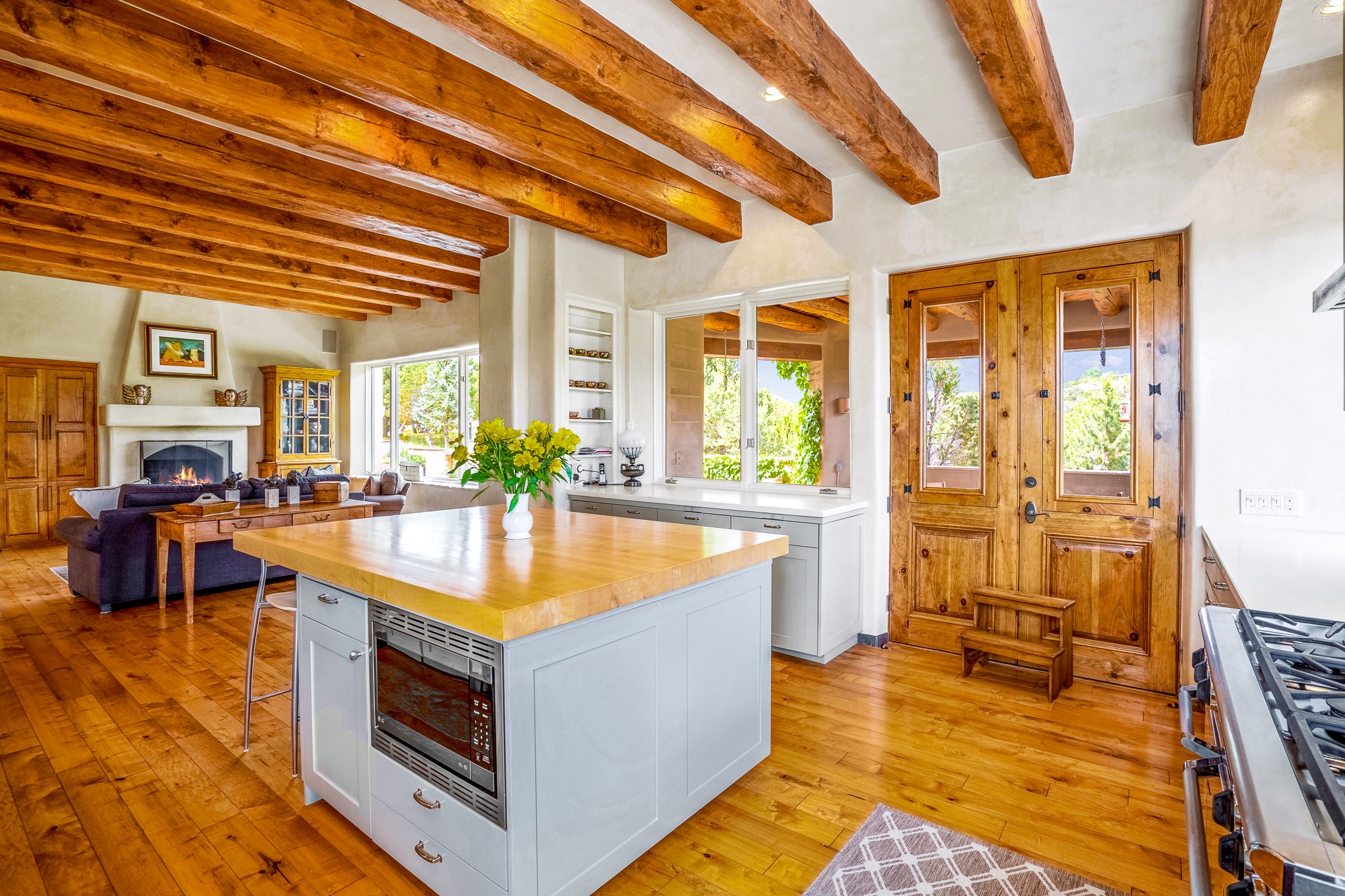 Beautiful and privately located house with guest casita that takes advantages of the mountain views. The main house with two bedrooms/two full baths boasts a cook's kitchen that opens to an airy living room with large windows. Connected to the kitchen is a large portal with gas grill, wet sink, outdoor fireplace, a landscaped courtyard with small pond and elevated deck. Large primary suite with fireplace, marble floor bath with a sliding glass door to the garden, freestanding tub and separate shower, bidet and his and her closets. Included in the house is a cooled wine cellar and four car garage. The private, attached casita with one bedroom/full bath and fully equipped kitchen has a fireplace, patio and dedicated parking. The 1.34 acre property is loaded with pinons which have been lovingly cared for by the owners. And a new roof to top off all the fine details of this house. Located back off Bishop's Lodge Rd and approximately 2 miles north of the Plaza, this home is in an area with large lots with underground utilities to better take advantage of the mountain views.
