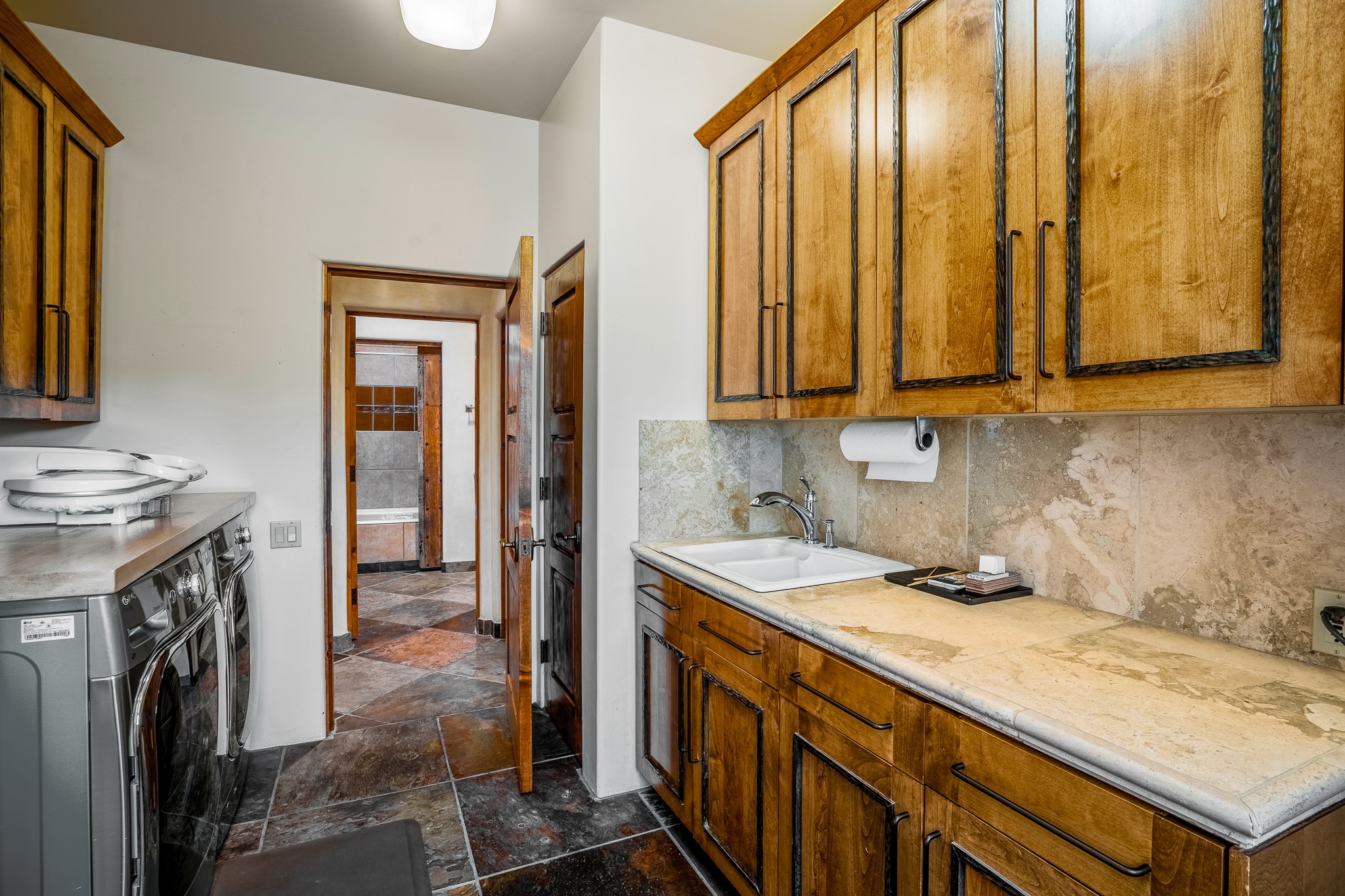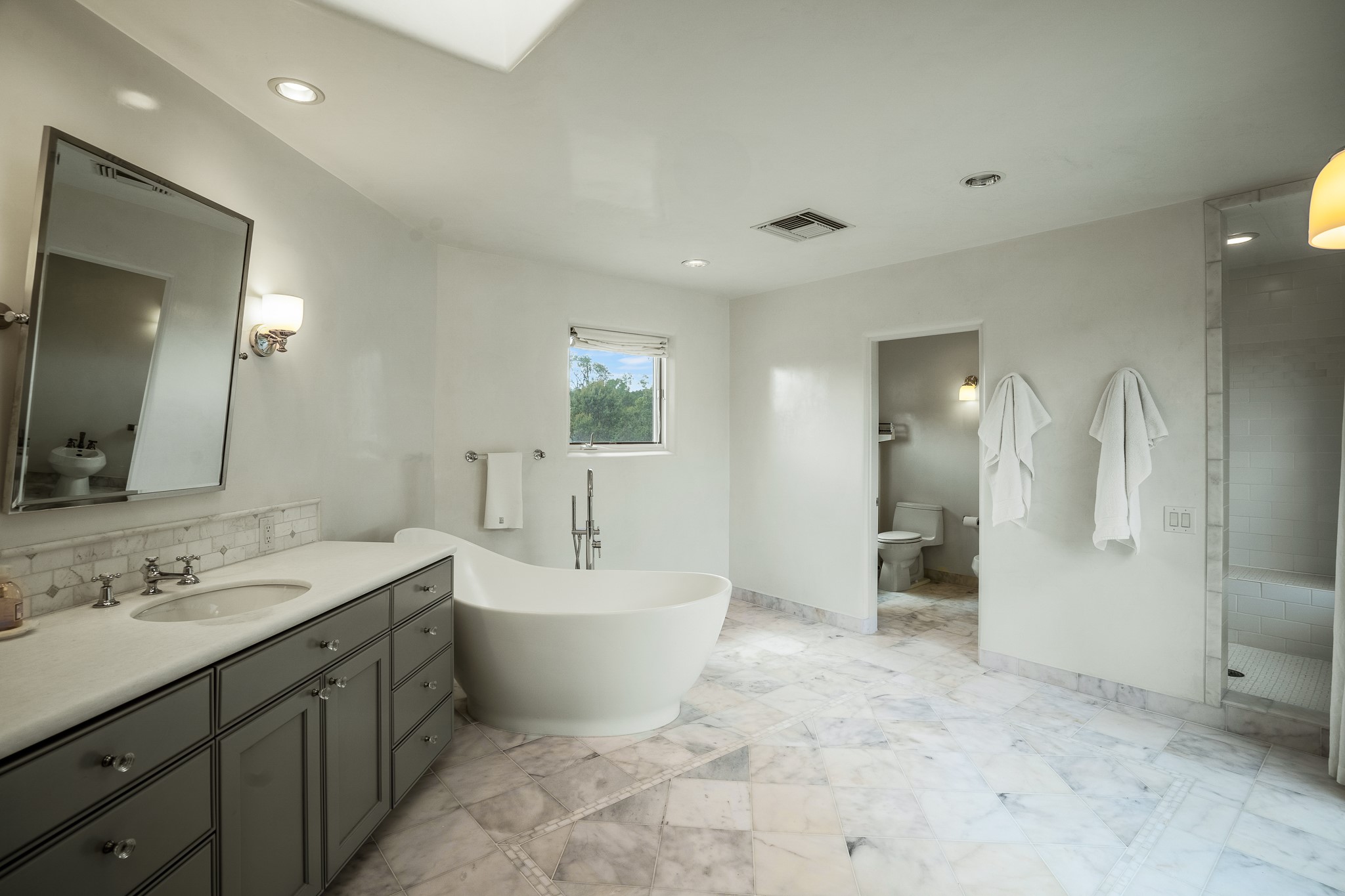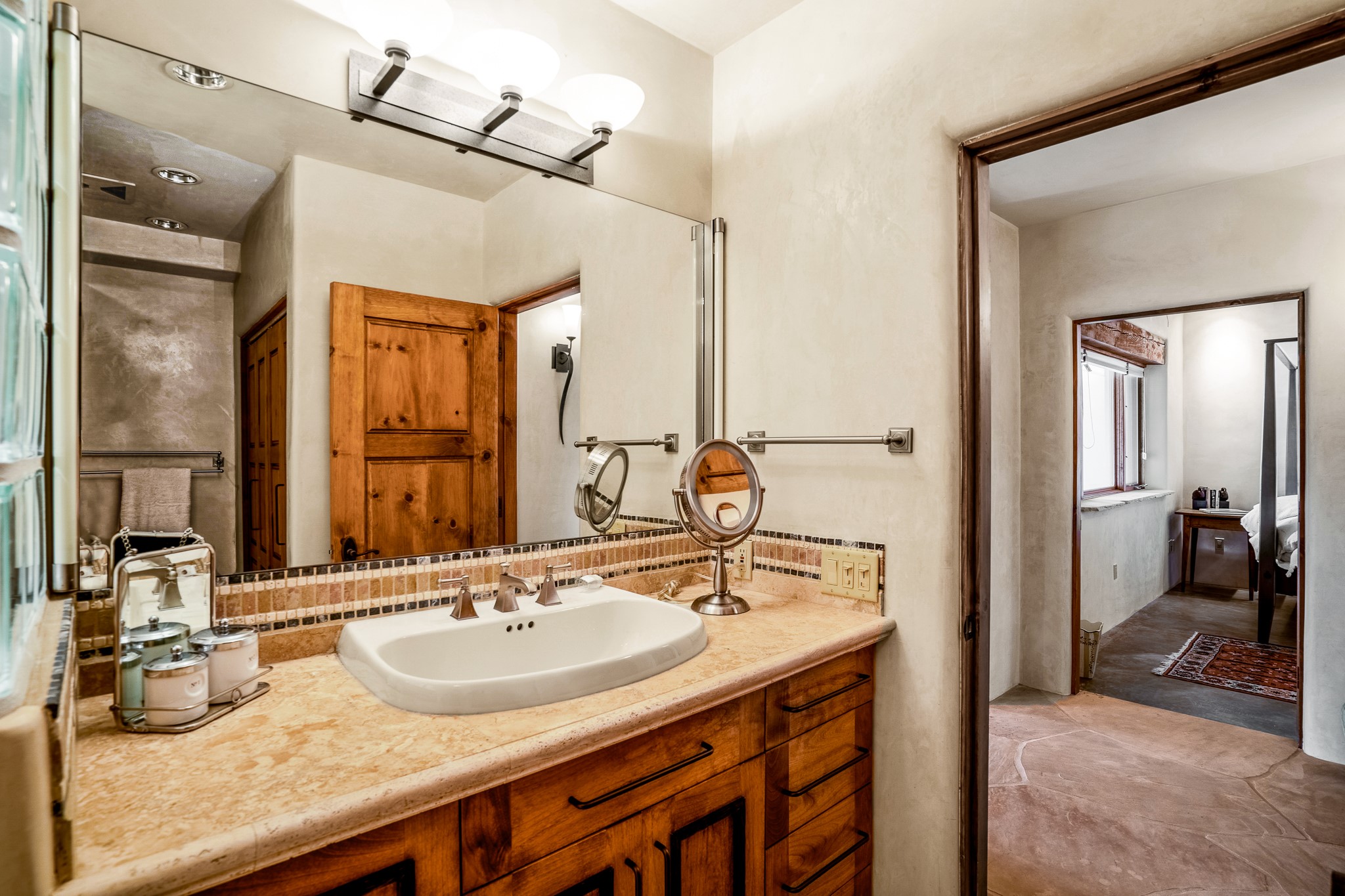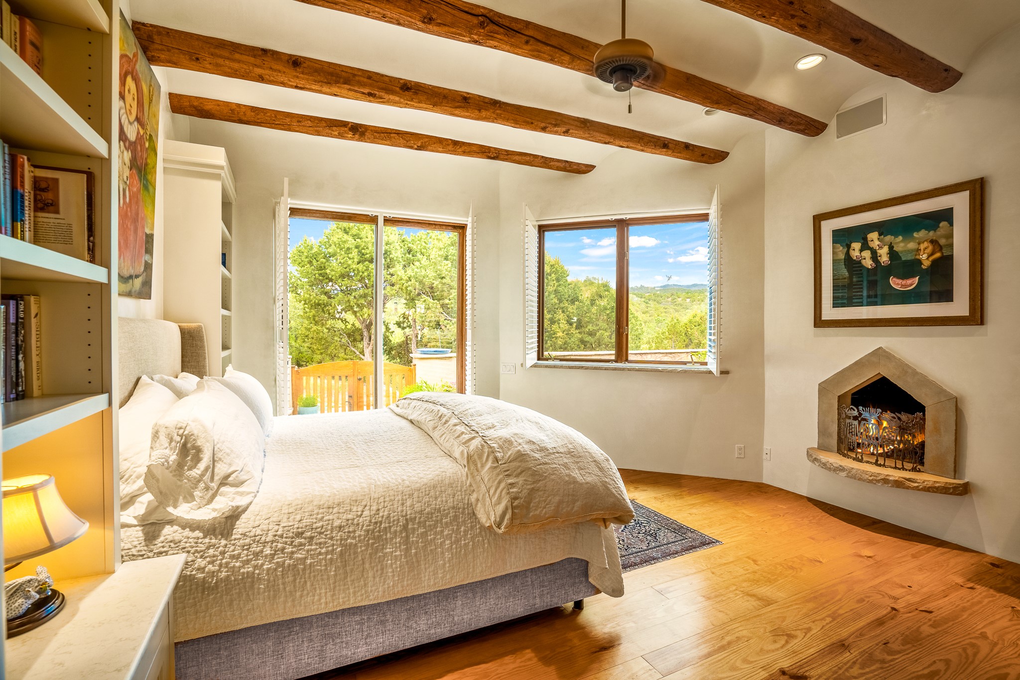 Beautiful and privately located house with guest casita that takes advantages of the mountain views. The main house with two bedrooms/two full baths boasts a cook's kitchen that opens to an airy living room with large windows. Connected to the kitchen is a large portal with gas grill, wet sink, outdoor fireplace, a landscaped courtyard with small pond and elevated deck. Large primary suite with fireplace, marble floor bath with a sliding glass door to the garden, freestanding tub and separate shower, bidet and his and her closets. Included in the house is a cooled wine cellar and four car garage. The private, attached casita with one bedroom/full bath and fully equipped kitchen has a fireplace, patio and dedicated parking. The 1.34 acre property is loaded with pinons which have been lovingly cared for by the owners. And a new roof to top off all the fine details of this house. Located back off Bishop's Lodge Rd and approximately 2 miles north of the Plaza, this home is in an area with large lots with underground utilities to better take advantage of the mountain views.