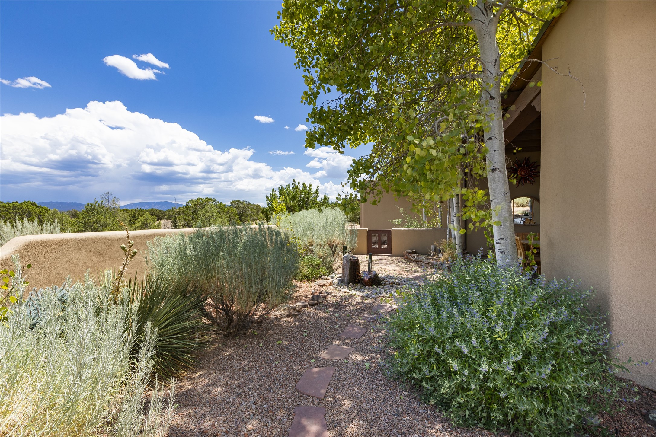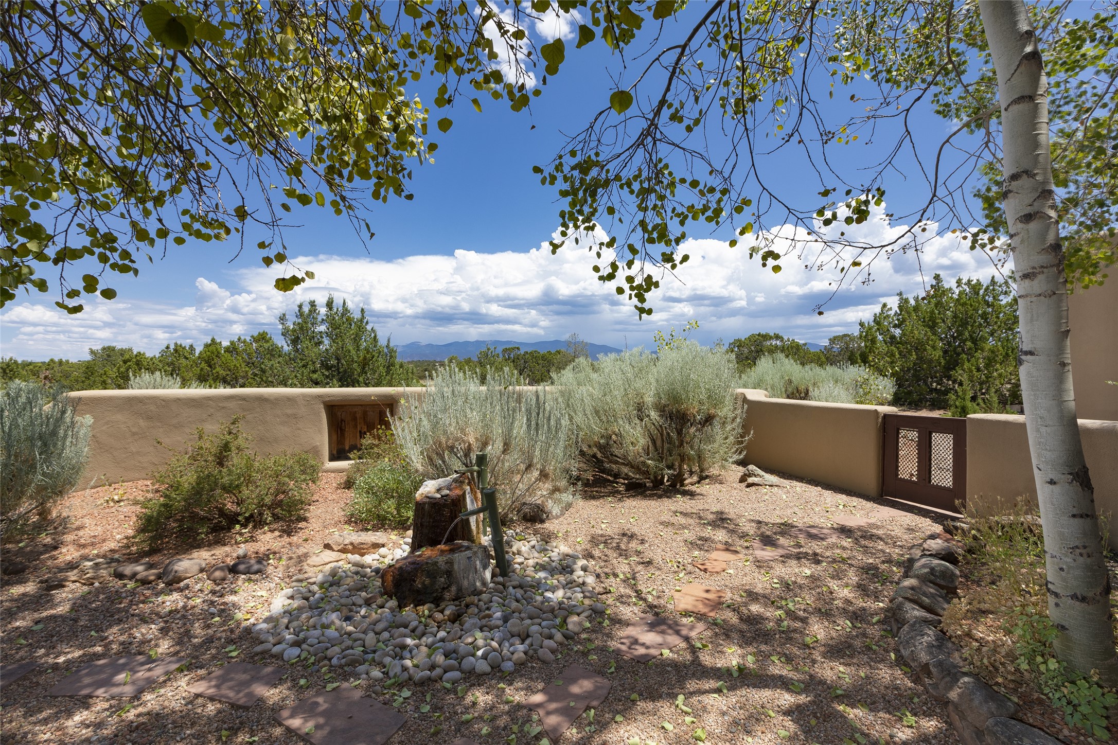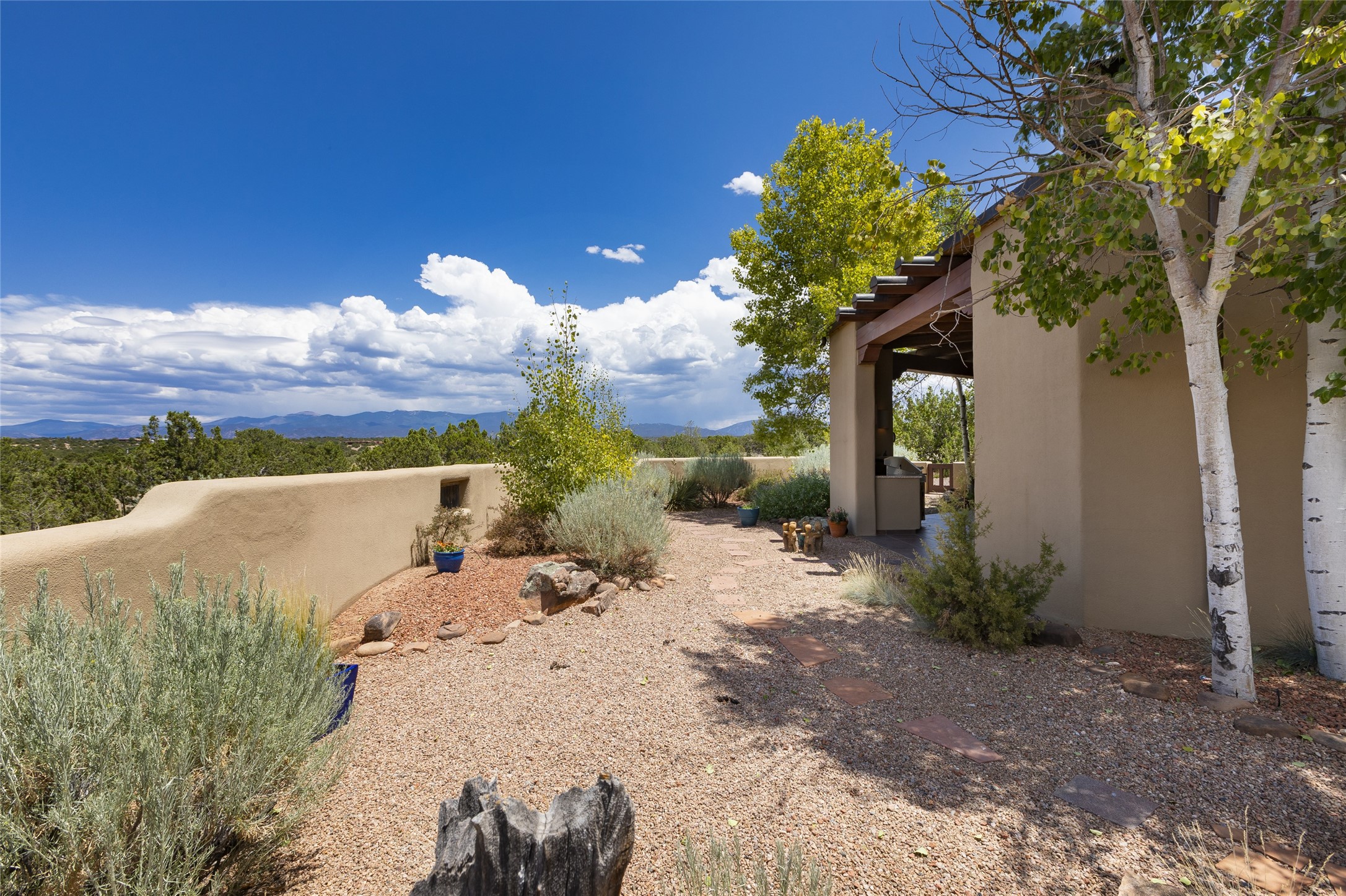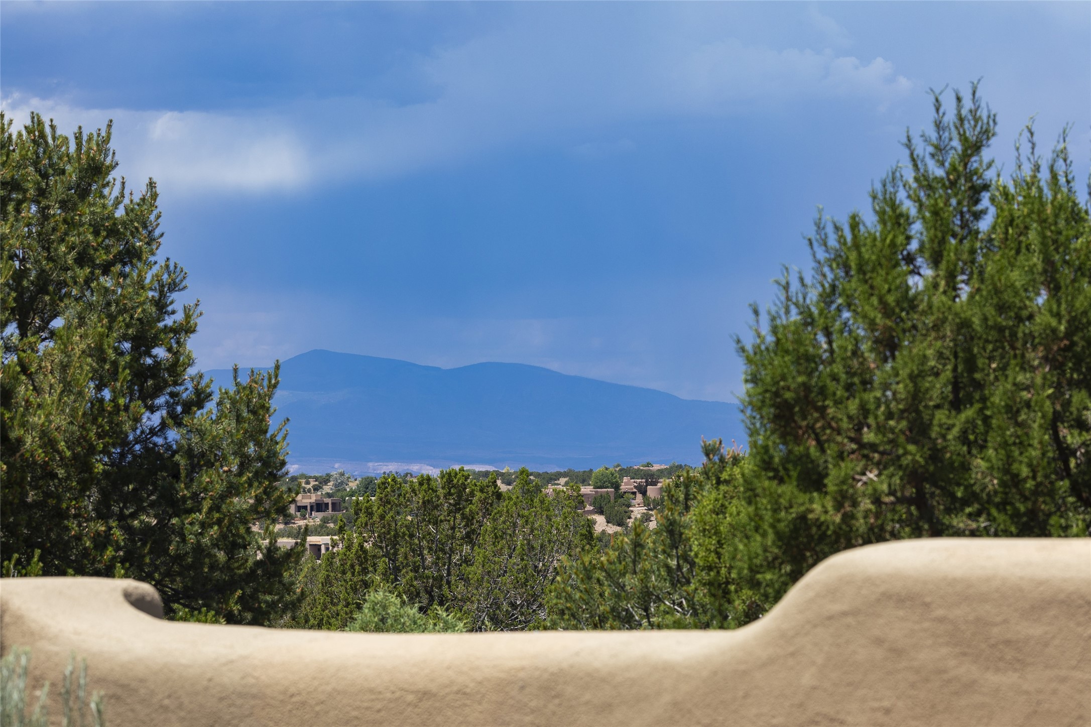 Timeless Santa Fe architecture, spectacular Sangre de Cristo and Jemez Mountain views, and superior outdoor living areas are celebrated at this exciting residence built by renowned builder, Michael Kern. Centrally located within the master planned community of Las Campanas, minutes to the Plaza and The Club at Las Campanas, this exquisite home impresses with exceptional design and the highest level of craftsmanship throughout. Designed to embrace the ultimate Santa Fe lifestyle, this quality single level home offers an excellent separation of space, with a private owner's suite complete with a fireplace, portal access, a tranquil spa-like bath with a jetted tub, dual vanities, walk-in shower and a large walk-in closet. Guests enjoy their own separate guest wing complete with two ensuite bedrooms with Sangre De Cristo Mountain views, private portals and separate entrances. Located off the front entrance is a well-appointed office or ideal fourth bedroom, with custom built-in cabinetry and courtyard views. The spacious chef's kitchen, ideal for entertaining, delights with luxury appliances including a 6-burner gas range with a griddle and double ovens, a free-standing island, and a breakfast bar, all of which open to the spacious living room with a grand fireplace, dining room, and all outdoor living areas. The outdoor living experience is enhanced by deep surround portals, a park-like setting, fully enclosed front and back walled courtyards with an outdoor built-in BBQ, water feature, and expansive back outdoor dining with views of the Sangre de Cristo Mountains. Luxury finishes include plaster walls, rich wood ceiling accents with vigas and corbels throughout, 22 skylights, and rare old-world craftsmanship throughout this one of kind residence. The owner's Equity Golf Membership to The Club at Las Campanas is available for purchase on a separate bill of sale.