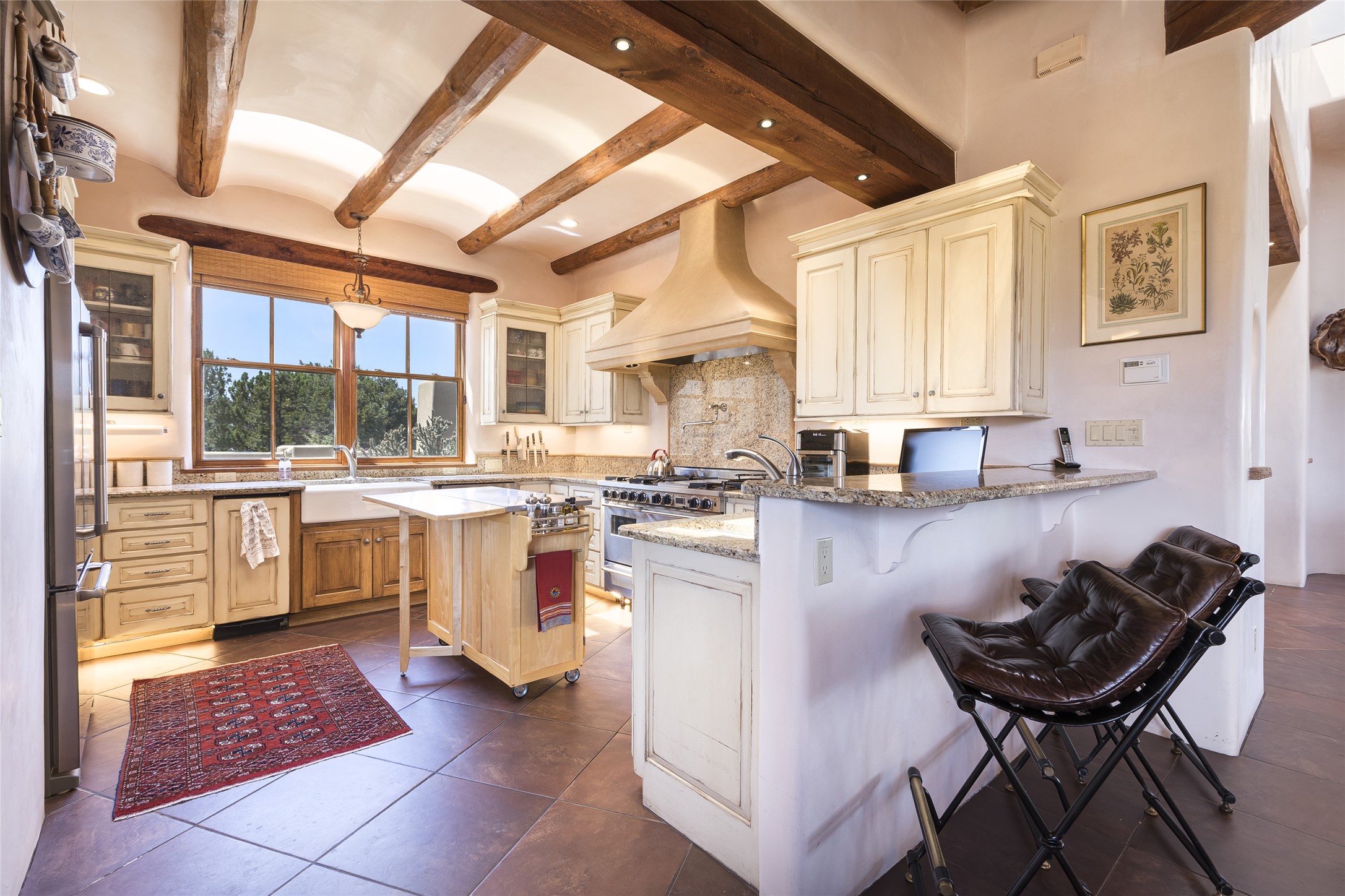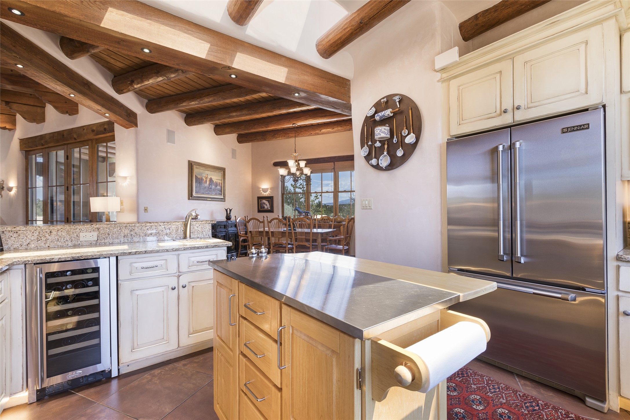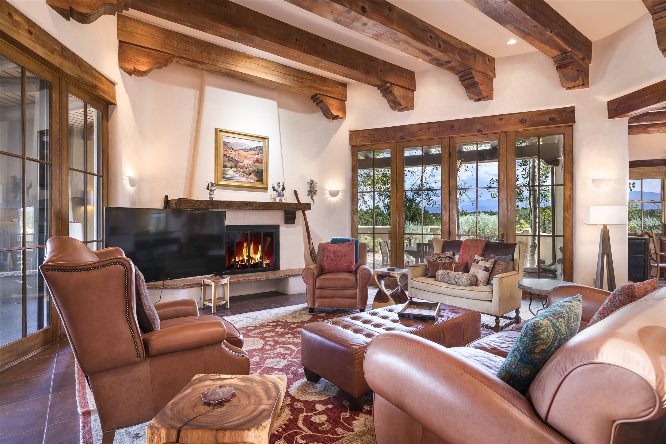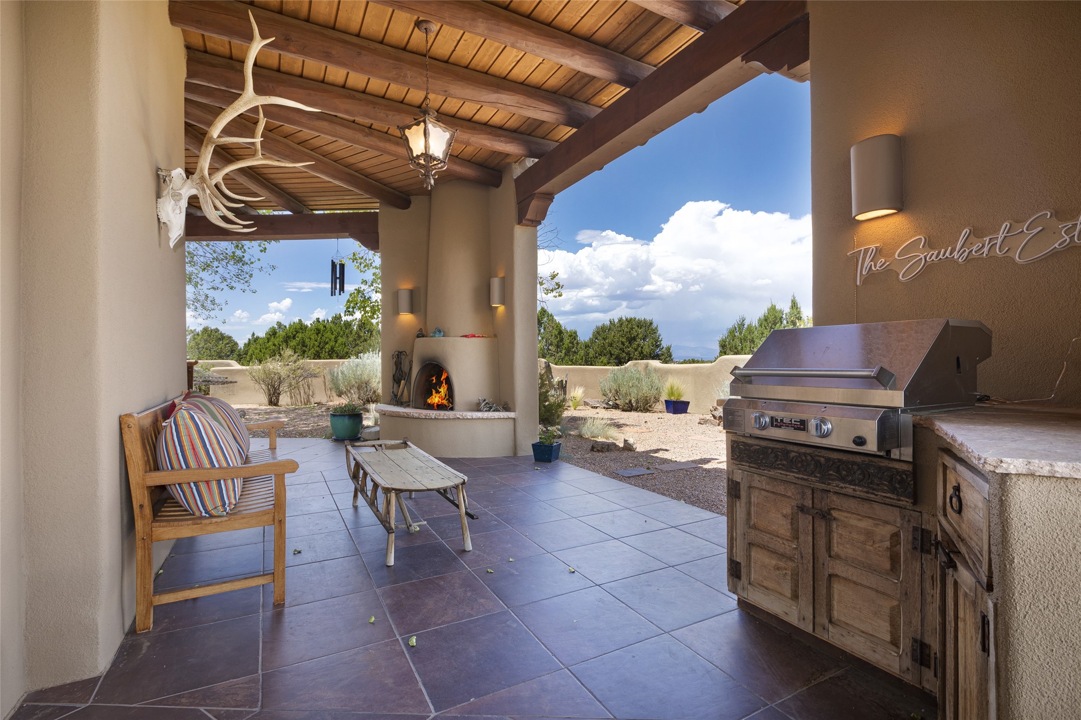 Timeless Santa Fe architecture, spectacular Sangre de Cristo and Jemez Mountain views, and superior outdoor living areas are celebrated at this exciting residence built by renowned builder, Michael Kern. Centrally located within the master planned community of Las Campanas, minutes to the Plaza and The Club at Las Campanas, this exquisite home impresses with exceptional design and the highest level of craftsmanship throughout. Designed to embrace the ultimate Santa Fe lifestyle, this quality single level home offers an excellent separation of space, with a private owner's suite complete with a fireplace, portal access, a tranquil spa-like bath with a jetted tub, dual vanities, walk-in shower and a large walk-in closet. Guests enjoy their own separate guest wing complete with two ensuite bedrooms with Sangre De Cristo Mountain views, private portals and separate entrances. Located off the front entrance is a well-appointed office or ideal fourth bedroom, with custom built-in cabinetry and courtyard views. The spacious chef's kitchen, ideal for entertaining, delights with luxury appliances including a 6-burner gas range with a griddle and double ovens, a free-standing island, and a breakfast bar, all of which open to the spacious living room with a grand fireplace, dining room, and all outdoor living areas. The outdoor living experience is enhanced by deep surround portals, a park-like setting, fully enclosed front and back walled courtyards with an outdoor built-in BBQ, water feature, and expansive back outdoor dining with views of the Sangre de Cristo Mountains. Luxury finishes include plaster walls, rich wood ceiling accents with vigas and corbels throughout, 22 skylights, and rare old-world craftsmanship throughout this one of kind residence. The owner's Equity Golf Membership to The Club at Las Campanas is available for purchase on a separate bill of sale.