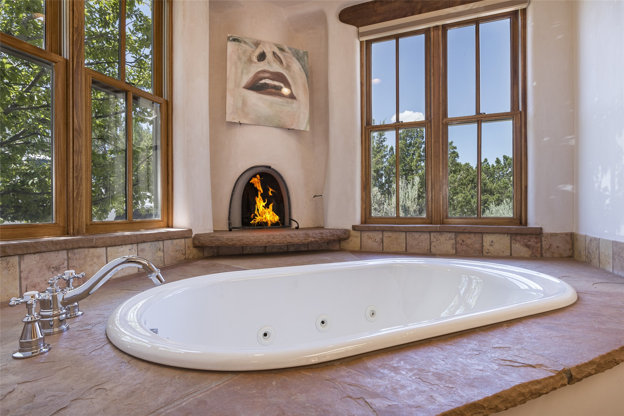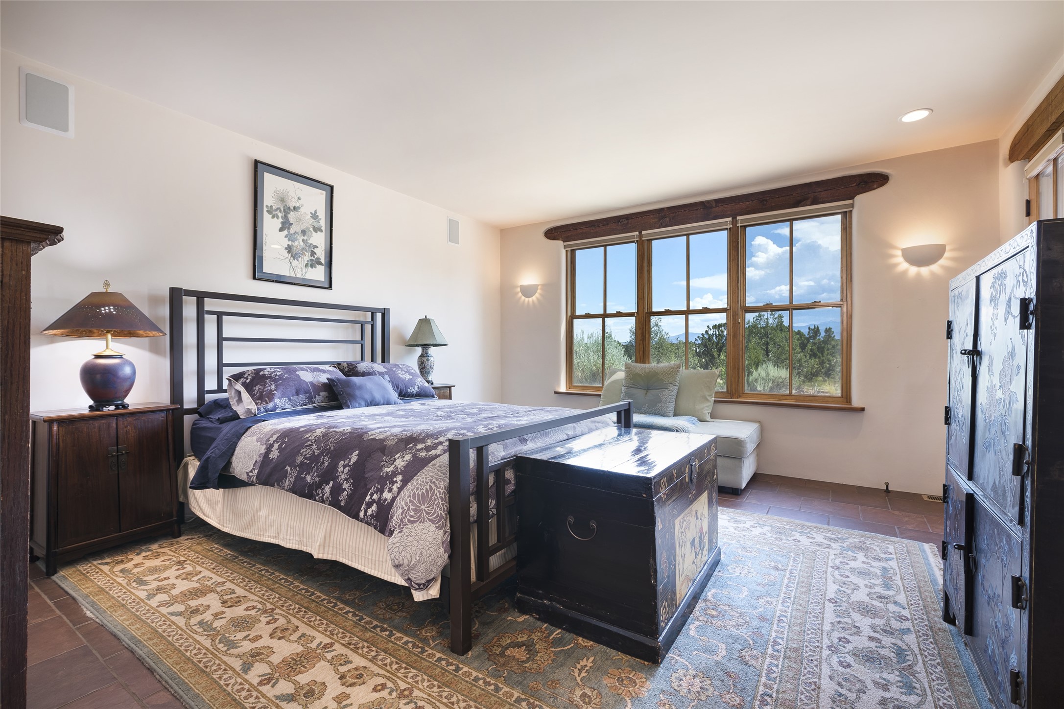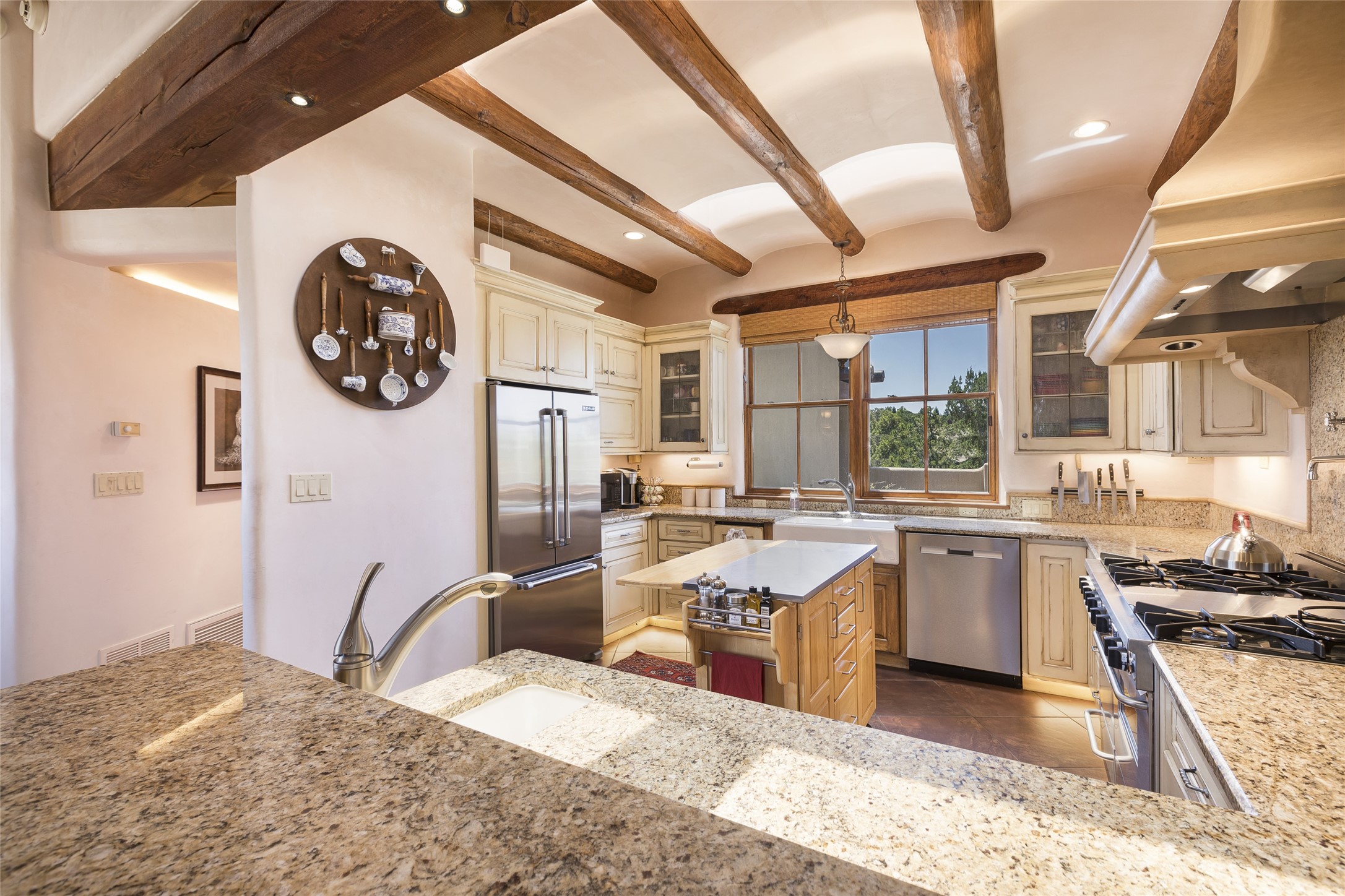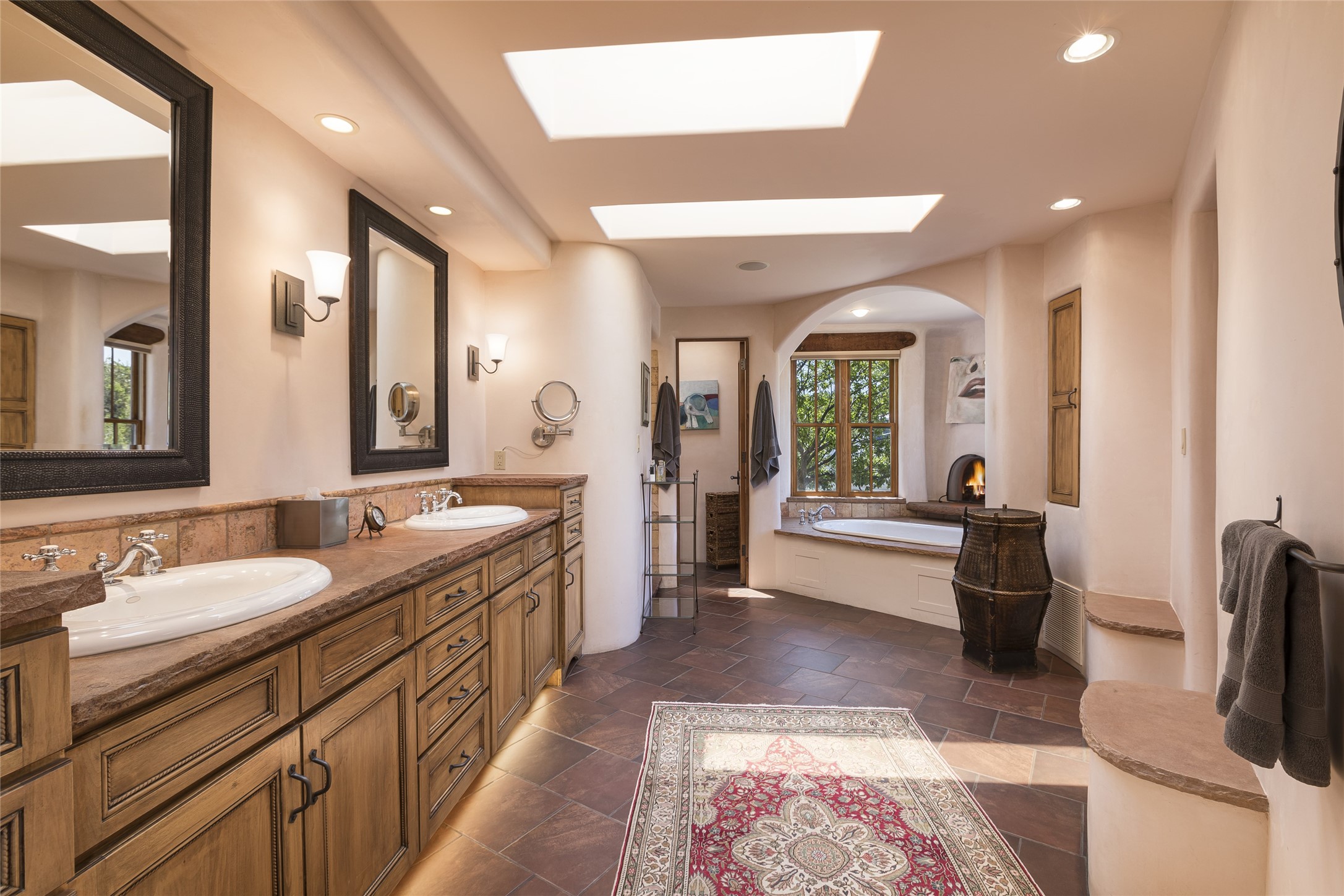 Timeless Santa Fe architecture, spectacular Sangre de Cristo and Jemez Mountain views, and superior outdoor living areas are celebrated at this exciting residence built by renowned builder, Michael Kern. Centrally located within the master planned community of Las Campanas, minutes to the Plaza and The Club at Las Campanas, this exquisite home impresses with exceptional design and the highest level of craftsmanship throughout. Designed to embrace the ultimate Santa Fe lifestyle, this quality single level home offers an excellent separation of space, with a private owner's suite complete with a fireplace, portal access, a tranquil spa-like bath with a jetted tub, dual vanities, walk-in shower and a large walk-in closet. Guests enjoy their own separate guest wing complete with two ensuite bedrooms with Sangre De Cristo Mountain views, private portals and separate entrances. Located off the front entrance is a well-appointed office or ideal fourth bedroom, with custom built-in cabinetry and courtyard views. The spacious chef's kitchen, ideal for entertaining, delights with luxury appliances including a 6-burner gas range with a griddle and double ovens, a free-standing island, and a breakfast bar, all of which open to the spacious living room with a grand fireplace, dining room, and all outdoor living areas. The outdoor living experience is enhanced by deep surround portals, a park-like setting, fully enclosed front and back walled courtyards with an outdoor built-in BBQ, water feature, and expansive back outdoor dining with views of the Sangre de Cristo Mountains. Luxury finishes include plaster walls, rich wood ceiling accents with vigas and corbels throughout, 22 skylights, and rare old-world craftsmanship throughout this one of kind residence. The owner's Equity Golf Membership to The Club at Las Campanas is available for purchase on a separate bill of sale.