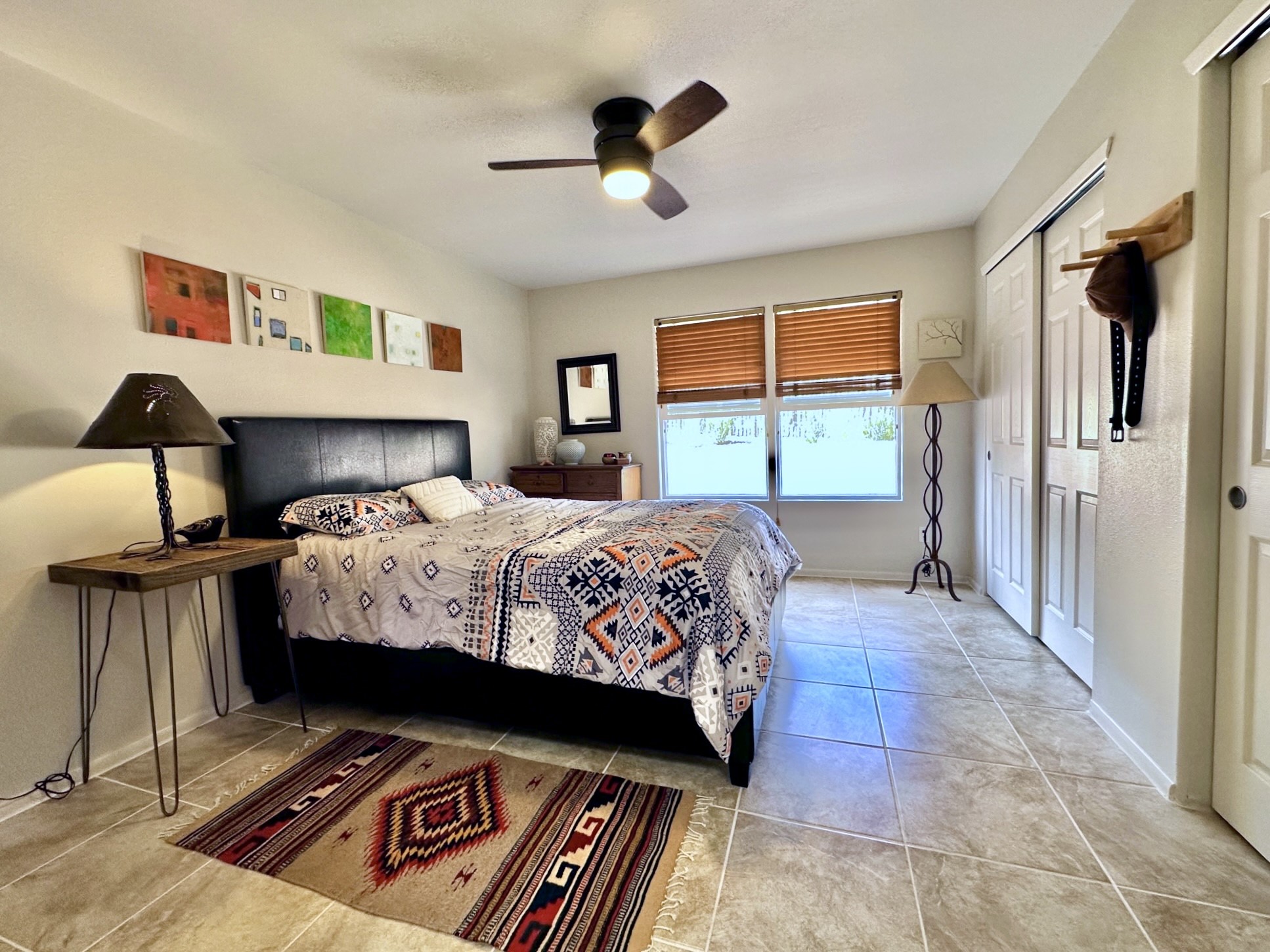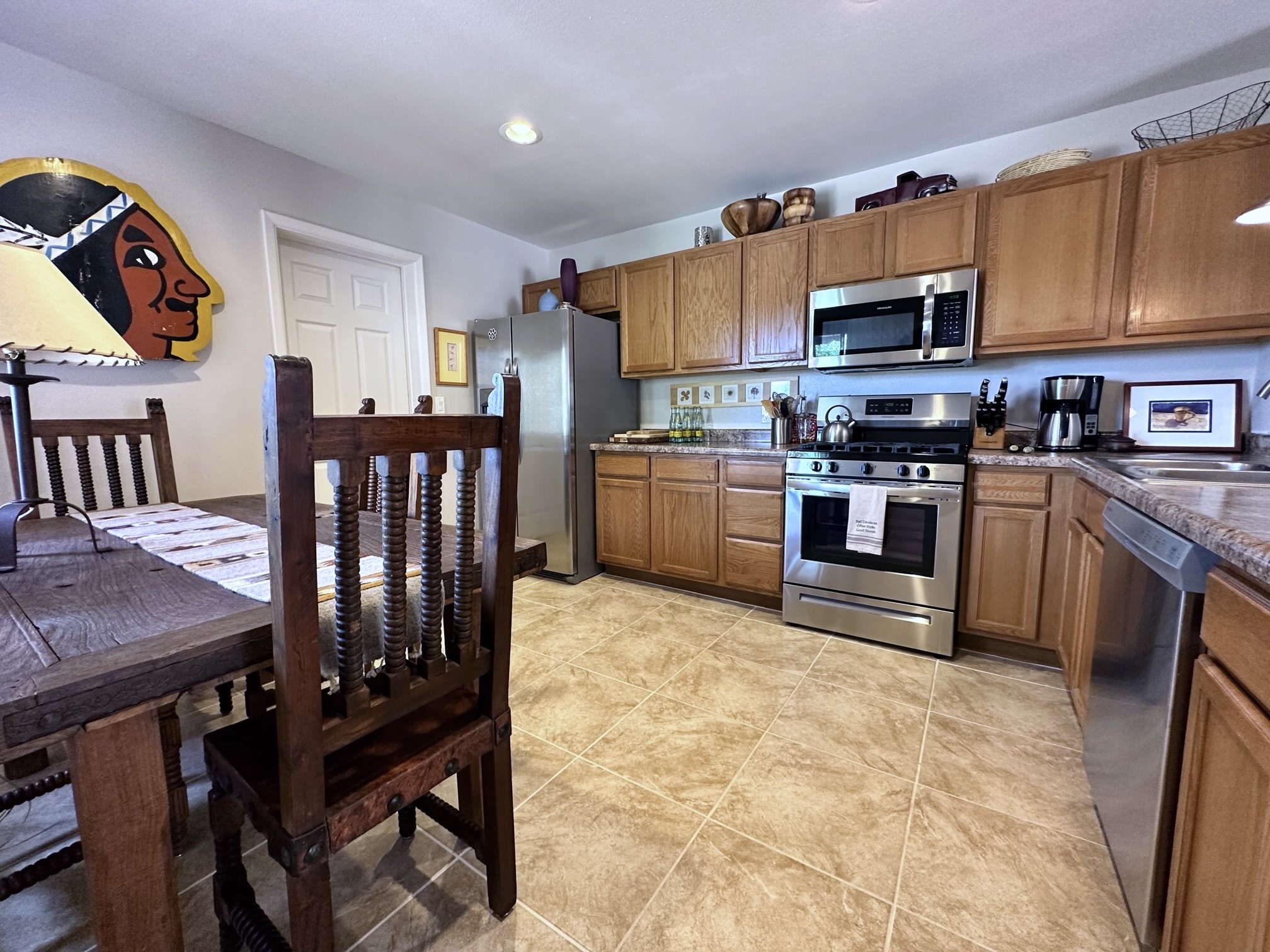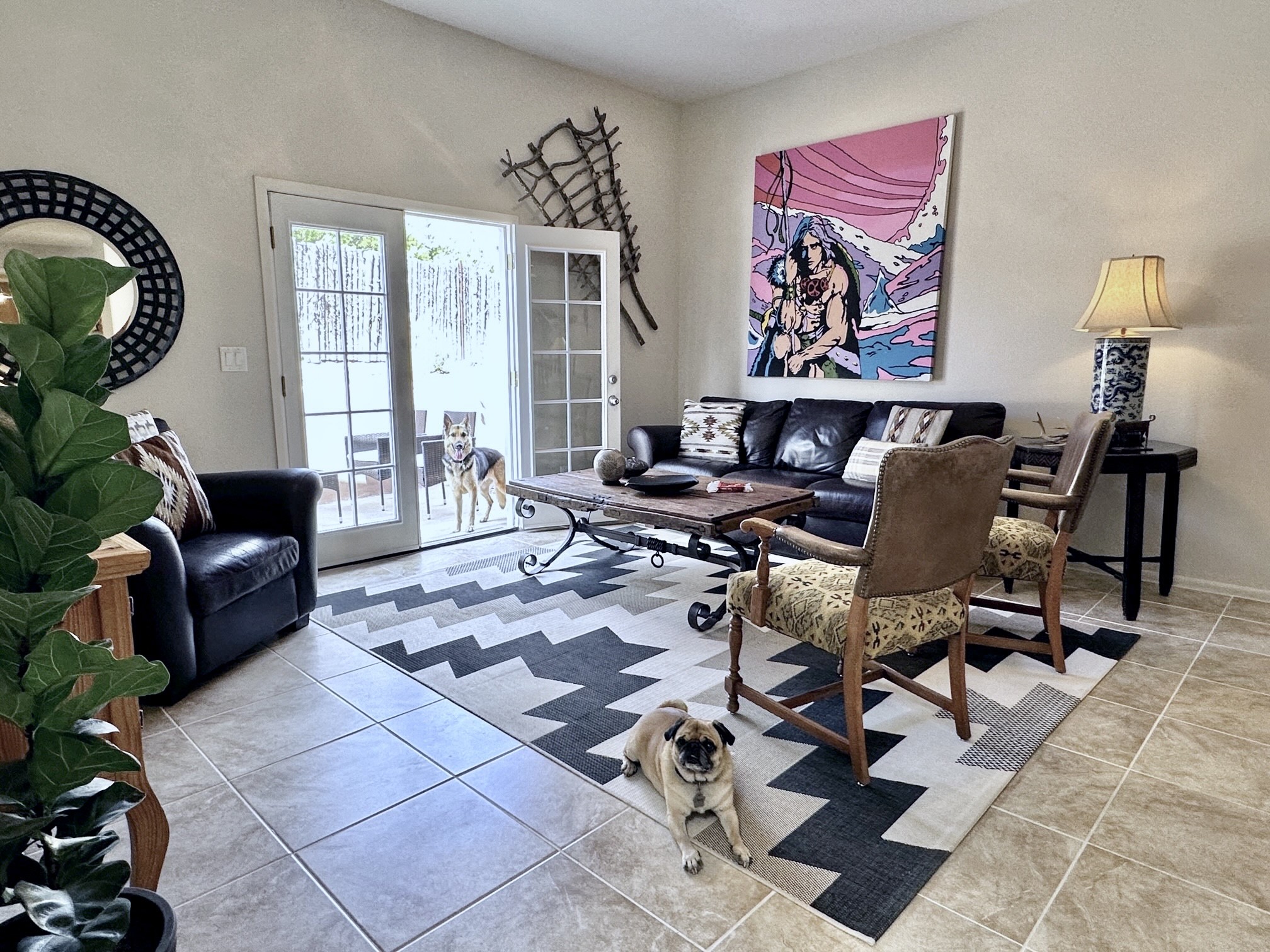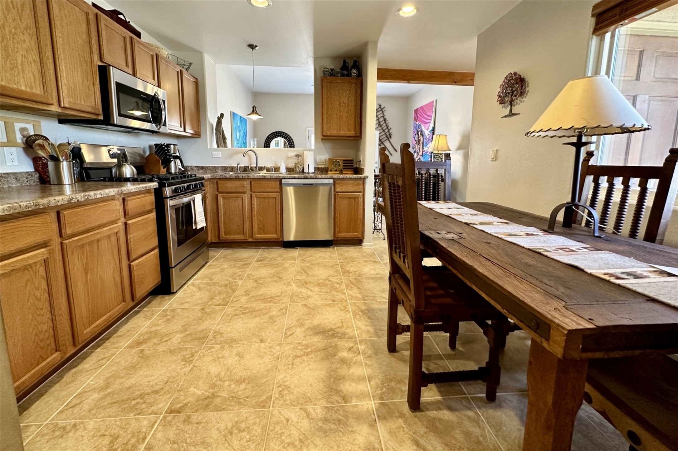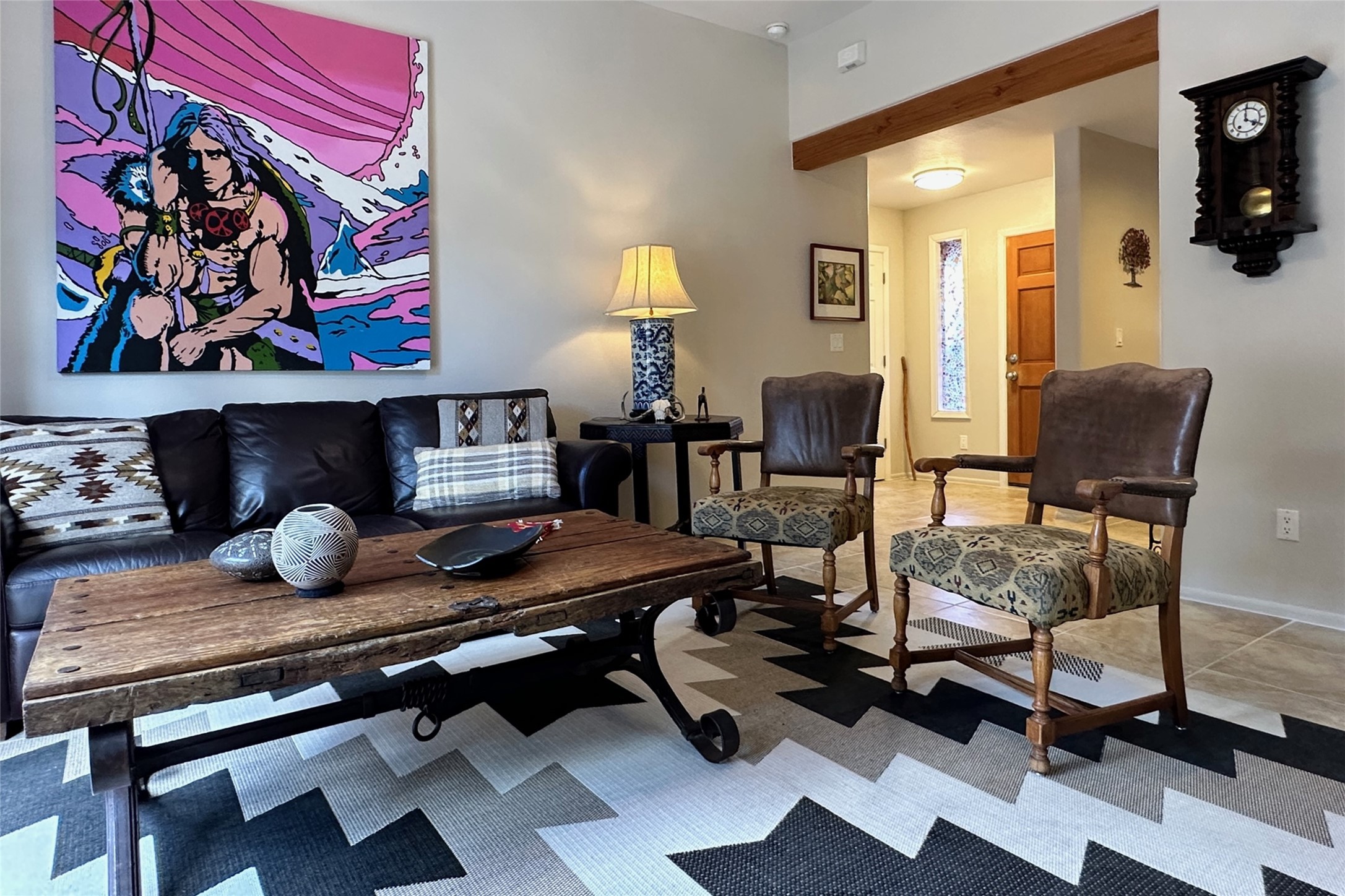 Discover just off 599 in Aldea, this warm and inviting single level home with a large coyote fenced yard and recently updated with tile flooring, new appliances, wall finishes to name just a few. Well separated bedrooms and versatile room use is possible. Set on a quiet street with a large two car garage and with extra parking and easy care landscaping.Aldea de Santa Fe includes over 200 acres of parks with tennis, bocce, pickle, and basketball courts plus walking trails to enjoy during the day and dark skies at night to see all the heavens you missed in town.