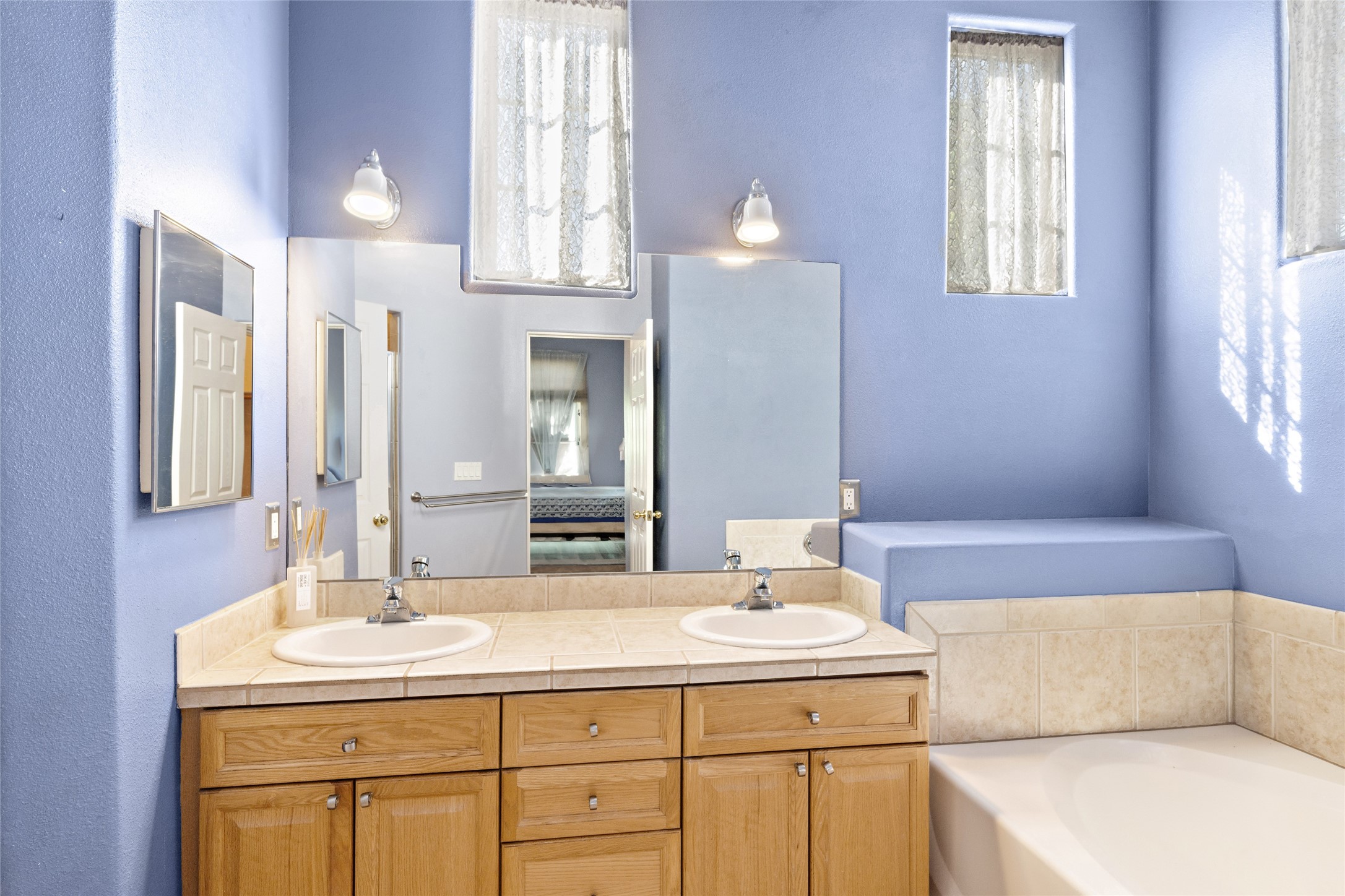 This lovely single level home in the desirable neighborhood of Nava Ade offers convenience, privacy and a fabulous floor plan! Special features abound including high ceilings and beams in the great room, a direct access 2 car garage and a welcoming entry courtyard with a soothing water feature. The primary bedroom suite occupies its own wing and has a 5 fixture bath with his and hers walk-in closets. The free-standing home resides on an oversized lot thanks to its corner location which allows for ample outdoor spaces that feature mature landscaping and privacy from neighbors and the roads. Overlooking the rear patio, the spacious kitchen has a slider for convenient access to rear round dining alfresco. The community of Nava Ade offers an outdoor pool and club house for its members as well as abundant walking trails all for the reasonable HOA fee of $175 / Quarter. With a transferrable roof warranty, heated garage, wood and tile flooring and large windows throughout this home leaves little to be desired - come see for yourself!
