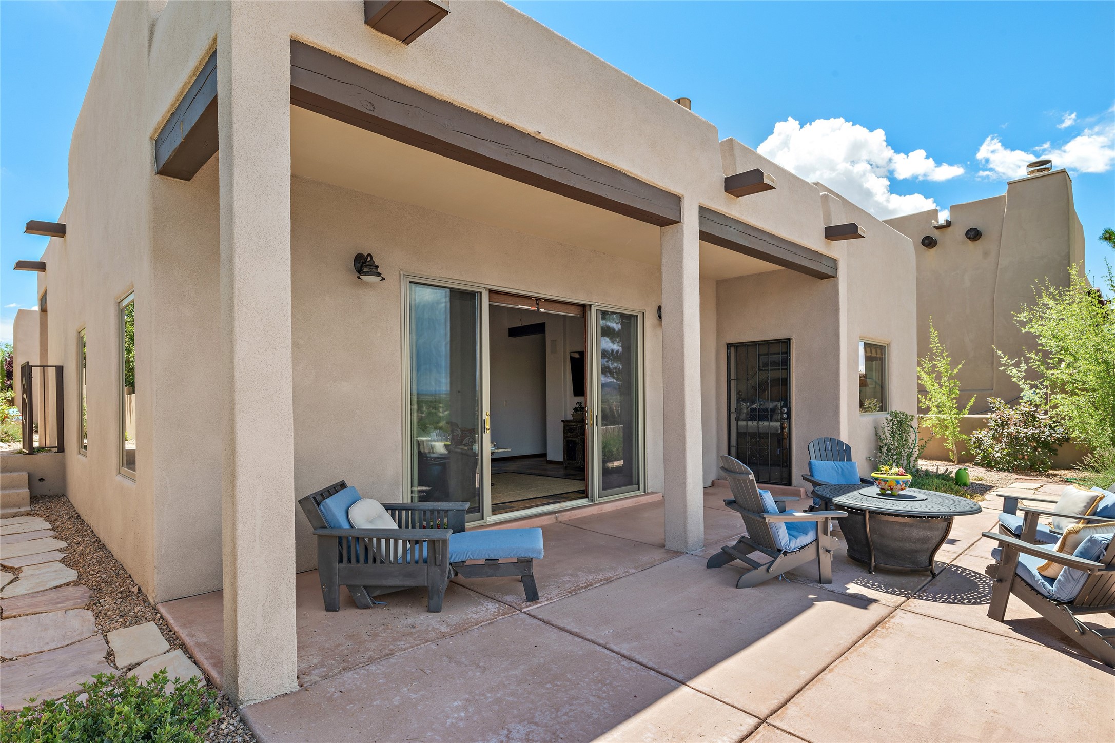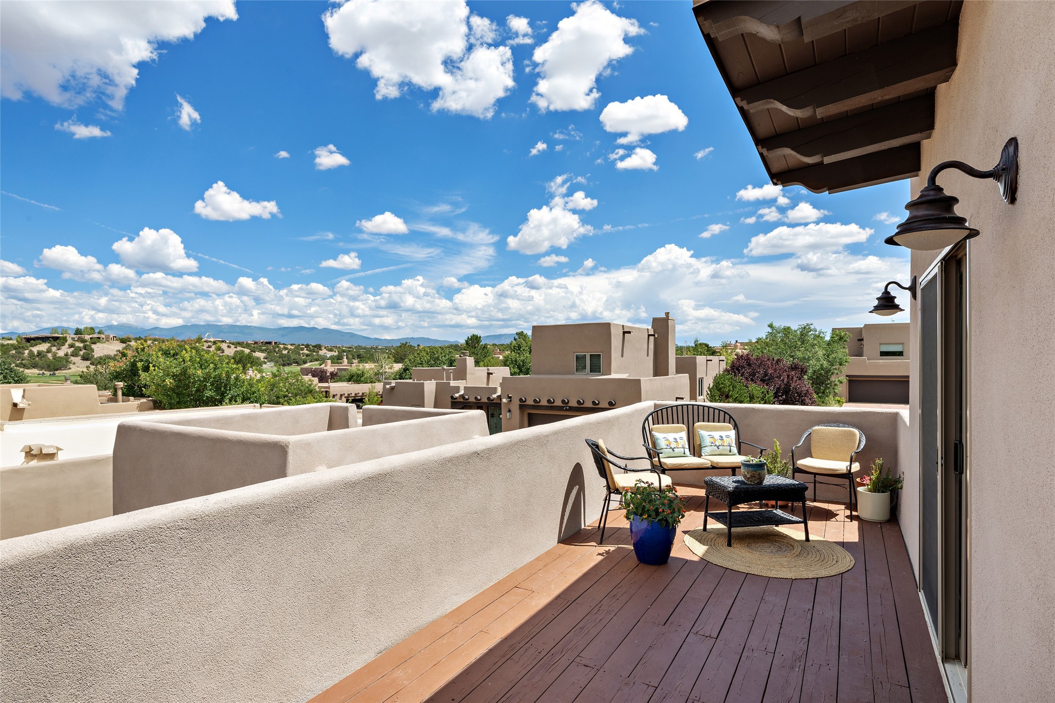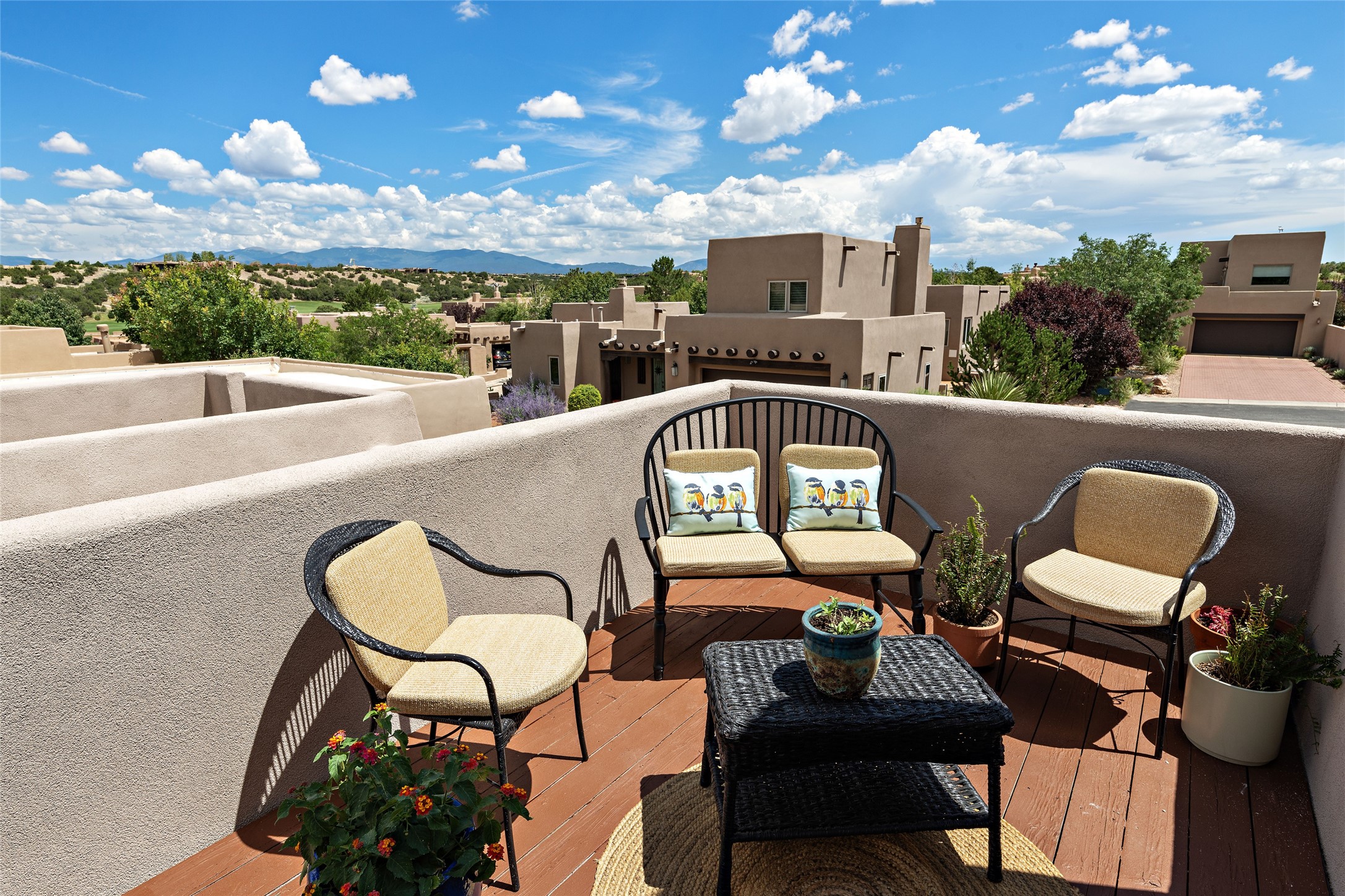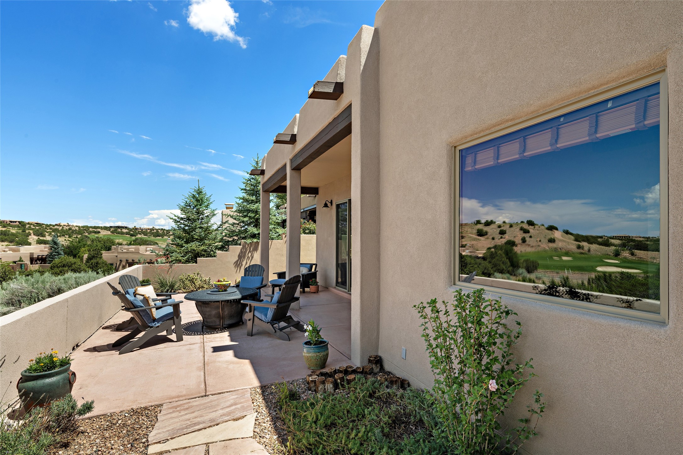 Fabulous Golf Course and Jemez Mountain Views await you from this Traditional Pueblo-style 3 Bedroom, 3 Bath home with an Office Plus private, detached space for Storage or Art & Crafts on a quiet, elevated location in the Los Santeros area of Gated Las Campanas. A Private entry gate leads you to a welcoming courtyard with space for entertaining friends & family. The home has 3 Bedrooms & 3 Baths, with one of them sequestered upstairs for the privacy of your guests. The Great Room is an Open Concept layout w/Golf Course and Jemez views plus a gas log fireplace in the Living area. The Kitchen offers quality Jenn-Air stainless steel appliances plus a large island for entertaining friend & family while you cook as well as a spot to enjoy a casual meal. The Back Portal enjoys the same great Golf Course & Jemez Western views as well as space for dining & entertaining. The Master Bedroom also has Golf Course & Jemez views with an en-suite bath including 2 separate sinks, walk-in closet, separate tub & shower plus compartmented water closet. Bedroom Two / Den / Media is sequestered from the Master and has two spacious closets plus an adjacent full bath. The Third bedroom with en-suite 3/4 bath is located upstairs and has a deck with a fabulous Sangre de Cristo View. The Laundry Room has room for a side-by-side Washer / Dryer set, as well a handy closet. The private, detached Storage Space / Arts & Crafts area is outfitted with lots of shelving for hobbies or additional storage, but is not heated or cooled. The 2-car garage has shelves on both sides for very generous storage. This home is a Great value, with Panoramic Golf Course and Jemez Mountain Views, a private Storage Space / Arts & Crafts area and a quiet, elevated location.