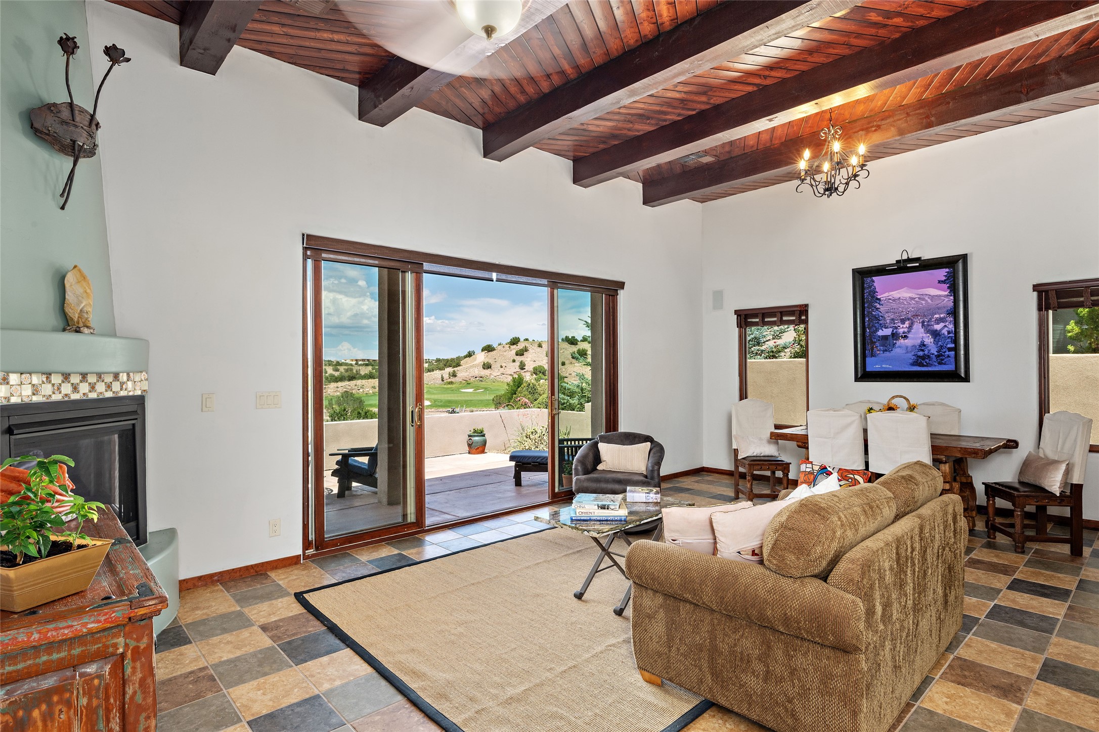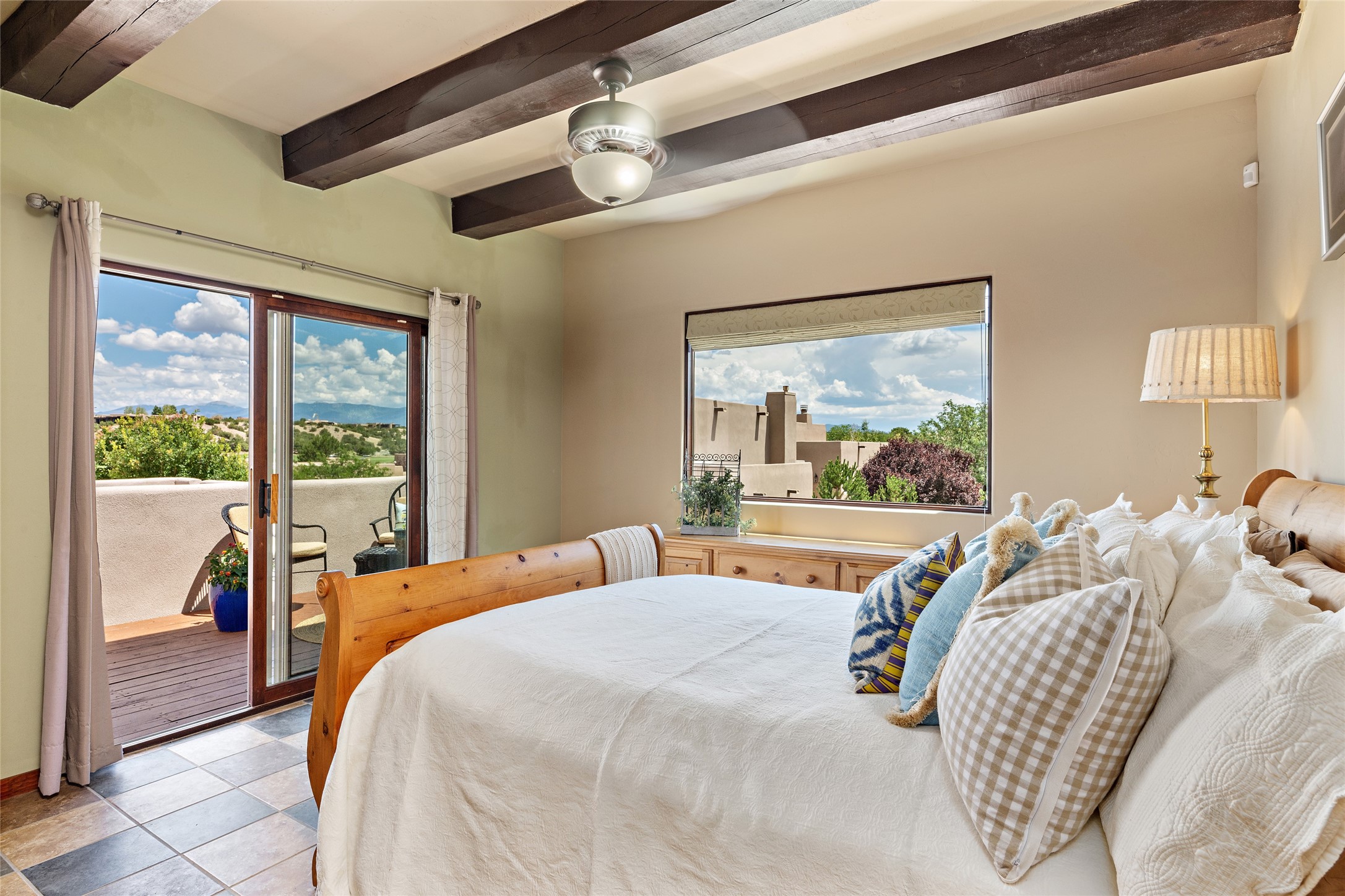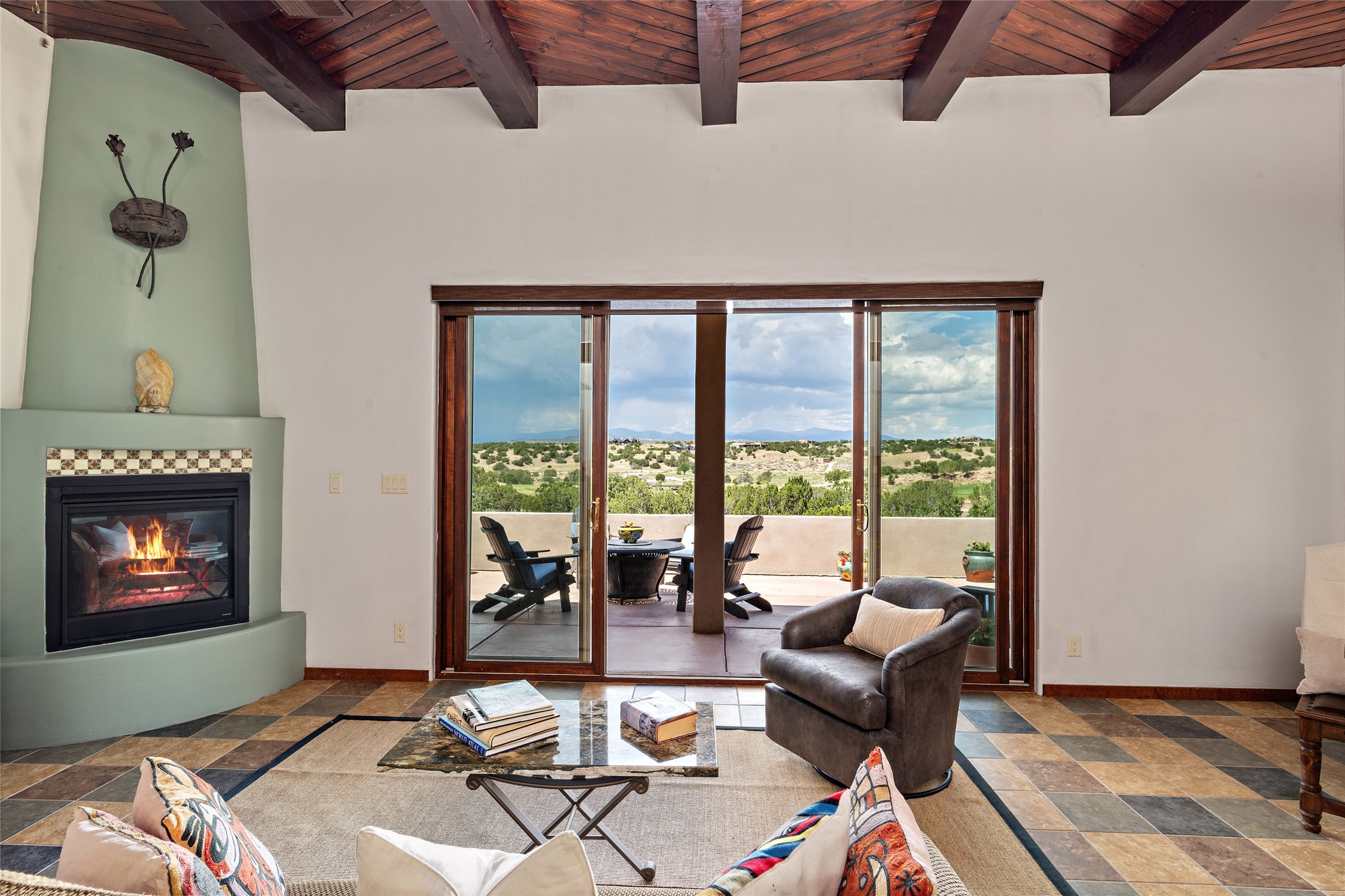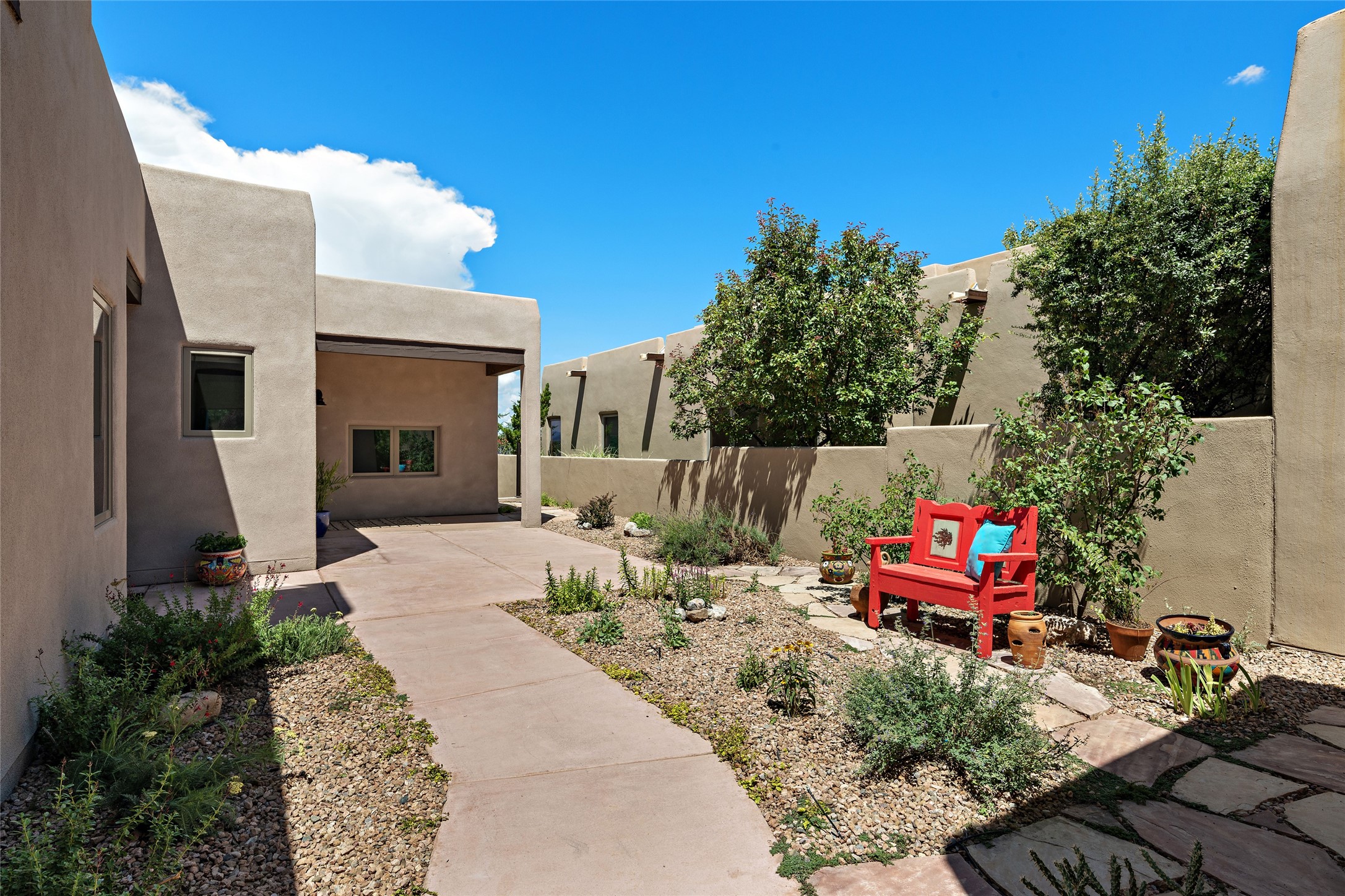 Fabulous Golf Course and Jemez Mountain Views await you from this Traditional Pueblo-style 3 Bedroom, 3 Bath home with an Office Plus private, detached space for Storage or Art & Crafts on a quiet, elevated location in the Los Santeros area of Gated Las Campanas. A Private entry gate leads you to a welcoming courtyard with space for entertaining friends & family. The home has 3 Bedrooms & 3 Baths, with one of them sequestered upstairs for the privacy of your guests. The Great Room is an Open Concept layout w/Golf Course and Jemez views plus a gas log fireplace in the Living area. The Kitchen offers quality Jenn-Air stainless steel appliances plus a large island for entertaining friend & family while you cook as well as a spot to enjoy a casual meal. The Back Portal enjoys the same great Golf Course & Jemez Western views as well as space for dining & entertaining. The Master Bedroom also has Golf Course & Jemez views with an en-suite bath including 2 separate sinks, walk-in closet, separate tub & shower plus compartmented water closet. Bedroom Two / Den / Media is sequestered from the Master and has two spacious closets plus an adjacent full bath. The Third bedroom with en-suite 3/4 bath is located upstairs and has a deck with a fabulous Sangre de Cristo View. The Laundry Room has room for a side-by-side Washer / Dryer set, as well a handy closet. The private, detached Storage Space / Arts & Crafts area is outfitted with lots of shelving for hobbies or additional storage, but is not heated or cooled. The 2-car garage has shelves on both sides for very generous storage. This home is a Great value, with Panoramic Golf Course and Jemez Mountain Views, a private Storage Space / Arts & Crafts area and a quiet, elevated location.