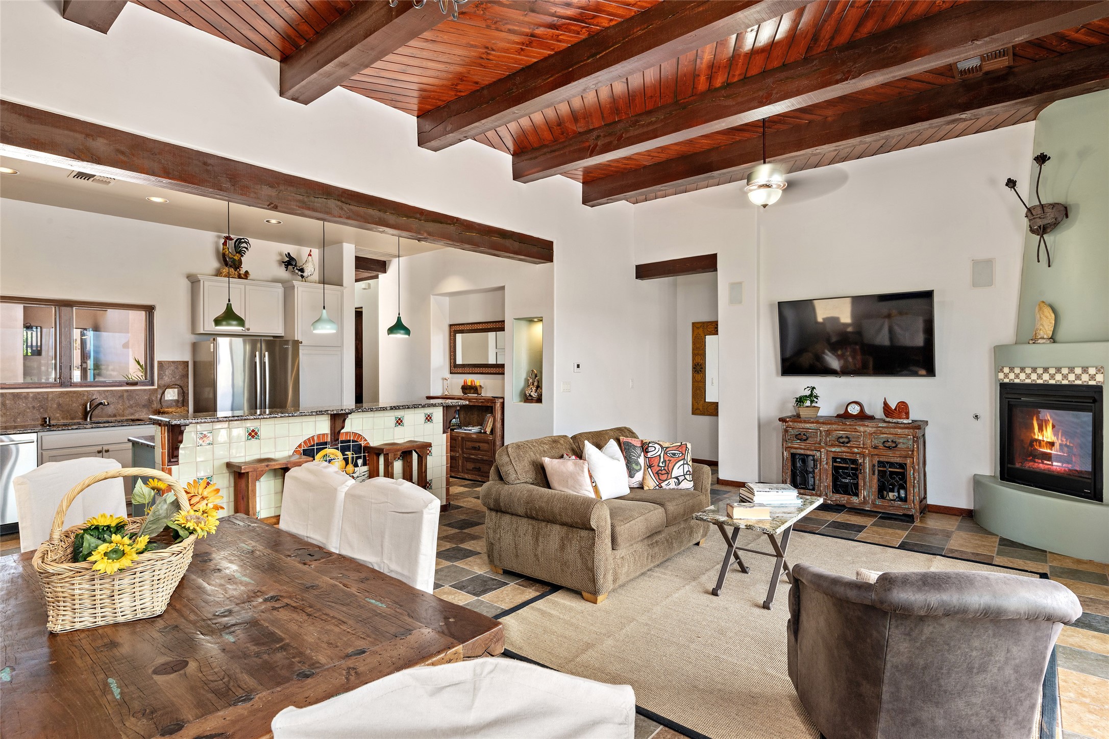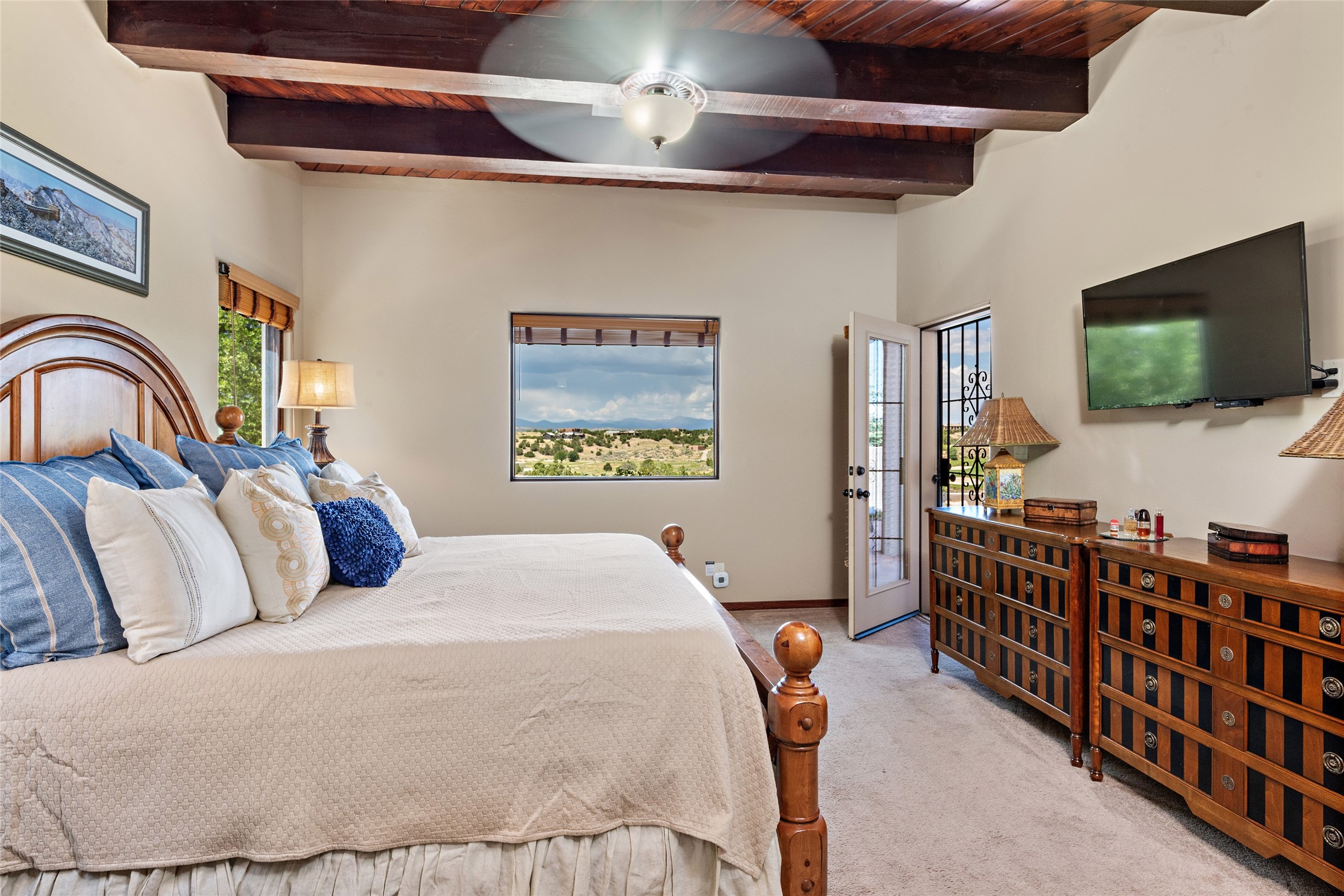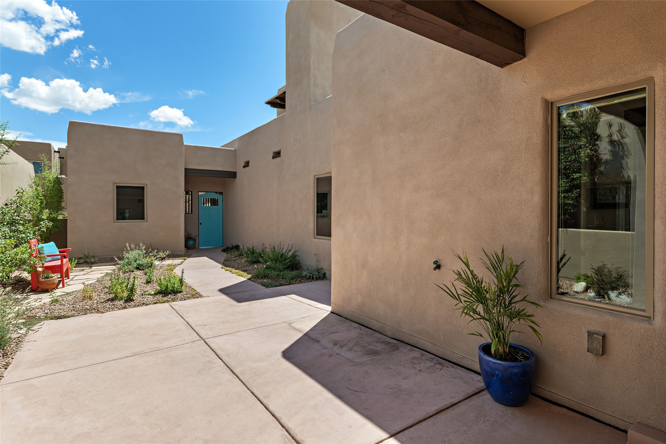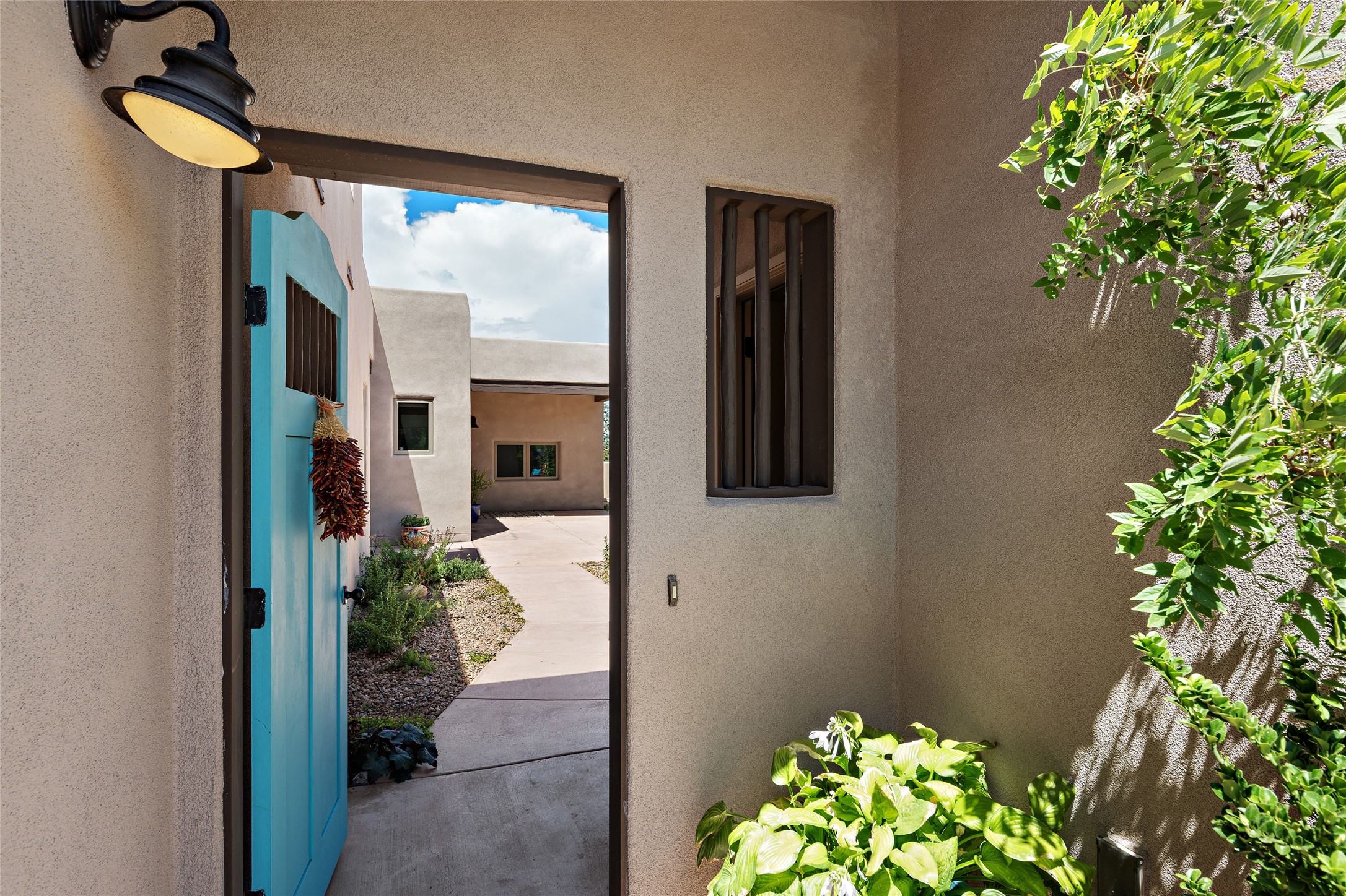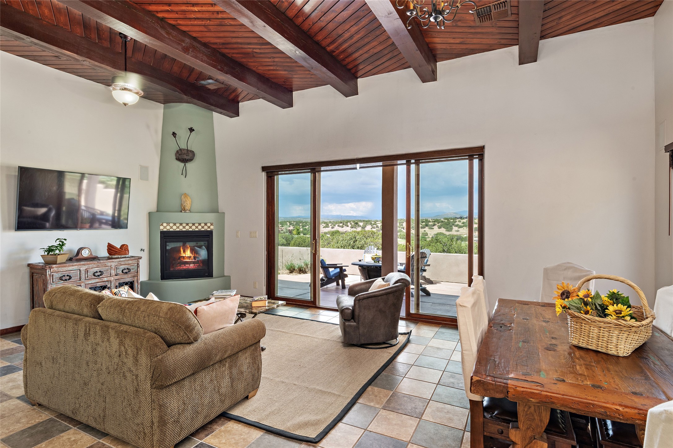 Fabulous Golf Course and Jemez Mountain Views await you from this Traditional Pueblo-style 3 Bedroom, 3 Bath home with an Office Plus private, detached space for Storage or Art & Crafts on a quiet, elevated location in the Los Santeros area of Gated Las Campanas. A Private entry gate leads you to a welcoming courtyard with space for entertaining friends & family. The home has 3 Bedrooms & 3 Baths, with one of them sequestered upstairs for the privacy of your guests. The Great Room is an Open Concept layout w/Golf Course and Jemez views plus a gas log fireplace in the Living area. The Kitchen offers quality Jenn-Air stainless steel appliances plus a large island for entertaining friend & family while you cook as well as a spot to enjoy a casual meal. The Back Portal enjoys the same great Golf Course & Jemez Western views as well as space for dining & entertaining. The Master Bedroom also has Golf Course & Jemez views with an en-suite bath including 2 separate sinks, walk-in closet, separate tub & shower plus compartmented water closet. Bedroom Two / Den / Media is sequestered from the Master and has two spacious closets plus an adjacent full bath. The Third bedroom with en-suite 3/4 bath is located upstairs and has a deck with a fabulous Sangre de Cristo View. The Laundry Room has room for a side-by-side Washer / Dryer set, as well a handy closet. The private, detached Storage Space / Arts & Crafts area is outfitted with lots of shelving for hobbies or additional storage, but is not heated or cooled. The 2-car garage has shelves on both sides for very generous storage. This home is a Great value, with Panoramic Golf Course and Jemez Mountain Views, a private Storage Space / Arts & Crafts area and a quiet, elevated location.