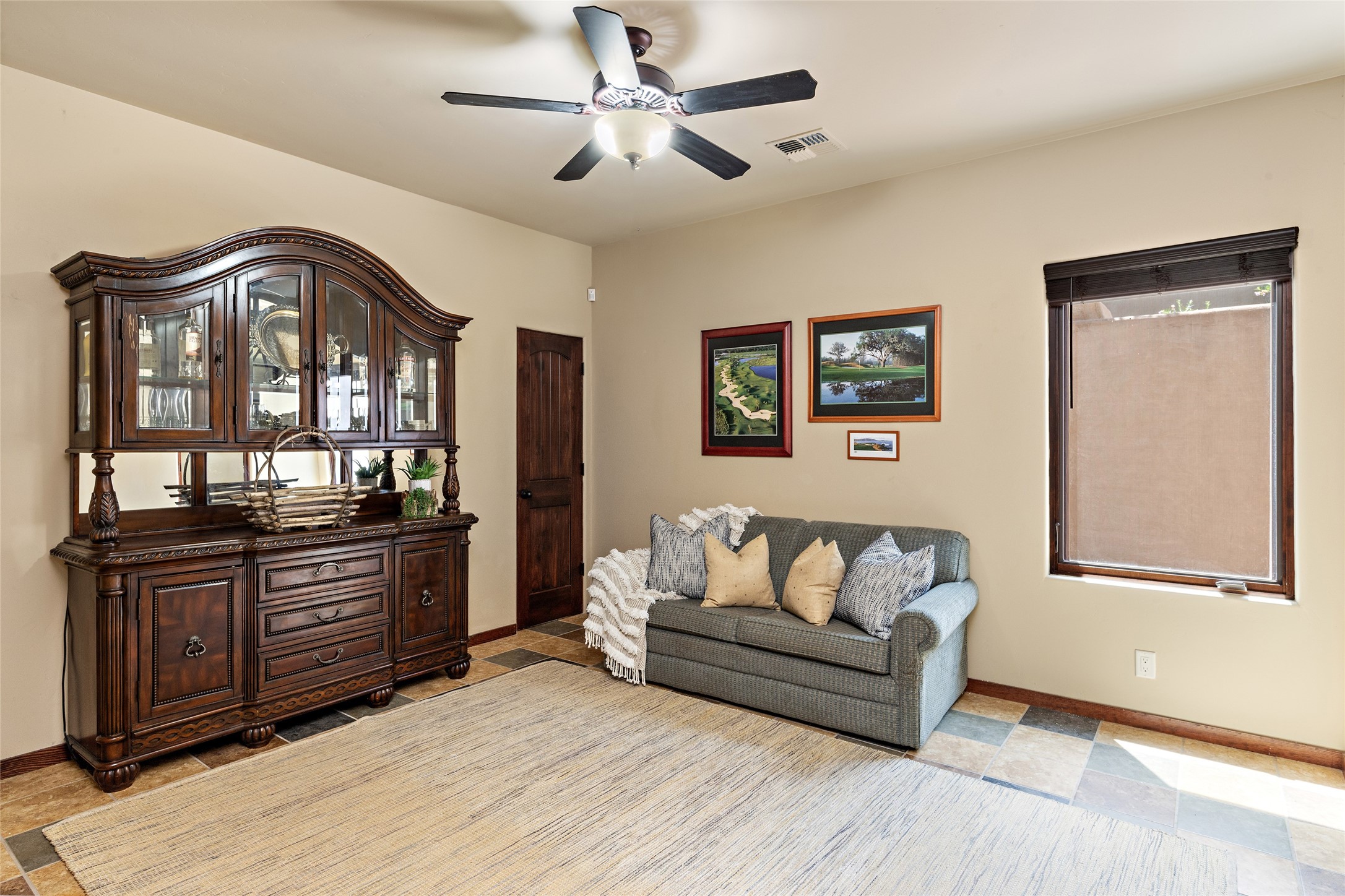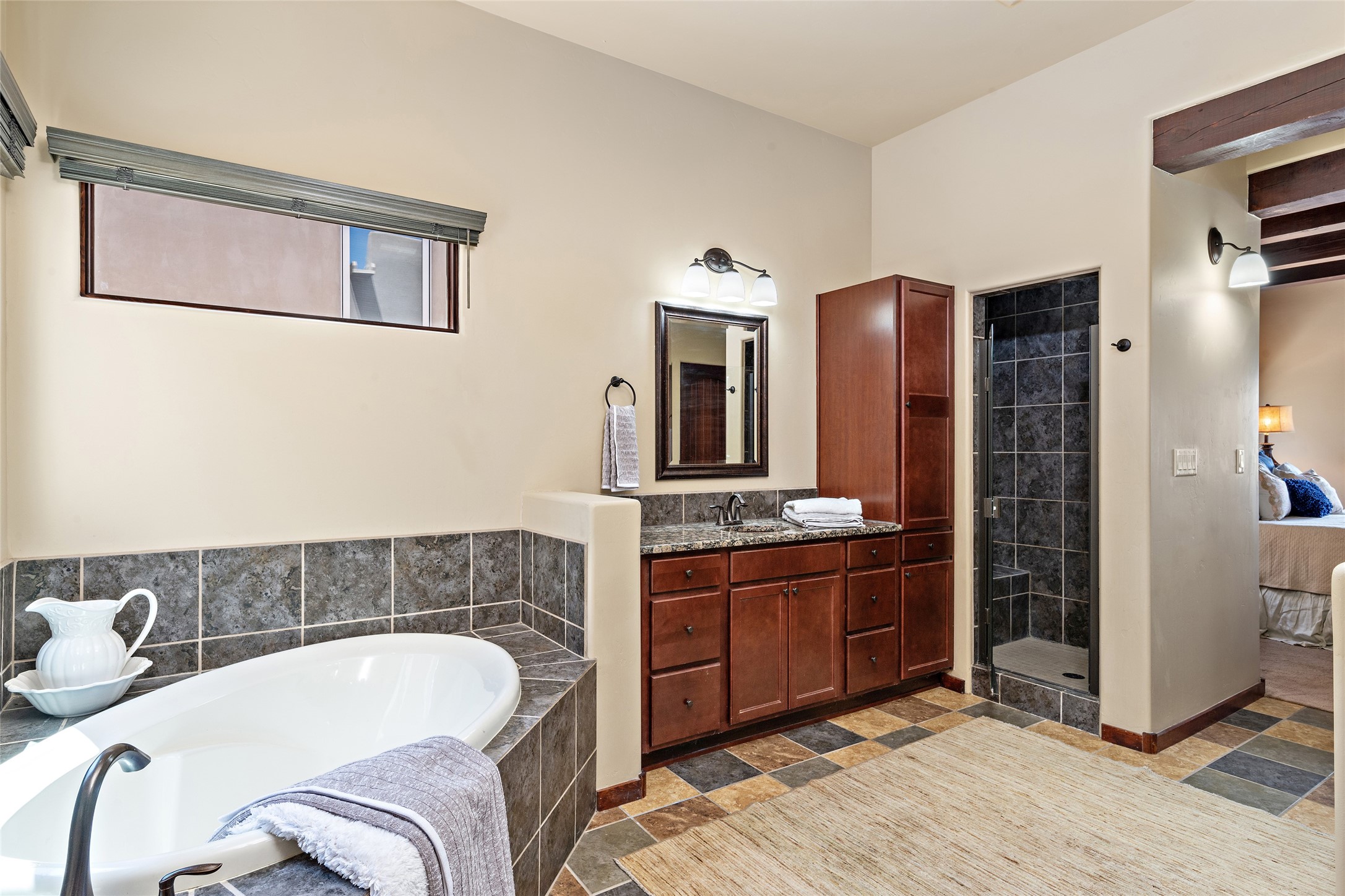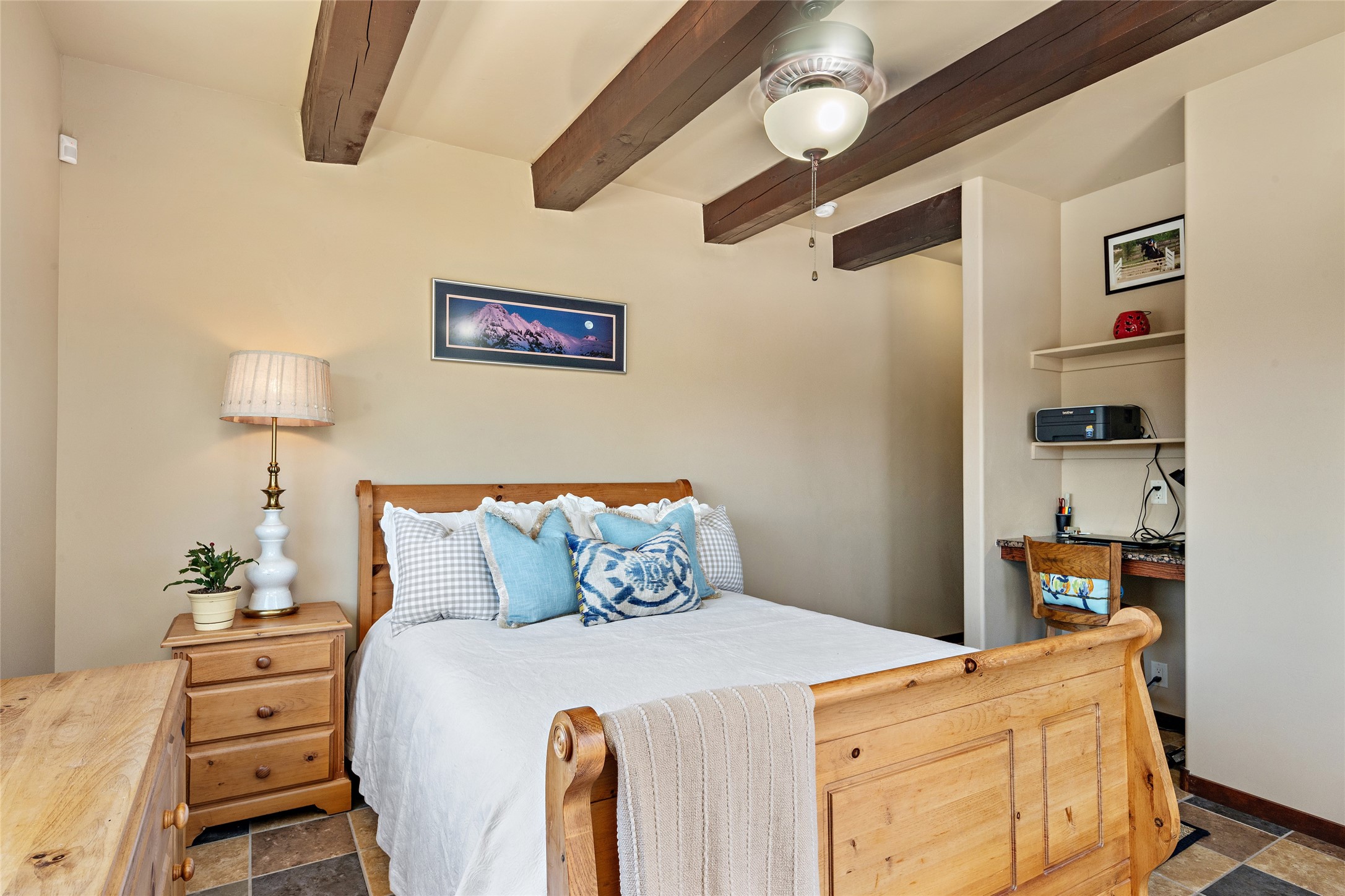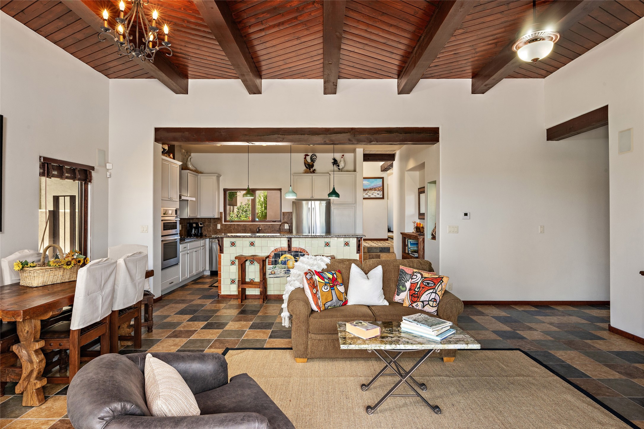 Fabulous Golf Course and Jemez Mountain Views await you from this Traditional Pueblo-style 3 Bedroom, 3 Bath home with an Office Plus private, detached space for Storage or Art & Crafts on a quiet, elevated location in the Los Santeros area of Gated Las Campanas. A Private entry gate leads you to a welcoming courtyard with space for entertaining friends & family. The home has 3 Bedrooms & 3 Baths, with one of them sequestered upstairs for the privacy of your guests. The Great Room is an Open Concept layout w/Golf Course and Jemez views plus a gas log fireplace in the Living area. The Kitchen offers quality Jenn-Air stainless steel appliances plus a large island for entertaining friend & family while you cook as well as a spot to enjoy a casual meal. The Back Portal enjoys the same great Golf Course & Jemez Western views as well as space for dining & entertaining. The Master Bedroom also has Golf Course & Jemez views with an en-suite bath including 2 separate sinks, walk-in closet, separate tub & shower plus compartmented water closet. Bedroom Two / Den / Media is sequestered from the Master and has two spacious closets plus an adjacent full bath. The Third bedroom with en-suite 3/4 bath is located upstairs and has a deck with a fabulous Sangre de Cristo View. The Laundry Room has room for a side-by-side Washer / Dryer set, as well a handy closet. The private, detached Storage Space / Arts & Crafts area is outfitted with lots of shelving for hobbies or additional storage, but is not heated or cooled. The 2-car garage has shelves on both sides for very generous storage. This home is a Great value, with Panoramic Golf Course and Jemez Mountain Views, a private Storage Space / Arts & Crafts area and a quiet, elevated location.