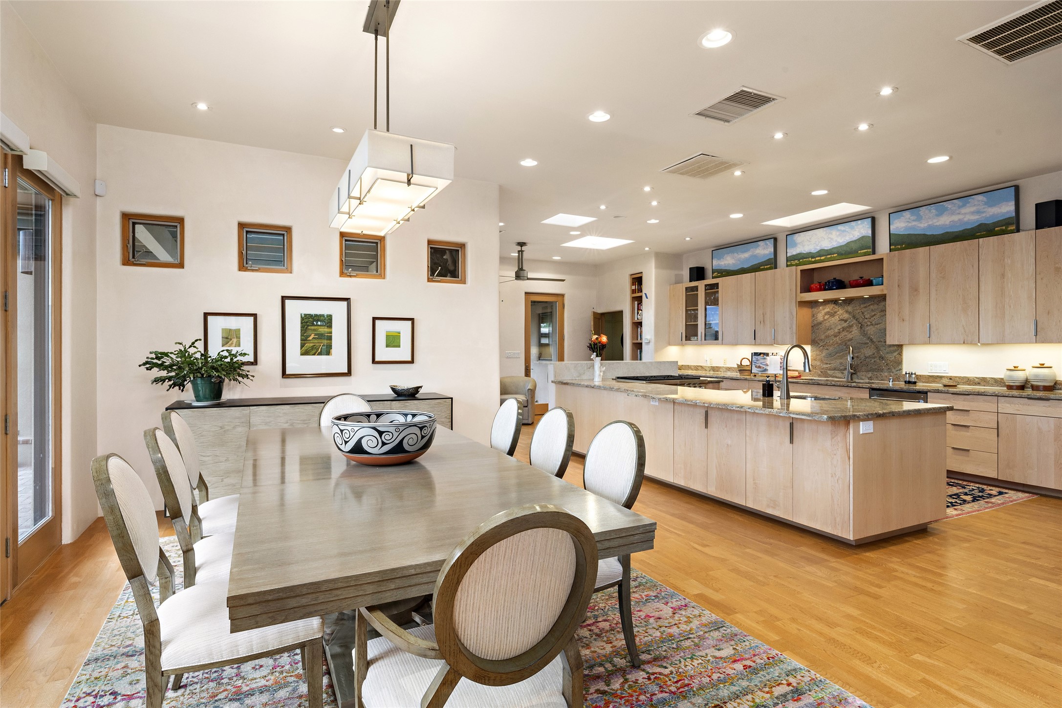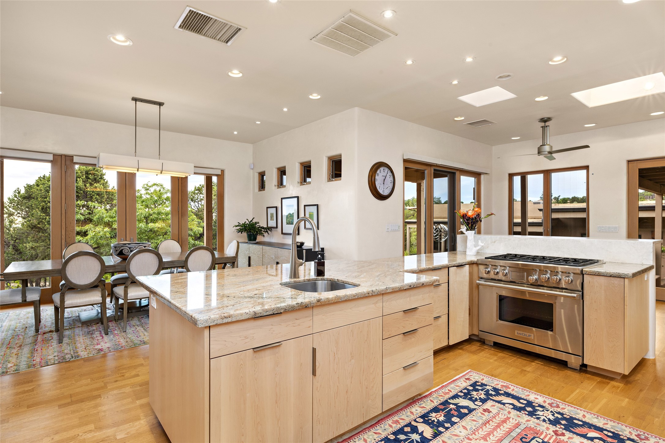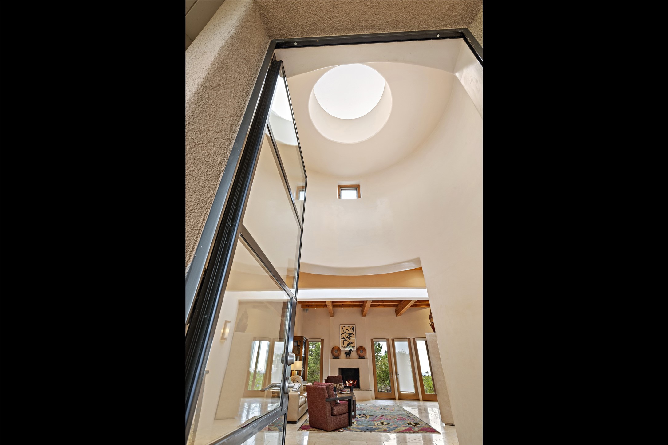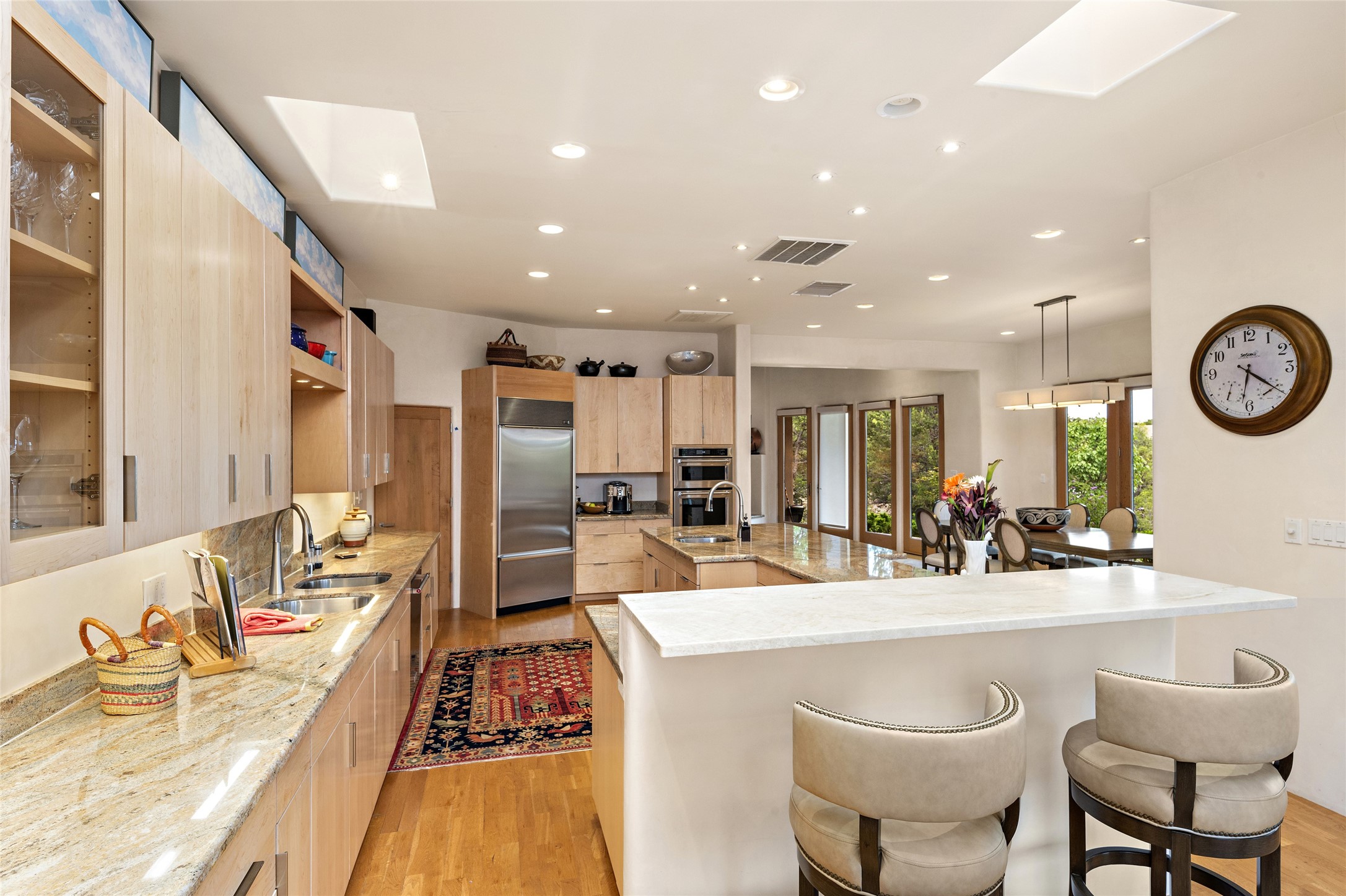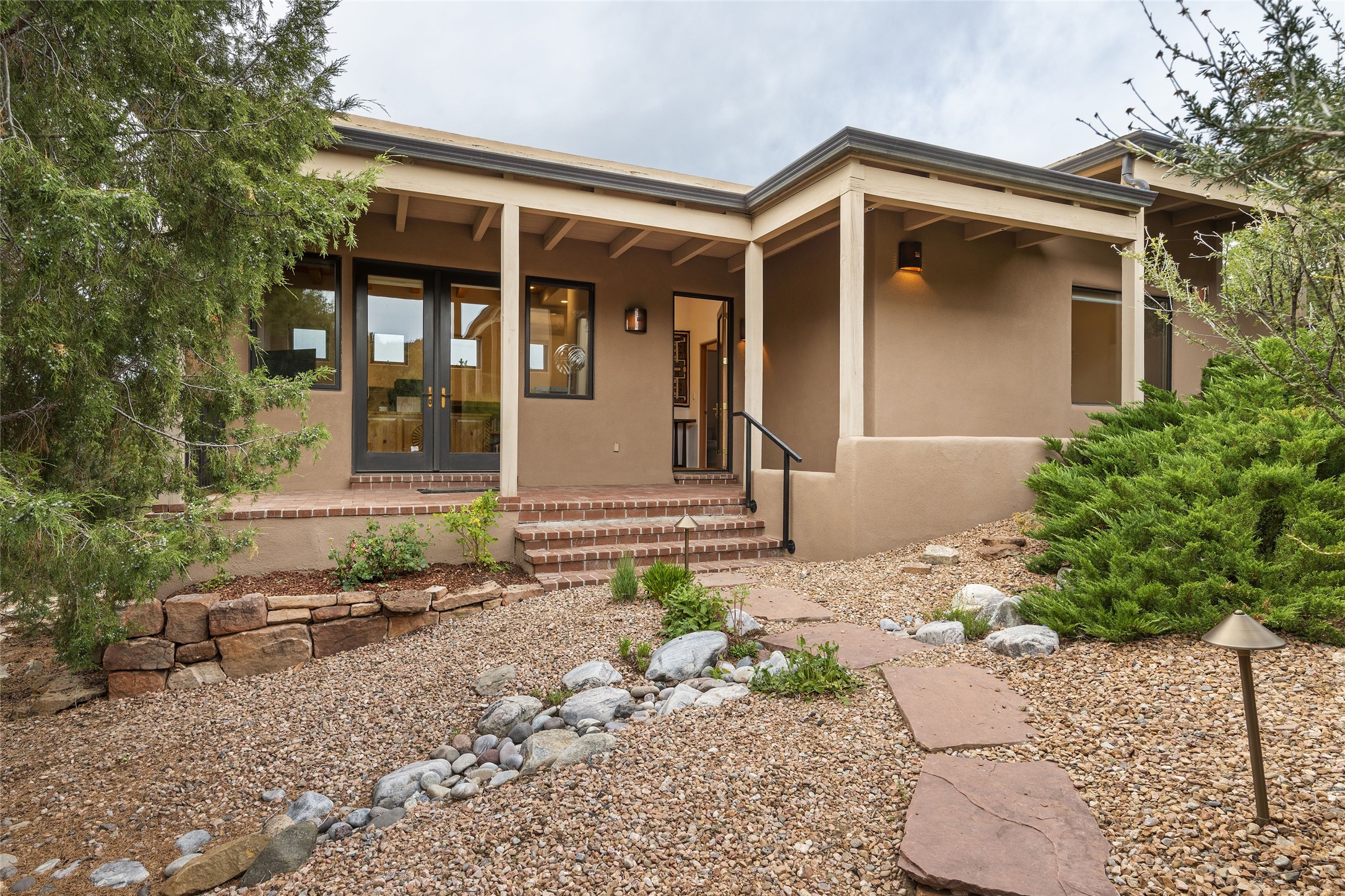 Views, Privacy & Elegance await you at this Single-Level Soft Contemporary home, with 5 Bedrooms, 4 Baths plus a spacious Guest House which has 2 of the Bedrooms & 1 Bath on 2-plus acres in a private, gated community in Sierra del Norte. The Living Room includes a wood-burning fireplace, tall ceilings and flows into the spacious Dining area with room for eight. The Gourmet Kitchen includes Wolf, SubZero & KitchenAid stainless appliances plus an abundance of counter space for meal preparation as well as dining & socializing with friends & family. The Master Bedroom Suite includes a wood-burning fireplace, enormous walk-in closet, access to a private outdoor area plus an equally spacious Bath with double sinks, oversized shower, jetted tub & compartmented water closet. Bedroom Two, adjacent to the Master, can be a Den, Office, TV or Work-Out Room. Bedroom Three has an en-suite bath. The Guest House has a Bed & Bath plus an Office area pre-plumbed for a Kitchenette. The Guest House also has a huge Basement for a wine cave, work-out area or overflow storage. The Back Portal, accessed from the Living, Dining & Kitchen areas, includes a wood-burning fireplace and transitions easily to the landscaped back yard area with a 3-season Greenhouse. This home is in a private, gated community in the foothills that offers sunset and night light views, easy walking access to the Dale Ball Trail System as well as in-town convenience without the noise & traffic.
