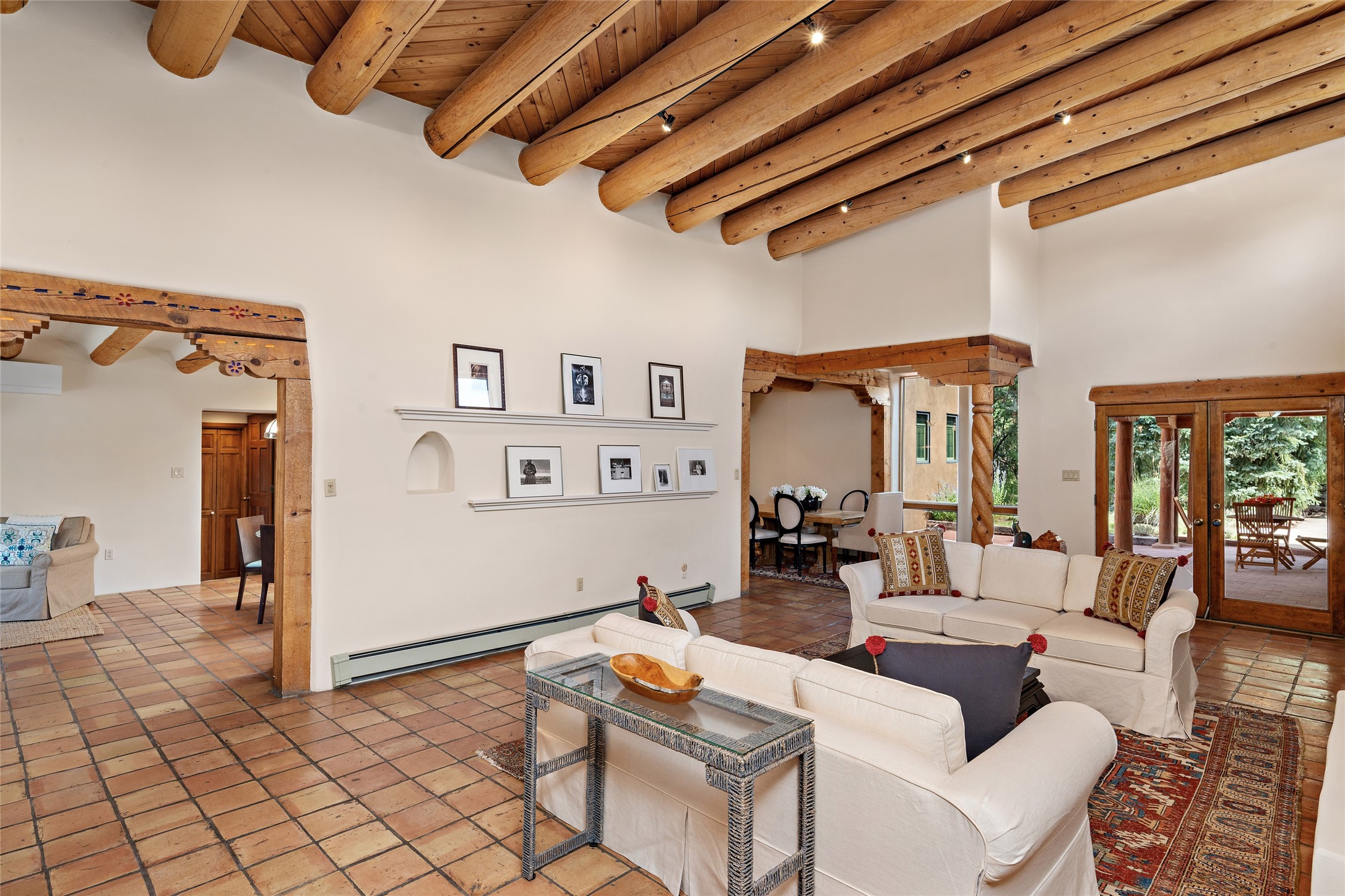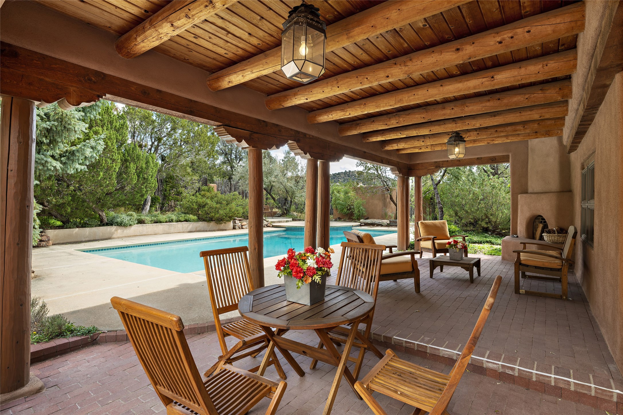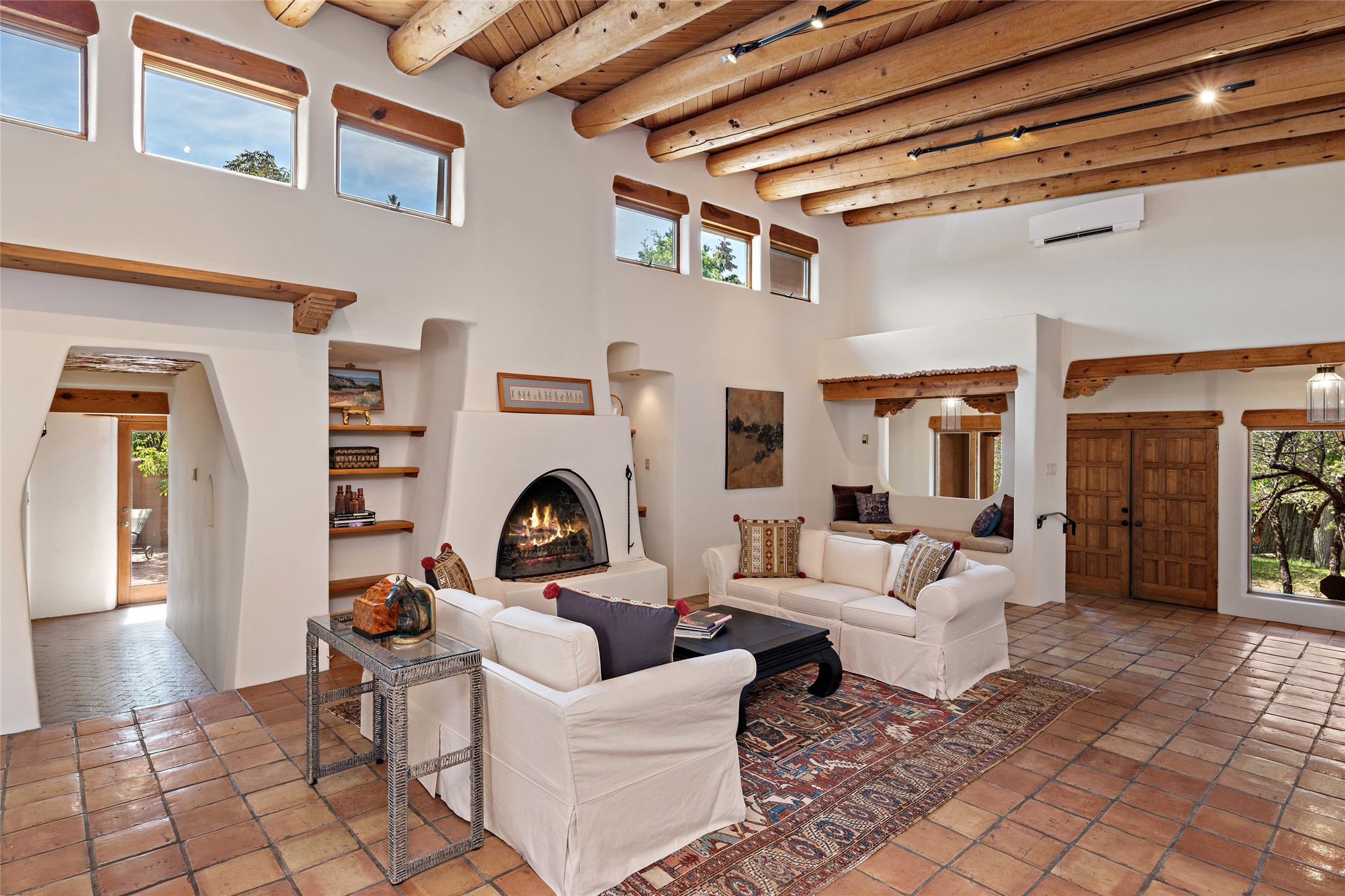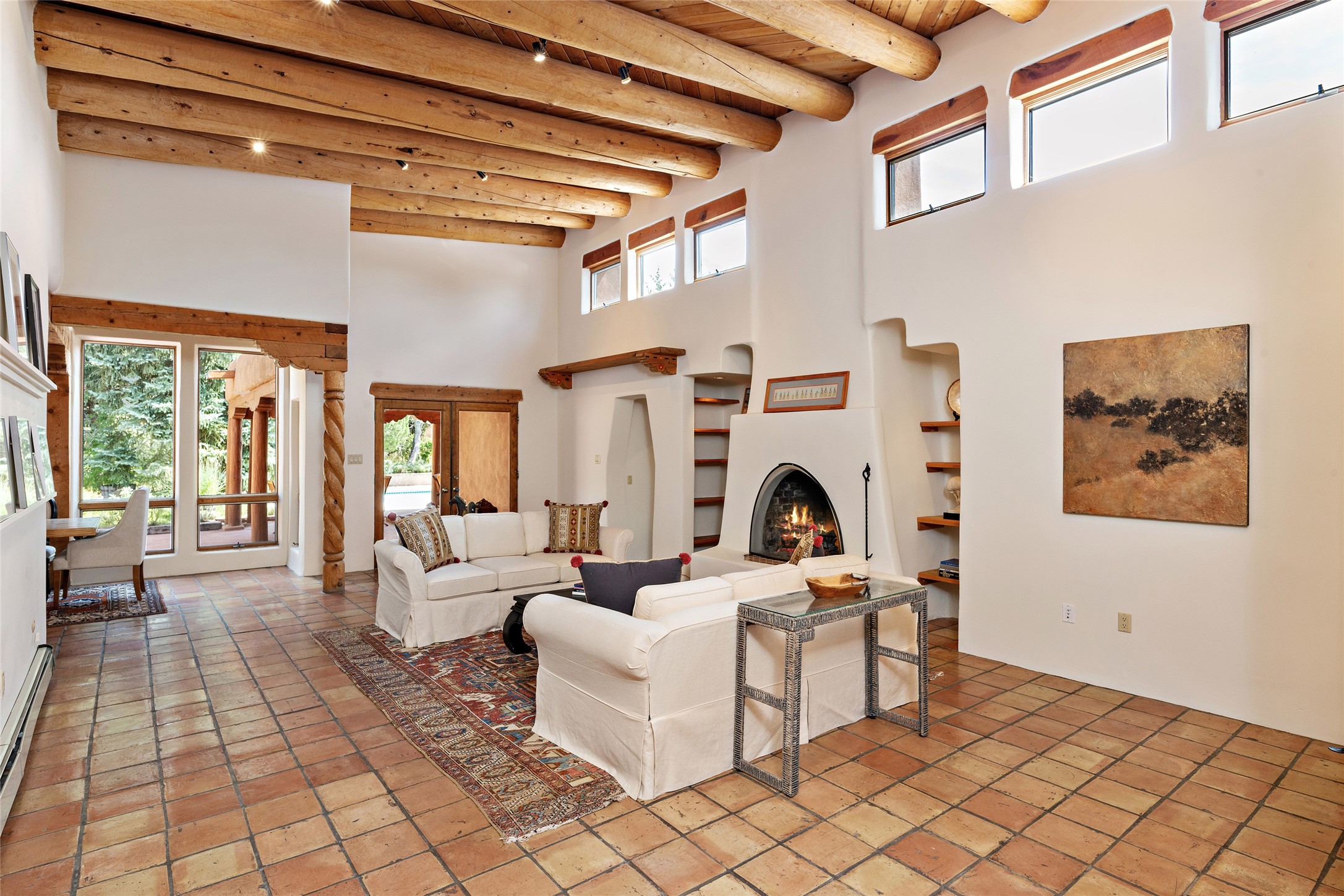 Embraced by lush, coyote-fenced grounds, this exquisite classic pueblo residence with casita and FOUR-CAR garaging, is an exceptional sanctuary. Abundant architectural details include vigas, beams, lintels and corbels with bullet carving & hand-painted accents, and rows of clerestory windows. The superb open concept design features a dramatic living room with soaring ceiling, track lighting, a fireplace flanked by deep, lighted alcoves with shelving, and French doors to the fabulous entertaining portal, pool area and mature trees & plantings. A generous dining area accesses the custom-designed chef's kitchen with breakfast & sitting/TV areas. An impressive private owner's suite bedroom boasts a high beamed ceiling, track lighting and kiva fireplace. The beautifully redesigned owner's bath and a private study have diamond plaster and in-floor radiant heat. A separate two-bedroom guest wing features a spacious high-walled courtyard with a gate to the pool & rear grounds. The delightful guest casita includes a high-ceilinged living room with fireplace, dining/office area, a bedroom and full bath. The 5 Daikon ductless mini-splits and a mini-split in the casita ensure year-round comfort. Situated just up the street from the storied Sol y Sombra estate, (owned by Georgia O'Keeffe; more recently by the late Paul Allen, co-founder of Microsoft), and within the Wood Gormley school district.