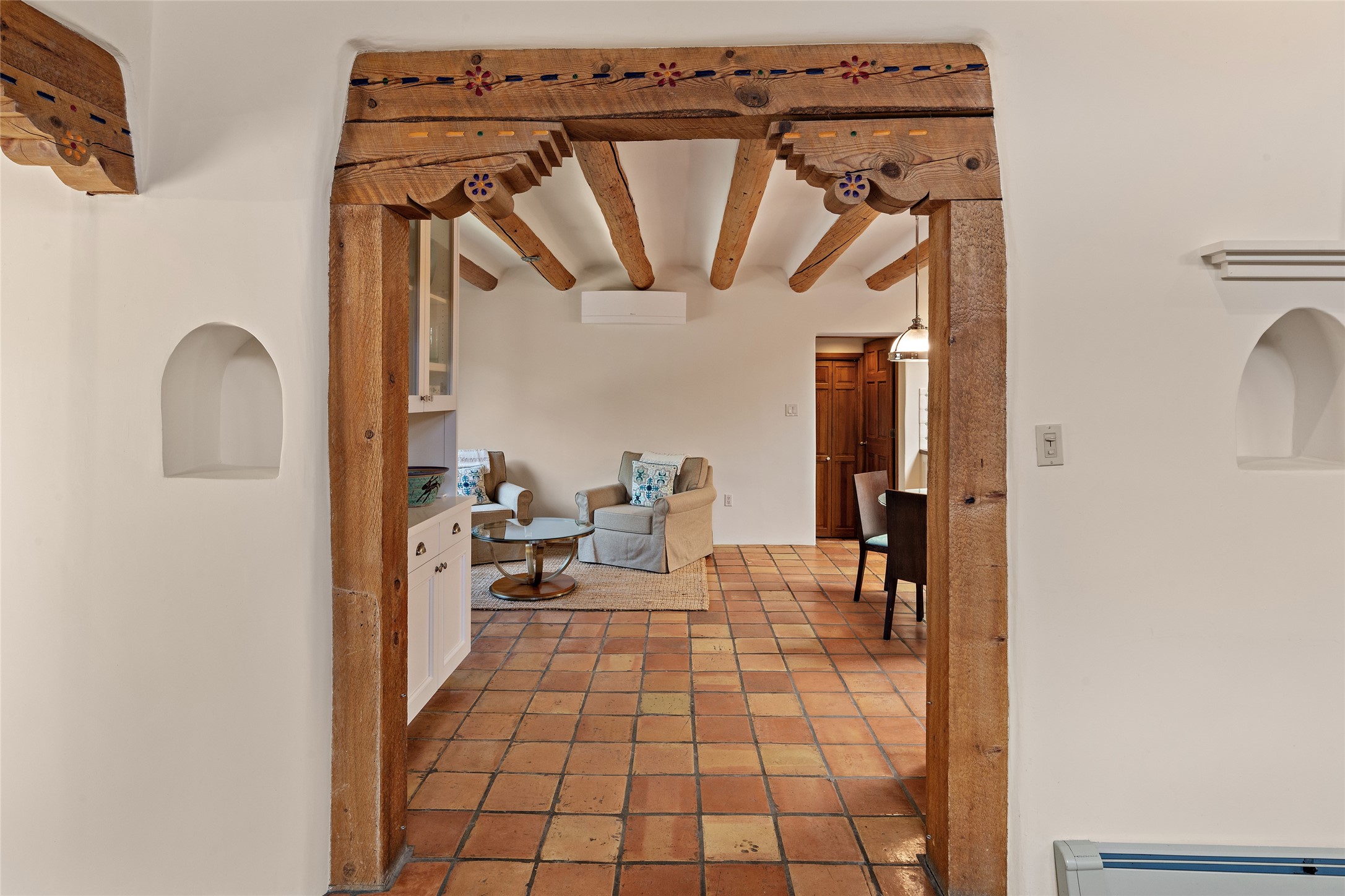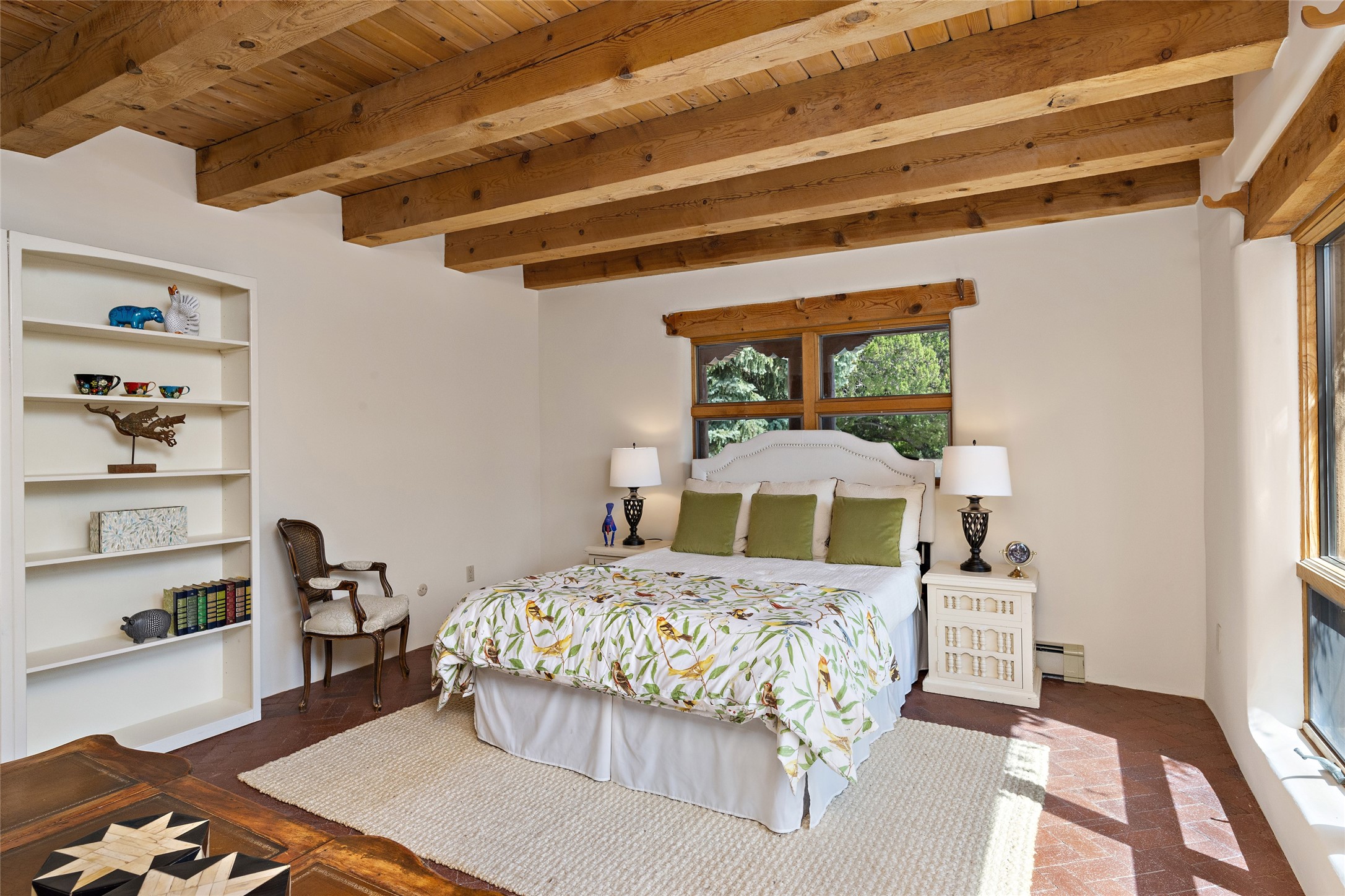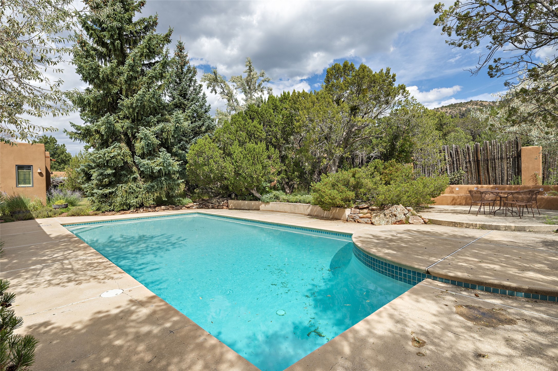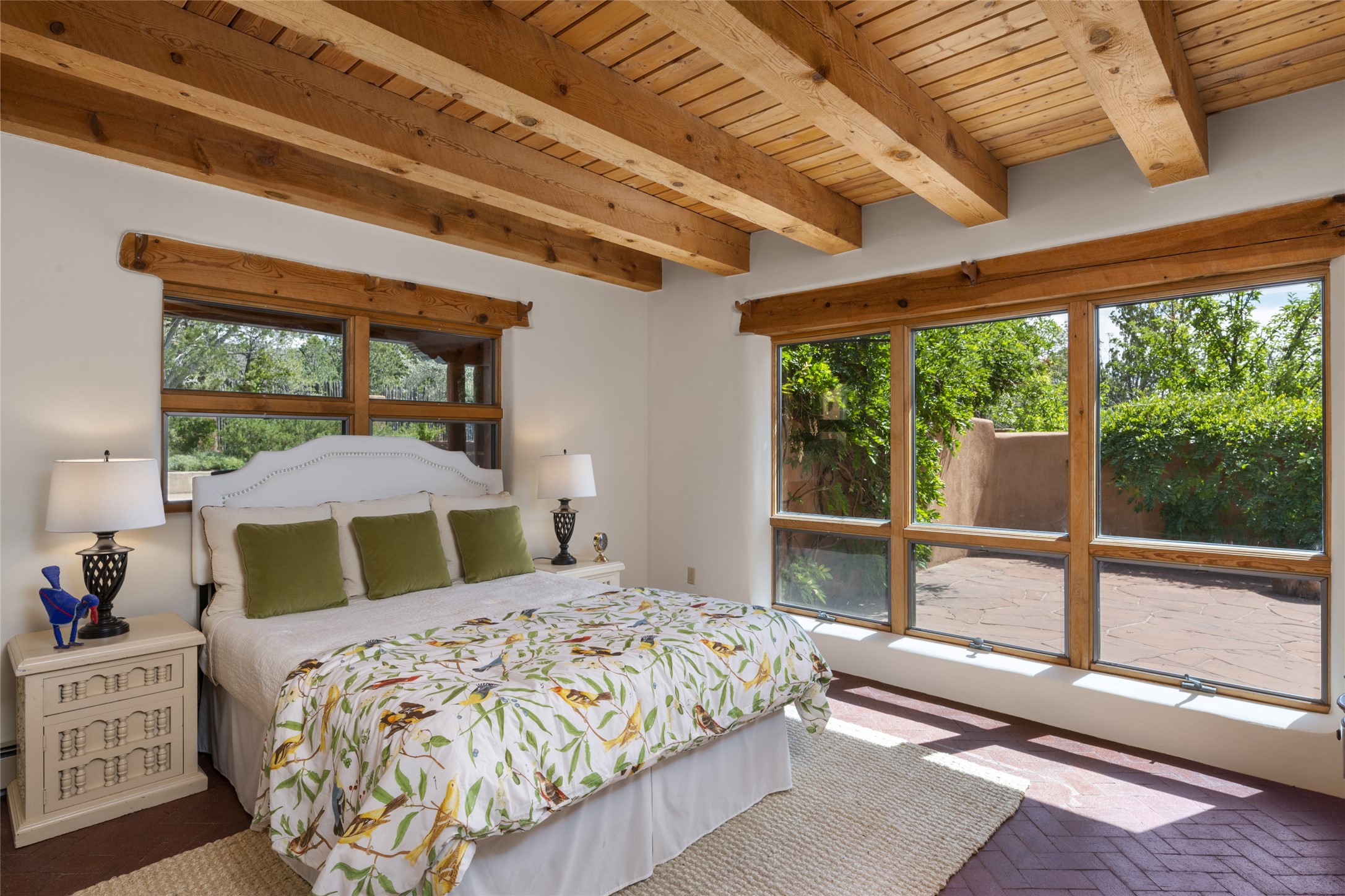 Embraced by lush, coyote-fenced grounds, this exquisite classic pueblo residence with casita and FOUR-CAR garaging, is an exceptional sanctuary. Abundant architectural details include vigas, beams, lintels and corbels with bullet carving & hand-painted accents, and rows of clerestory windows. The superb open concept design features a dramatic living room with soaring ceiling, track lighting, a fireplace flanked by deep, lighted alcoves with shelving, and French doors to the fabulous entertaining portal, pool area and mature trees & plantings. A generous dining area accesses the custom-designed chef's kitchen with breakfast & sitting/TV areas. An impressive private owner's suite bedroom boasts a high beamed ceiling, track lighting and kiva fireplace. The beautifully redesigned owner's bath and a private study have diamond plaster and in-floor radiant heat. A separate two-bedroom guest wing features a spacious high-walled courtyard with a gate to the pool & rear grounds. The delightful guest casita includes a high-ceilinged living room with fireplace, dining/office area, a bedroom and full bath. The 5 Daikon ductless mini-splits and a mini-split in the casita ensure year-round comfort. Situated just up the street from the storied Sol y Sombra estate, (owned by Georgia O'Keeffe; more recently by the late Paul Allen, co-founder of Microsoft), and within the Wood Gormley school district.