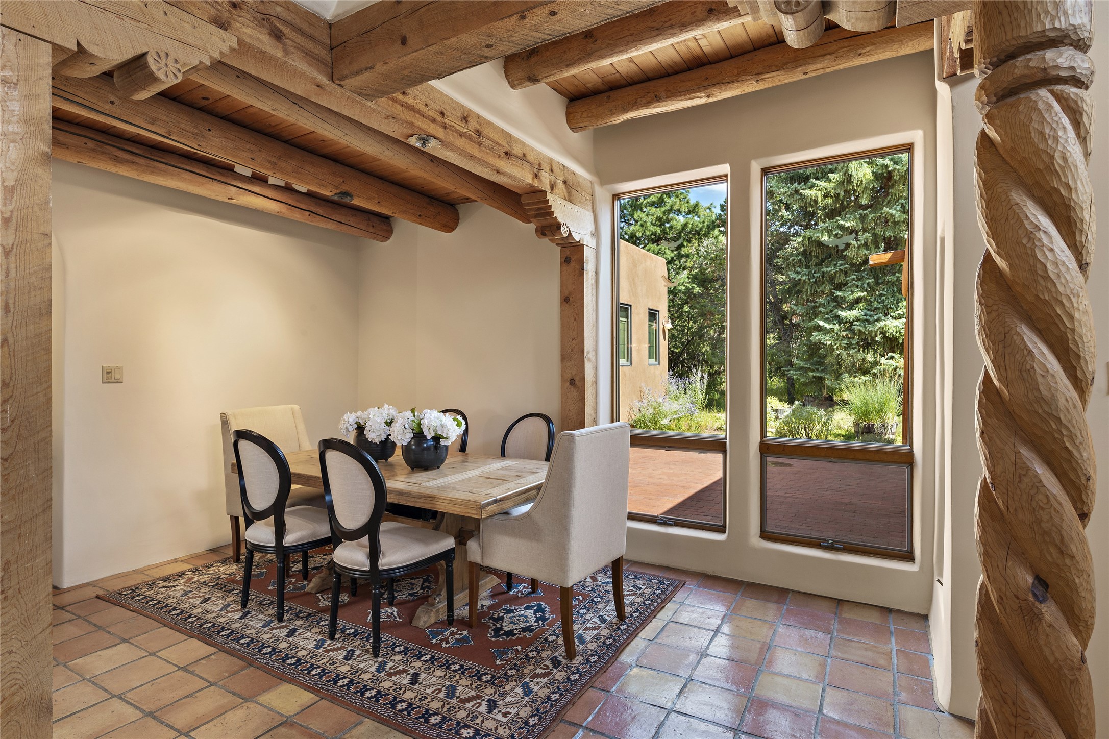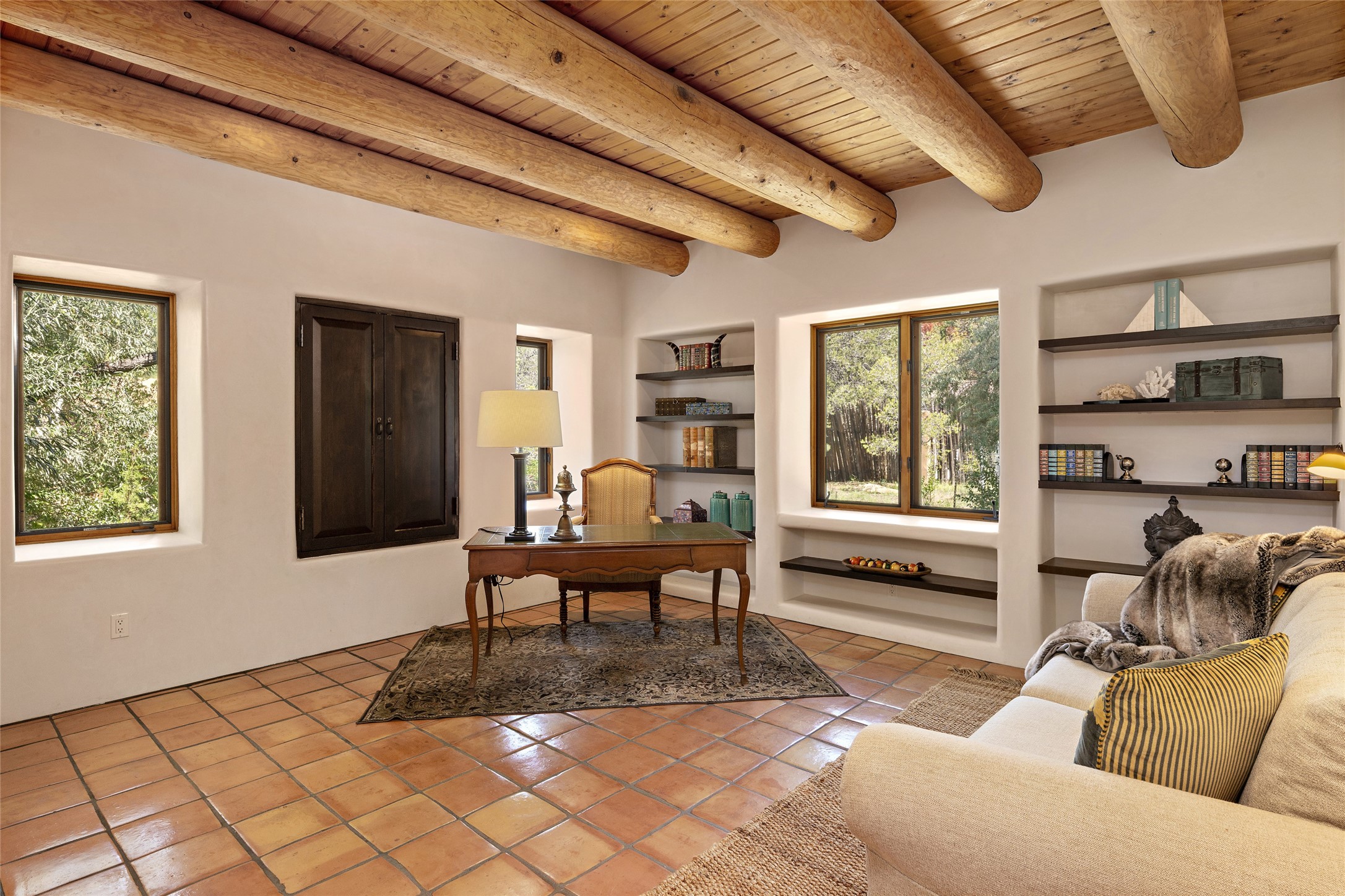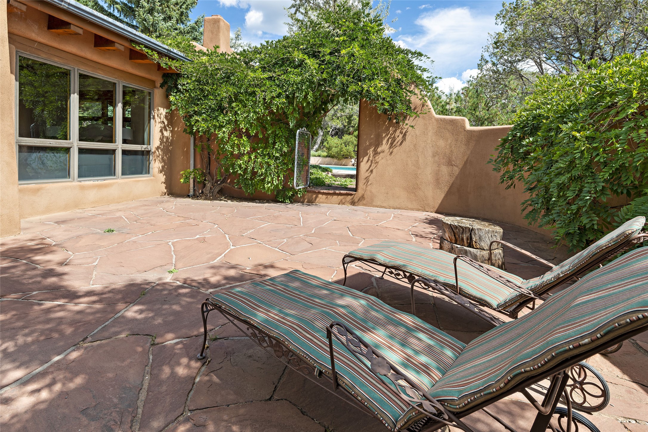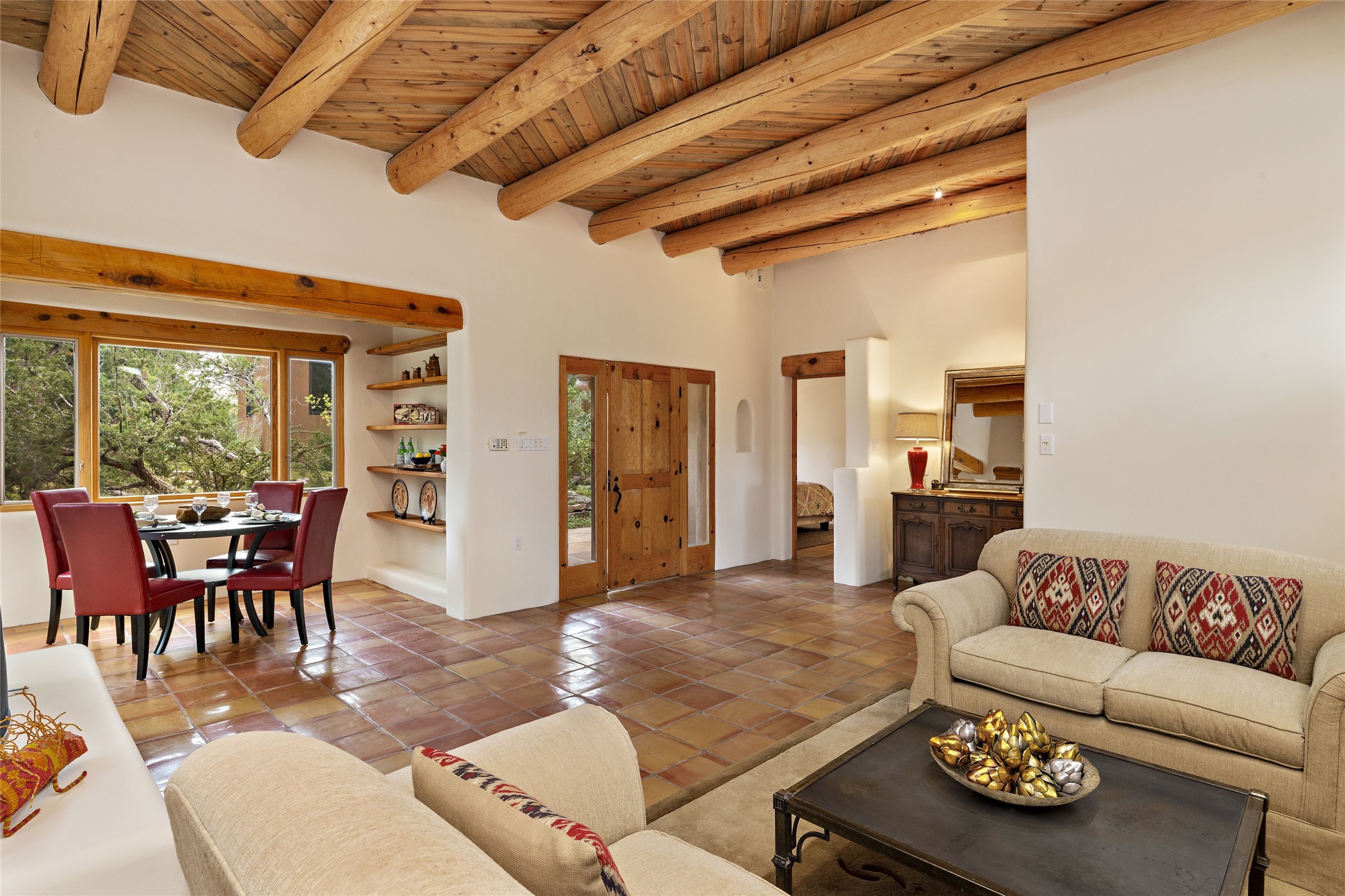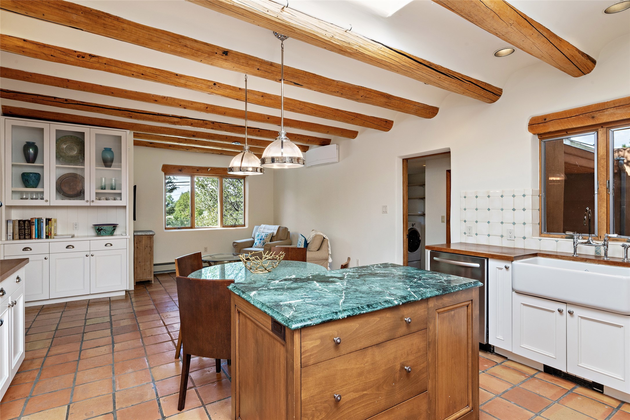 Embraced by lush, coyote-fenced grounds, this exquisite classic pueblo residence with casita and FOUR-CAR garaging, is an exceptional sanctuary. Abundant architectural details include vigas, beams, lintels and corbels with bullet carving & hand-painted accents, and rows of clerestory windows. The superb open concept design features a dramatic living room with soaring ceiling, track lighting, a fireplace flanked by deep, lighted alcoves with shelving, and French doors to the fabulous entertaining portal, pool area and mature trees & plantings. A generous dining area accesses the custom-designed chef's kitchen with breakfast & sitting/TV areas. An impressive private owner's suite bedroom boasts a high beamed ceiling, track lighting and kiva fireplace. The beautifully redesigned owner's bath and a private study have diamond plaster and in-floor radiant heat. A separate two-bedroom guest wing features a spacious high-walled courtyard with a gate to the pool & rear grounds. The delightful guest casita includes a high-ceilinged living room with fireplace, dining/office area, a bedroom and full bath. The 5 Daikon ductless mini-splits and a mini-split in the casita ensure year-round comfort. Situated just up the street from the storied Sol y Sombra estate, (owned by Georgia O'Keeffe; more recently by the late Paul Allen, co-founder of Microsoft), and within the Wood Gormley school district.