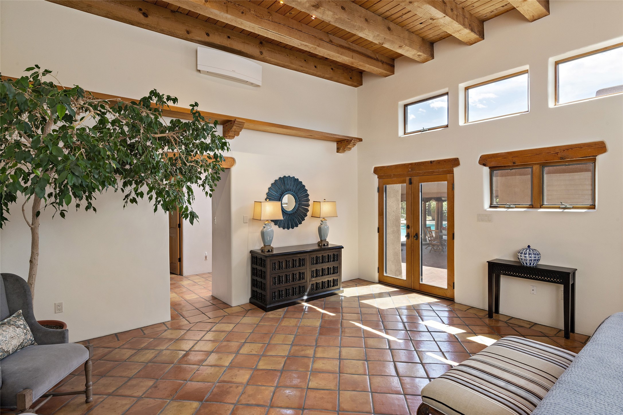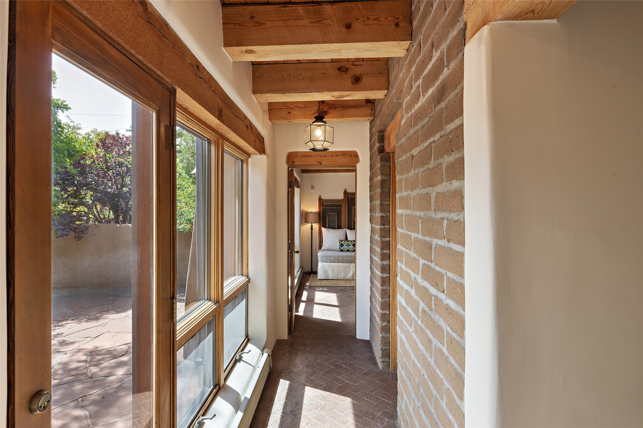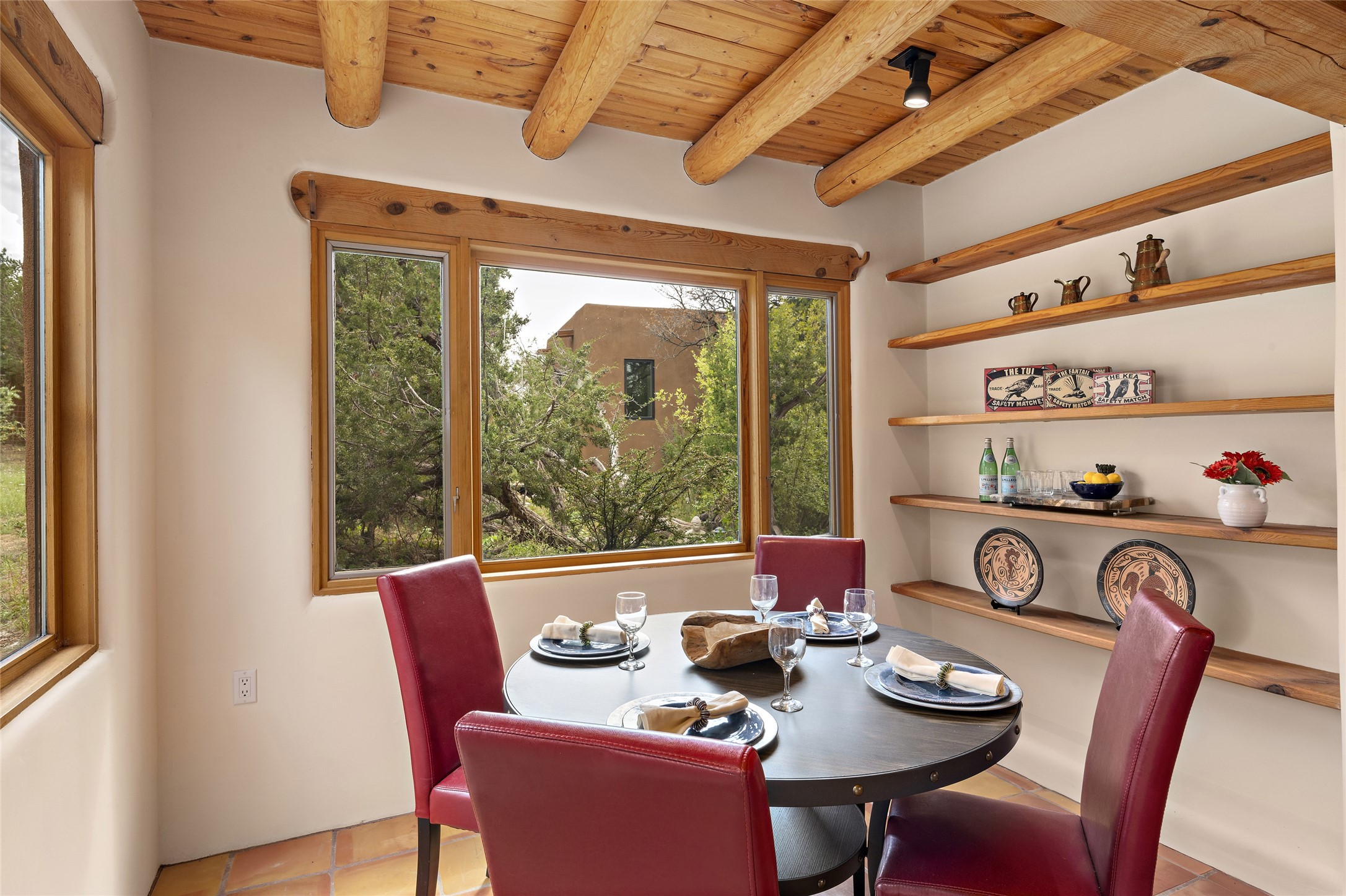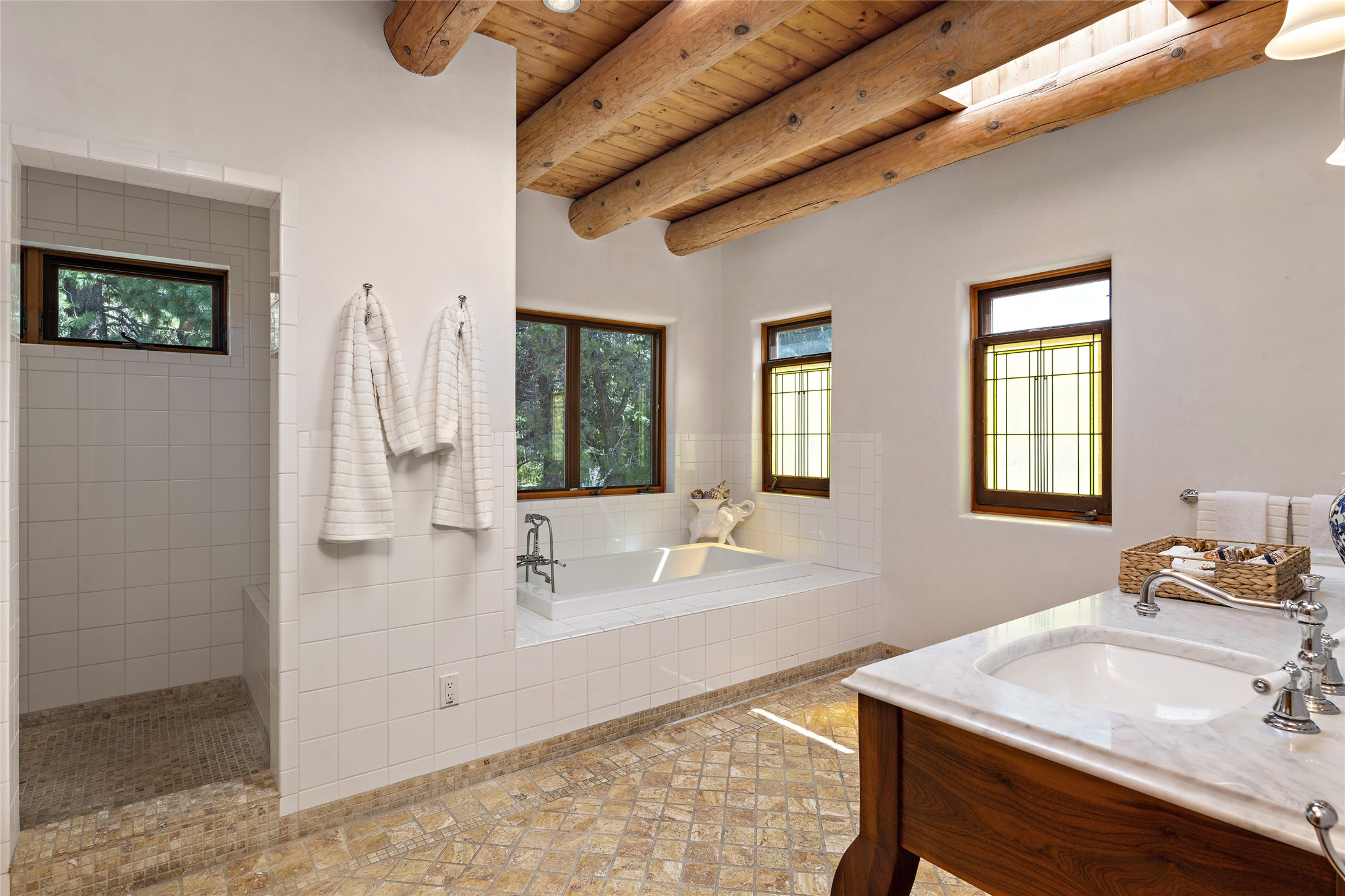 Embraced by lush, coyote-fenced grounds, this exquisite classic pueblo residence with casita and FOUR-CAR garaging, is an exceptional sanctuary. Abundant architectural details include vigas, beams, lintels and corbels with bullet carving & hand-painted accents, and rows of clerestory windows. The superb open concept design features a dramatic living room with soaring ceiling, track lighting, a fireplace flanked by deep, lighted alcoves with shelving, and French doors to the fabulous entertaining portal, pool area and mature trees & plantings. A generous dining area accesses the custom-designed chef's kitchen with breakfast & sitting/TV areas. An impressive private owner's suite bedroom boasts a high beamed ceiling, track lighting and kiva fireplace. The beautifully redesigned owner's bath and a private study have diamond plaster and in-floor radiant heat. A separate two-bedroom guest wing features a spacious high-walled courtyard with a gate to the pool & rear grounds. The delightful guest casita includes a high-ceilinged living room with fireplace, dining/office area, a bedroom and full bath. The 5 Daikon ductless mini-splits and a mini-split in the casita ensure year-round comfort. Situated just up the street from the storied Sol y Sombra estate, (owned by Georgia O'Keeffe; more recently by the late Paul Allen, co-founder of Microsoft), and within the Wood Gormley school district.