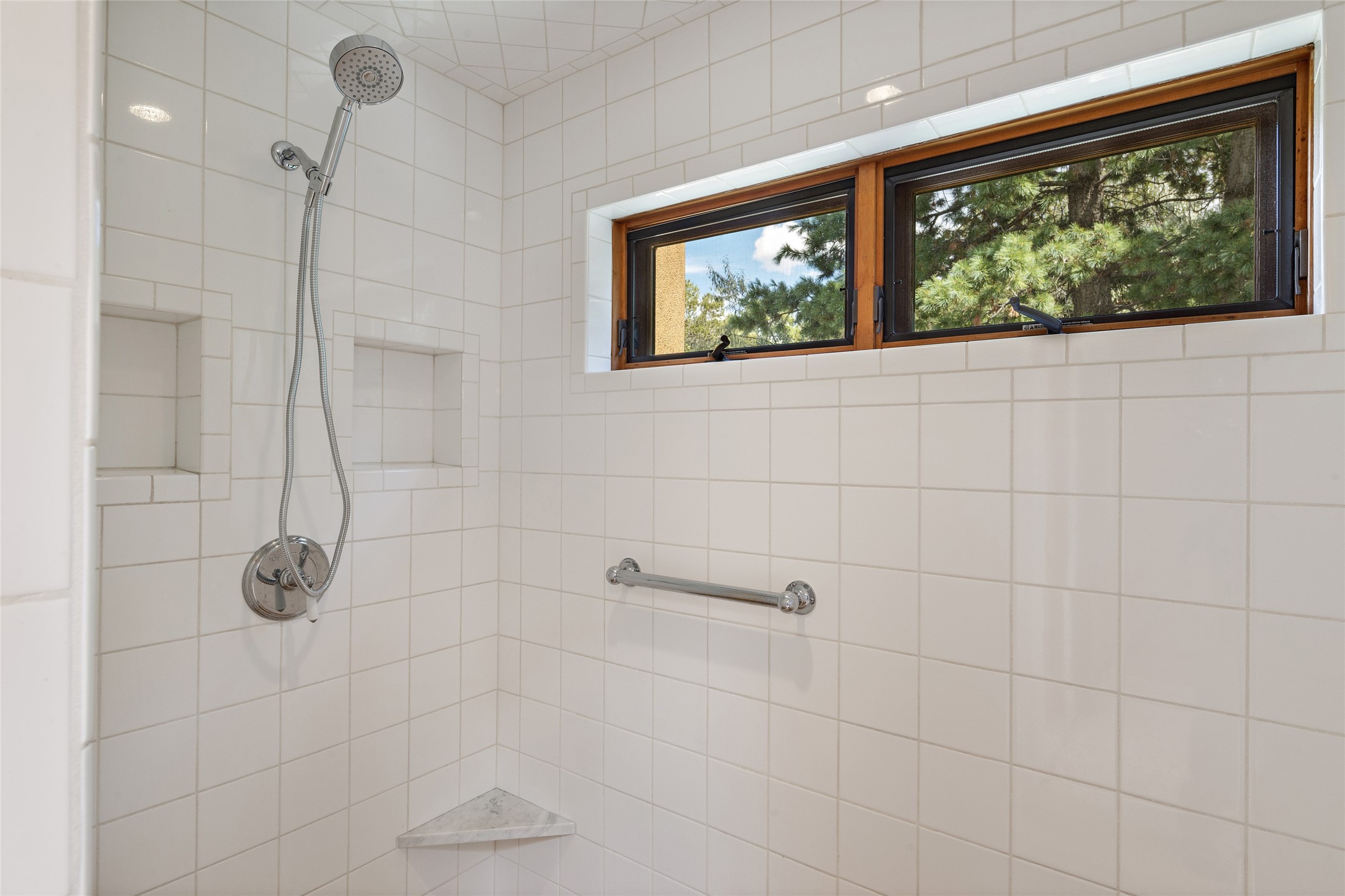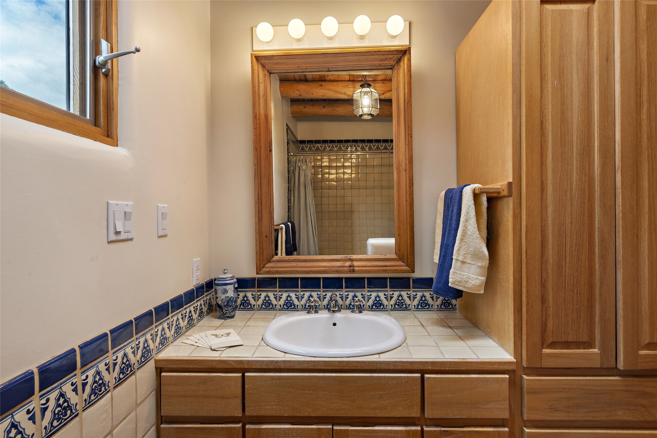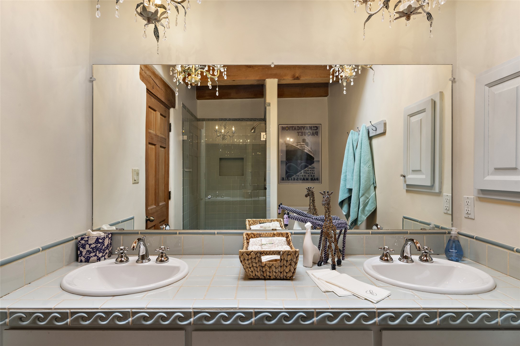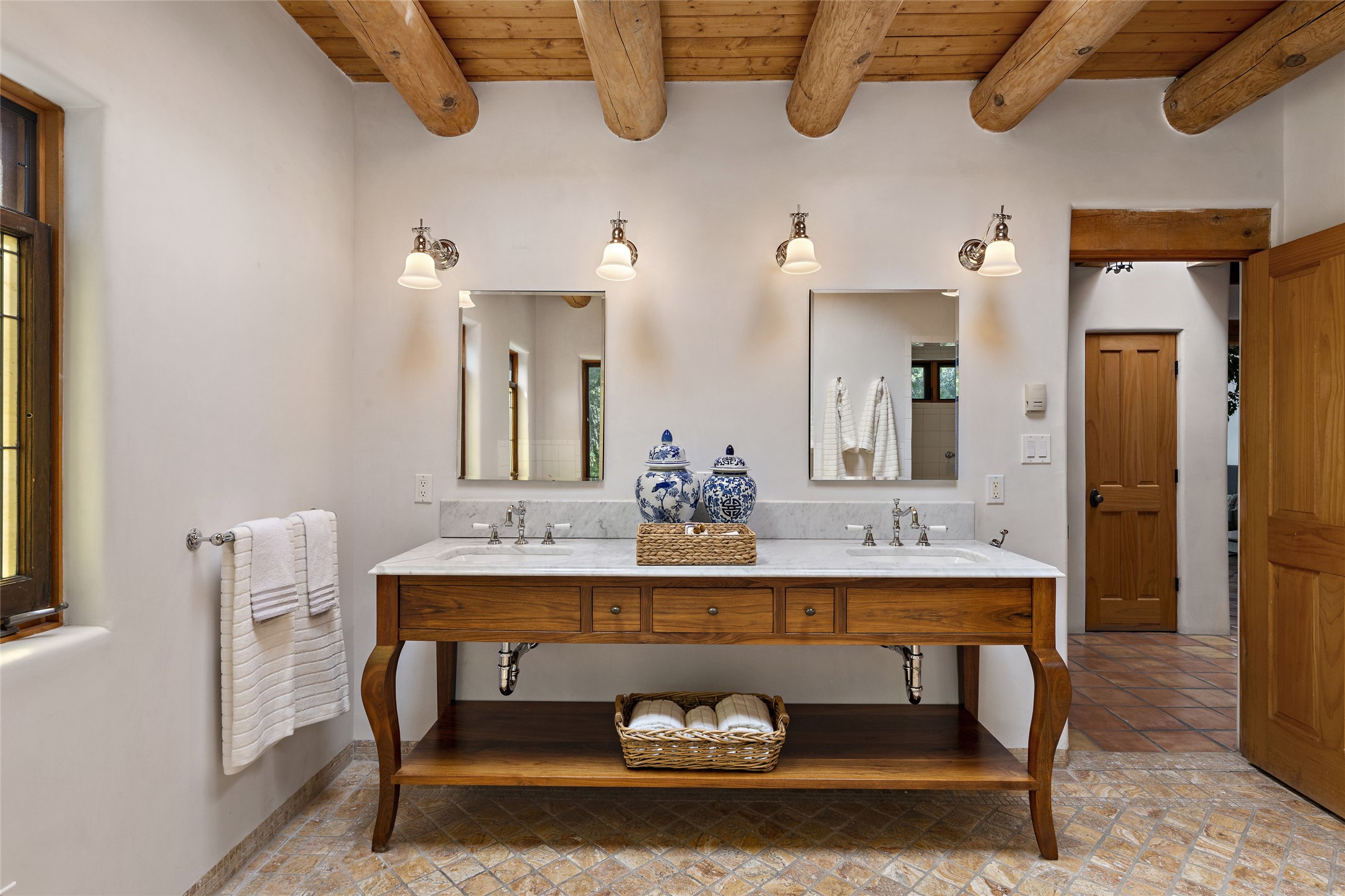 Embraced by lush, coyote-fenced grounds, this exquisite classic pueblo residence with casita and FOUR-CAR garaging, is an exceptional sanctuary. Abundant architectural details include vigas, beams, lintels and corbels with bullet carving & hand-painted accents, and rows of clerestory windows. The superb open concept design features a dramatic living room with soaring ceiling, track lighting, a fireplace flanked by deep, lighted alcoves with shelving, and French doors to the fabulous entertaining portal, pool area and mature trees & plantings. A generous dining area accesses the custom-designed chef's kitchen with breakfast & sitting/TV areas. An impressive private owner's suite bedroom boasts a high beamed ceiling, track lighting and kiva fireplace. The beautifully redesigned owner's bath and a private study have diamond plaster and in-floor radiant heat. A separate two-bedroom guest wing features a spacious high-walled courtyard with a gate to the pool & rear grounds. The delightful guest casita includes a high-ceilinged living room with fireplace, dining/office area, a bedroom and full bath. The 5 Daikon ductless mini-splits and a mini-split in the casita ensure year-round comfort. Situated just up the street from the storied Sol y Sombra estate, (owned by Georgia O'Keeffe; more recently by the late Paul Allen, co-founder of Microsoft), and within the Wood Gormley school district.