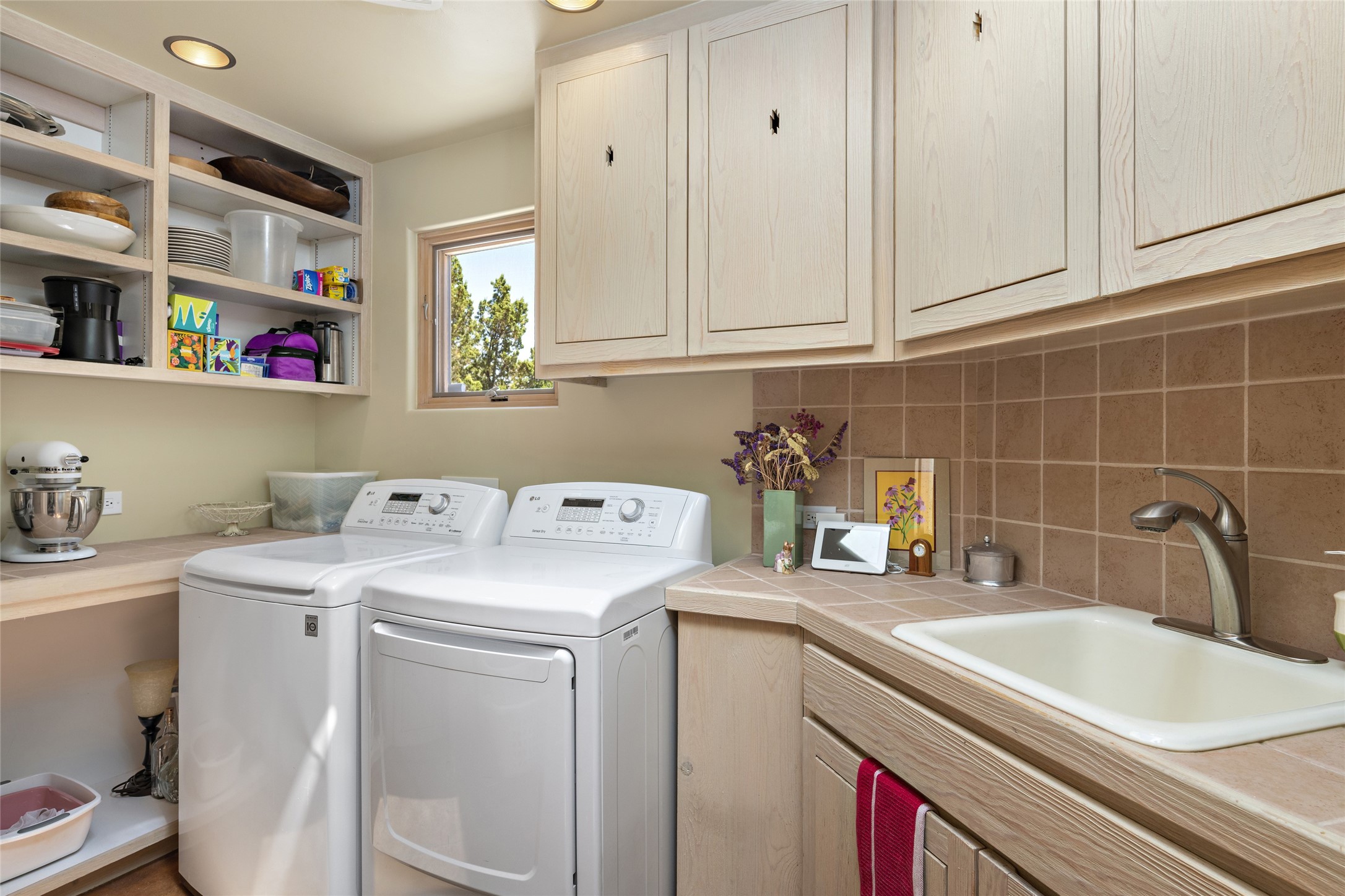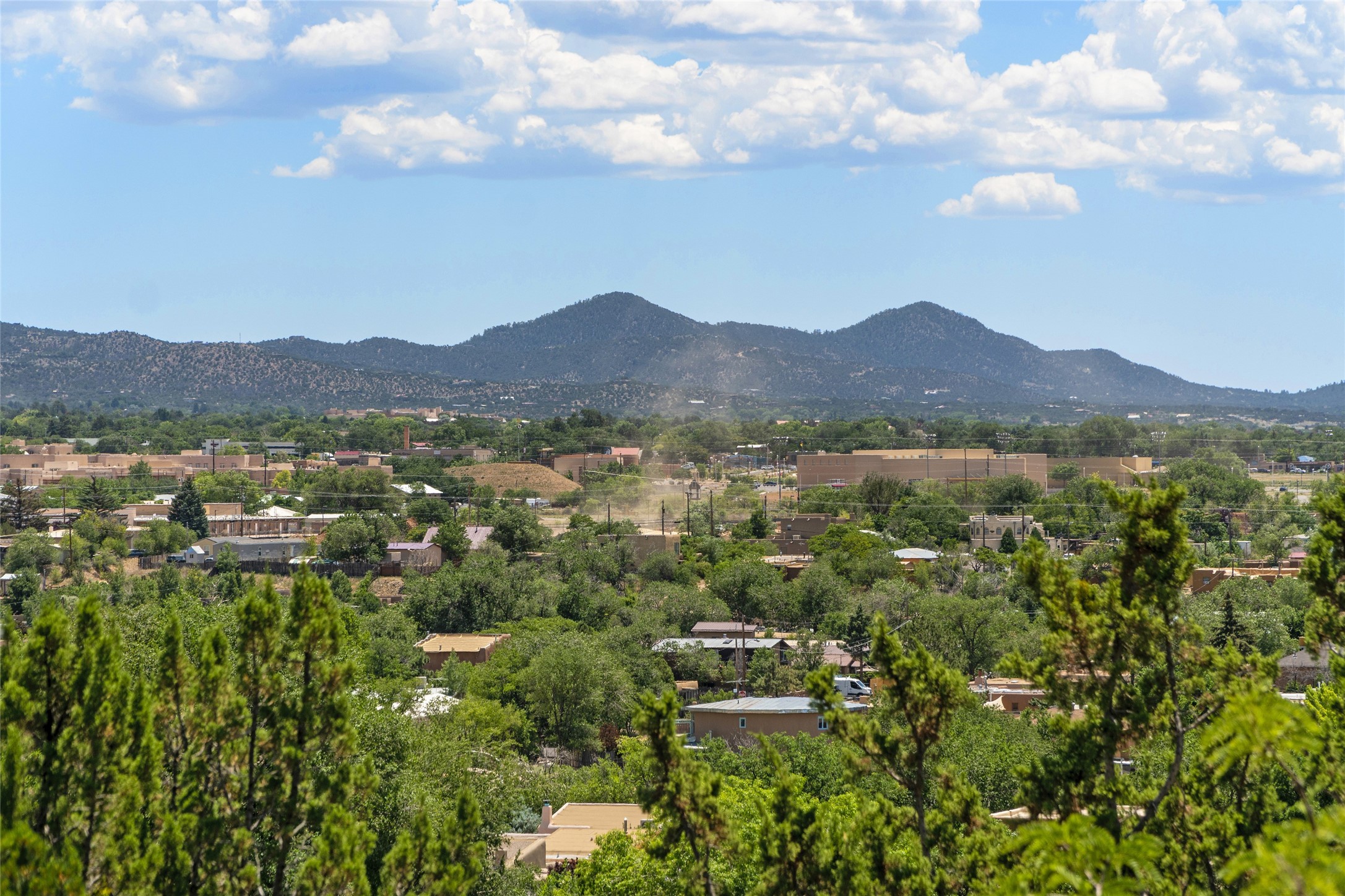 Hold your breath! You will be awed by the views, and enchanted by the gardens of this delightful, in-town property. The house was built by Michael Hurlocker, a Santa Fe builder, as his personal residence. He is well-known for his dedication to high quality design and construction. The light-filled interior is of gracious, ample proportions with many French doors leading to the gardens. Truly a home for easy living and entertaining in the spacious living and dining areas. The room-sized outside portal is pure magic, with grape and wisteria vines overhead and a view to the Sangre de Cristo Mountains to the east. A comfortable bay window seat graces the well-designed kitchen which has lots of counter space and cabinets. The primary suite is quietly situated at the top of the house, with large bedroom and splendid view deck, roomy bathroom and super-big walk-in closet. Two guest bedrooms both have French doors to the outside and are separately located from the main bedroom suite. One is currently used as a studio. And now for the bonus features - A home office with double doors in the main core of the house and a large storage room off the oversized, two-car garage. Landscape lighting has recently been installed and the gardens are on drip and sprinkler irrigation. Conveniently located in Las Lomas subdivision on 0.54 acres, this home is a delight, as also seen in the magical evening photographs!