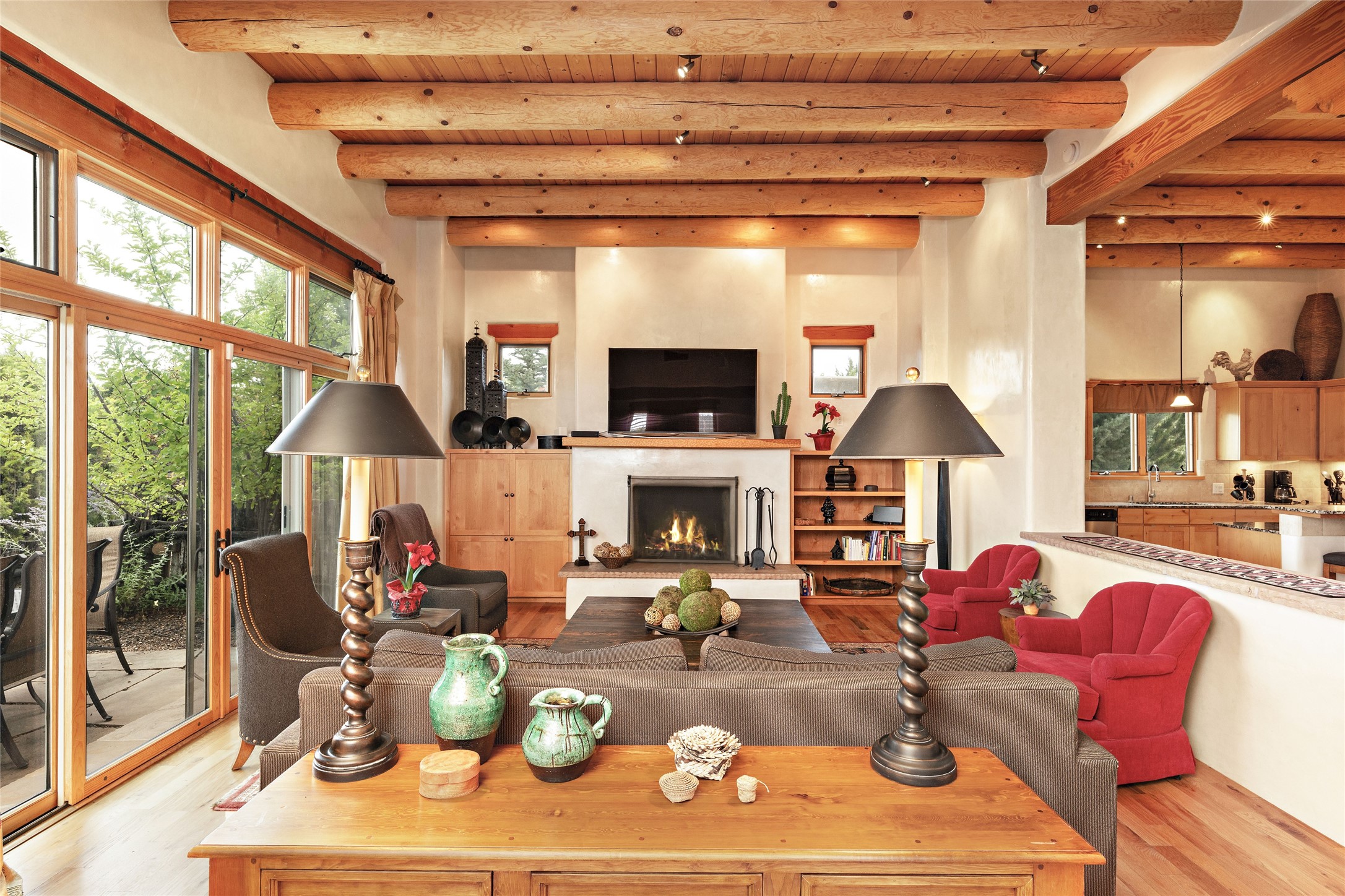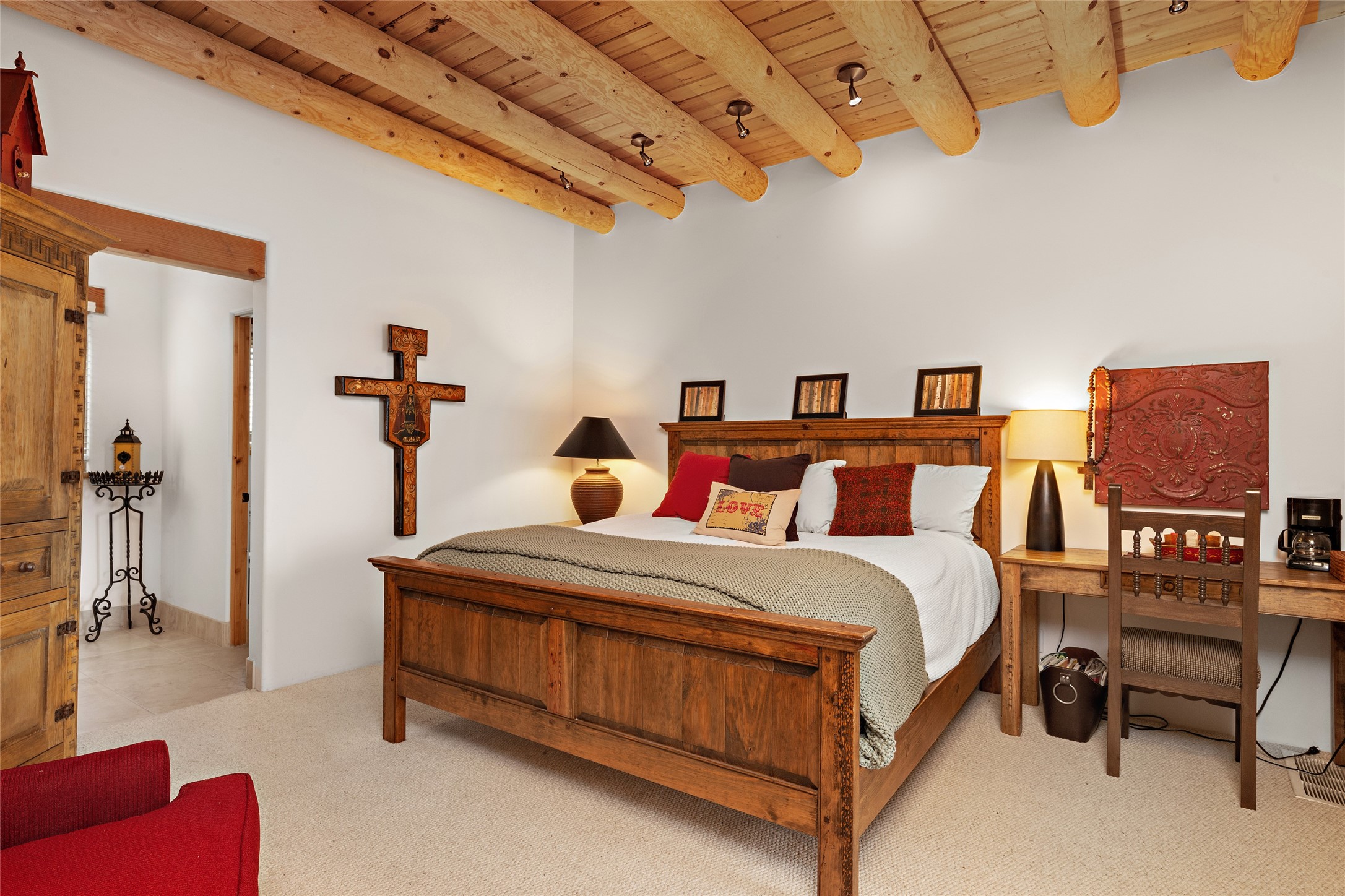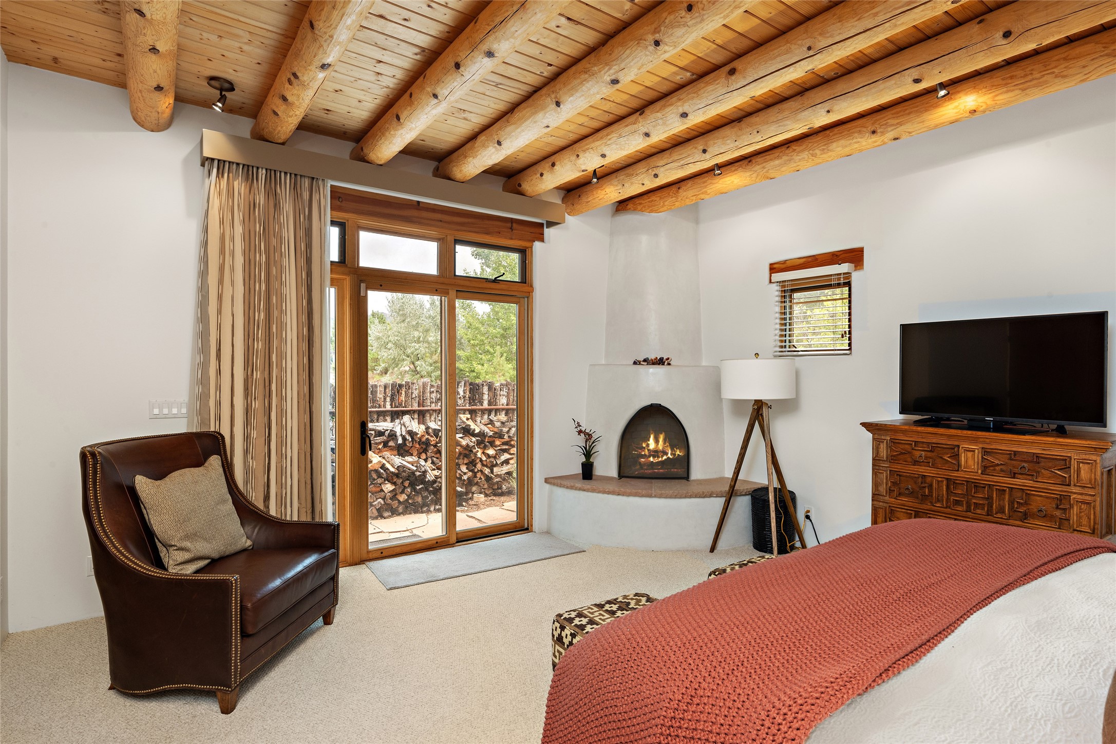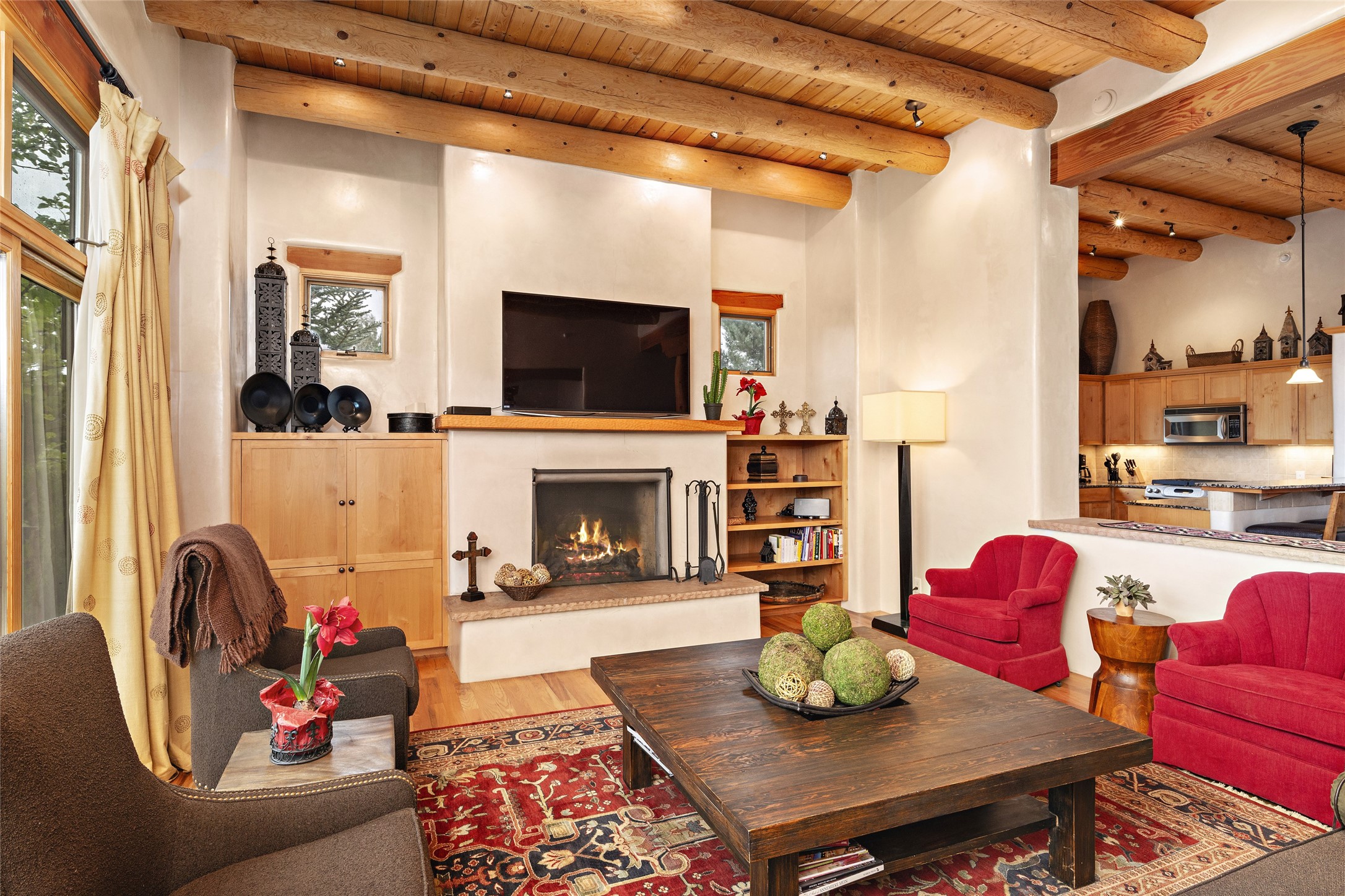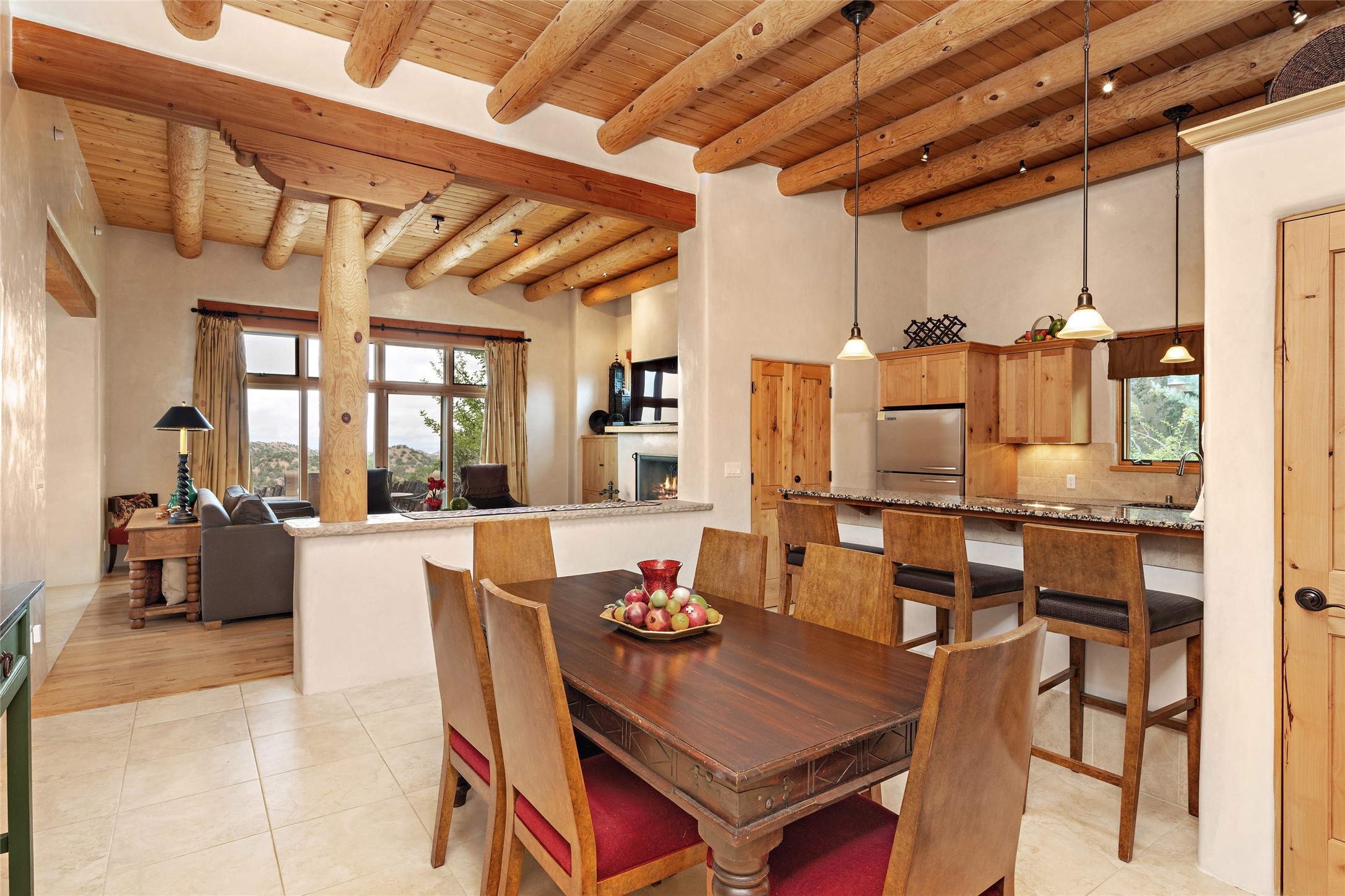 Timeless Santa Fe design, in this Bishop's Lodge Villa, which is currently the only one on the market. Numerous possibilities -full time residence, 2nd home, or vacation rental opportunities. As you walk up to the Villa, from the private gated parking area, you will notice the rolling hills to the east and west. Custom front gate leads to the wrap around coyote fenced courtyards. Spacious outdoor areas with flagstone patios. Oversized front door with grand entry. Living room features include large fireplace with flagstone hearth, built-in custom bookshelves and cabinets, as well as sliding doors that lead to an outdoor patio. Generous U-shaped kitchen with pantry, storage and bar counter seating, ideal for entertaining. Kitchen opens to expansive dining area, with beautiful natural light throughout. Two of the bedroom suites have a kiva fireplace. All 3 bedrooms have private bathrooms and separate outdoor patios. One ensuite has a steam shower and jetted tub. Traditional Santa Fe architectural elements throughout. High ceilings including tongue/groove with beams, corbels, plaster walls, wood & tile flooring, granite countertops, custom doors, and beam trimmed windows. Serene mountain views & lush natural landscaping. Within the cluster of villas is also a private pool. A pristine & charming neighborhood just north of downtown Santa Fe. This very private property, in beautiful Santa Fe is sure to not disappoint. Owners attentiveness to detail has this Villa move-in ready!
