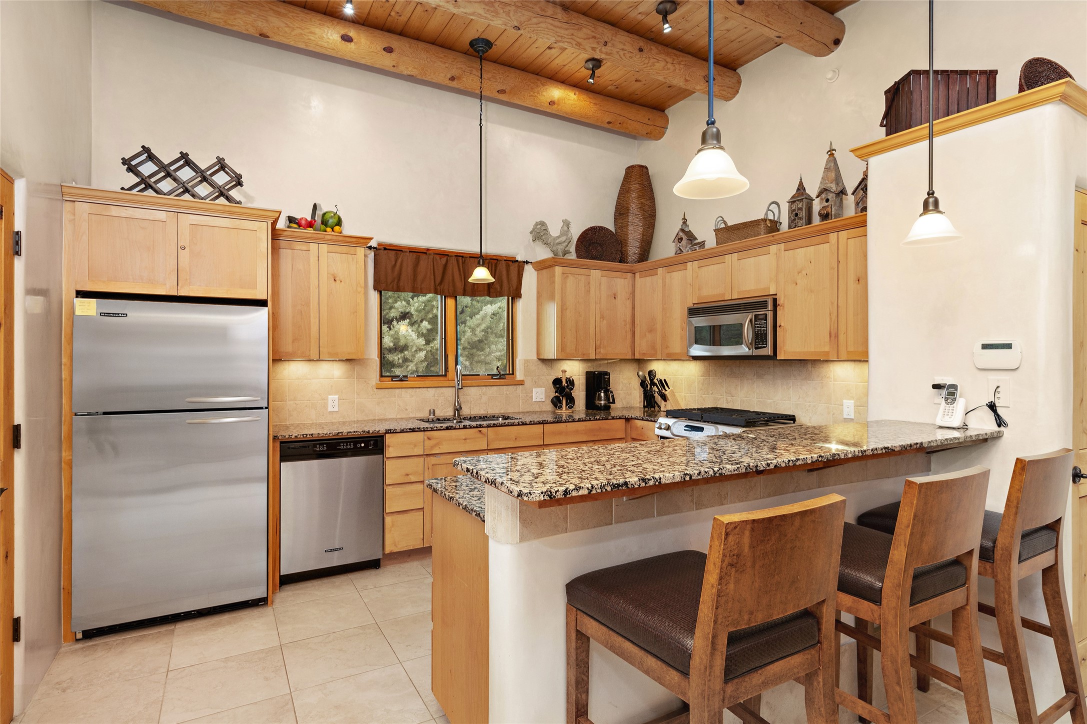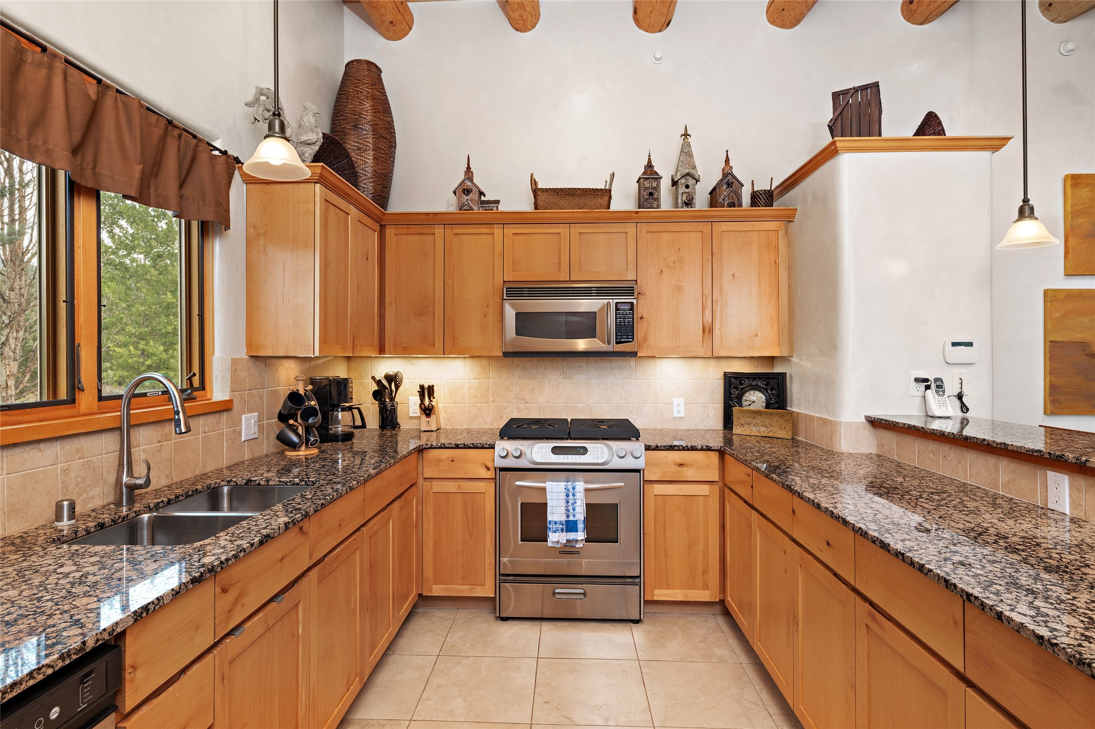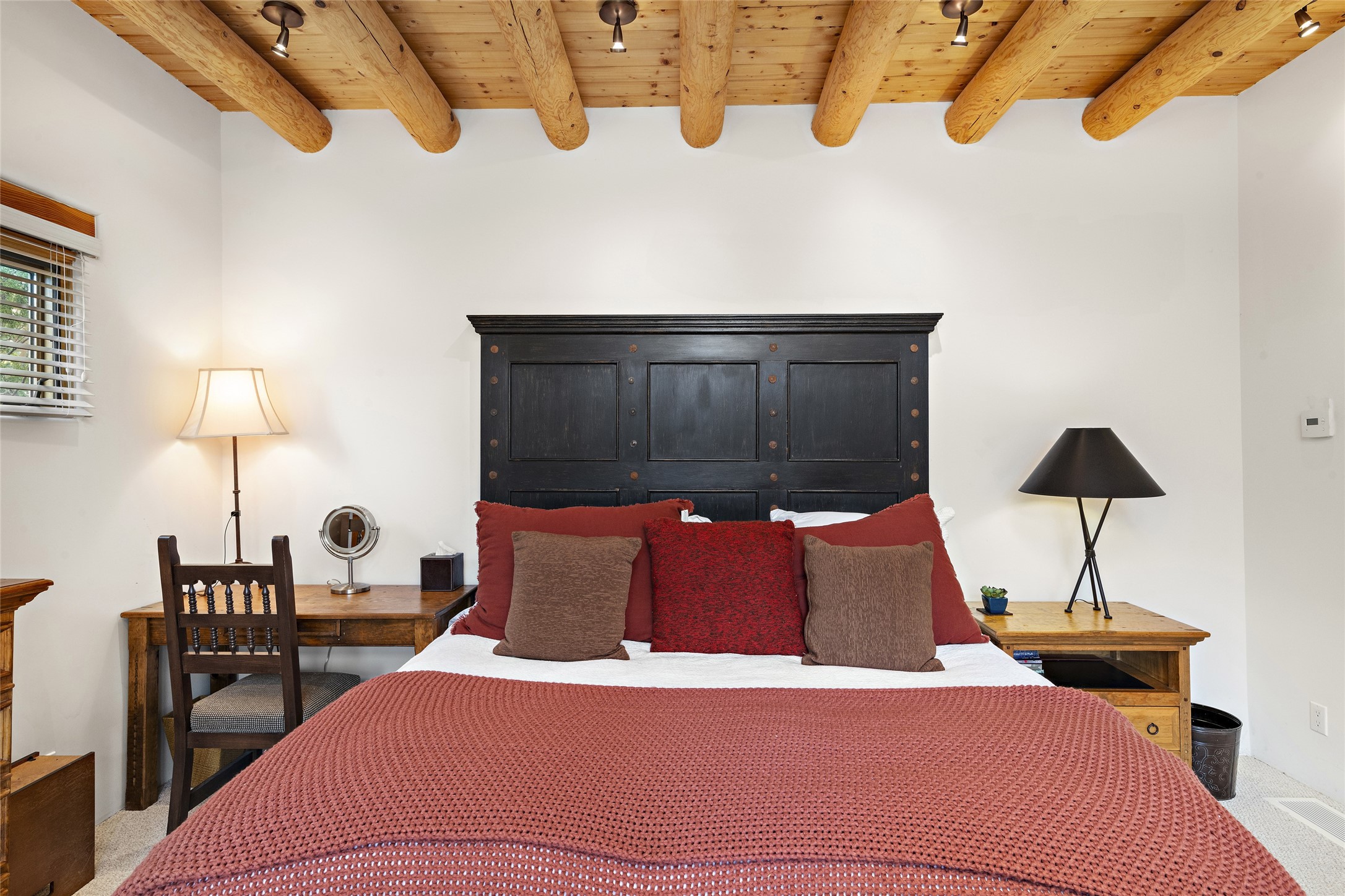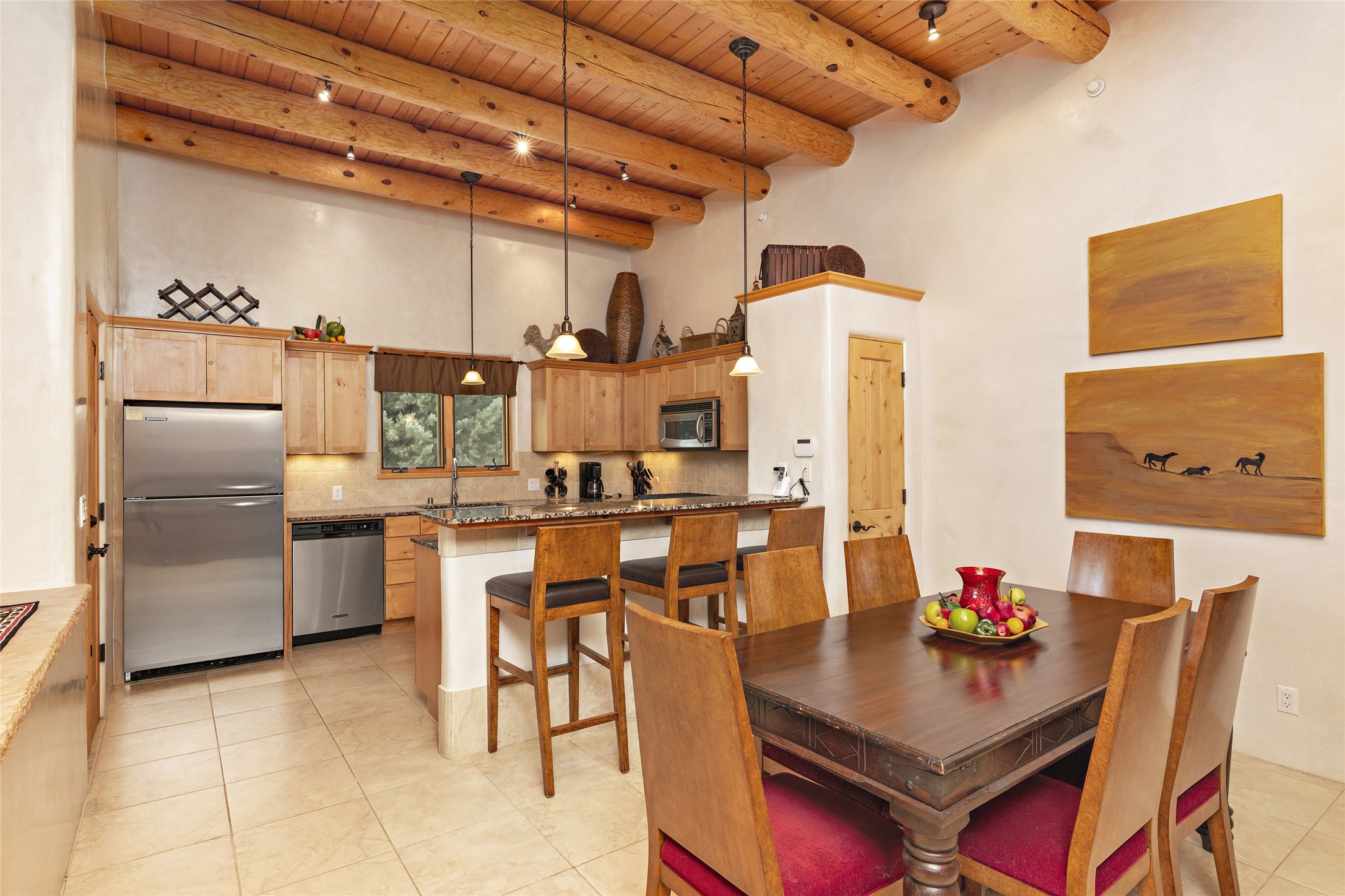 Timeless Santa Fe design, in this Bishop's Lodge Villa, which is currently the only one on the market. Numerous possibilities -full time residence, 2nd home, or vacation rental opportunities. As you walk up to the Villa, from the private gated parking area, you will notice the rolling hills to the east and west. Custom front gate leads to the wrap around coyote fenced courtyards. Spacious outdoor areas with flagstone patios. Oversized front door with grand entry. Living room features include large fireplace with flagstone hearth, built-in custom bookshelves and cabinets, as well as sliding doors that lead to an outdoor patio. Generous U-shaped kitchen with pantry, storage and bar counter seating, ideal for entertaining. Kitchen opens to expansive dining area, with beautiful natural light throughout. Two of the bedroom suites have a kiva fireplace. All 3 bedrooms have private bathrooms and separate outdoor patios. One ensuite has a steam shower and jetted tub. Traditional Santa Fe architectural elements throughout. High ceilings including tongue/groove with beams, corbels, plaster walls, wood & tile flooring, granite countertops, custom doors, and beam trimmed windows. Serene mountain views & lush natural landscaping. Within the cluster of villas is also a private pool. A pristine & charming neighborhood just north of downtown Santa Fe. This very private property, in beautiful Santa Fe is sure to not disappoint. Owners attentiveness to detail has this Villa move-in ready!