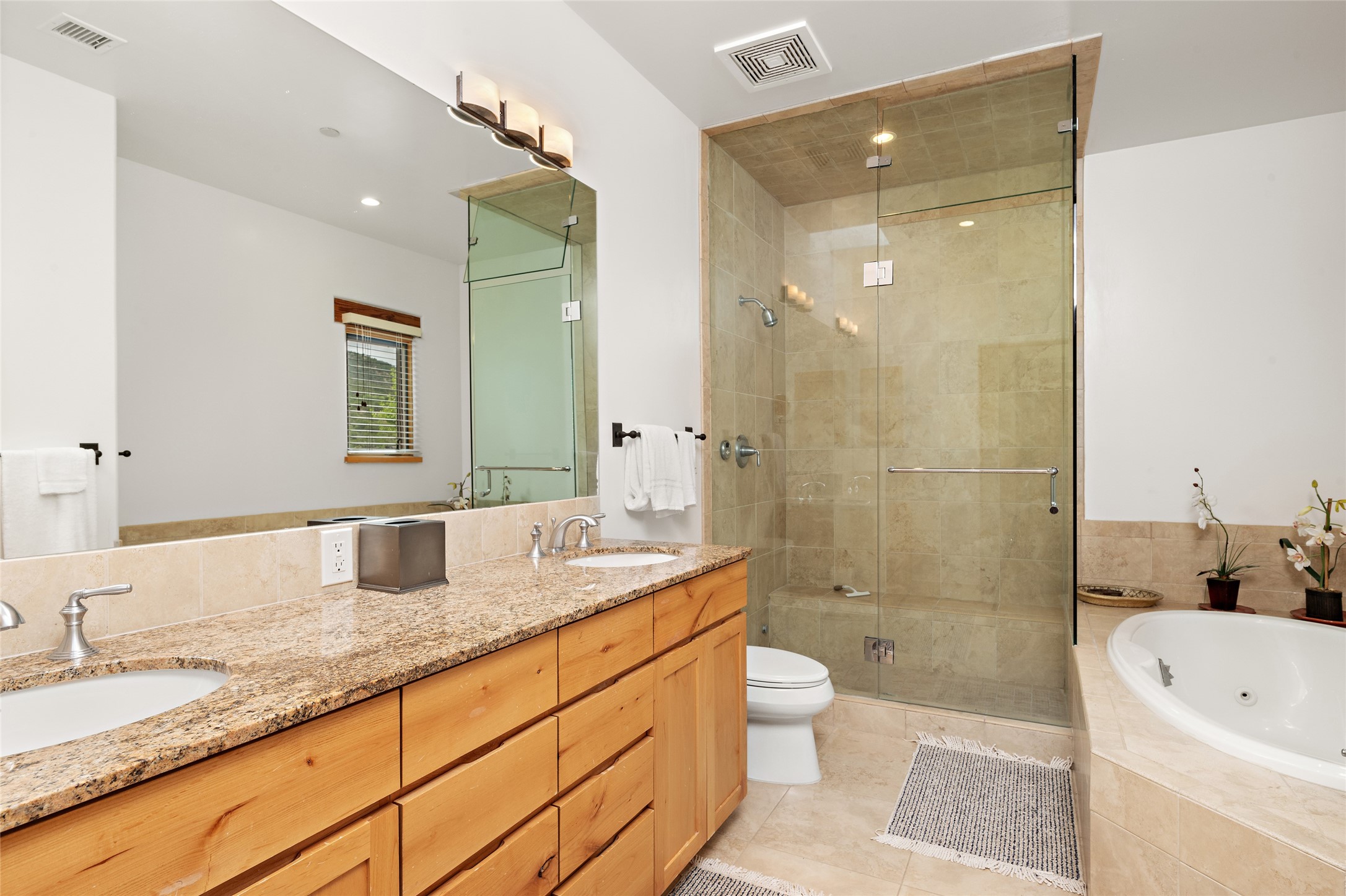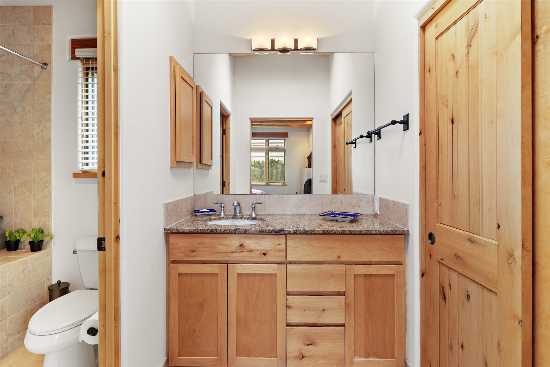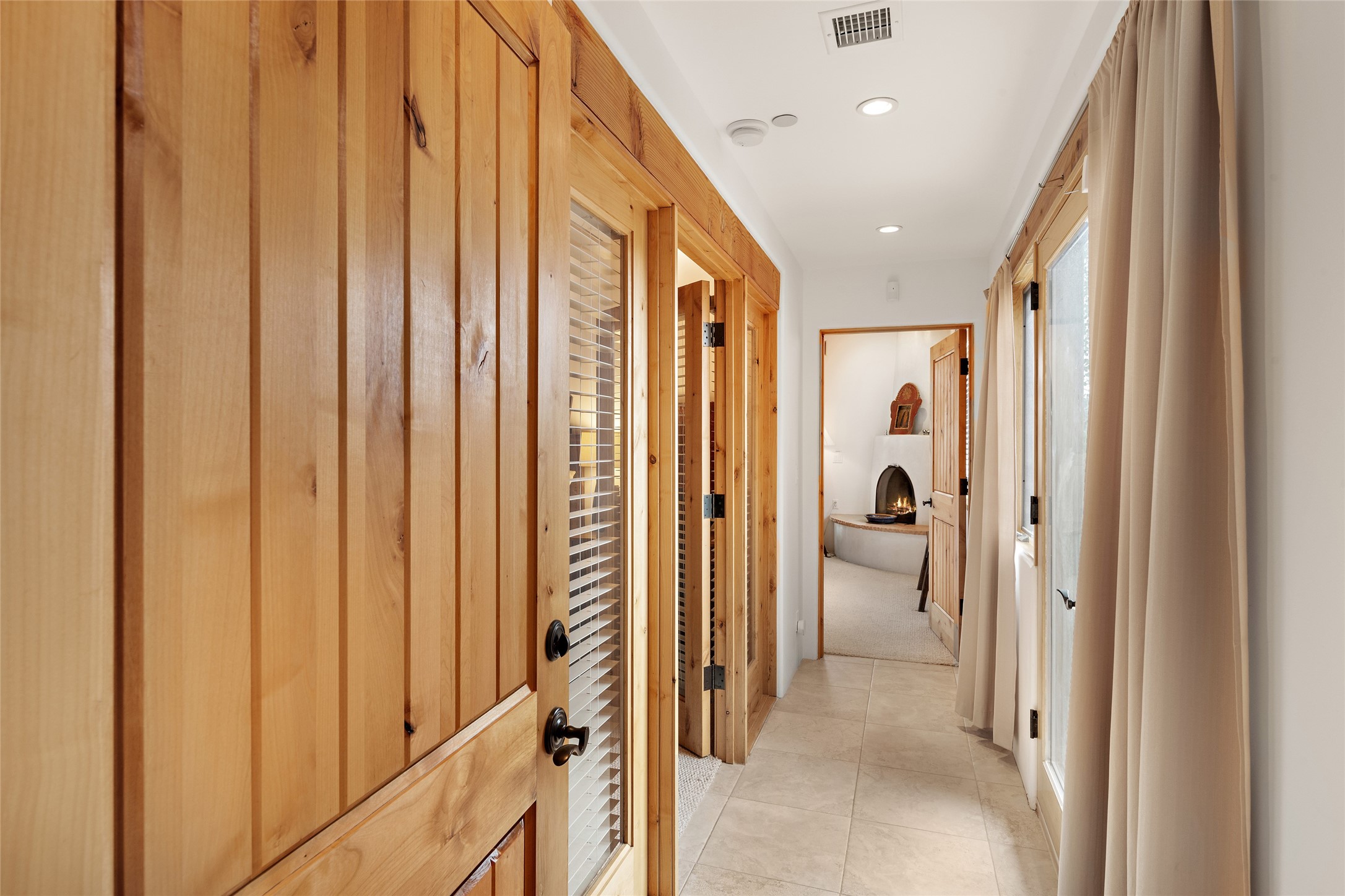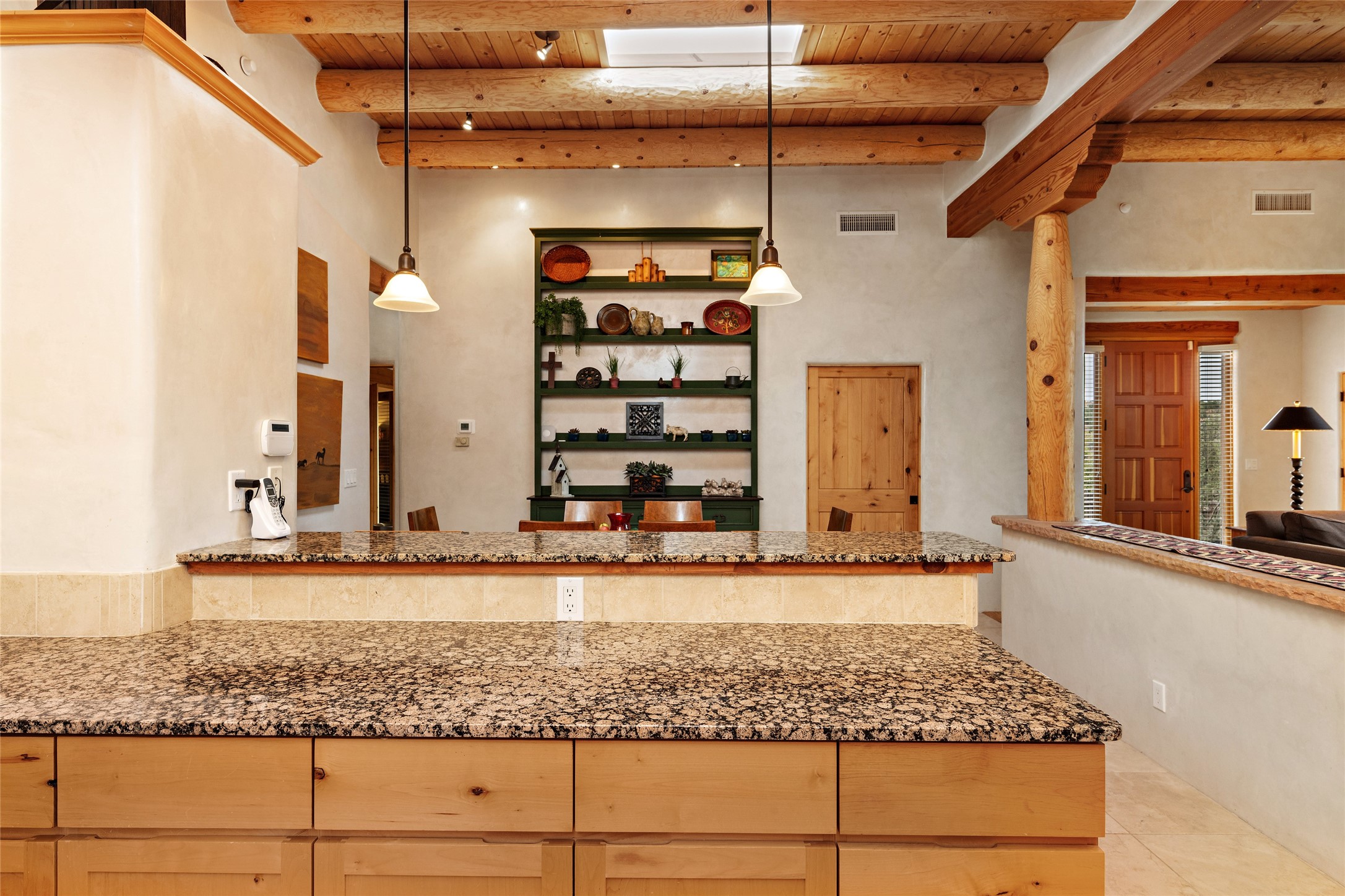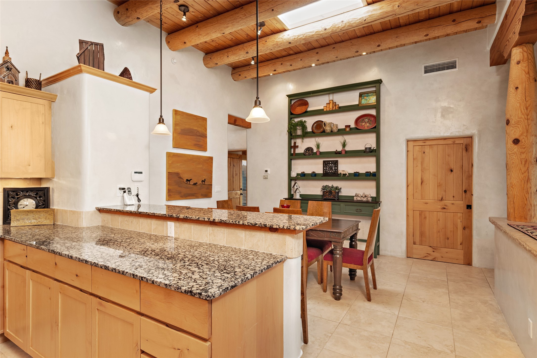 Timeless Santa Fe design, in this Bishop's Lodge Villa, which is currently the only one on the market. Numerous possibilities -full time residence, 2nd home, or vacation rental opportunities. As you walk up to the Villa, from the private gated parking area, you will notice the rolling hills to the east and west. Custom front gate leads to the wrap around coyote fenced courtyards. Spacious outdoor areas with flagstone patios. Oversized front door with grand entry. Living room features include large fireplace with flagstone hearth, built-in custom bookshelves and cabinets, as well as sliding doors that lead to an outdoor patio. Generous U-shaped kitchen with pantry, storage and bar counter seating, ideal for entertaining. Kitchen opens to expansive dining area, with beautiful natural light throughout. Two of the bedroom suites have a kiva fireplace. All 3 bedrooms have private bathrooms and separate outdoor patios. One ensuite has a steam shower and jetted tub. Traditional Santa Fe architectural elements throughout. High ceilings including tongue/groove with beams, corbels, plaster walls, wood & tile flooring, granite countertops, custom doors, and beam trimmed windows. Serene mountain views & lush natural landscaping. Within the cluster of villas is also a private pool. A pristine & charming neighborhood just north of downtown Santa Fe. This very private property, in beautiful Santa Fe is sure to not disappoint. Owners attentiveness to detail has this Villa move-in ready!