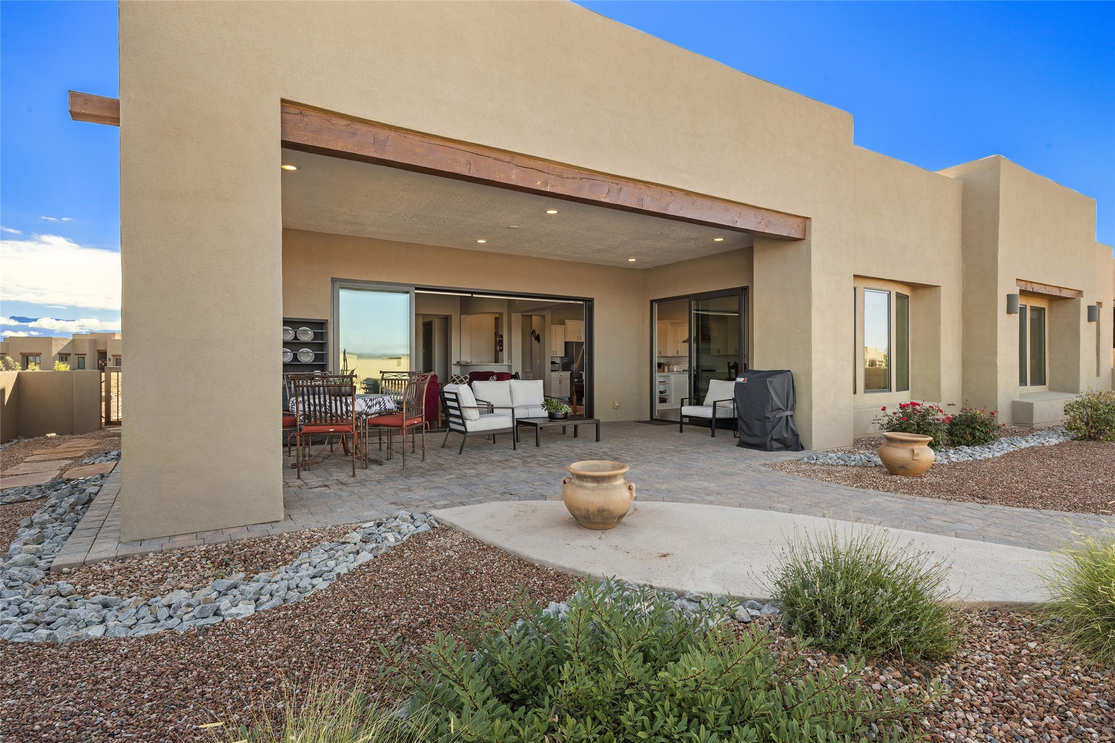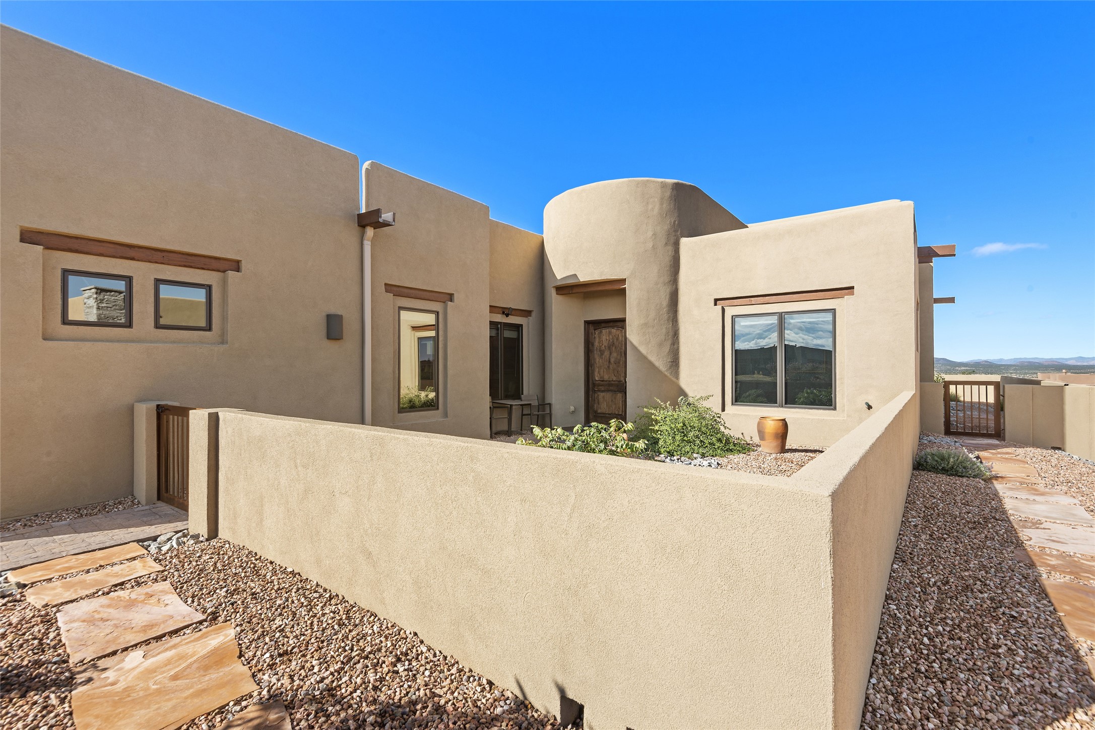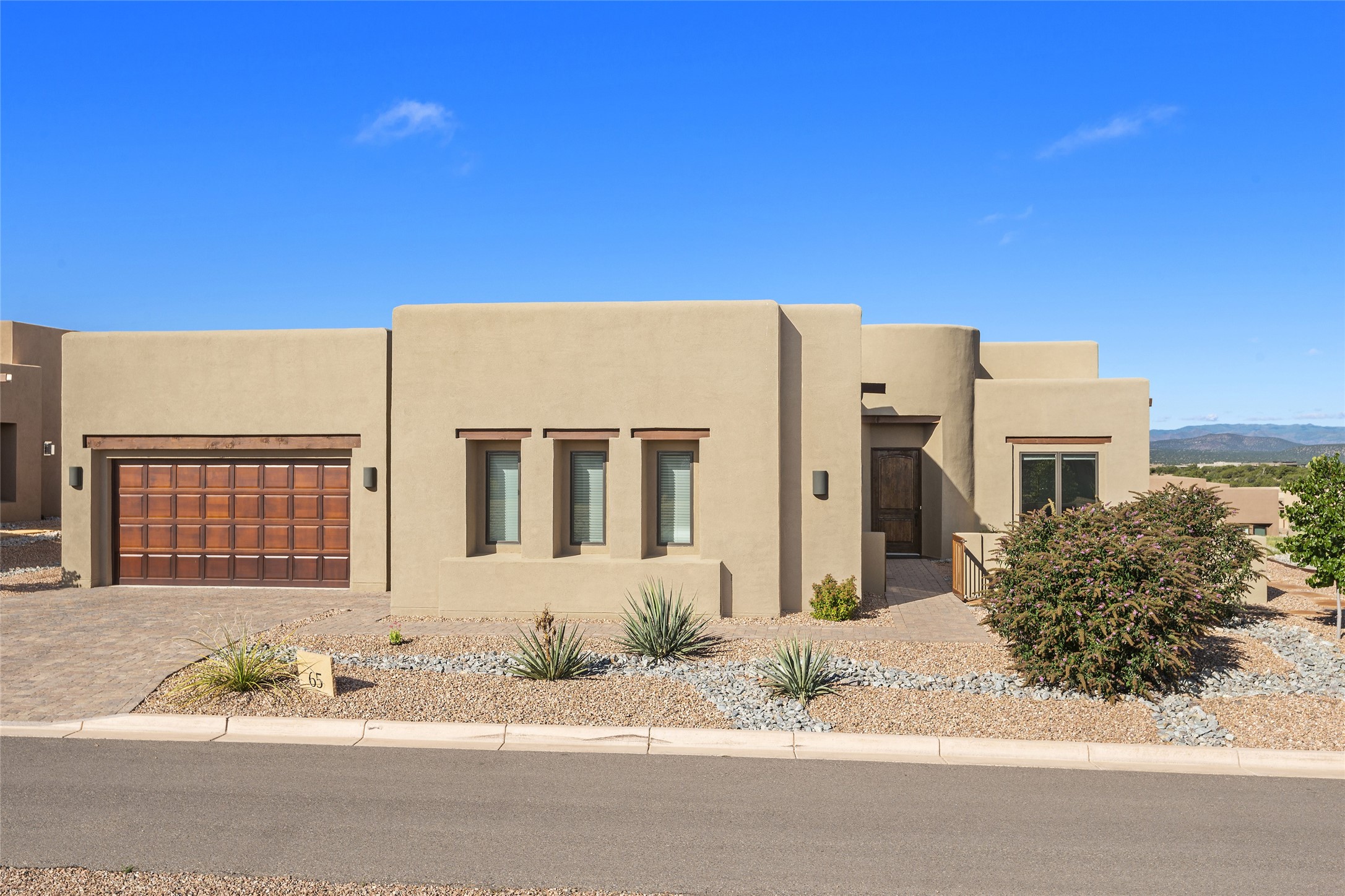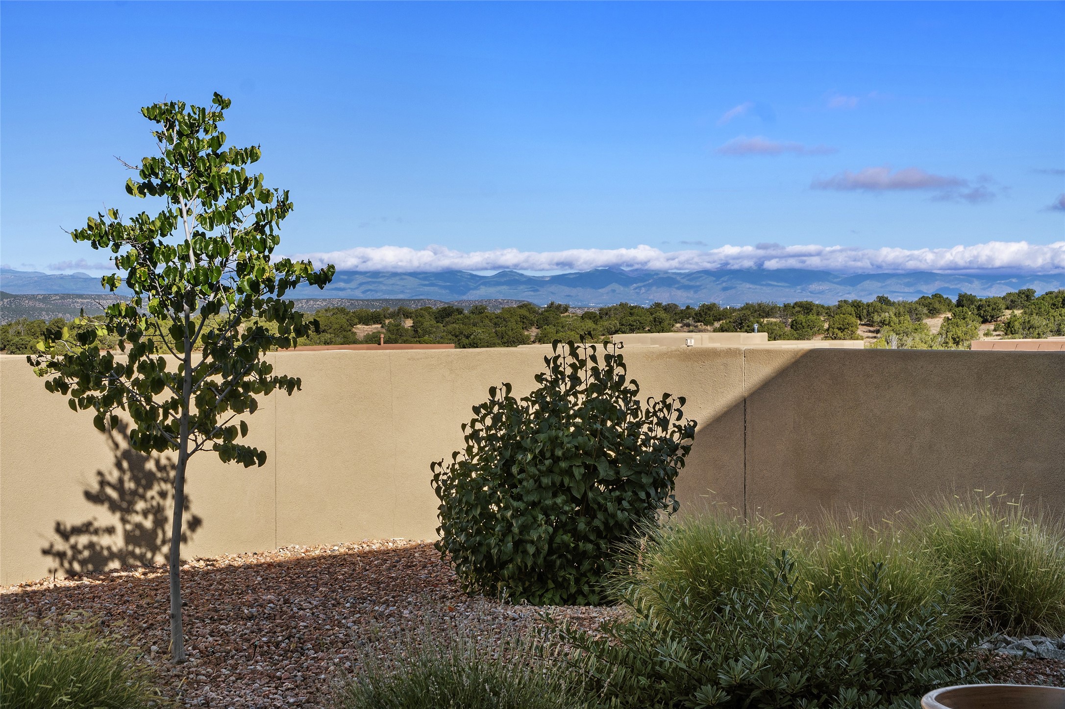Built in 2019 in the Las Terrazas enclave, the home is a Courtside contemporary plan and has stunning views of the Jemez Mountains. This beautifully maintained 3529 sq. ft. residence offers an open floor plan ideal for entertaining with light-filled living, dining and kitchen areas; wet bar; office/media room; three bedrooms each ensuite and 3-car garage. Retracting sliding glass doors frame the mountain view and connect the living and dining areas to a generous portal for enjoying the amazing Santa Fe sunsets, a walled-in patio and Kiva fireplace. A spacious Chef's kitchen is anchored by a large center island with caf seating and a Butler's Pantry. Appliances include a KitchenAid package with gas cooktop and two gas ovens, two dishwashers and wine cooler. The luxurious Owner's Suite features a coffered ceiling, retreat area, a spa-like bath area and large closets. Seller's upgrades include ceiling beams; crown molding; quartz counter tops; pre-wiring for surround sound; hardwood, tile and carpet floors; a Smarthome System; 220-volt 50-amp circuit in the third garage and a Home Team Pest Control Injection System. The home is fully landscaped with drip irrigation and has been Certified Silver in the Build Green New Mexico Program. Memberships to the Club at Las Campanas are optional and can be purchased upon approval. The Club at Las Campanas offers two Signature Jack Nicklaus Golf Courses, Hacienda Clubhouse, Spa & Fitness Center, indoor and outdoor pools, pickleball, tennis, Log Cabin dining and a world-class Equestrian Center. 18 Minutes to the Historical Plaza and Santa Fe Airport, this property is priced well and will be move-in ready in early October.