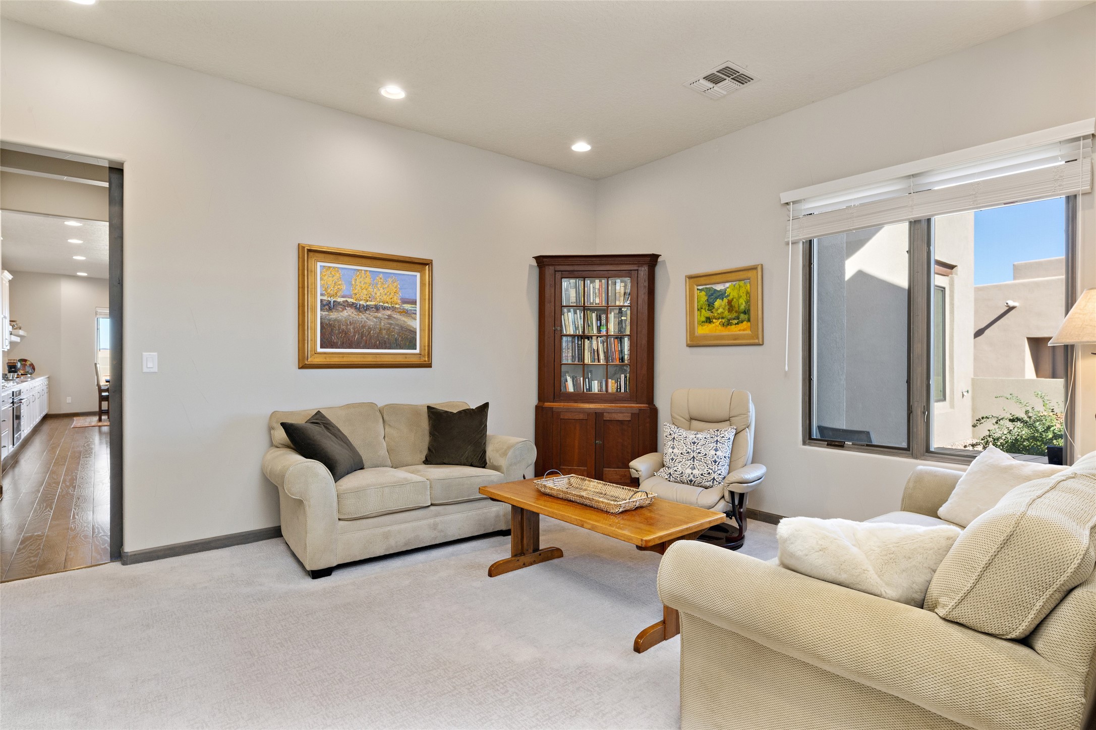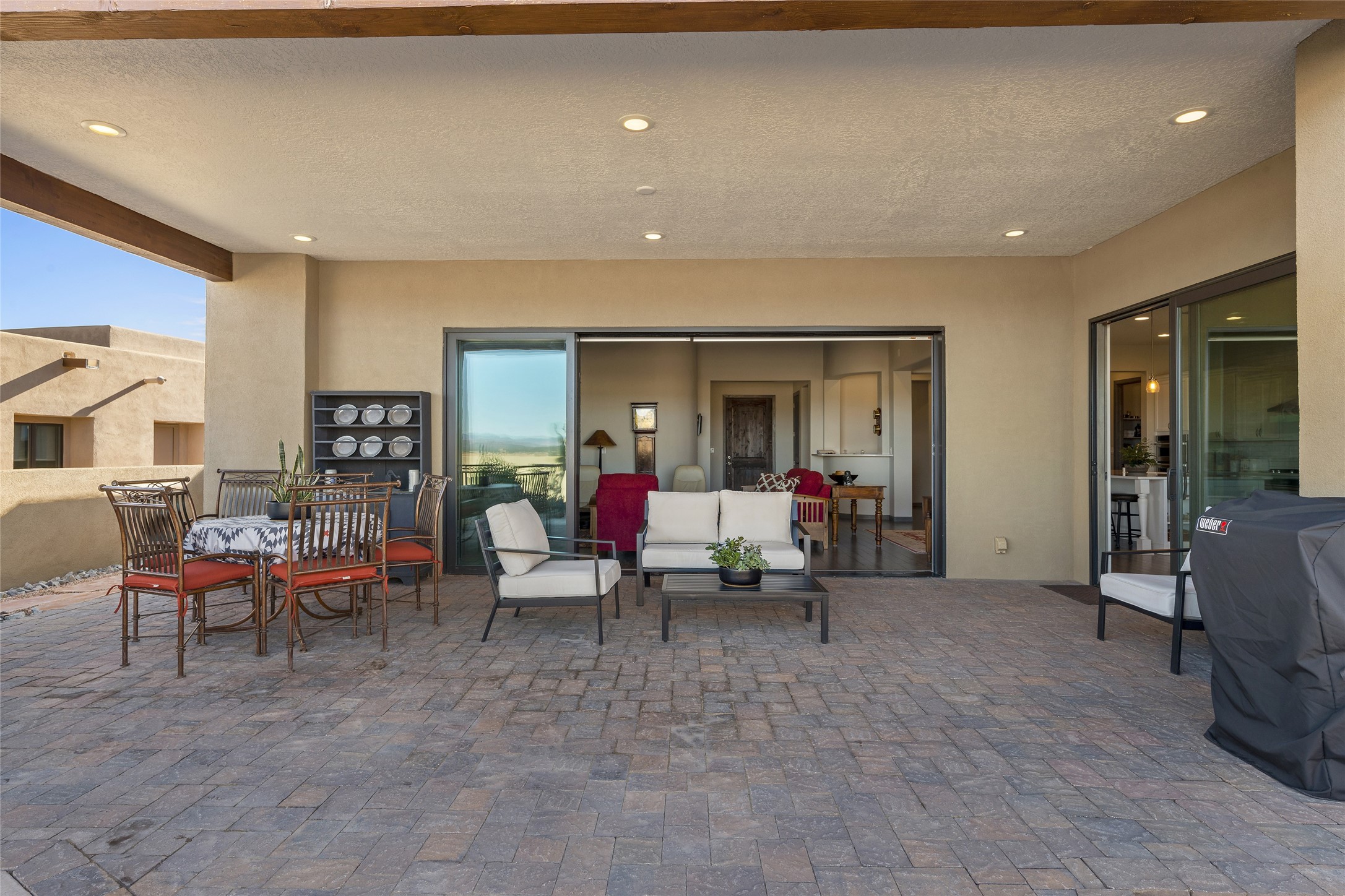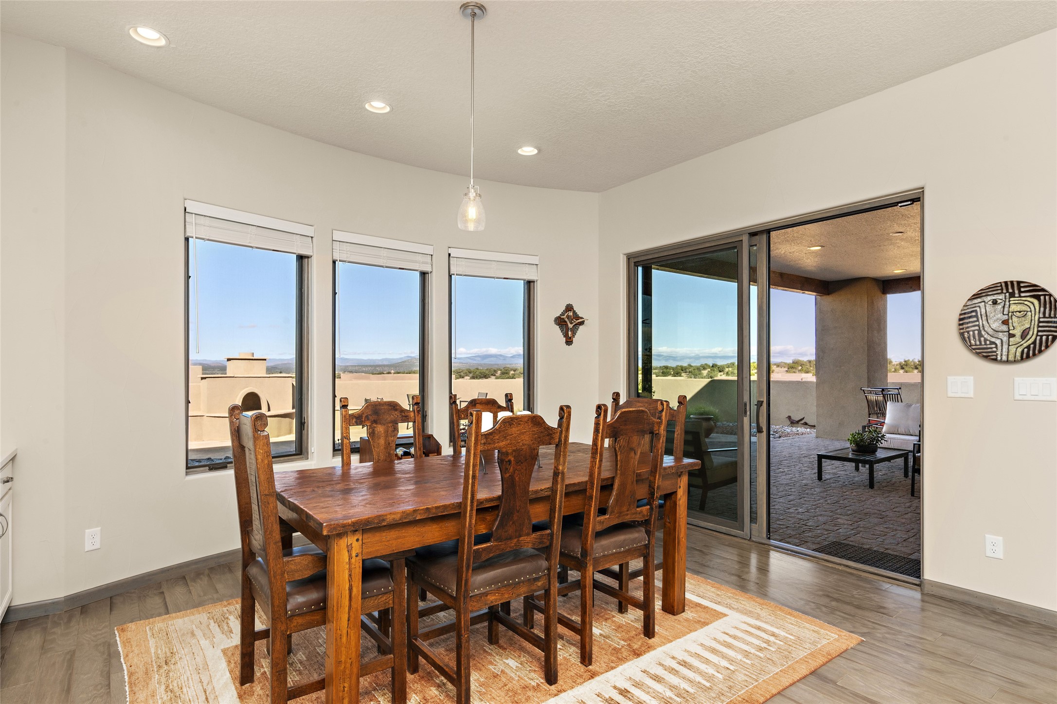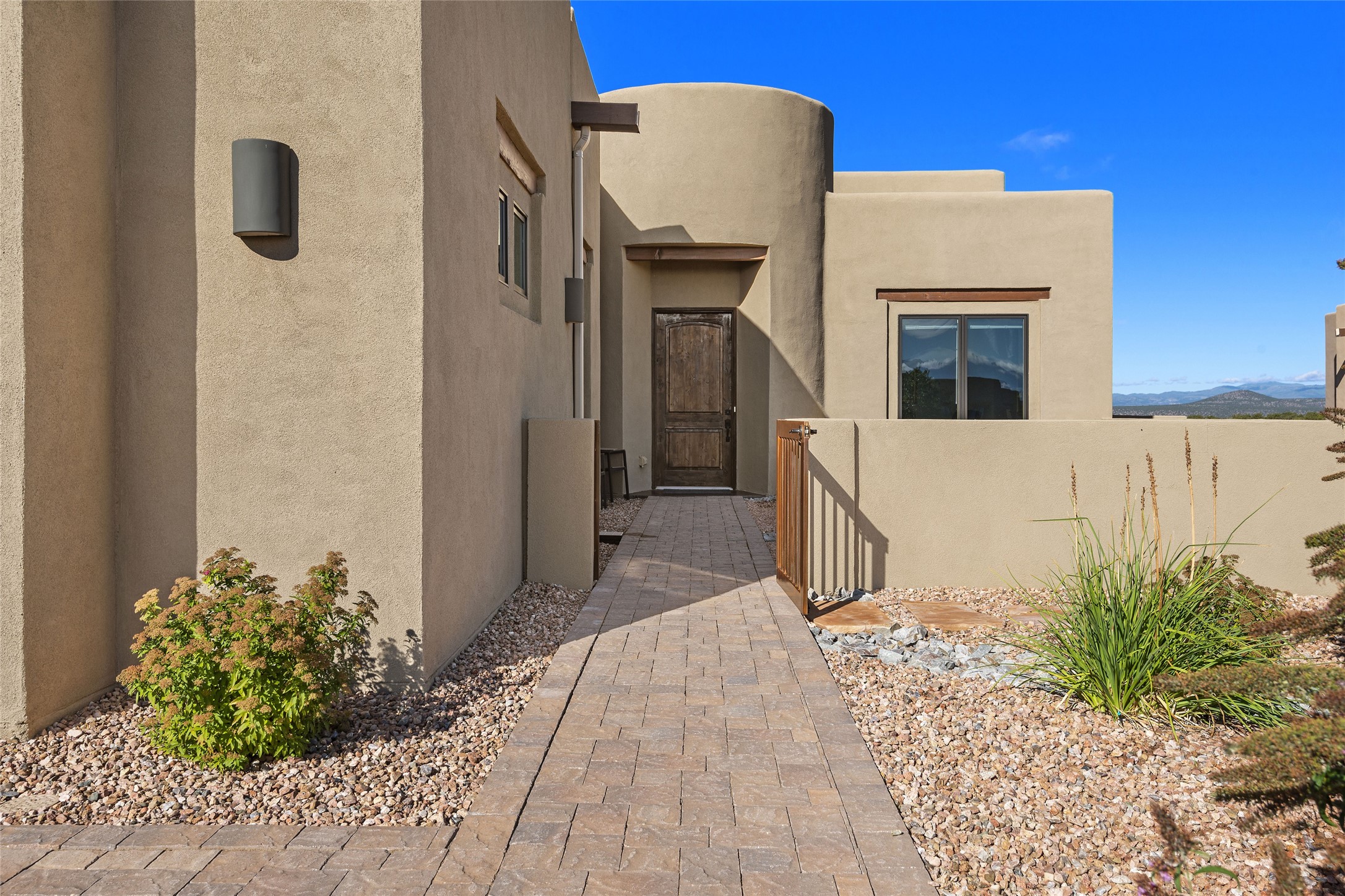 Built in 2019 in the Las Terrazas enclave, the home is a Courtside contemporary plan and has stunning views of the Jemez Mountains. This beautifully maintained 3529 sq. ft. residence offers an open floor plan ideal for entertaining with light-filled living, dining and kitchen areas; wet bar; office/media room; three bedrooms each ensuite and 3-car garage. Retracting sliding glass doors frame the mountain view and connect the living and dining areas to a generous portal for enjoying the amazing Santa Fe sunsets, a walled-in patio and Kiva fireplace. A spacious Chef's kitchen is anchored by a large center island with caf seating and a Butler's Pantry. Appliances include a KitchenAid package with gas cooktop and two gas ovens, two dishwashers and wine cooler. The luxurious Owner's Suite features a coffered ceiling, retreat area, a spa-like bath area and large closets. Seller's upgrades include ceiling beams; crown molding; quartz counter tops; pre-wiring for surround sound; hardwood, tile and carpet floors; a Smarthome System; 220-volt 50-amp circuit in the third garage and a Home Team Pest Control Injection System. The home is fully landscaped with drip irrigation and has been Certified Silver in the Build Green New Mexico Program. Memberships to the Club at Las Campanas are optional and can be purchased upon approval. The Club at Las Campanas offers two Signature Jack Nicklaus Golf Courses, Hacienda Clubhouse, Spa & Fitness Center, indoor and outdoor pools, pickleball, tennis, Log Cabin dining and a world-class Equestrian Center. 18 Minutes to the Historical Plaza and Santa Fe Airport, this property is priced well and will be move-in ready in early October.