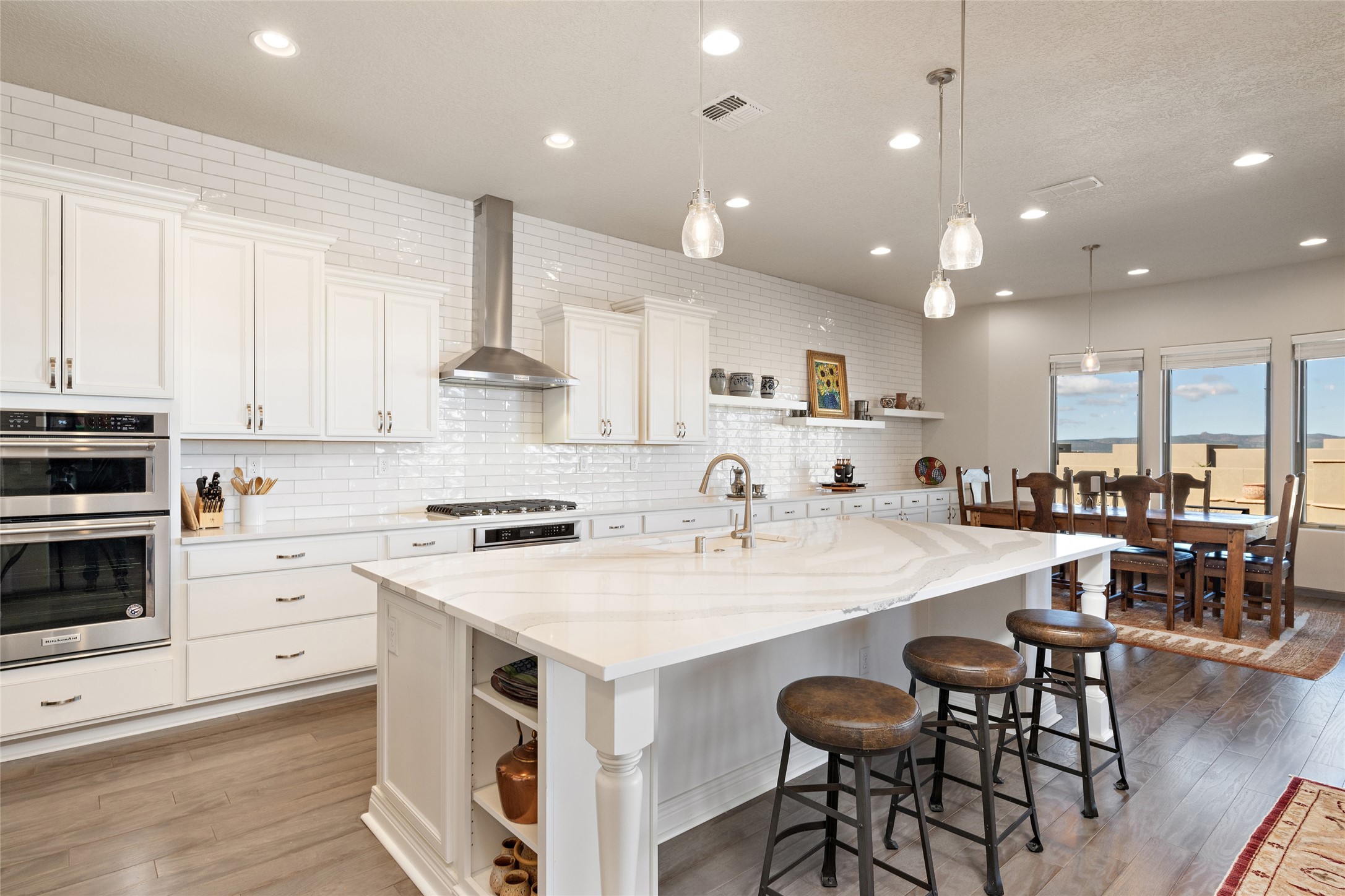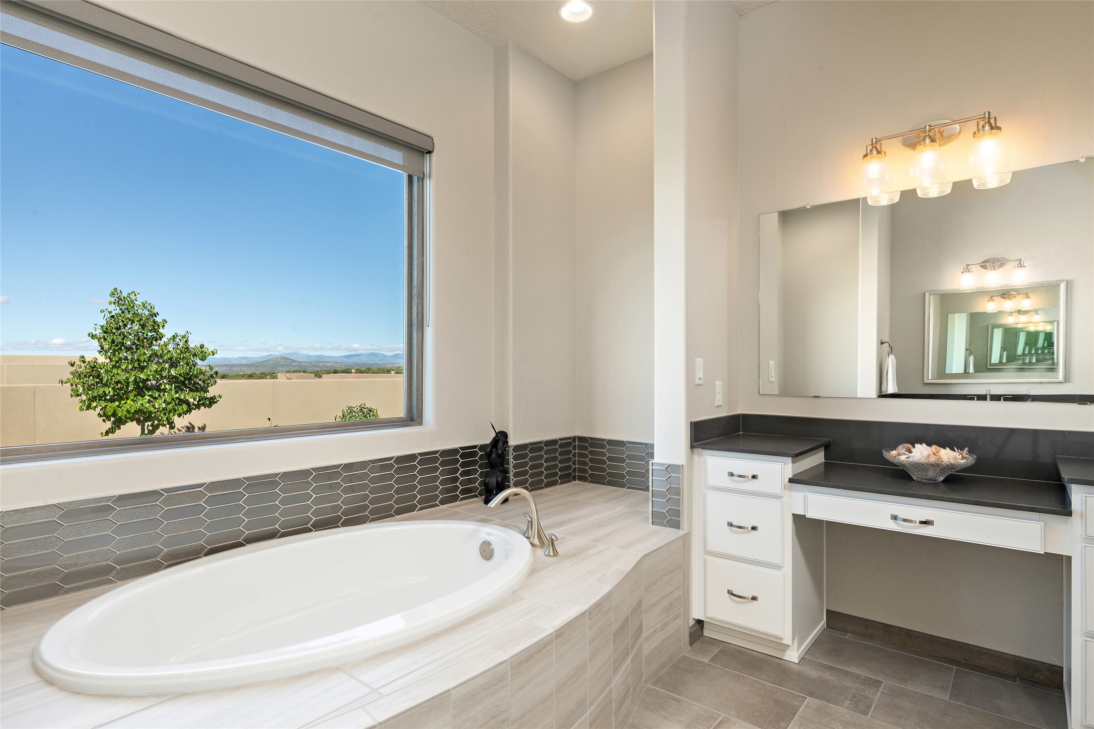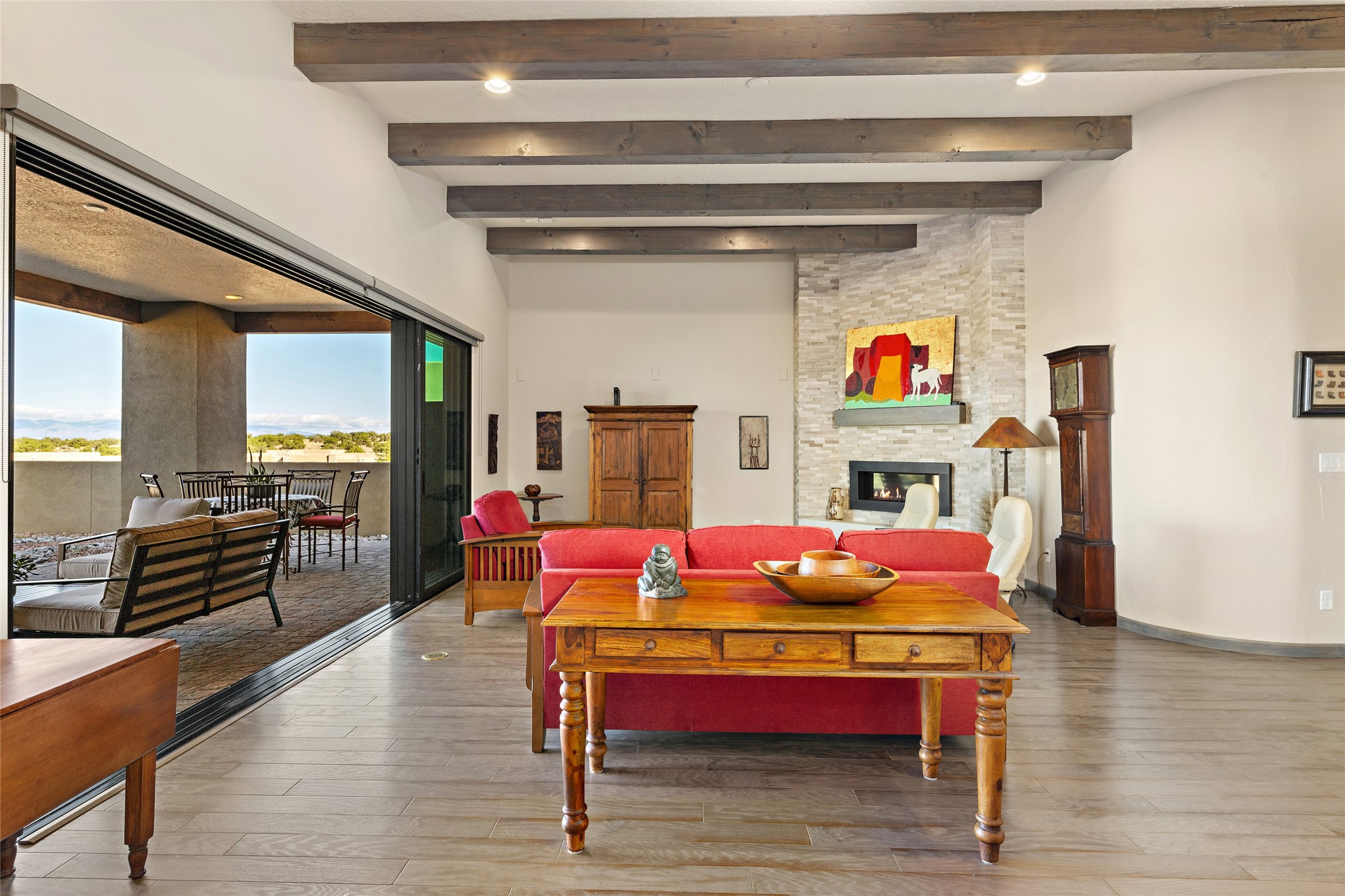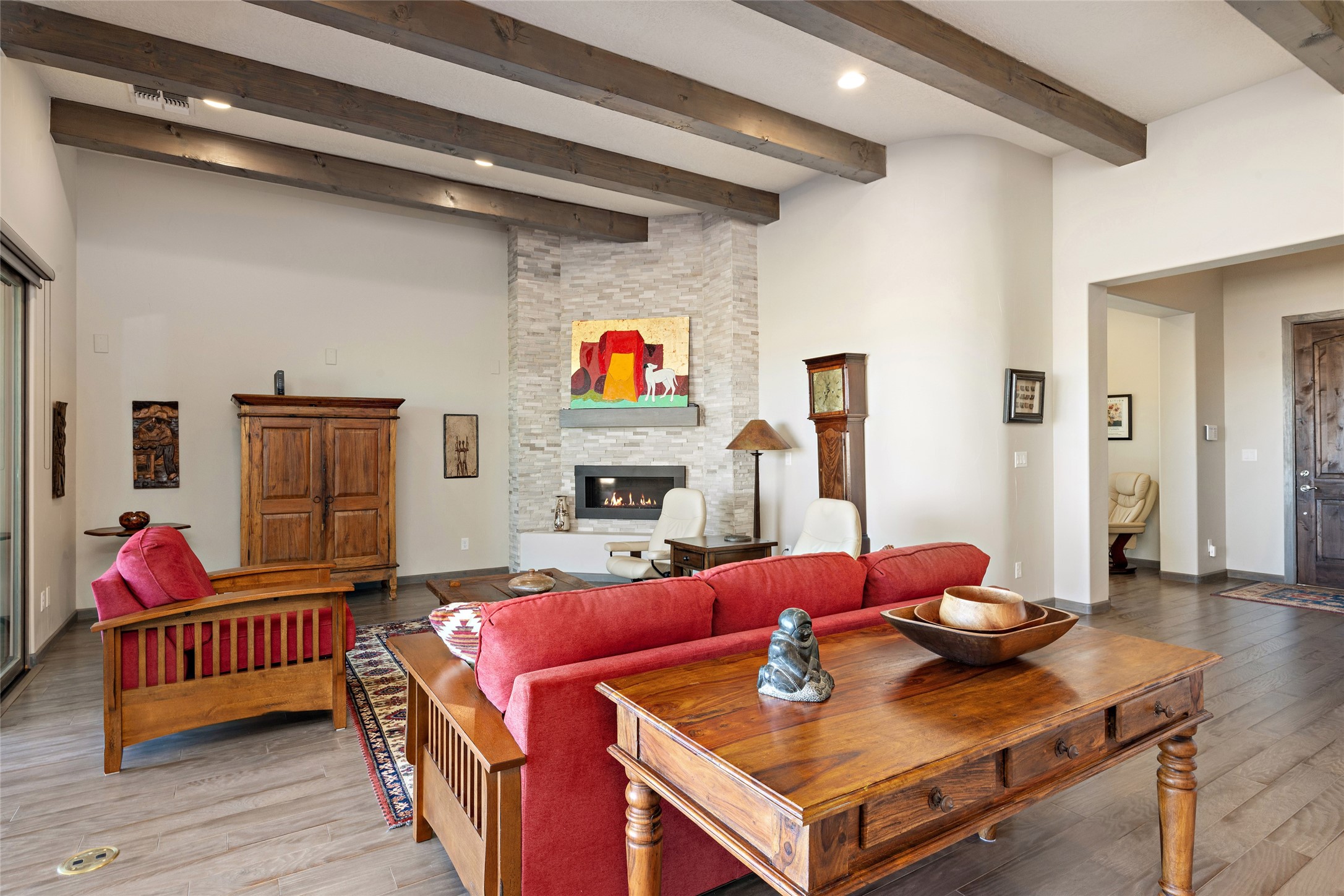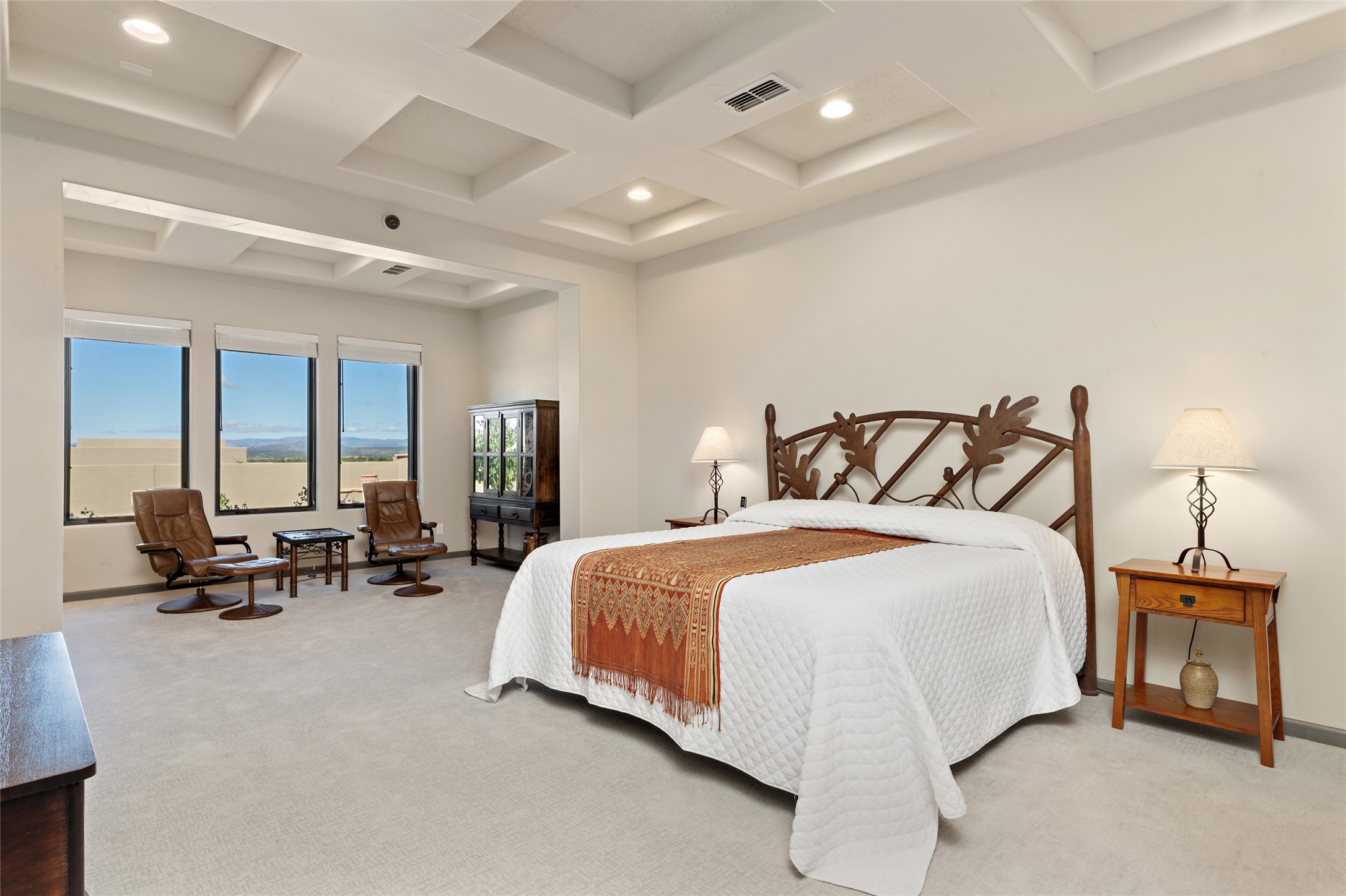 Built in 2019 in the Las Terrazas enclave, the home is a Courtside contemporary plan and has stunning views of the Jemez Mountains. This beautifully maintained 3529 sq. ft. residence offers an open floor plan ideal for entertaining with light-filled living, dining and kitchen areas; wet bar; office/media room; three bedrooms each ensuite and 3-car garage. Retracting sliding glass doors frame the mountain view and connect the living and dining areas to a generous portal for enjoying the amazing Santa Fe sunsets, a walled-in patio and Kiva fireplace. A spacious Chef's kitchen is anchored by a large center island with caf seating and a Butler's Pantry. Appliances include a KitchenAid package with gas cooktop and two gas ovens, two dishwashers and wine cooler. The luxurious Owner's Suite features a coffered ceiling, retreat area, a spa-like bath area and large closets. Seller's upgrades include ceiling beams; crown molding; quartz counter tops; pre-wiring for surround sound; hardwood, tile and carpet floors; a Smarthome System; 220-volt 50-amp circuit in the third garage and a Home Team Pest Control Injection System. The home is fully landscaped with drip irrigation and has been Certified Silver in the Build Green New Mexico Program. Memberships to the Club at Las Campanas are optional and can be purchased upon approval. The Club at Las Campanas offers two Signature Jack Nicklaus Golf Courses, Hacienda Clubhouse, Spa & Fitness Center, indoor and outdoor pools, pickleball, tennis, Log Cabin dining and a world-class Equestrian Center. 18 Minutes to the Historical Plaza and Santa Fe Airport, this property is priced well and will be move-in ready in early October.