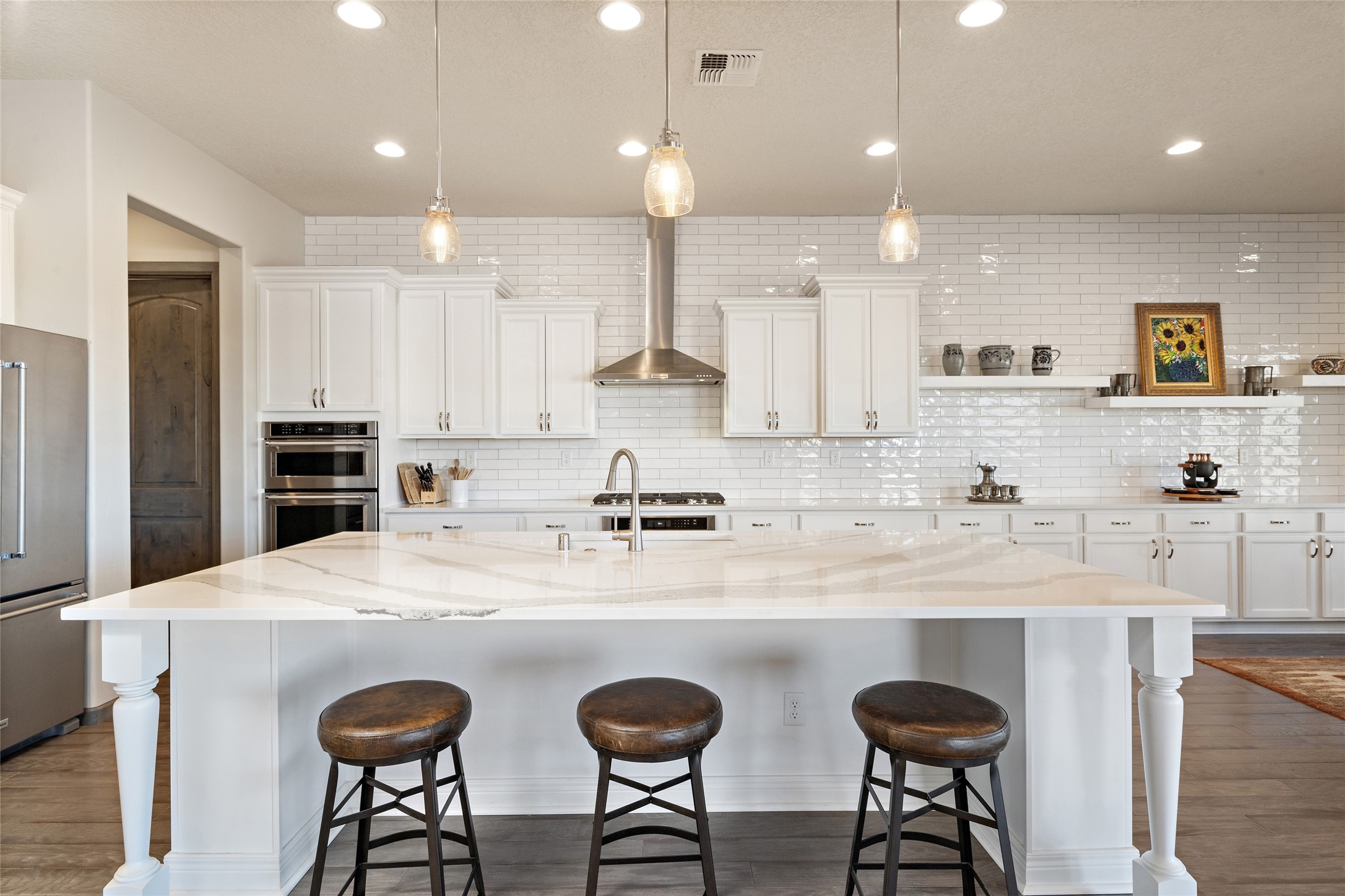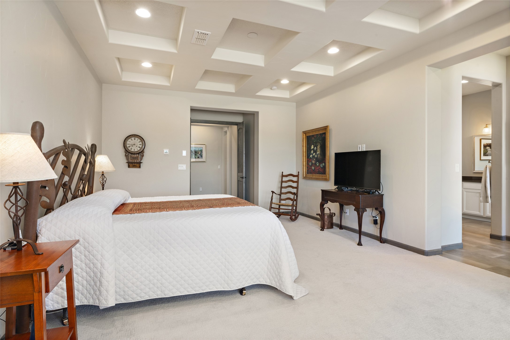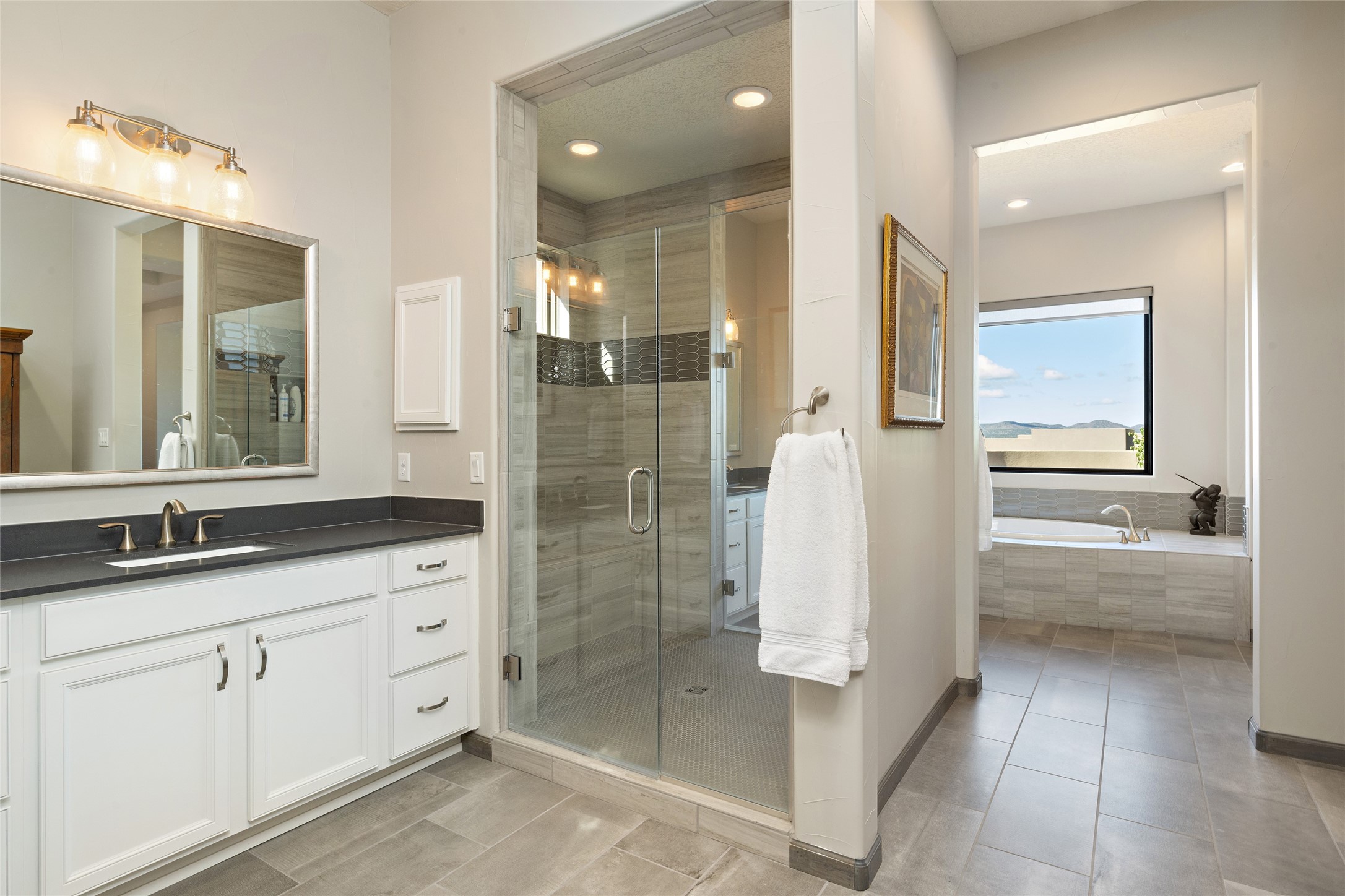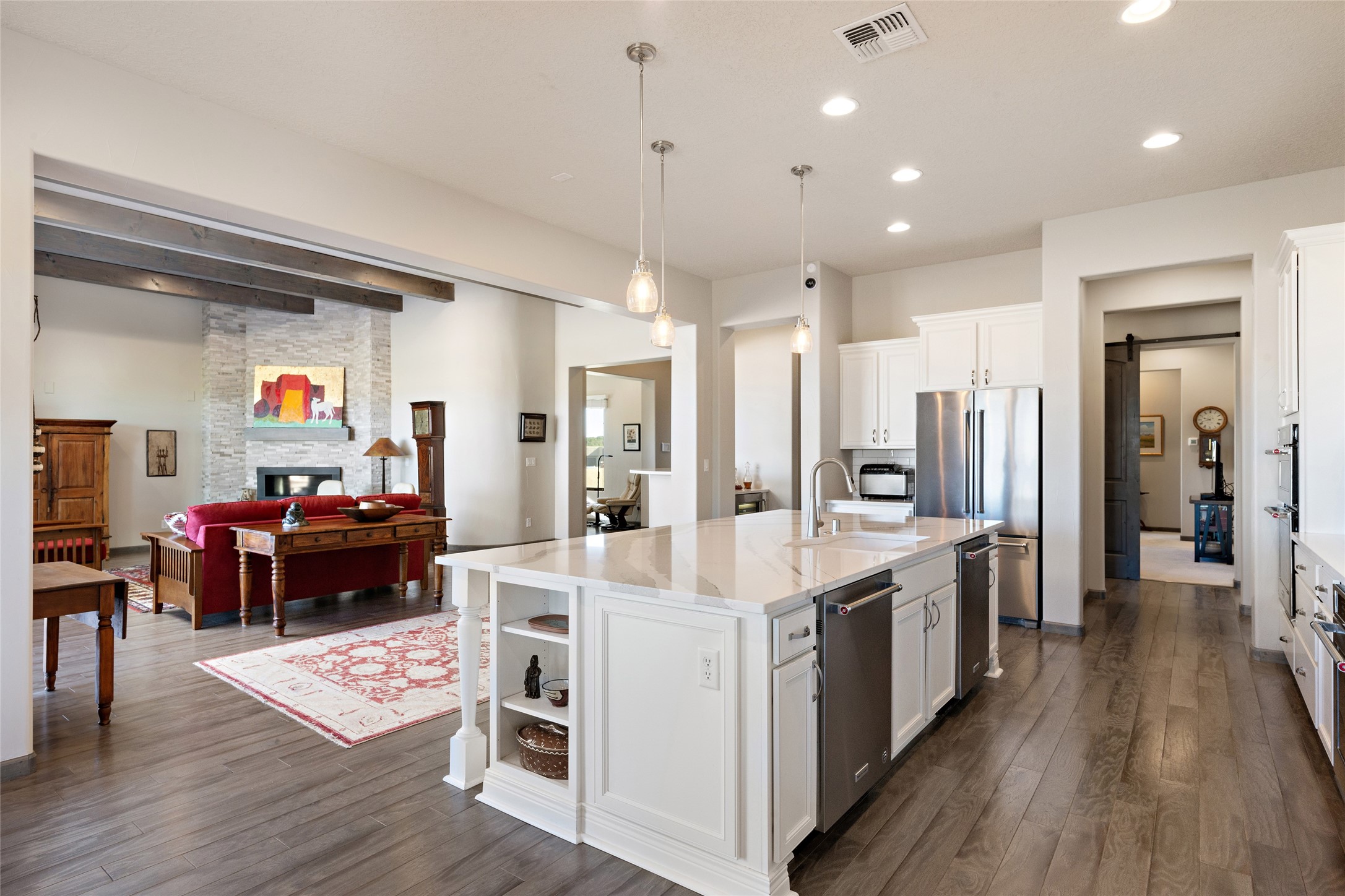 Built in 2019 in the Las Terrazas enclave, the home is a Courtside contemporary plan and has stunning views of the Jemez Mountains. This beautifully maintained 3529 sq. ft. residence offers an open floor plan ideal for entertaining with light-filled living, dining and kitchen areas; wet bar; office/media room; three bedrooms each ensuite and 3-car garage. Retracting sliding glass doors frame the mountain view and connect the living and dining areas to a generous portal for enjoying the amazing Santa Fe sunsets, a walled-in patio and Kiva fireplace. A spacious Chef's kitchen is anchored by a large center island with caf seating and a Butler's Pantry. Appliances include a KitchenAid package with gas cooktop and two gas ovens, two dishwashers and wine cooler. The luxurious Owner's Suite features a coffered ceiling, retreat area, a spa-like bath area and large closets. Seller's upgrades include ceiling beams; crown molding; quartz counter tops; pre-wiring for surround sound; hardwood, tile and carpet floors; a Smarthome System; 220-volt 50-amp circuit in the third garage and a Home Team Pest Control Injection System. The home is fully landscaped with drip irrigation and has been Certified Silver in the Build Green New Mexico Program. Memberships to the Club at Las Campanas are optional and can be purchased upon approval. The Club at Las Campanas offers two Signature Jack Nicklaus Golf Courses, Hacienda Clubhouse, Spa & Fitness Center, indoor and outdoor pools, pickleball, tennis, Log Cabin dining and a world-class Equestrian Center. 18 Minutes to the Historical Plaza and Santa Fe Airport, this property is priced well and will be move-in ready in early October.