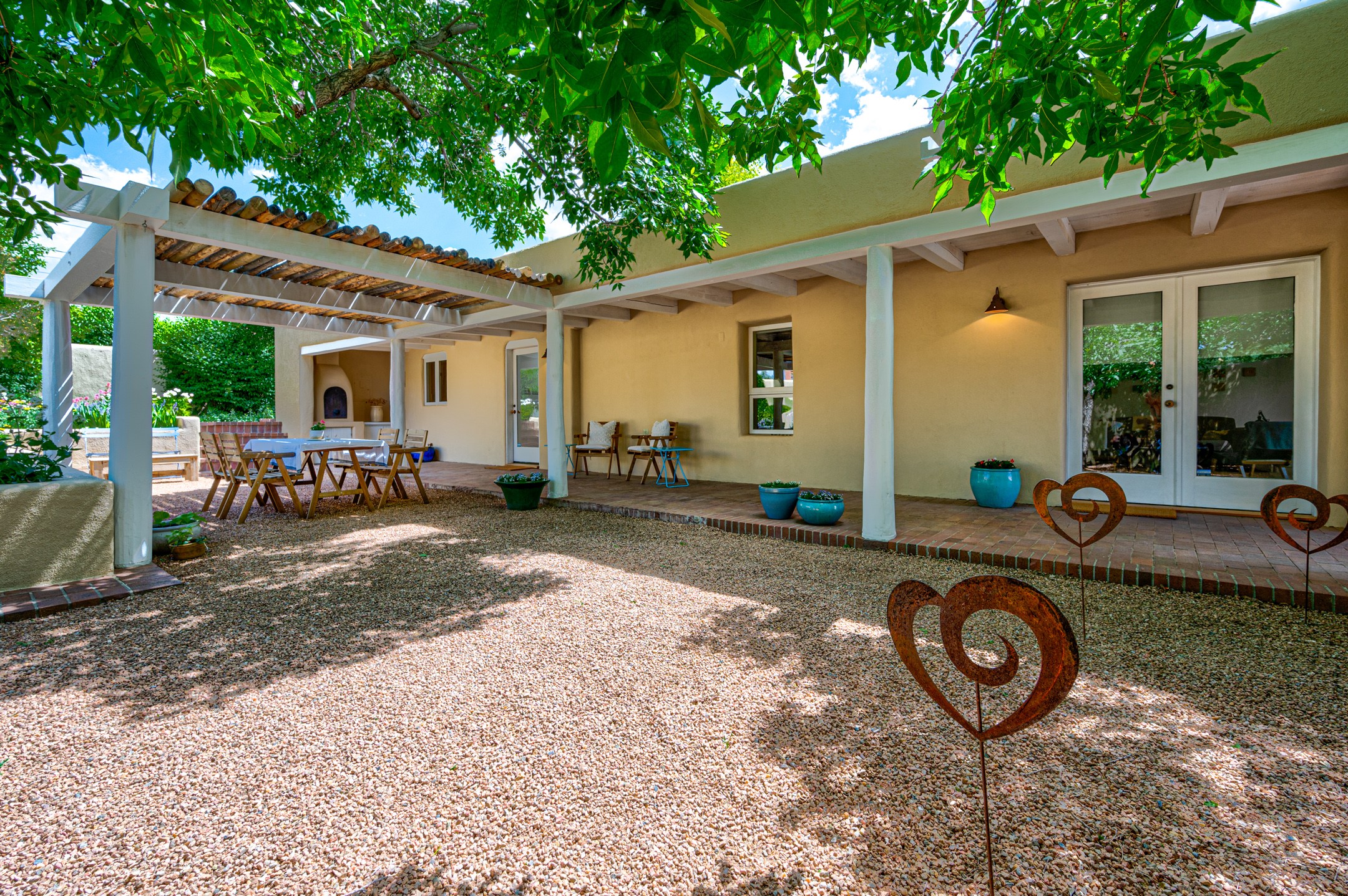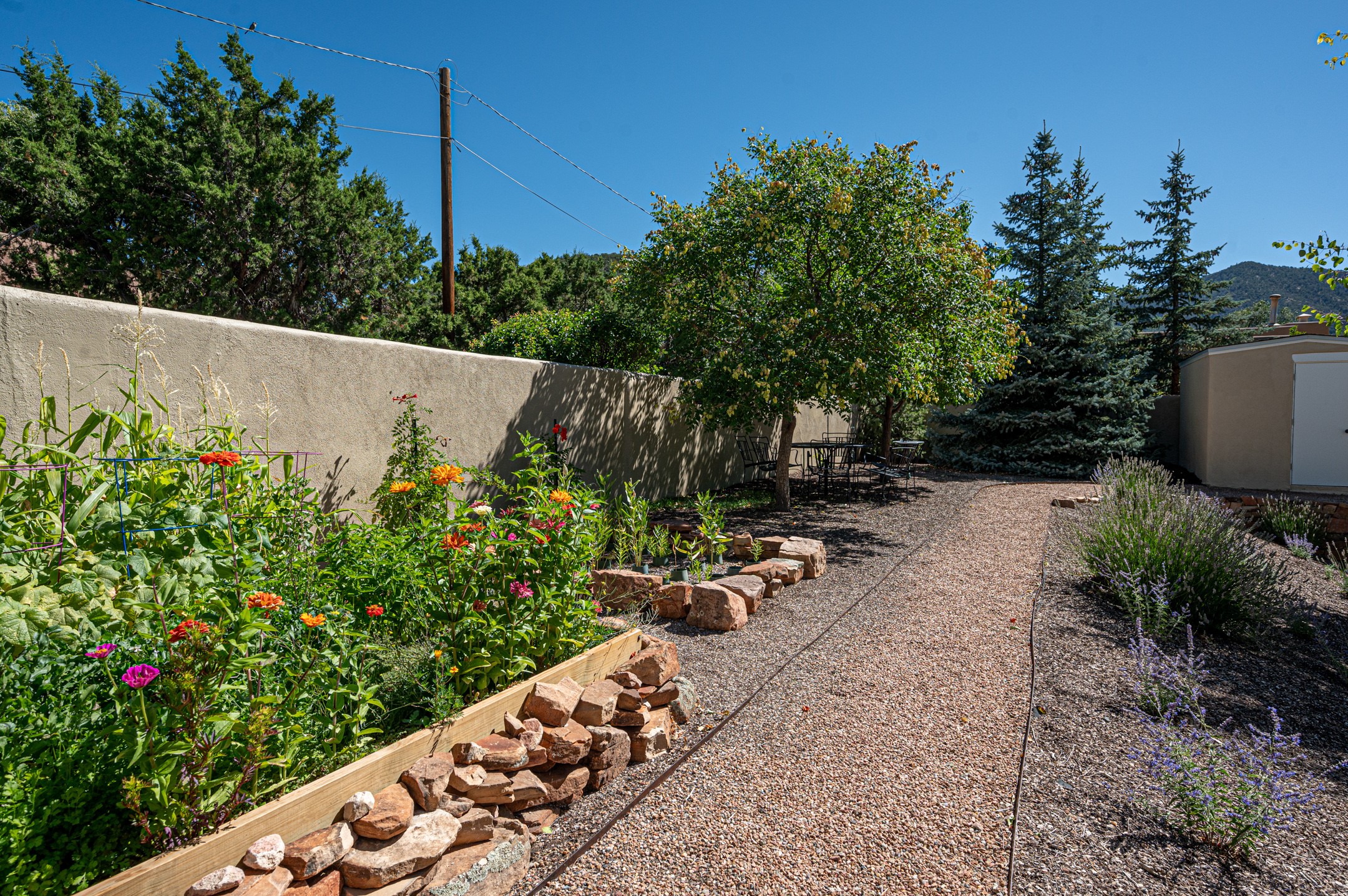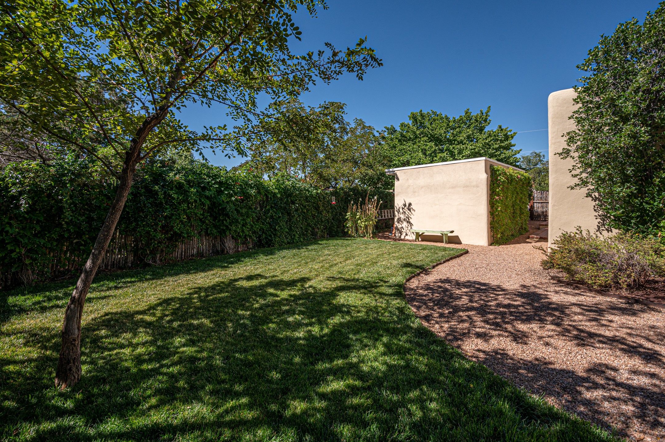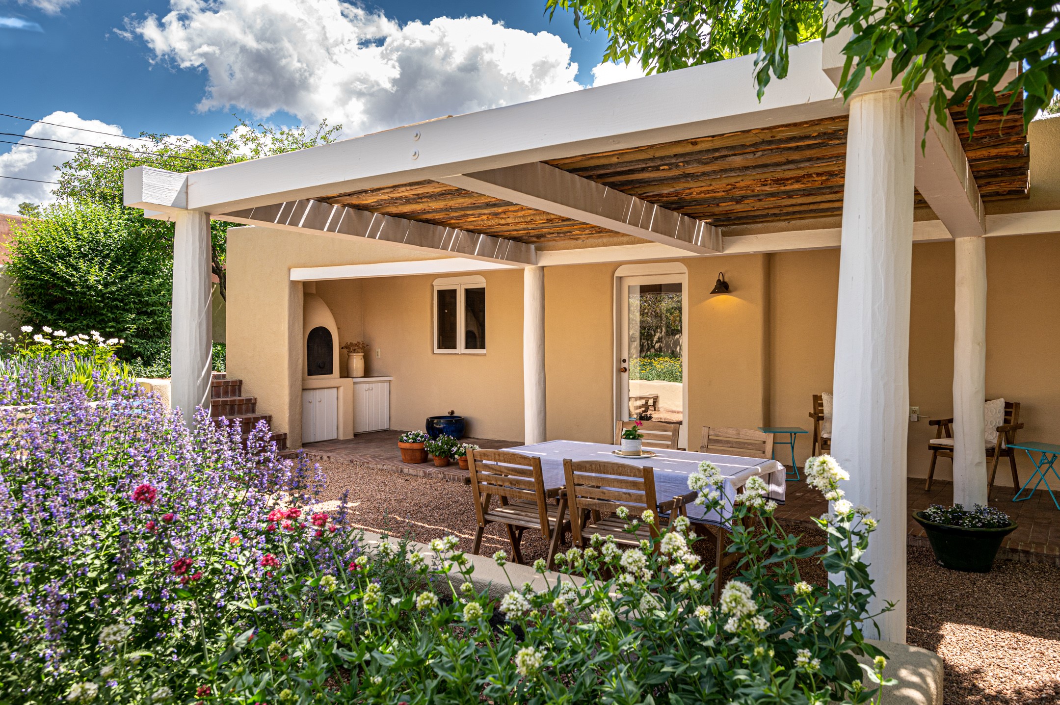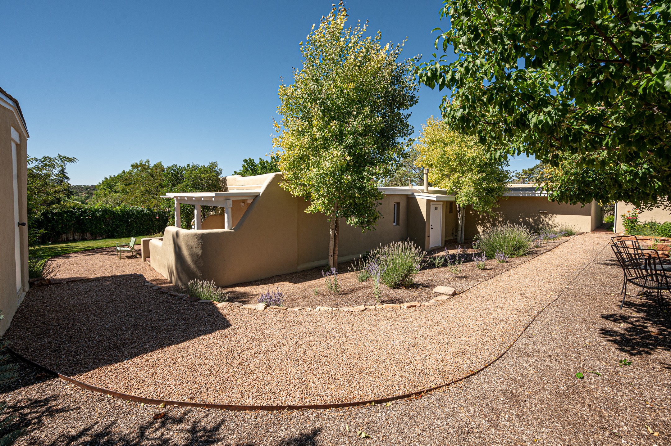 Serene and tranquil Historic Eastside hideaway. This mostly adobe dwelling, tucked among meandering gardens with views of Picacho Peak, sits unassumingly behind high walls and vintage wood doors. Unwind, entertain, work or create in intimate interior and exterior spaces. An eat-in kitchen--with great storage and Kitchenaid appliances--opens to the front west portal and courtyard. The primary bedroom opens to a cozy east portal. Bask in the natural and formerly pastoral surrounds while being close to town. Enclosed property. No indoor steps. Mature trees: aspens, pion, apple, apricot, cherry, ornamental pear and a spectacular blue spruce. Irrigation system. Four off-street parking spaces. Two free-standing exterior stucco buildings on slab foundations can be used for workshops or storage. Walk to Canyon Road, downtown, quiet river trails and Patrick Smith, Cerro Gordo and the Water History parks. Nearby hiking, walking, wildlife watching and birding: The Nature Conservancy's 525-acre Santa Fe Canyon Preserve and trails, The Randall Davey Audubon Center and Dale Ball trails.