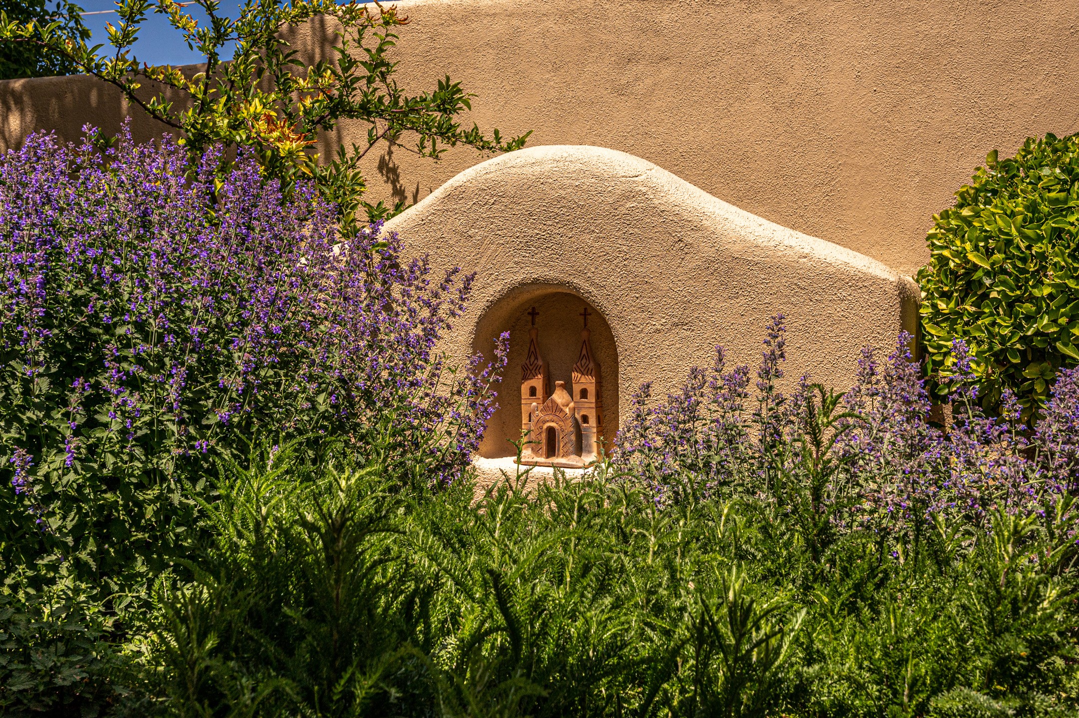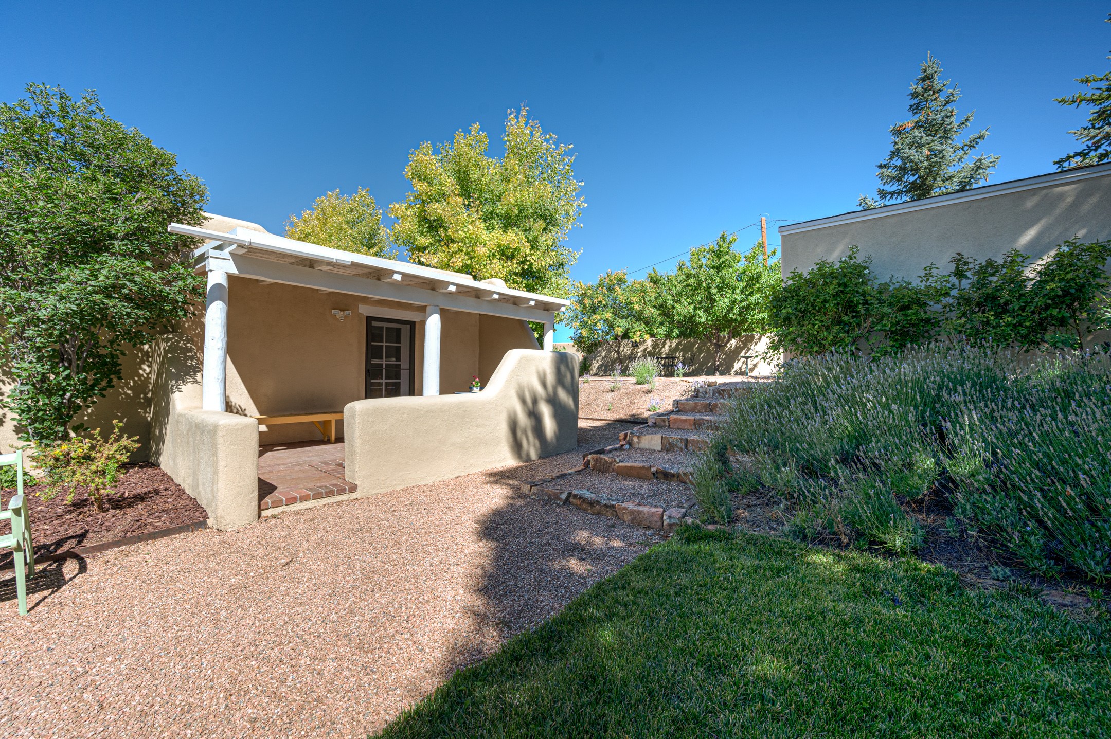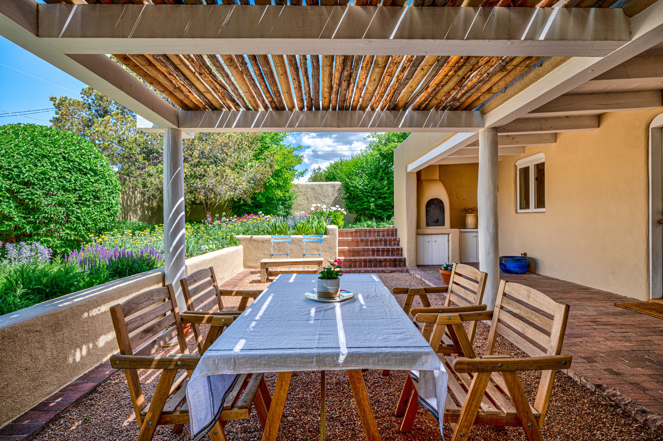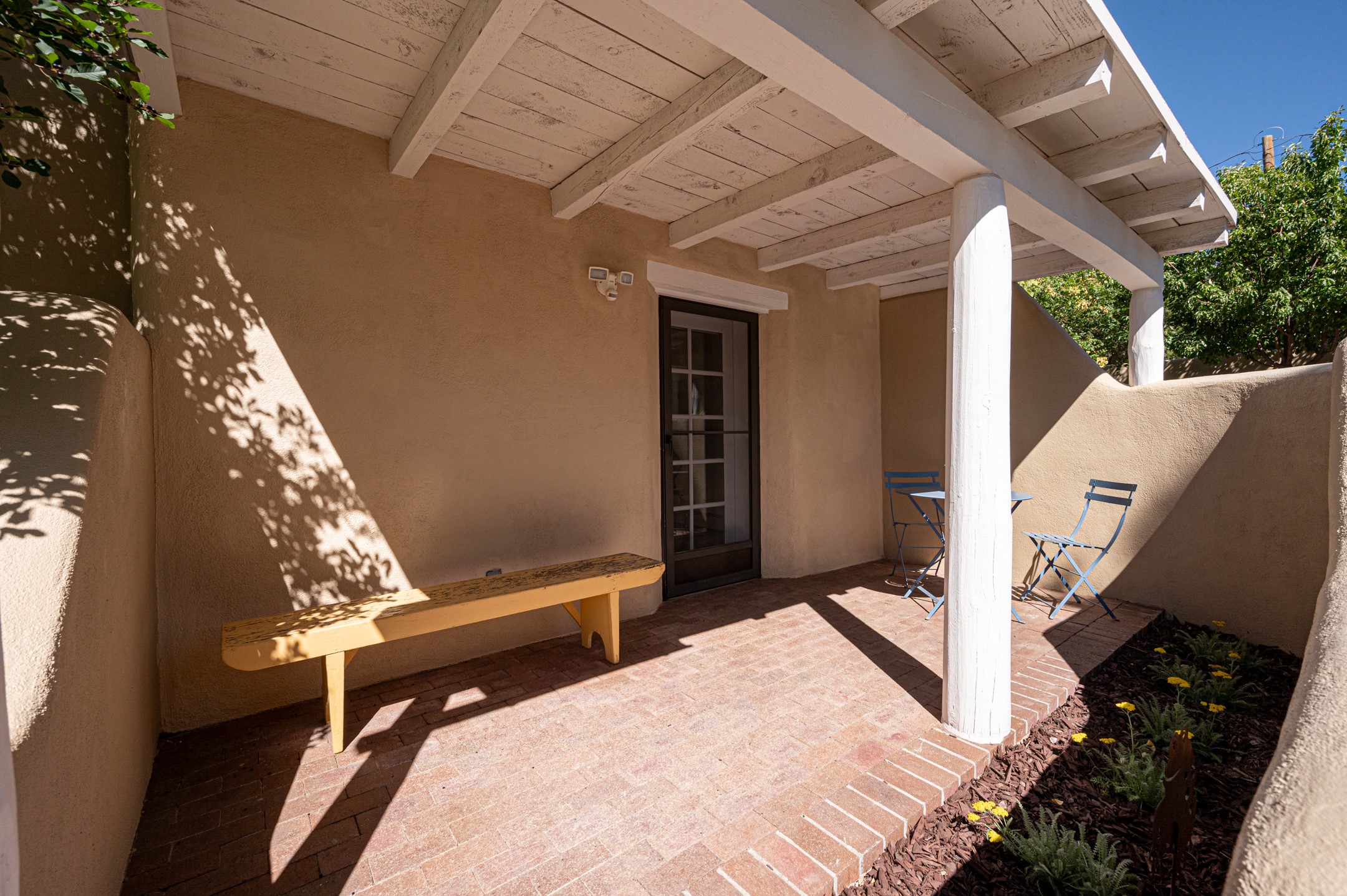 Serene and tranquil Historic Eastside hideaway. This mostly adobe dwelling, tucked among meandering gardens with views of Picacho Peak, sits unassumingly behind high walls and vintage wood doors. Unwind, entertain, work or create in intimate interior and exterior spaces. An eat-in kitchen--with great storage and Kitchenaid appliances--opens to the front west portal and courtyard. The primary bedroom opens to a cozy east portal. Bask in the natural and formerly pastoral surrounds while being close to town. Enclosed property. No indoor steps. Mature trees: aspens, pion, apple, apricot, cherry, ornamental pear and a spectacular blue spruce. Irrigation system. Four off-street parking spaces. Two free-standing exterior stucco buildings on slab foundations can be used for workshops or storage. Walk to Canyon Road, downtown, quiet river trails and Patrick Smith, Cerro Gordo and the Water History parks. Nearby hiking, walking, wildlife watching and birding: The Nature Conservancy's 525-acre Santa Fe Canyon Preserve and trails, The Randall Davey Audubon Center and Dale Ball trails.
