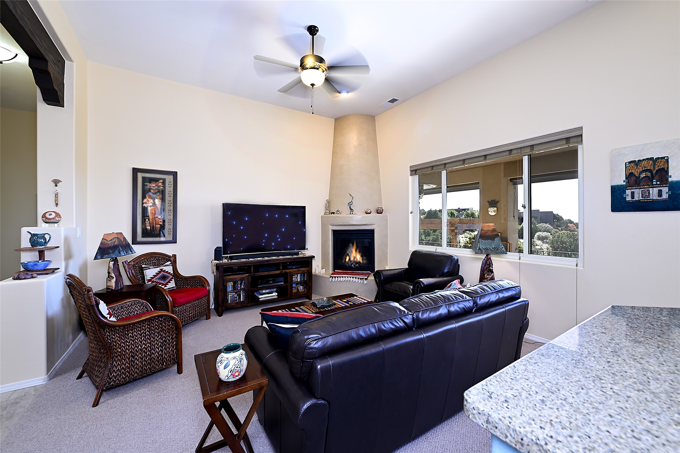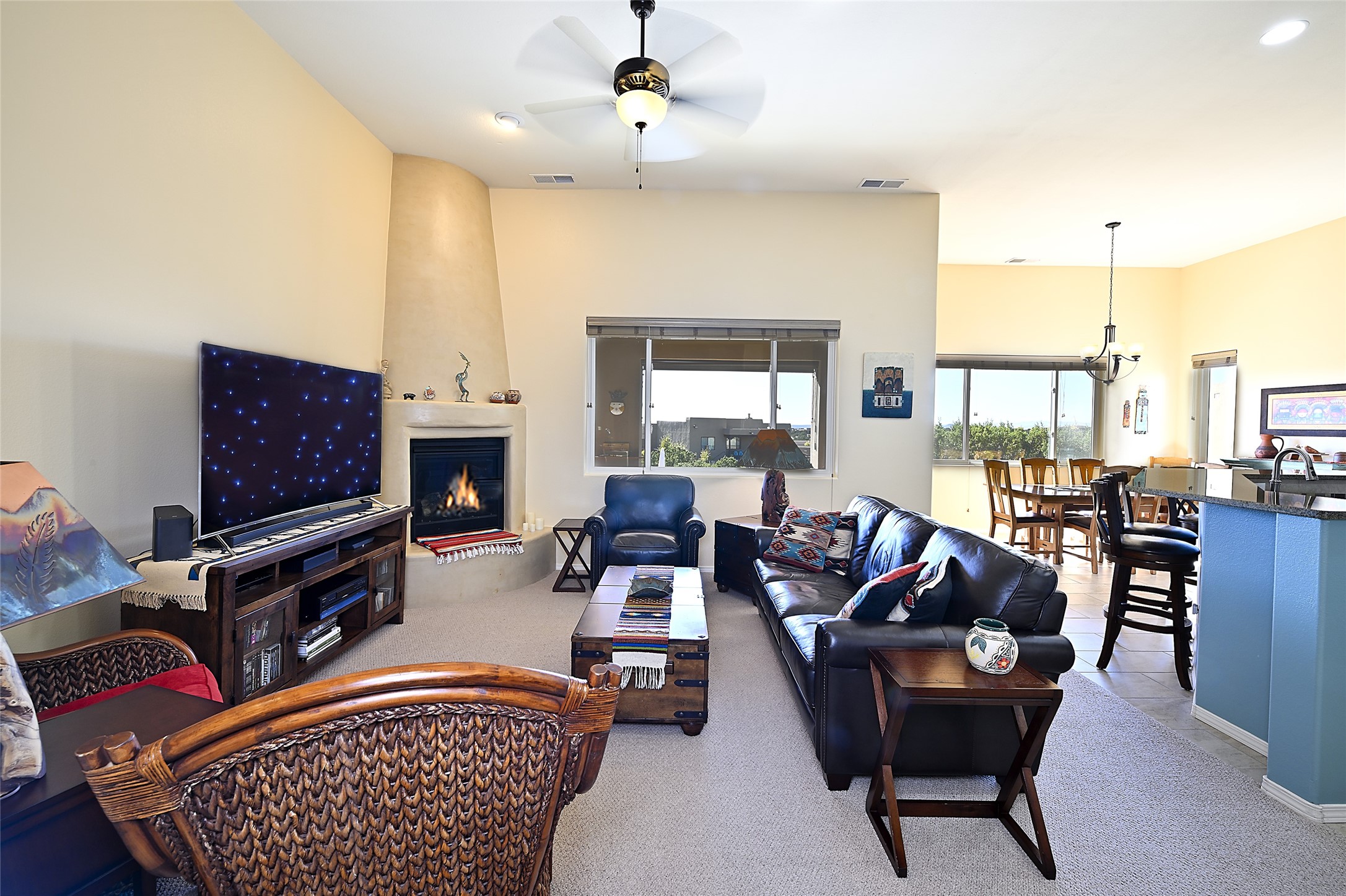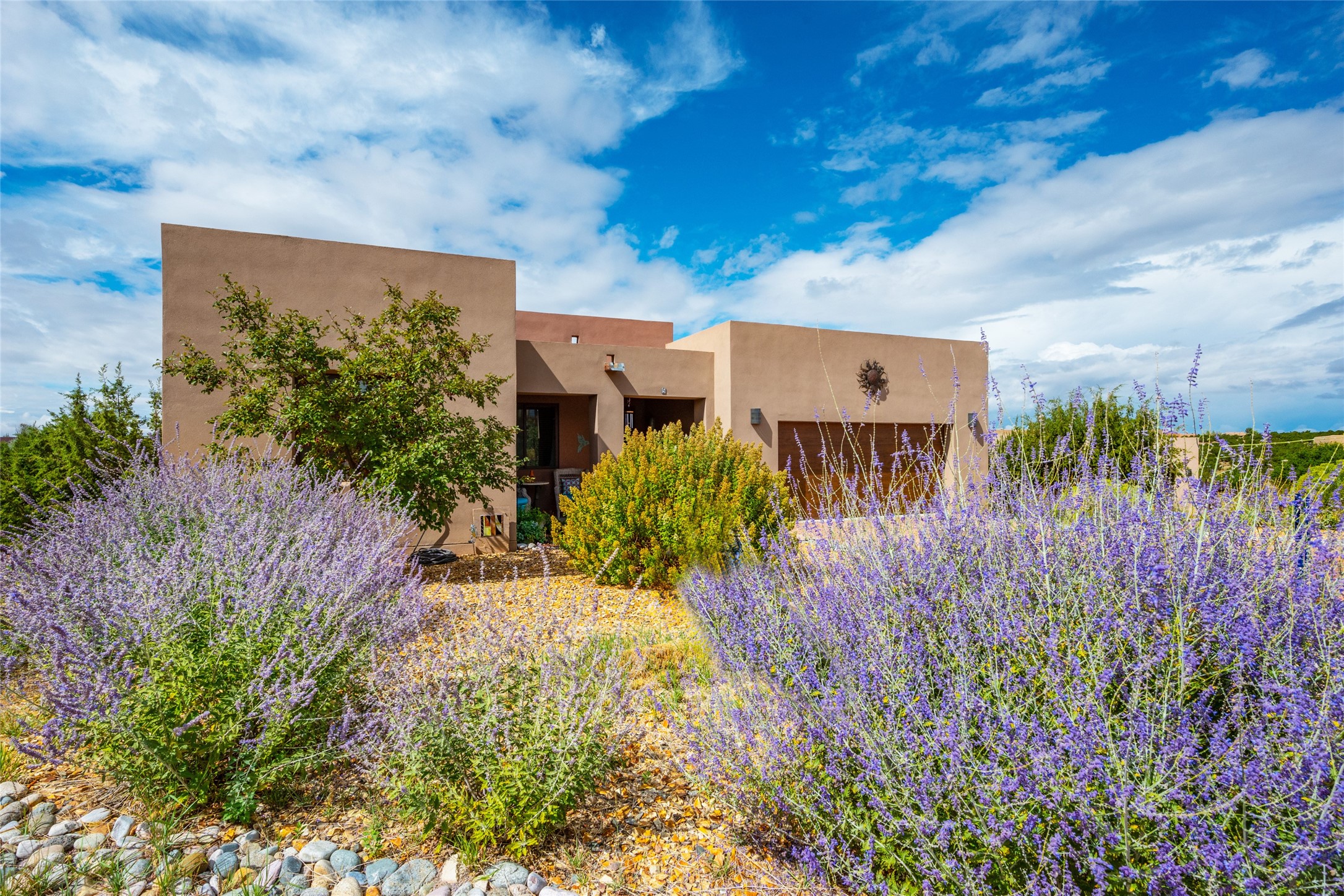 3 bedroom 2.5 bath contemporary Pueblo home in Tessera with captivating mountain views. Open concept living and dining with high ceilings and a gas kiva fireplace. Kitchen is appointed with upgraded appliances, granite countertops, under cabinet lighting, a spacious pantry and a breakfast bar with room for four. Third bedroom offers flex space as a media room, studio or office. Large, two-level flagstone patio plus gazebo are ideal for outdoor dining and entertaining under the star-dotted New Mexican skies. 2-car attached garage. Green features include EnergyStar appliances, tankless hot water, and recirculating pump for hot water. The community of Tessera features mountain views, generous, dedicated open space and an extensive trail system. Conveniently located with close proximity to La Tierra Trails, public golf and just minutes from downtown Santa Fe with easy access to I-25.
