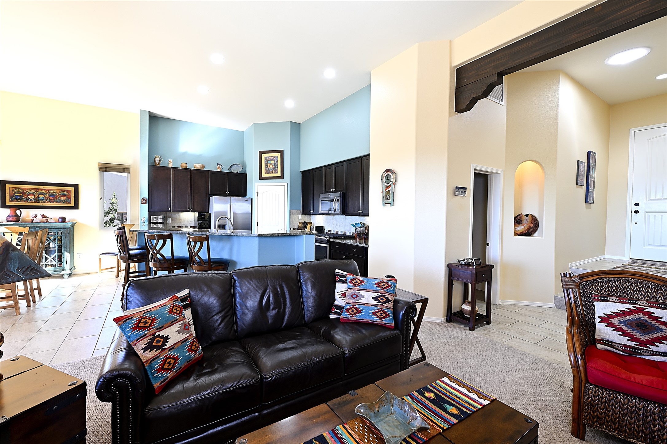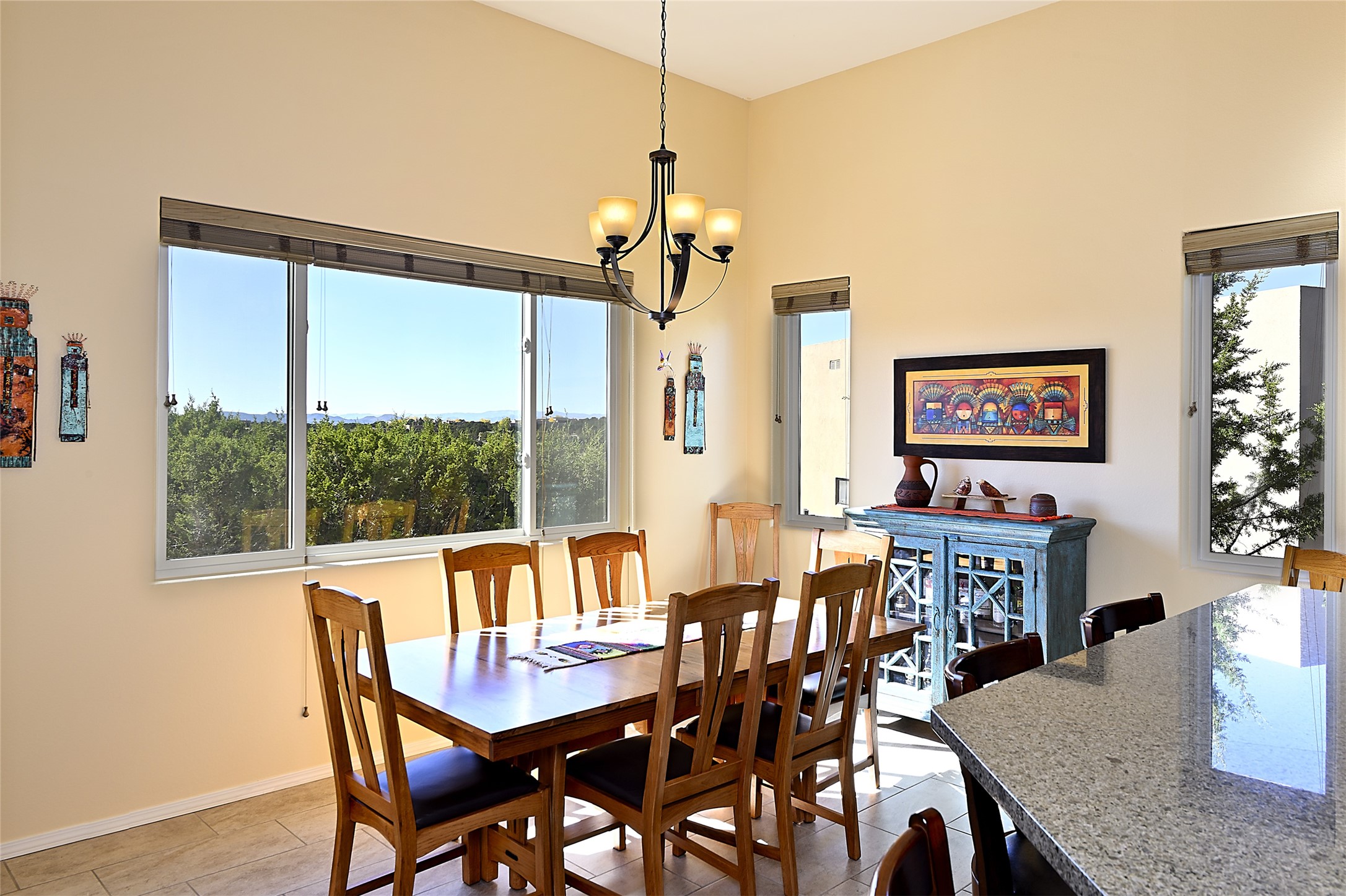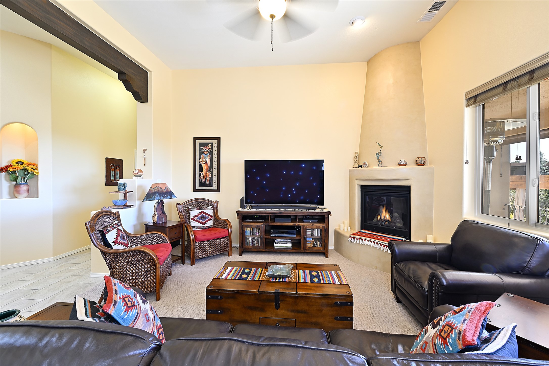 3 bedroom 2.5 bath contemporary Pueblo home in Tessera with captivating mountain views. Open concept living and dining with high ceilings and a gas kiva fireplace. Kitchen is appointed with upgraded appliances, granite countertops, under cabinet lighting, a spacious pantry and a breakfast bar with room for four. Third bedroom offers flex space as a media room, studio or office. Large, two-level flagstone patio plus gazebo are ideal for outdoor dining and entertaining under the star-dotted New Mexican skies. 2-car attached garage. Green features include EnergyStar appliances, tankless hot water, and recirculating pump for hot water. The community of Tessera features mountain views, generous, dedicated open space and an extensive trail system. Conveniently located with close proximity to La Tierra Trails, public golf and just minutes from downtown Santa Fe with easy access to I-25.