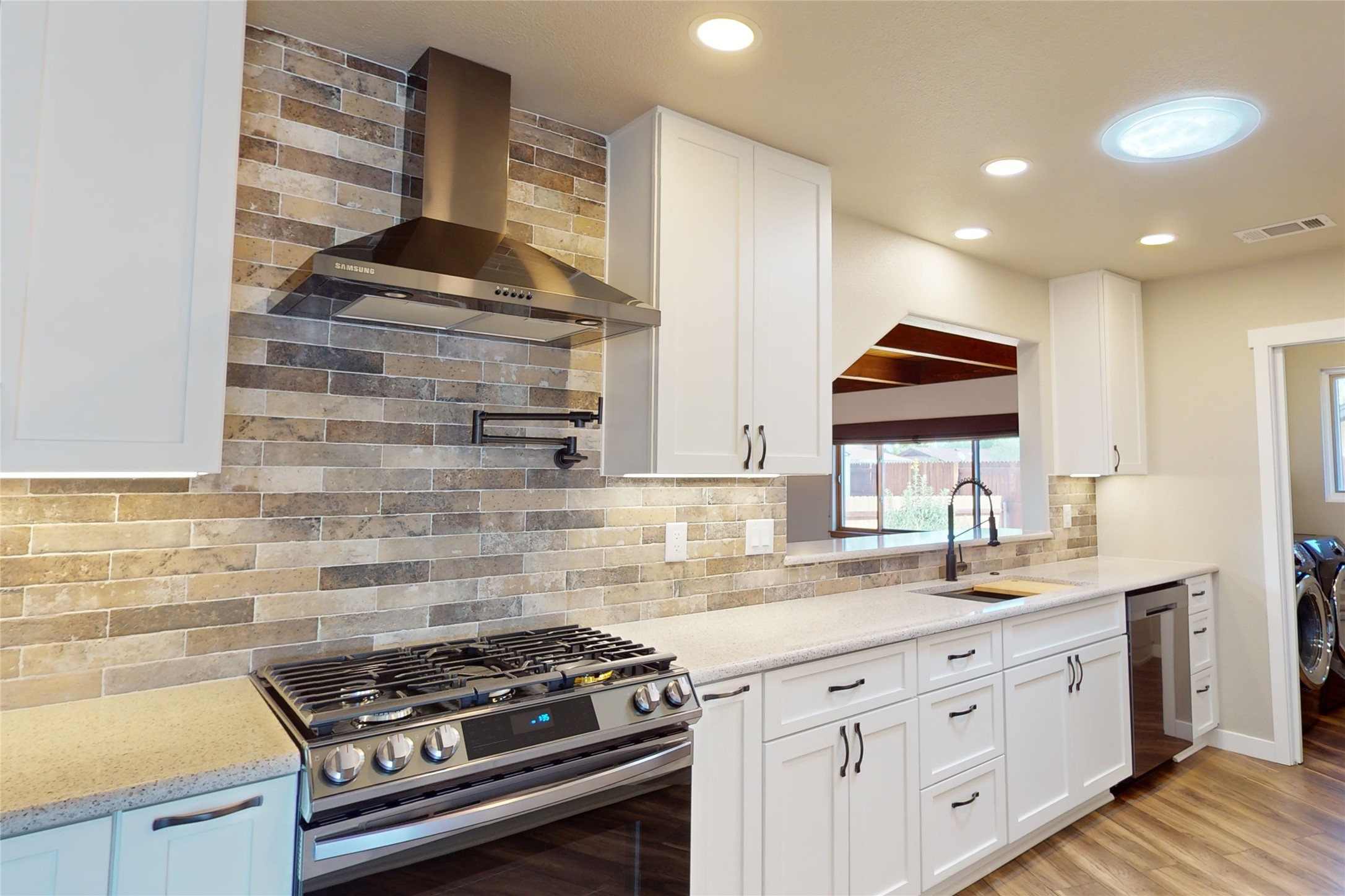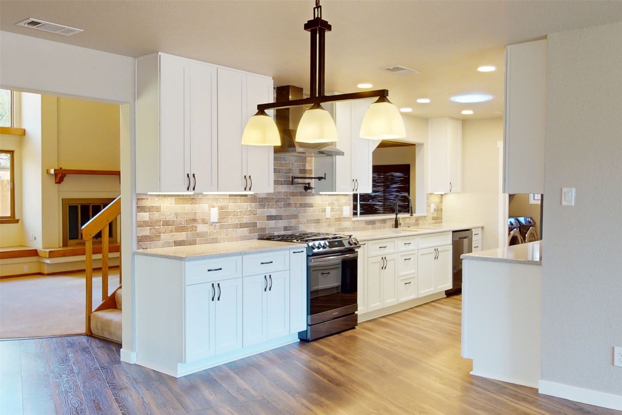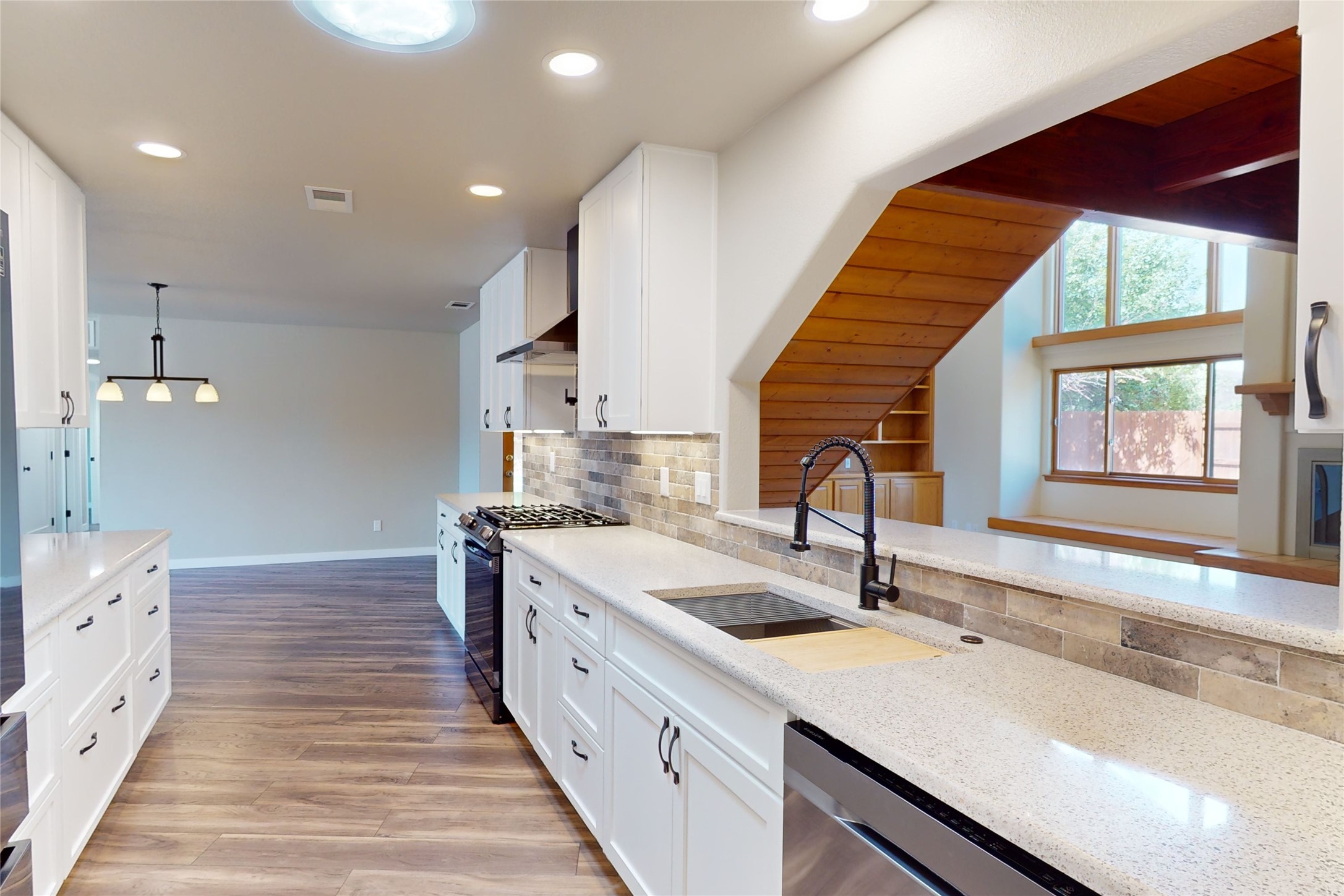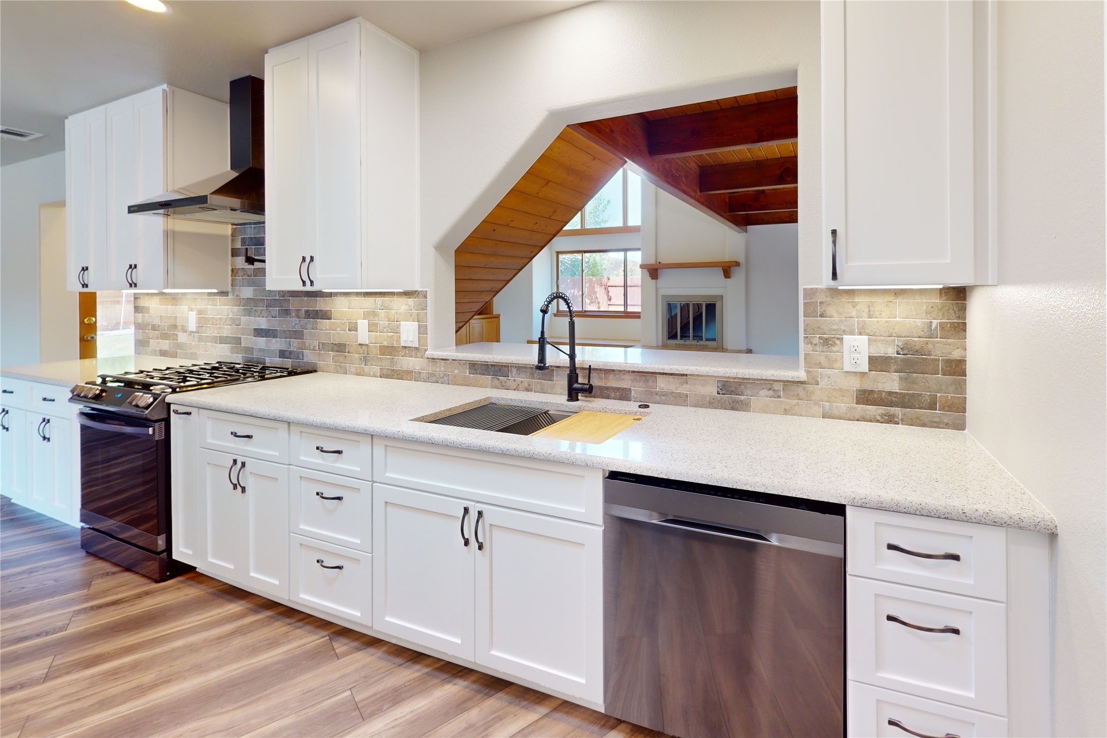 Beautifully updated home on a quiet street! This move-in ready home has three bedrooms plus a loft that could be a fourth bedroom, an office, a craft room or whatever will meet your needs. The home has two living spaces so there is ample space for everyone. The kitchen was remodeled in 2023 with new appliances, elegant 42-inch white shaker cabinets, quartz countertops, a convenient pot filler, undercabinet lighting and lots of space for work or storage. The kitchen, bedrooms, dining area and primary living room have been updated with new wood-look vinyl flooring installed at an angle for style and charm. Throughout the home there are bright skylights and large windows to add natural lighting. The first-floor primary bedroom features a stylishly updated bath with a curbless shower and a walk-in closet. The two guest bedrooms have nice sized closets with automated lighting and share a charming hall bathroom that has lovely tile work. The generously sized second living area has a cozy fireplace and built in bookshelves. There is lots of storage in the laundry with cabinets that match the kitchen and a new washer and dryer. The laundry room can be used as a mudroom when entering from the 2-car garage. Outside, the fenced yard provides a private retreat, complete with an apple tree and grapevines. Whether you prefer to barbecue on the patio or unwind in the hot tub, the outdoor space is designed for your enjoyment. This outstanding home provides comfort, convenience and style with updated features, lots of storage and splendid finishes.
