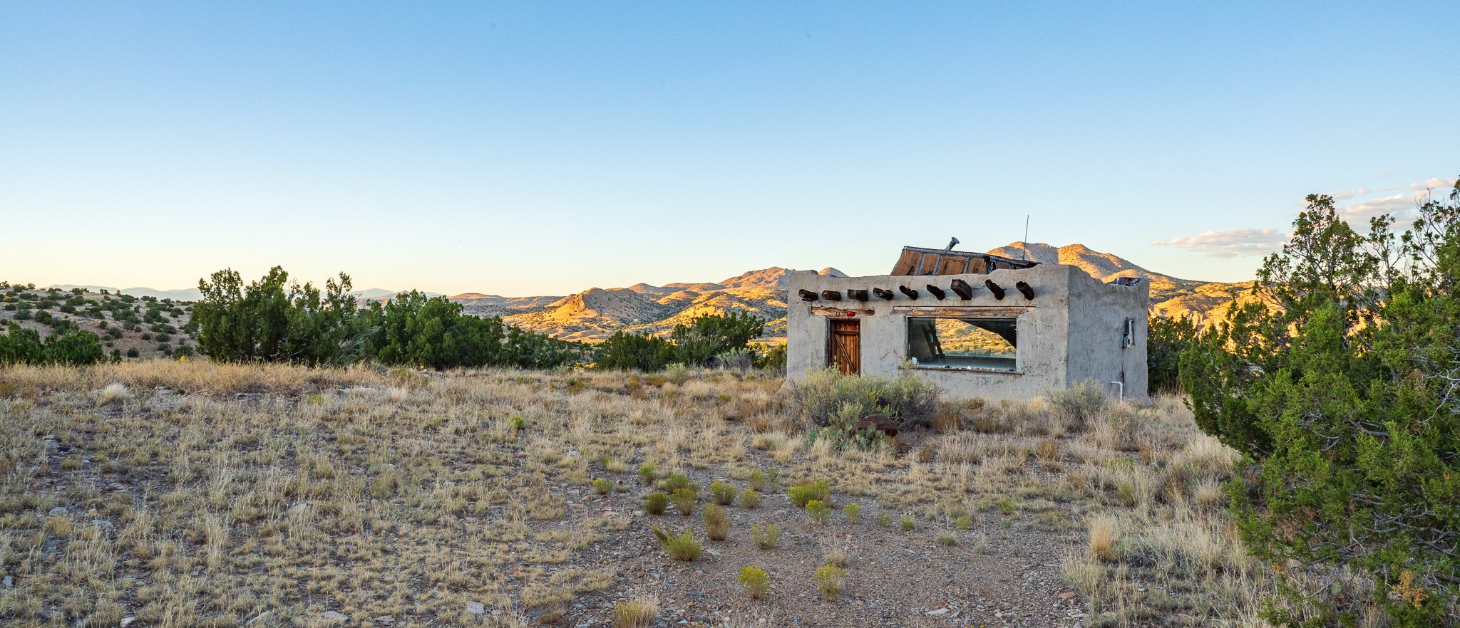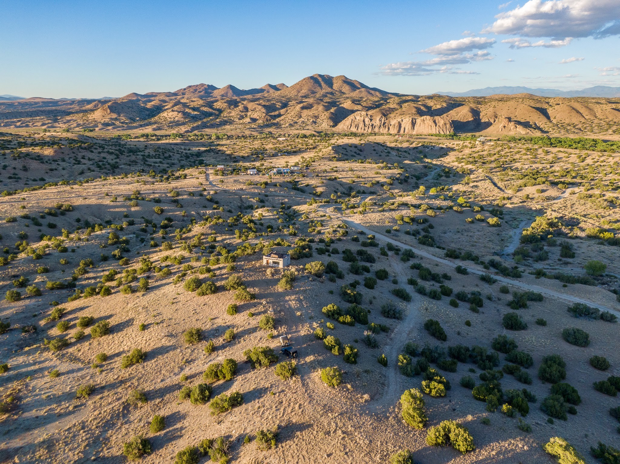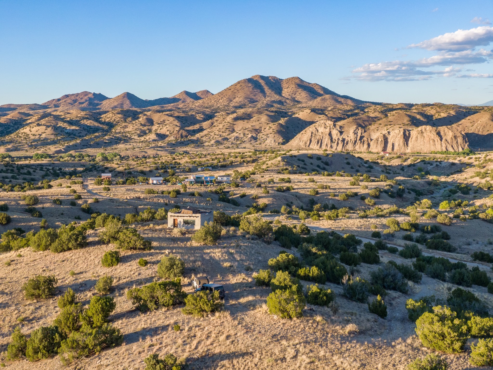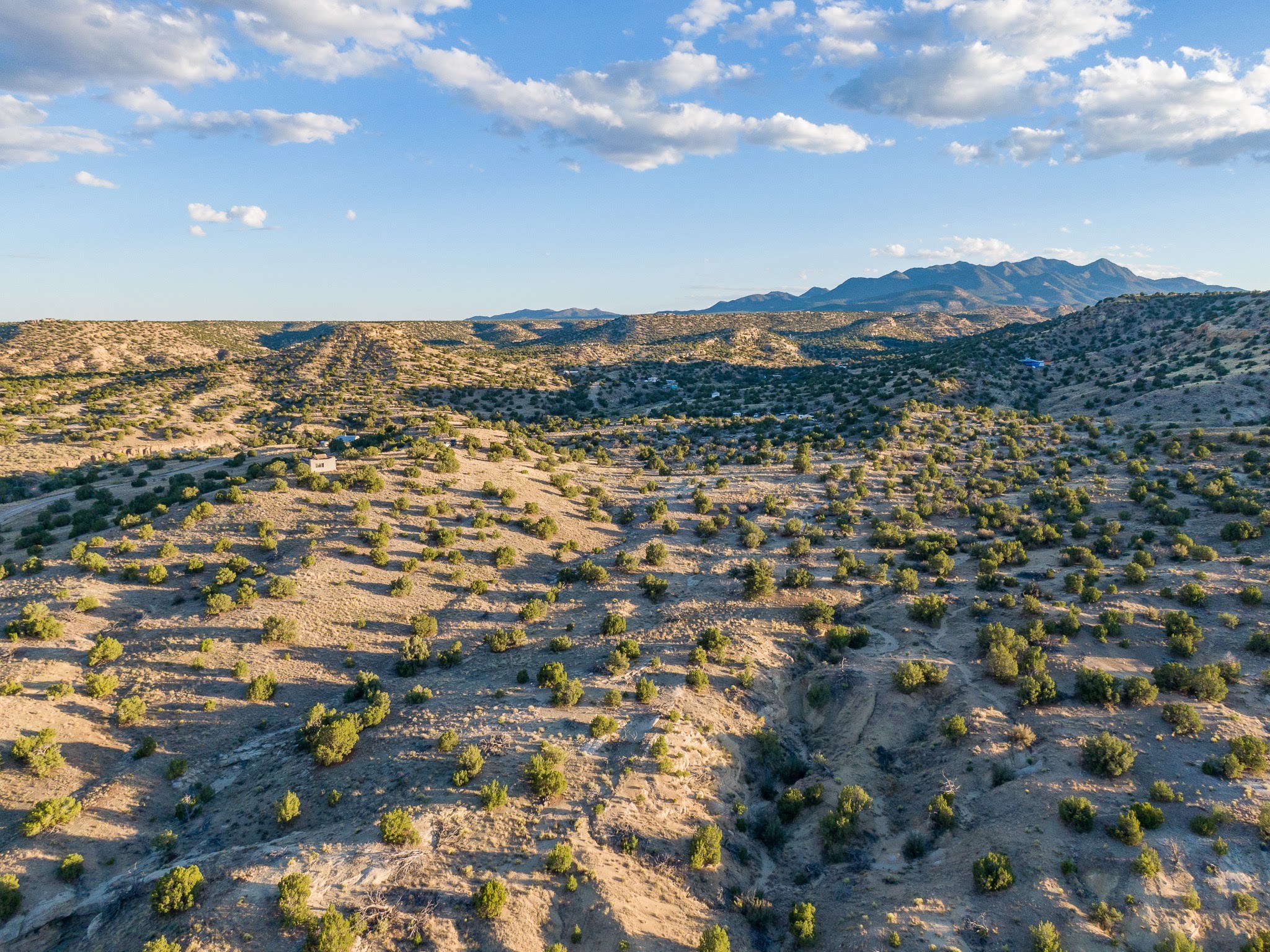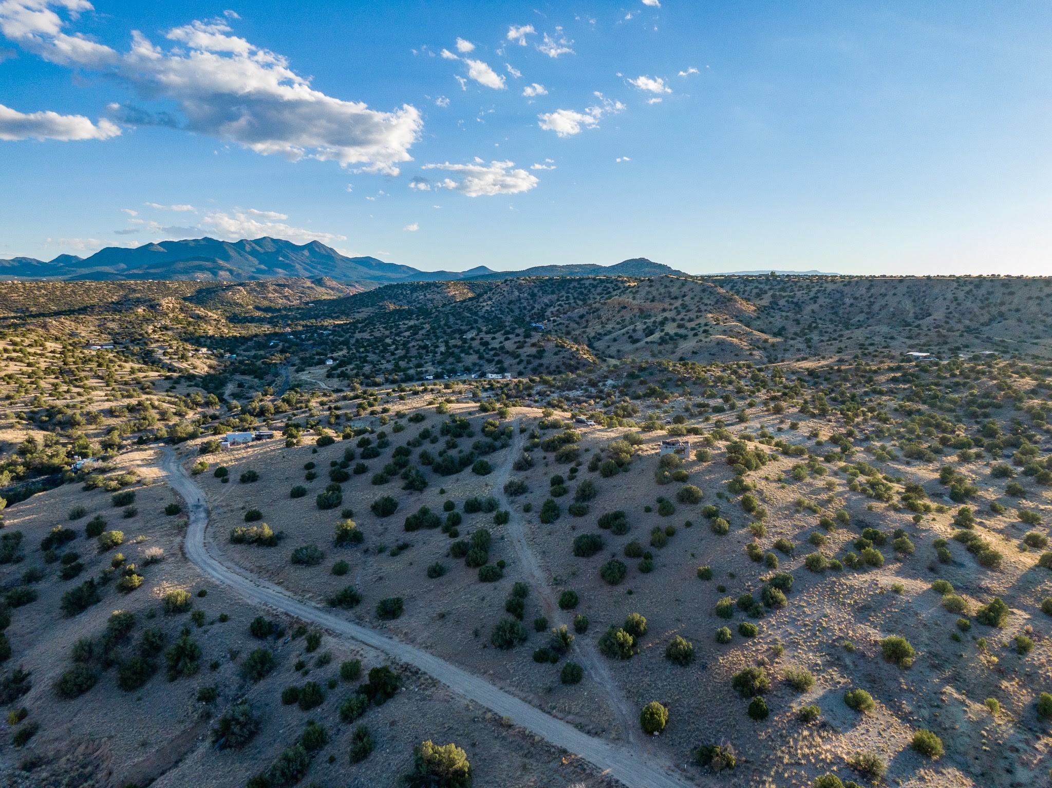 Views for miles from this off-grid 20 acres. Just 1.2 miles from the Highway 14, this property is minutes from pavement, near Cerrillos and Madrid for dining and entertainment, and about 25 minutes south of Santa Fe. A roughed-in driveway leads from White Wolf to a hilltop with an old adobe building in disrepair. Multiple elevated flat areas provide ideal building sites. Quiet and private, and ready for you to start your off-grid homestead. No restrictive covenants have been found. DO NOT ENTER THE BUILDING.