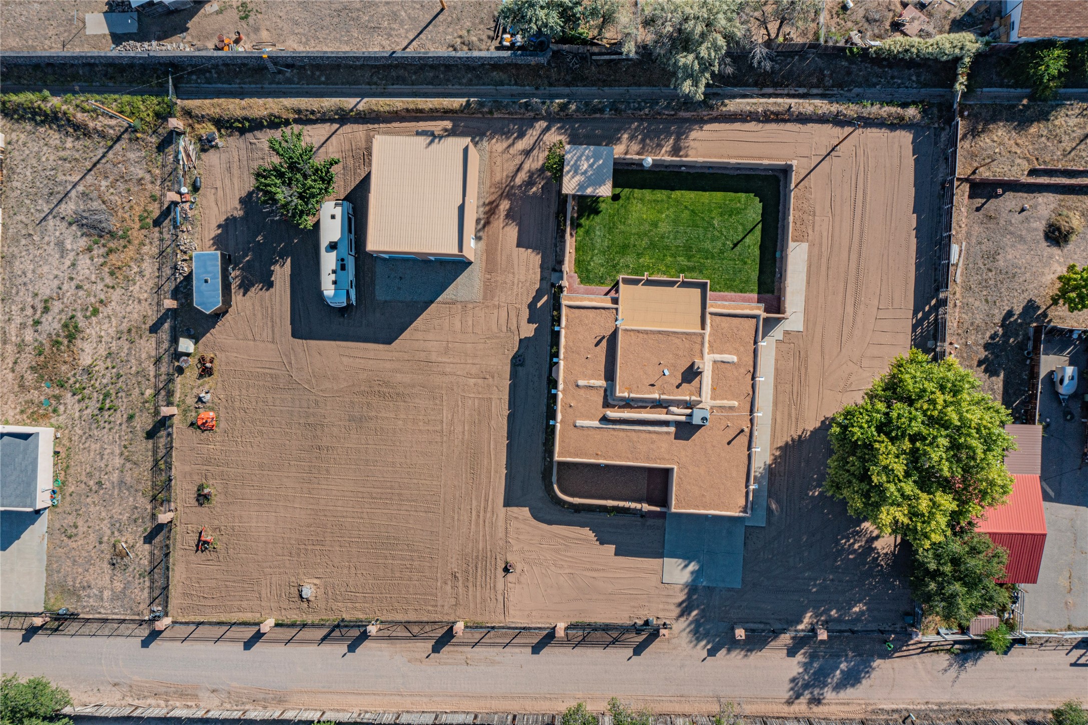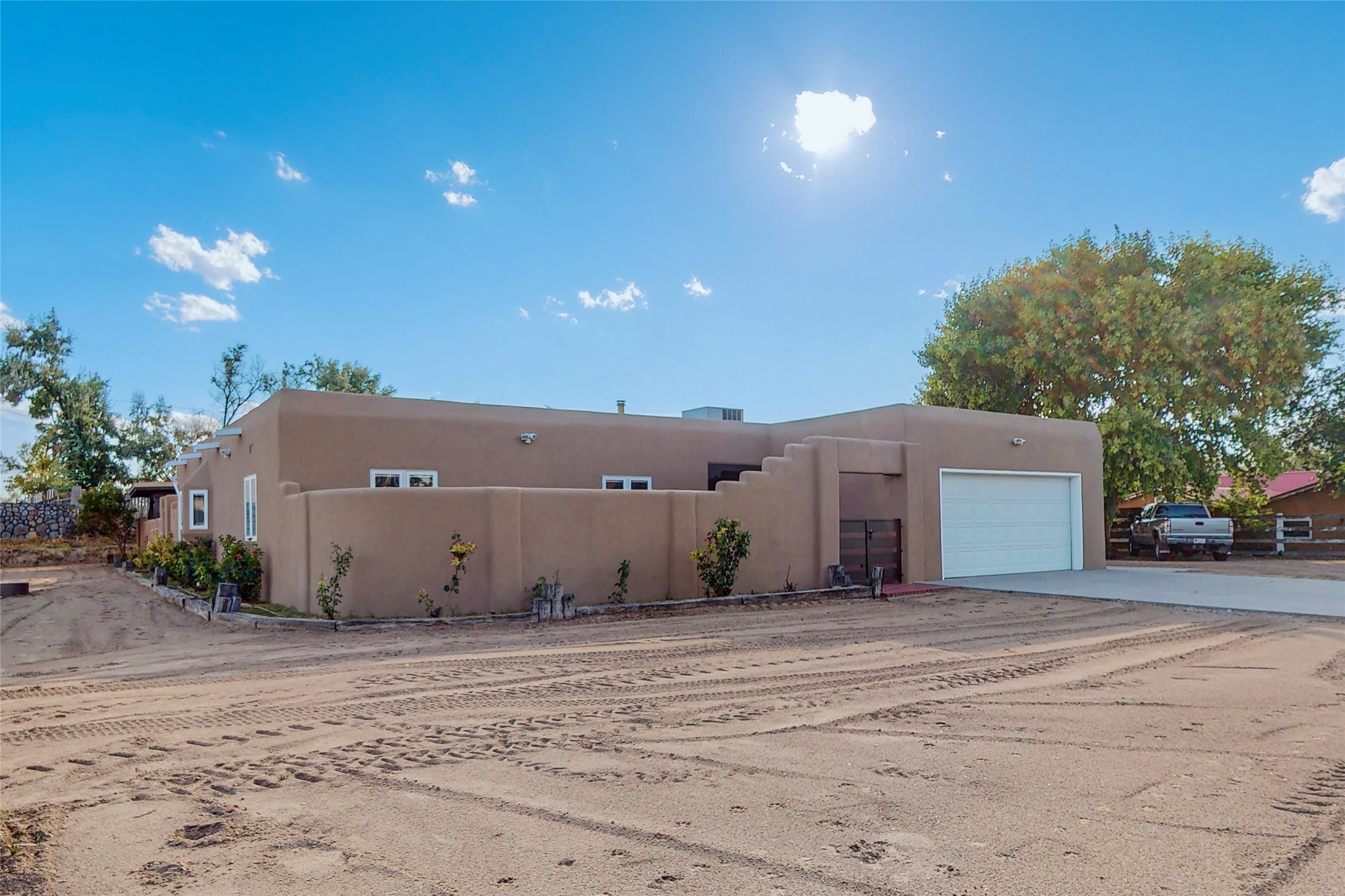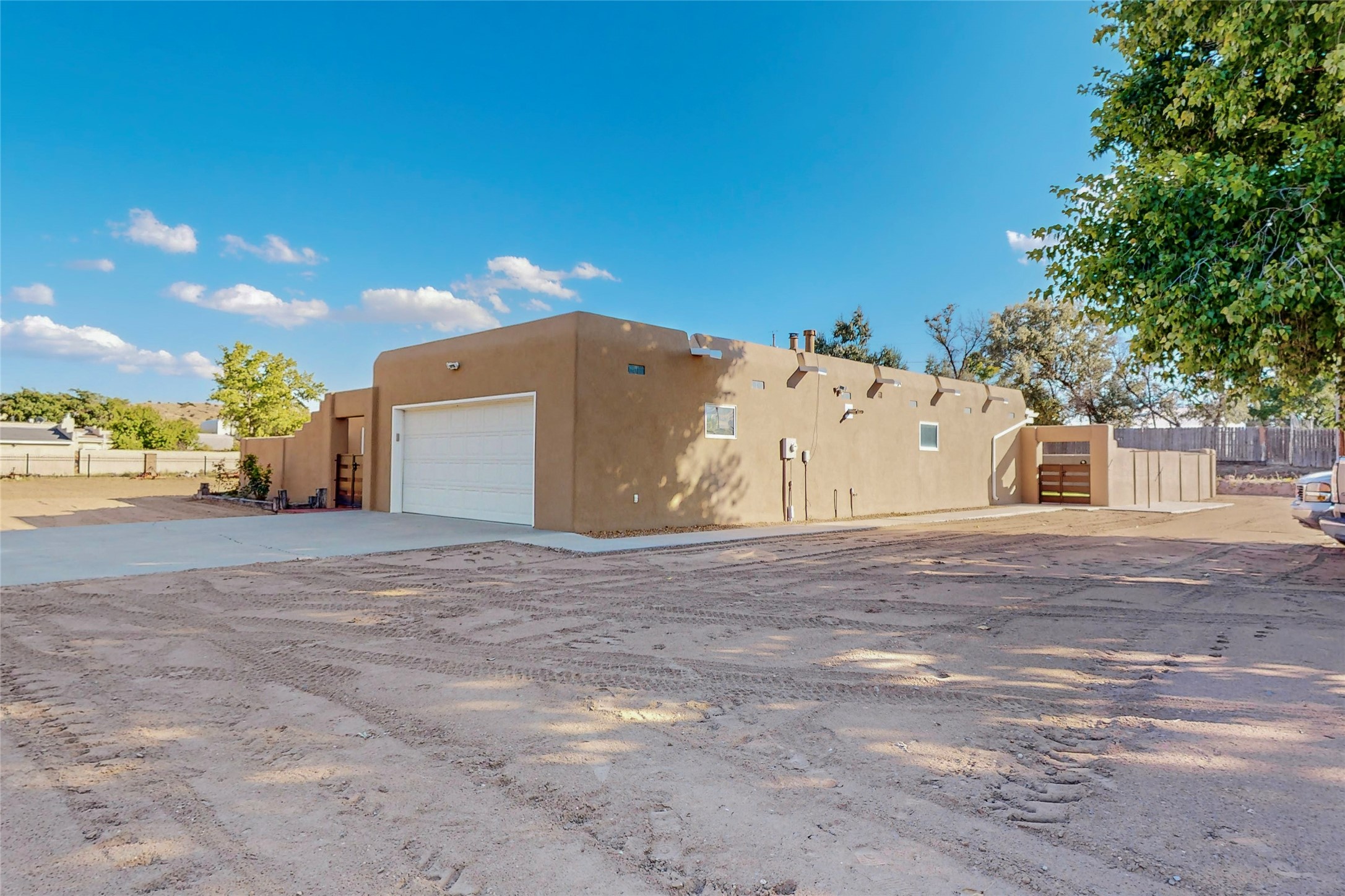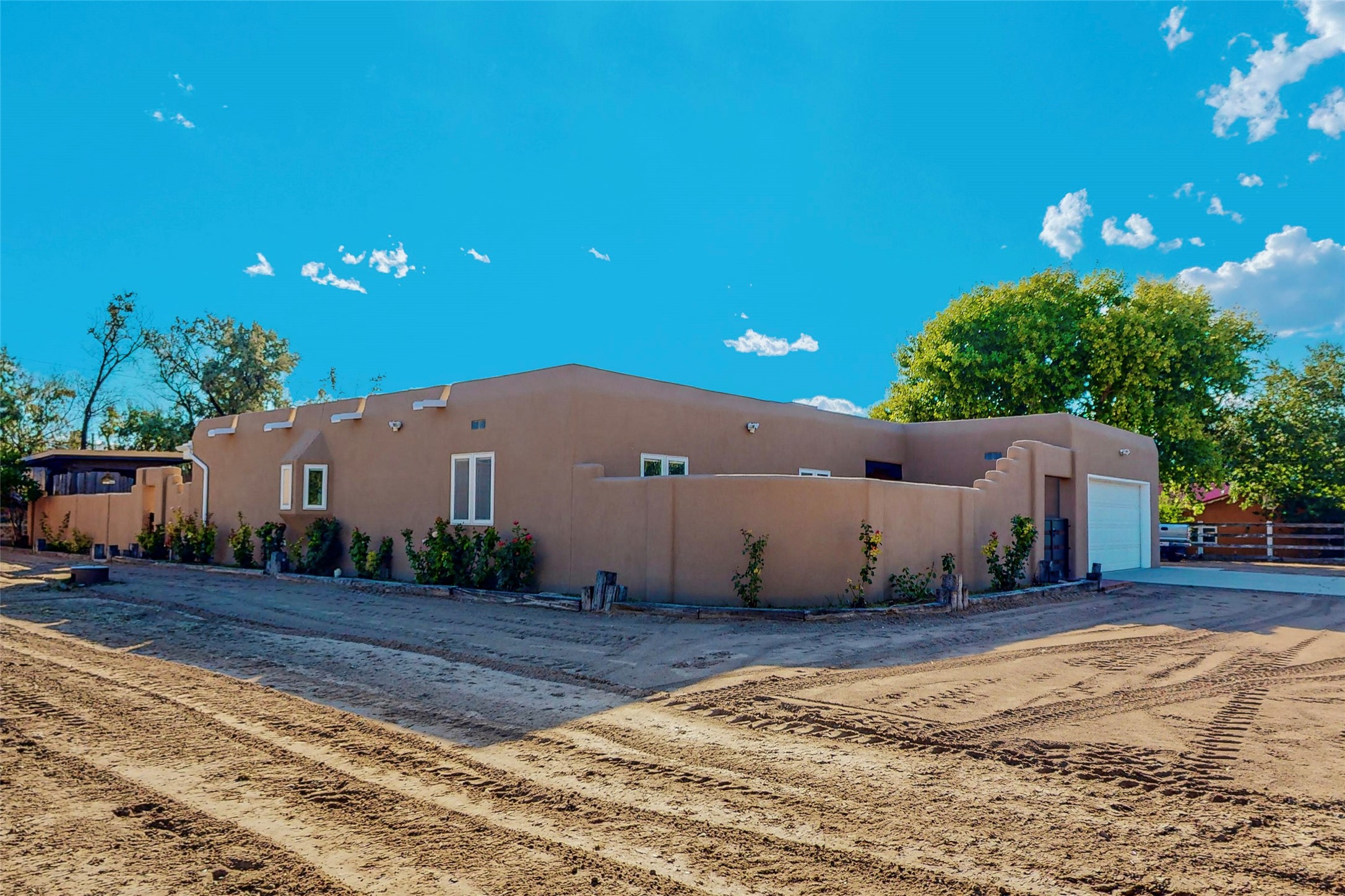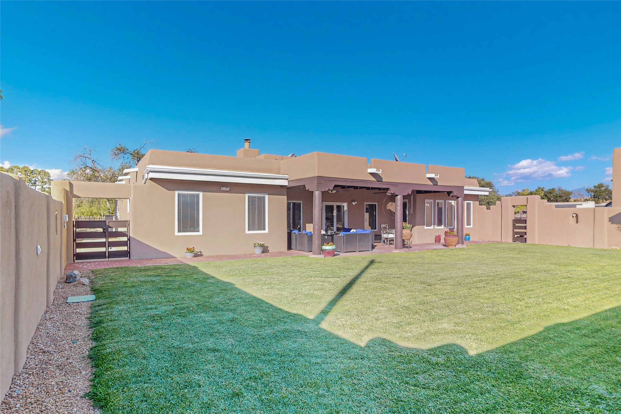 A Pueblo style home, in La Mesilla, is a home you do not want to miss. Located down a private drive, with limited road use. The road does have enough space for two cars to drive through. There are two gates to access the Property. One electronic gate opens to the two car attached garage. The other gate opens to the detached, large RV garage/shop. The home comes with irrigation water rights for one's organic garden or whatever the new homeowner decides to plant. There is plenty of space around the house to put in a pool or other possibilities one could think of, maybe a hoop house for year round organic vegetables. There is an underground irrigation system to water the east side of the property. A concrete lined irrigation ditch borders the entire backyard. The home has recently been stuccoed/sto. The Polyurethane foam roof was entirely evaluated and maintained in 2017.A walk into this house will instantly show the love this house has had. The home is immaculately clean and well maintained. Nice to find a home you can just move into. It has vigas and tongue and groove ceilings in the common areas along with tiled flooring, to include the wet areas. The bedrooms have wood flooring. The kiva fireplace located in the living room, is also a focal point from parts of the kitchen and dining room. The three pane "Pella Windows" has in glass blinds. There is central forced heating and a refrigerated air conditioning system, as well as in floor radiant heating. The Large RV garage/ shop, comes with electric lighting, electric outlets, shelving and a pellet stove. One can work in comfort, on those creative projects/hobbies, all year round. So much to see and feast those eyes on. The outside living space is amazing. There is a wonderful sprinkler system for the lawn. This is the home you do not want to miss. It has so much to offer an individual or a family. Certainly a home one can enjoy for a lifetime. Minutes away from Espanola, Santa Fe, Los Alamos, and Taos.