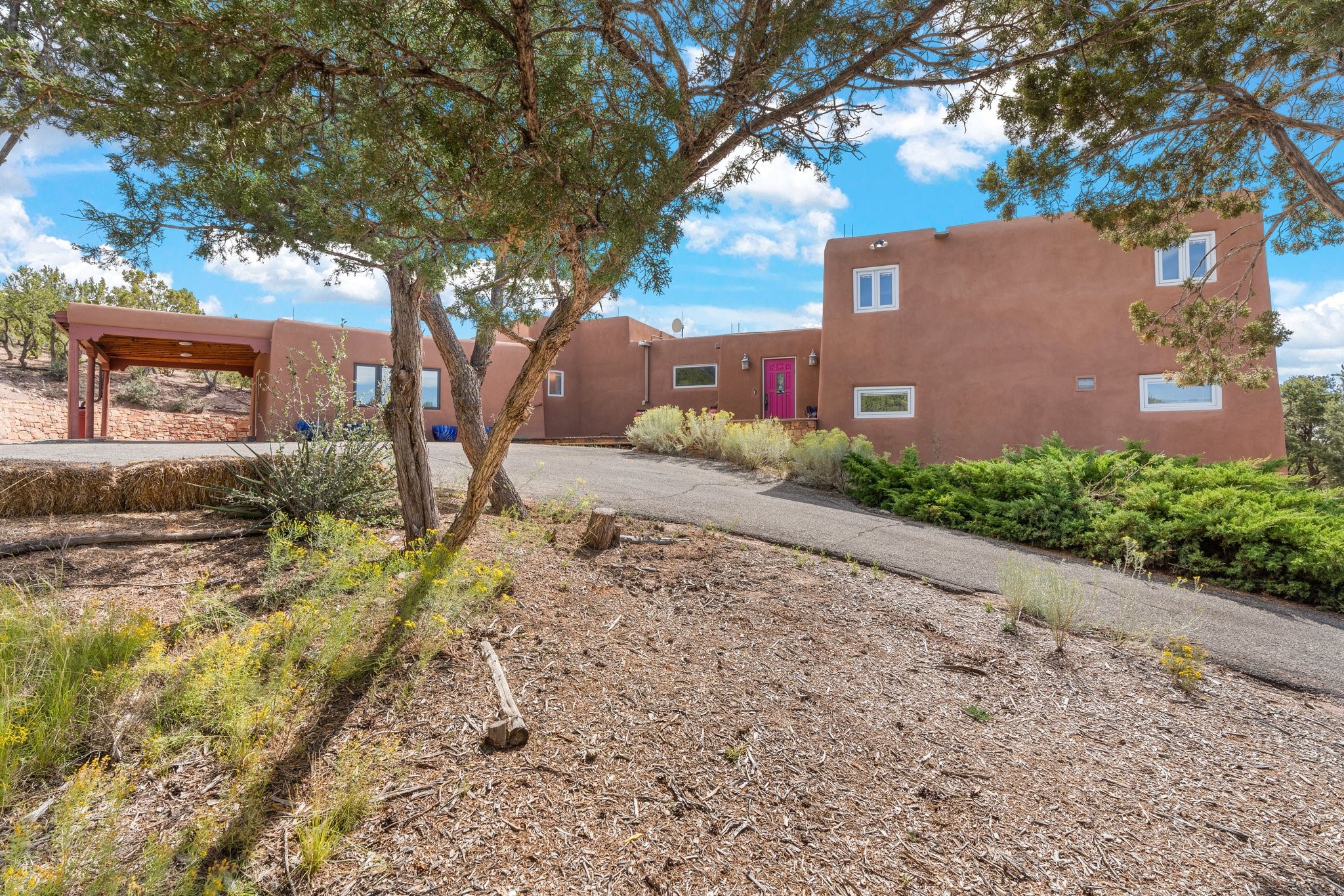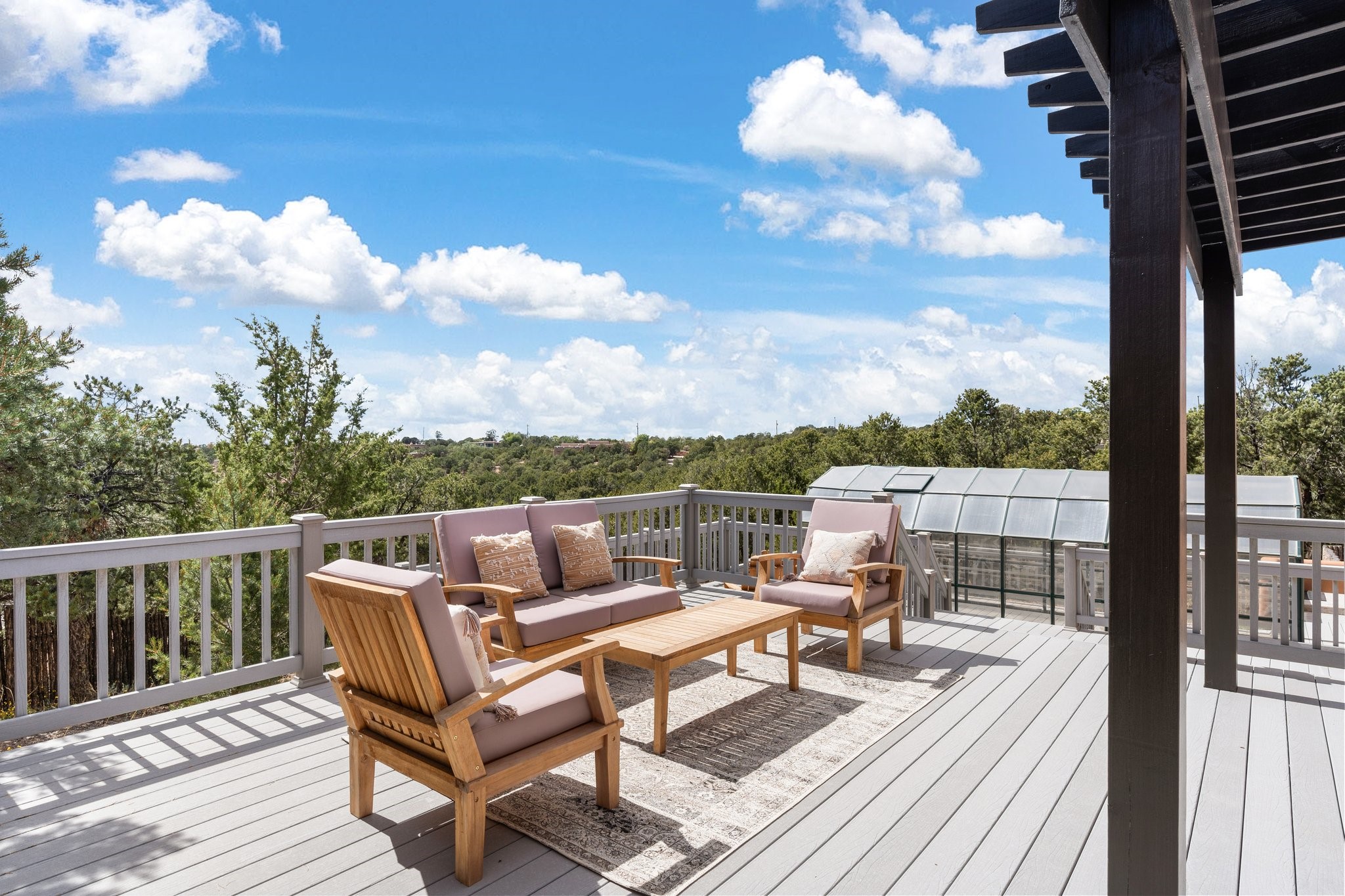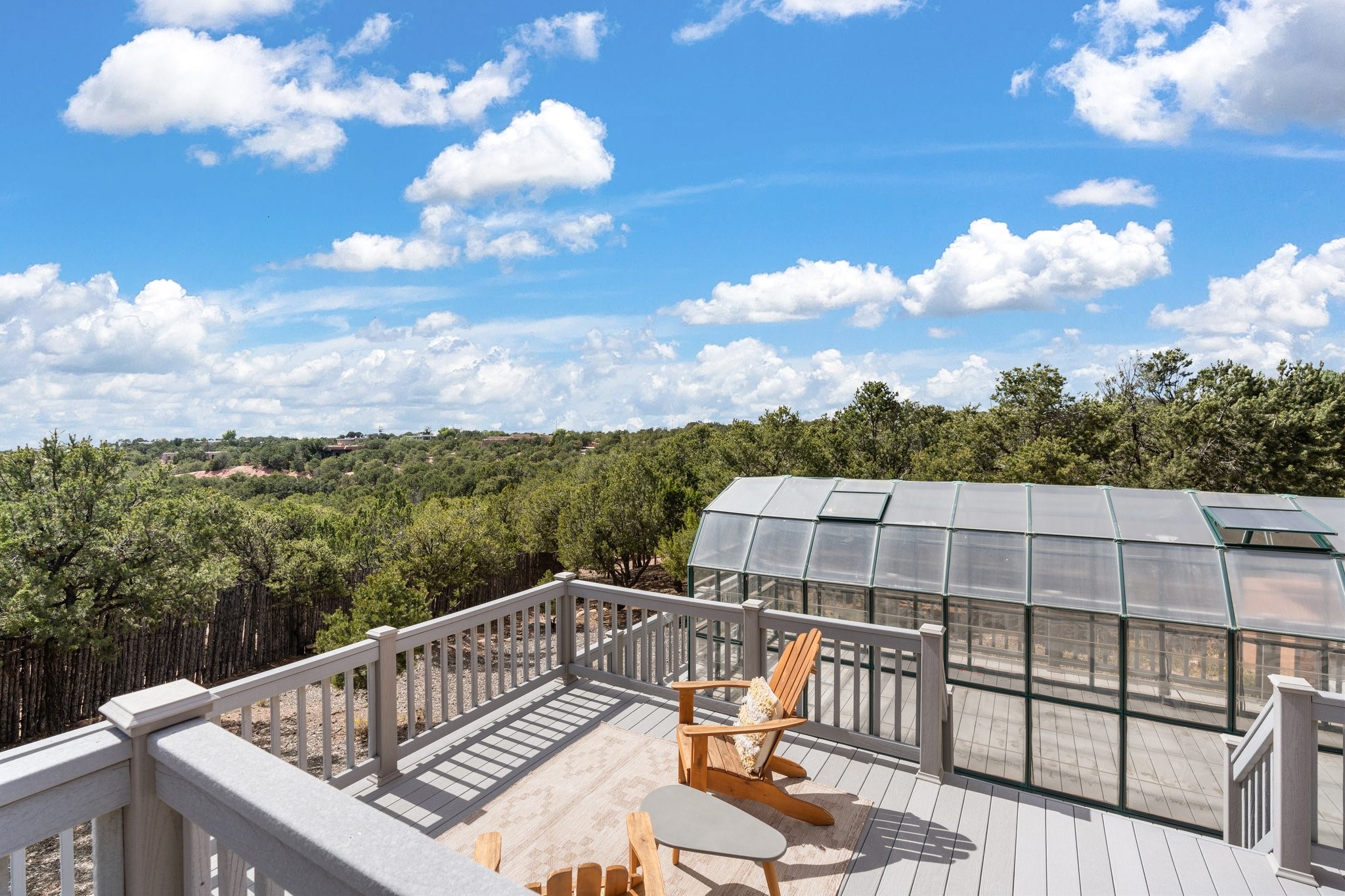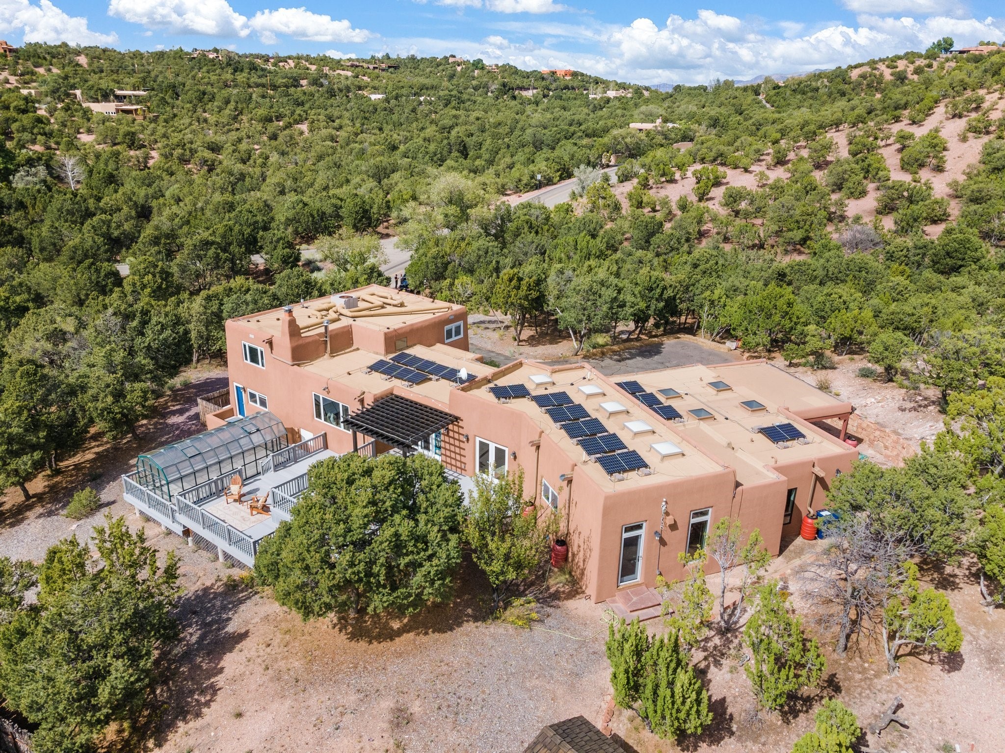 This stunning 4,000 +/- sq. ft home boasts 2 full bedroom suites, each with its own bathroom and sitting room. The upstairs suite additionally has an office while the downstairs bedroom suite with direct entry from the outside has a kitchenette. Nestled in the serene Santa Fe mountains and surrounded by magnificent views, this meticulously maintained home sitting on 1.9 acres is but minutes from downtown Santa Fe and its many amenities. Ideal for year-round entertaining, the generous great-room (living, dining, kitchen), offers easy access to the 900 sq. ft. Trex deck from which to enjoy amazing sunset views. The bespoke chef's-kitchen boasts a full range of top-of-the-line, Energy-Star, stainless steel appliances -- two stove tops, one electric with downdraft, and one gas; three ovens, one electric and two gas; two dishwashers, a wine cooler, microwave, a Viking fridge/freezer combo as well as a separate upright freezer, two sinks, and a very generous island. Quartz countertops and custom cabinetry complete the kitchen. The adjoining studio with storage for paintings can double as a family room or be built out into a stunning main bedroom suite. A 20 x 8 ft greenhouse and a garden shed allow you to give flight to all your gardening dreams. Paid off solar panels on the roof keep the electric bills to a minimum. A composite roof slopes gently to allow for drainage. The house is protected with lightning rods around the perimeter of the roof. This home offers so many more extras that it is impossible to list them all here. Please see additional info in document section of listing. All measurements are estimates and if of material interest, Buyer to independently verify. Neither Seller nor Listing Broker warrant house or lot size.