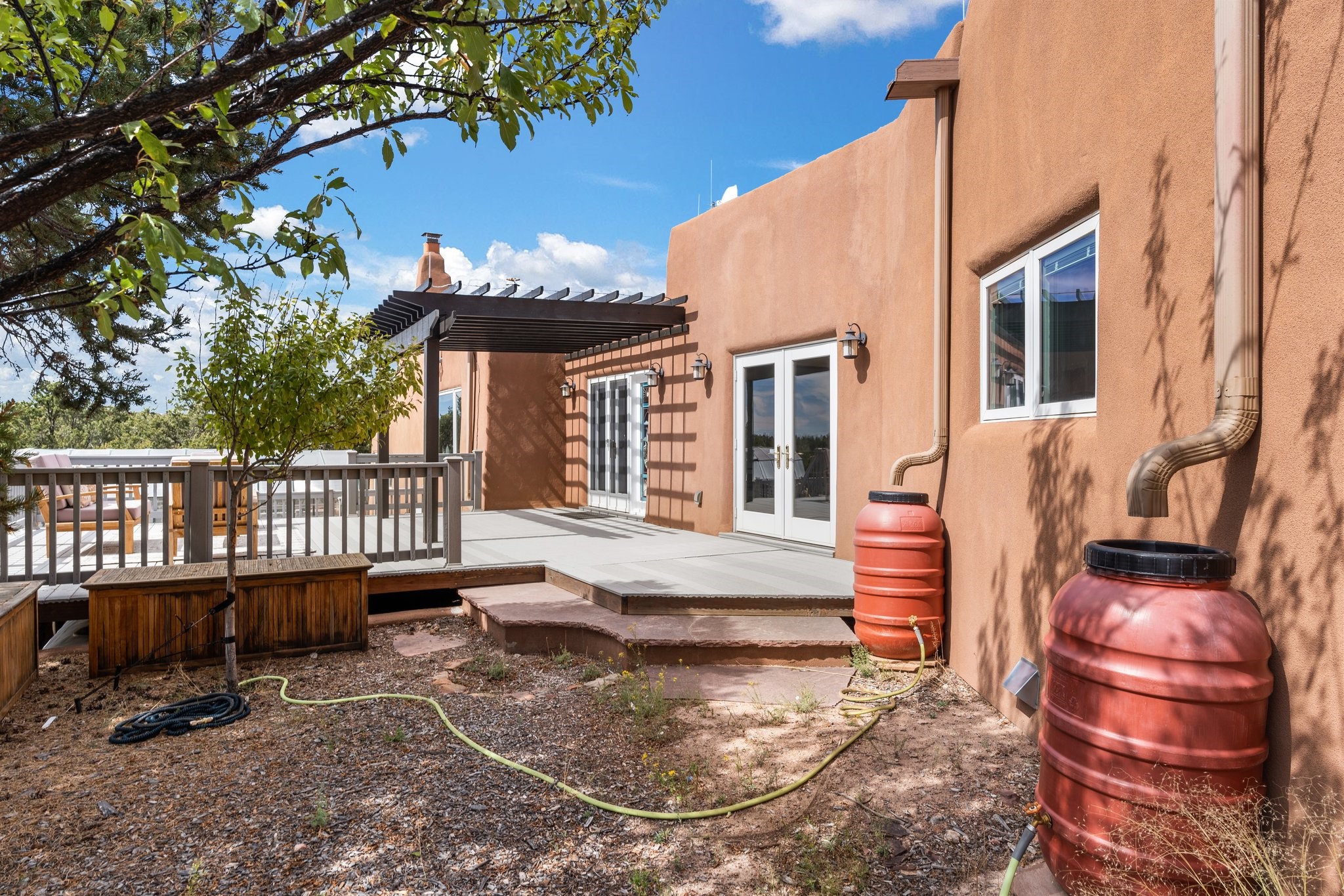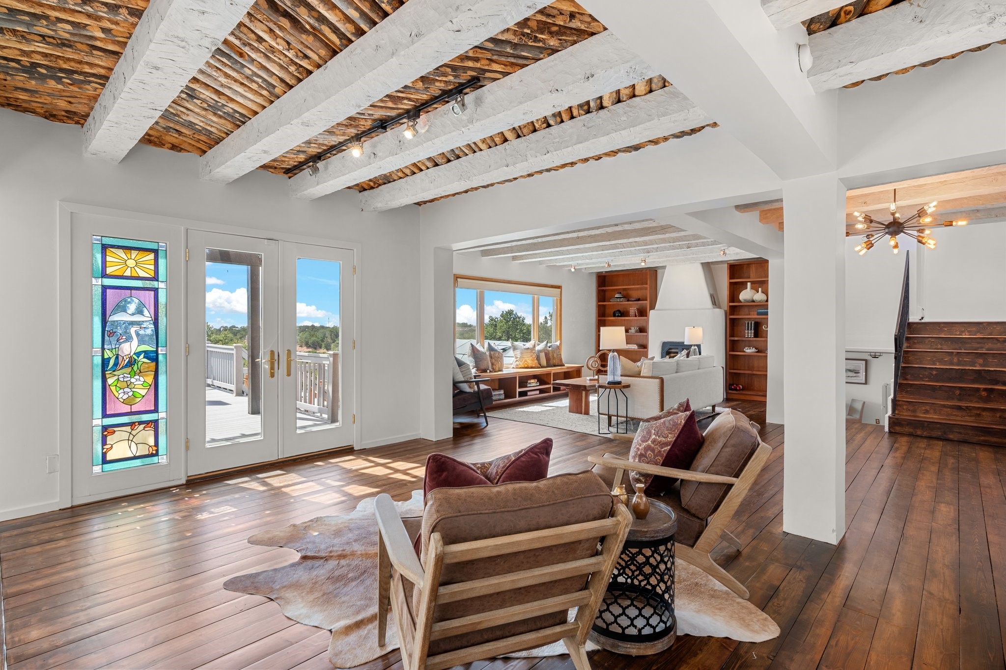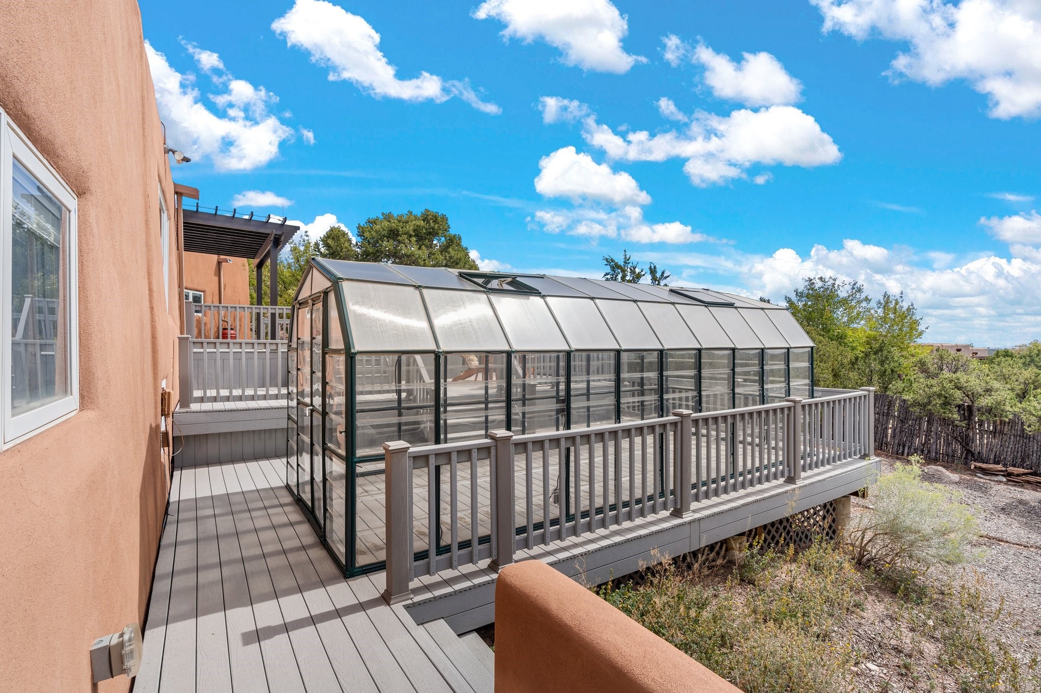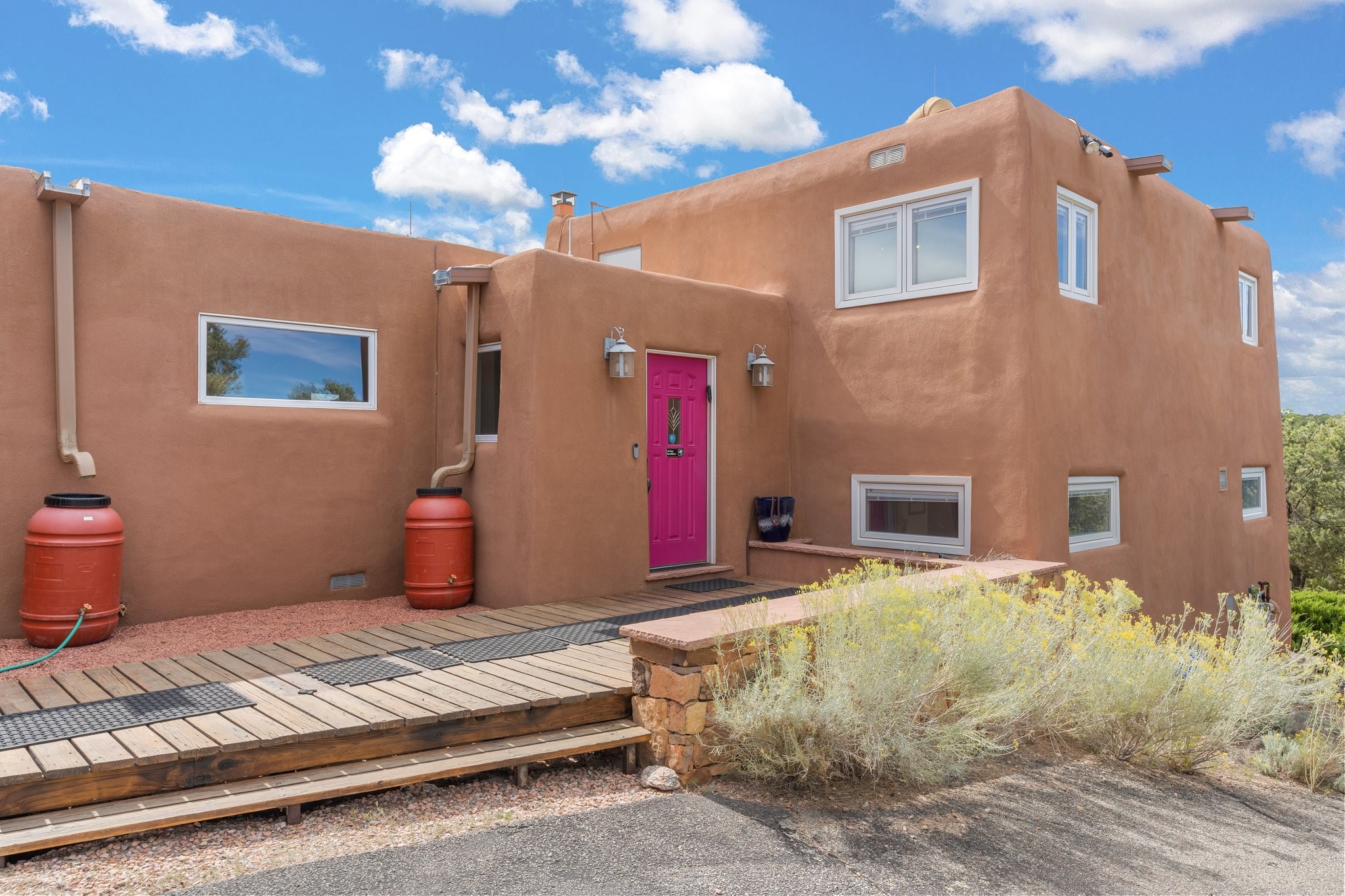 This stunning 4,000 +/- sq. ft home boasts 2 full bedroom suites, each with its own bathroom and sitting room. The upstairs suite additionally has an office while the downstairs bedroom suite with direct entry from the outside has a kitchenette. Nestled in the serene Santa Fe mountains and surrounded by magnificent views, this meticulously maintained home sitting on 1.9 acres is but minutes from downtown Santa Fe and its many amenities. Ideal for year-round entertaining, the generous great-room (living, dining, kitchen), offers easy access to the 900 sq. ft. Trex deck from which to enjoy amazing sunset views. The bespoke chef's-kitchen boasts a full range of top-of-the-line, Energy-Star, stainless steel appliances -- two stove tops, one electric with downdraft, and one gas; three ovens, one electric and two gas; two dishwashers, a wine cooler, microwave, a Viking fridge/freezer combo as well as a separate upright freezer, two sinks, and a very generous island. Quartz countertops and custom cabinetry complete the kitchen. The adjoining studio with storage for paintings can double as a family room or be built out into a stunning main bedroom suite. A 20 x 8 ft greenhouse and a garden shed allow you to give flight to all your gardening dreams. Paid off solar panels on the roof keep the electric bills to a minimum. A composite roof slopes gently to allow for drainage. The house is protected with lightning rods around the perimeter of the roof. This home offers so many more extras that it is impossible to list them all here. Please see additional info in document section of listing. All measurements are estimates and if of material interest, Buyer to independently verify. Neither Seller nor Listing Broker warrant house or lot size.