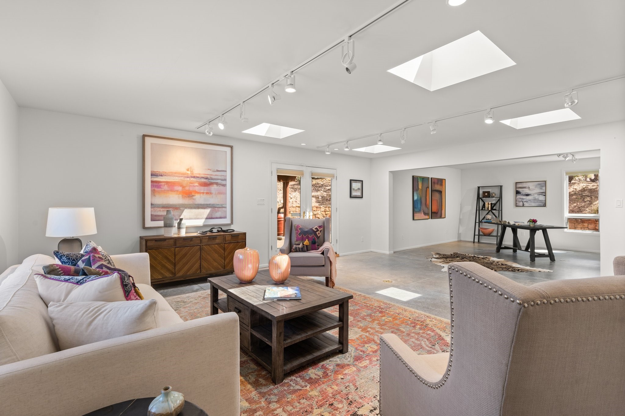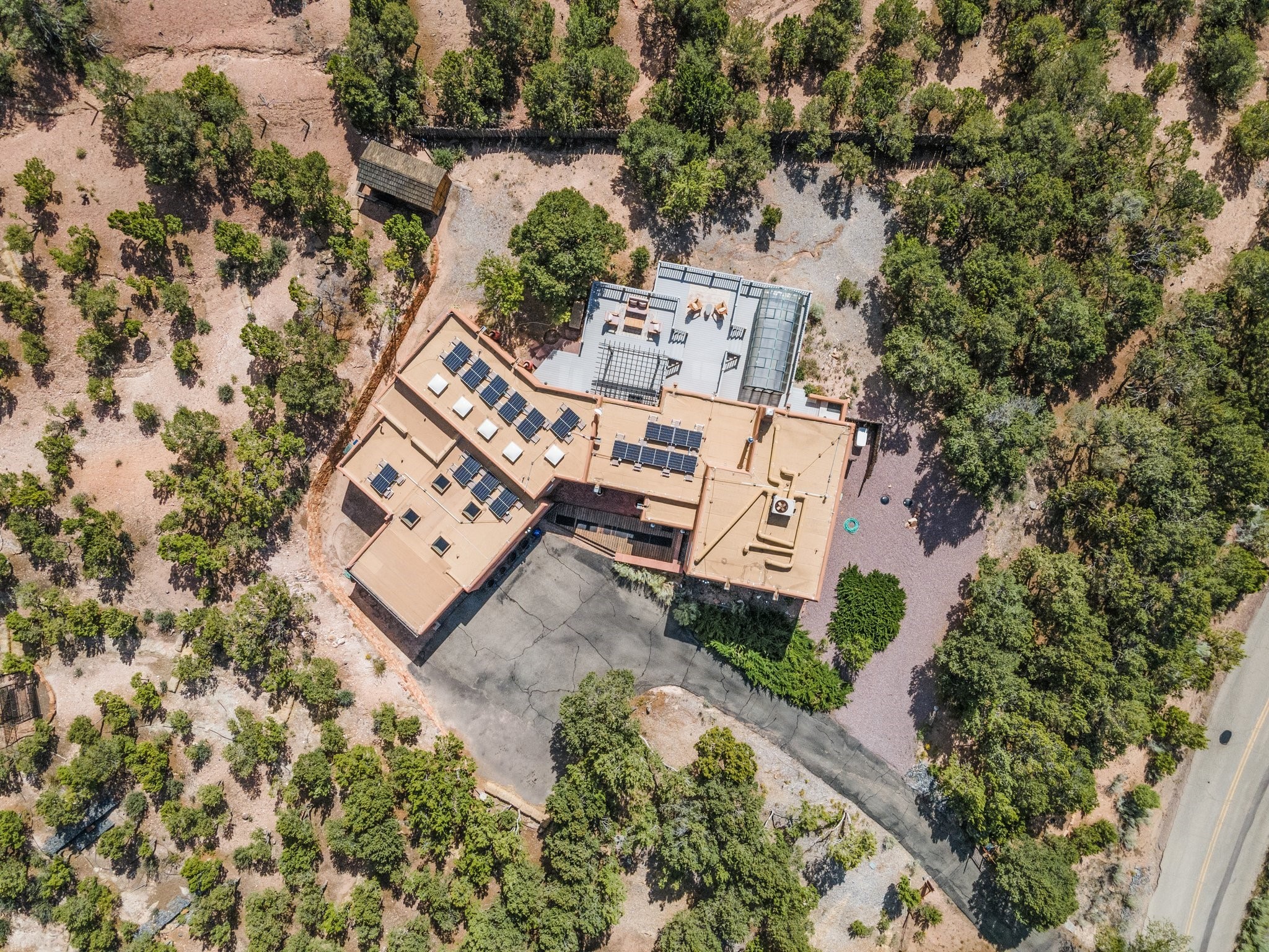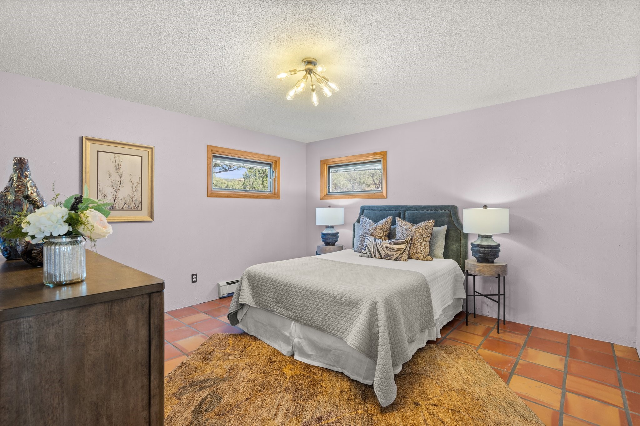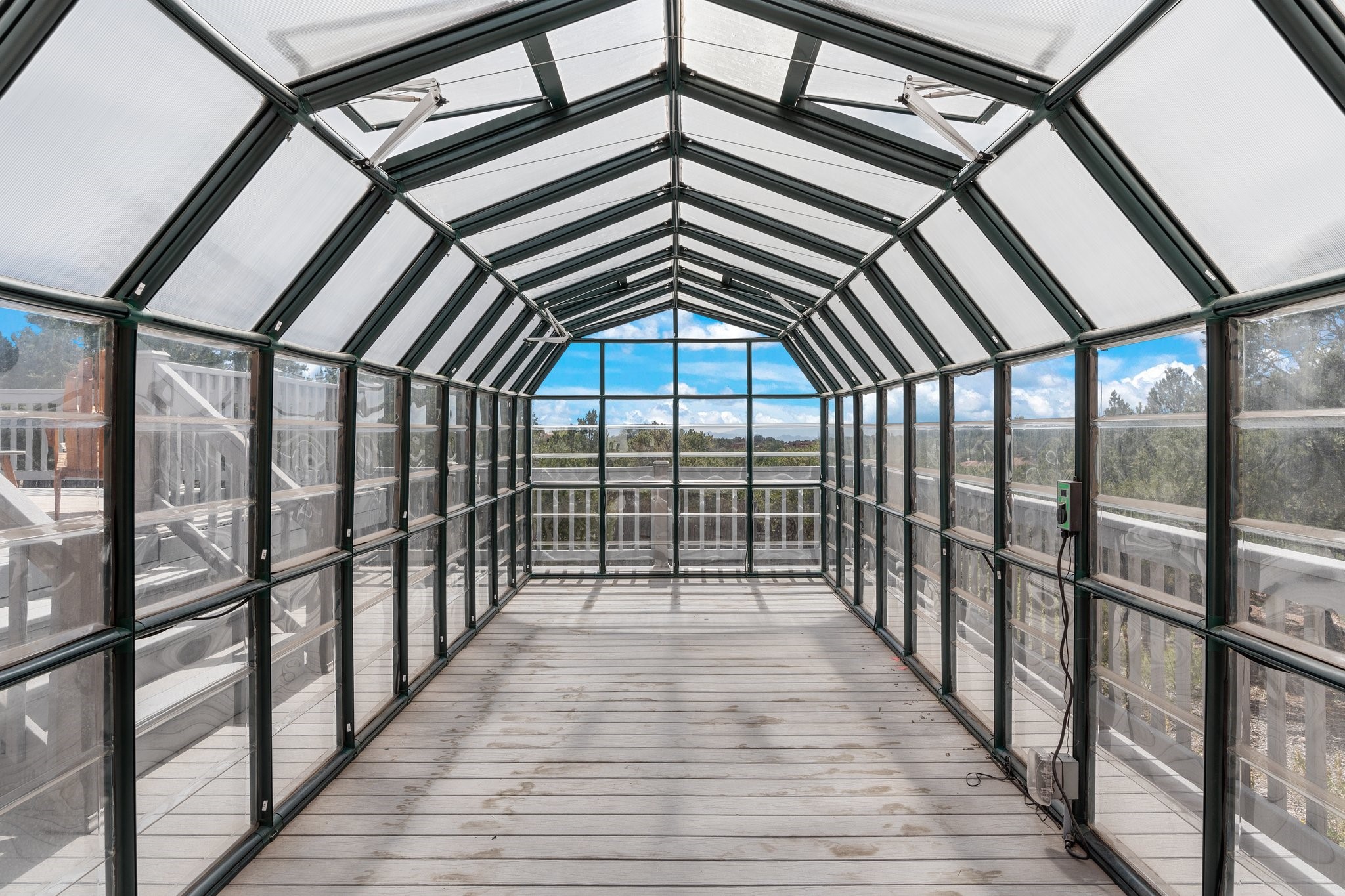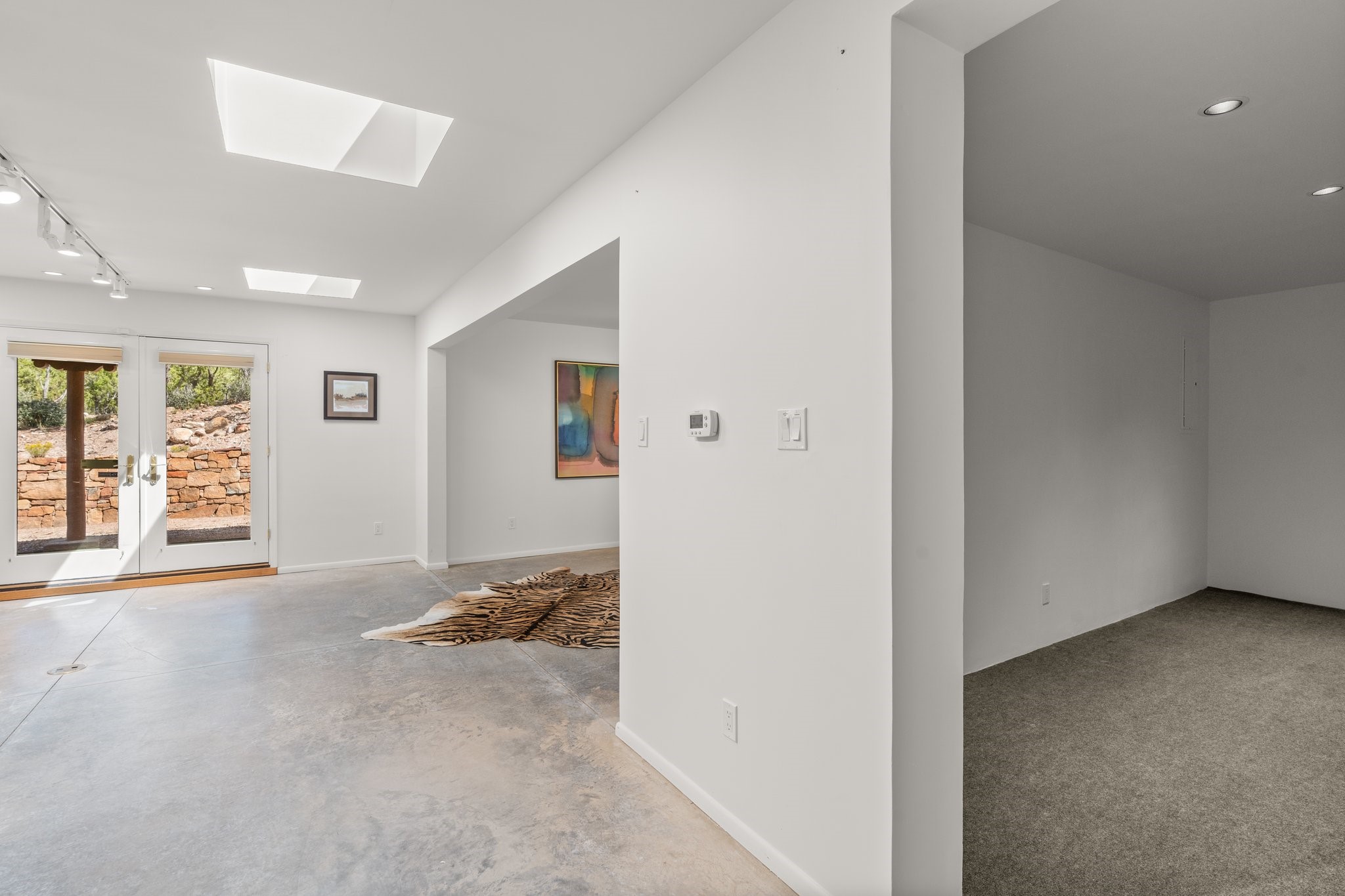This stunning 4,000 +/- sq. ft home boasts 2 full bedroom suites, each with its own bathroom and sitting room. The upstairs suite additionally has an office while the downstairs bedroom suite with direct entry from the outside has a kitchenette. Nestled in the serene Santa Fe mountains and surrounded by magnificent views, this meticulously maintained home sitting on 1.9 acres is but minutes from downtown Santa Fe and its many amenities. Ideal for year-round entertaining, the generous great-room (living, dining, kitchen), offers easy access to the 900 sq. ft. Trex deck from which to enjoy amazing sunset views. The bespoke chef's-kitchen boasts a full range of top-of-the-line, Energy-Star, stainless steel appliances -- two stove tops, one electric with downdraft, and one gas; three ovens, one electric and two gas; two dishwashers, a wine cooler, microwave, a Viking fridge/freezer combo as well as a separate upright freezer, two sinks, and a very generous island. Quartz countertops and custom cabinetry complete the kitchen. The adjoining studio with storage for paintings can double as a family room or be built out into a stunning main bedroom suite. A 20 x 8 ft greenhouse and a garden shed allow you to give flight to all your gardening dreams. Paid off solar panels on the roof keep the electric bills to a minimum. A composite roof slopes gently to allow for drainage. The house is protected with lightning rods around the perimeter of the roof. This home offers so many more extras that it is impossible to list them all here. Please see additional info in document section of listing. All measurements are estimates and if of material interest, Buyer to independently verify. Neither Seller nor Listing Broker warrant house or lot size.
