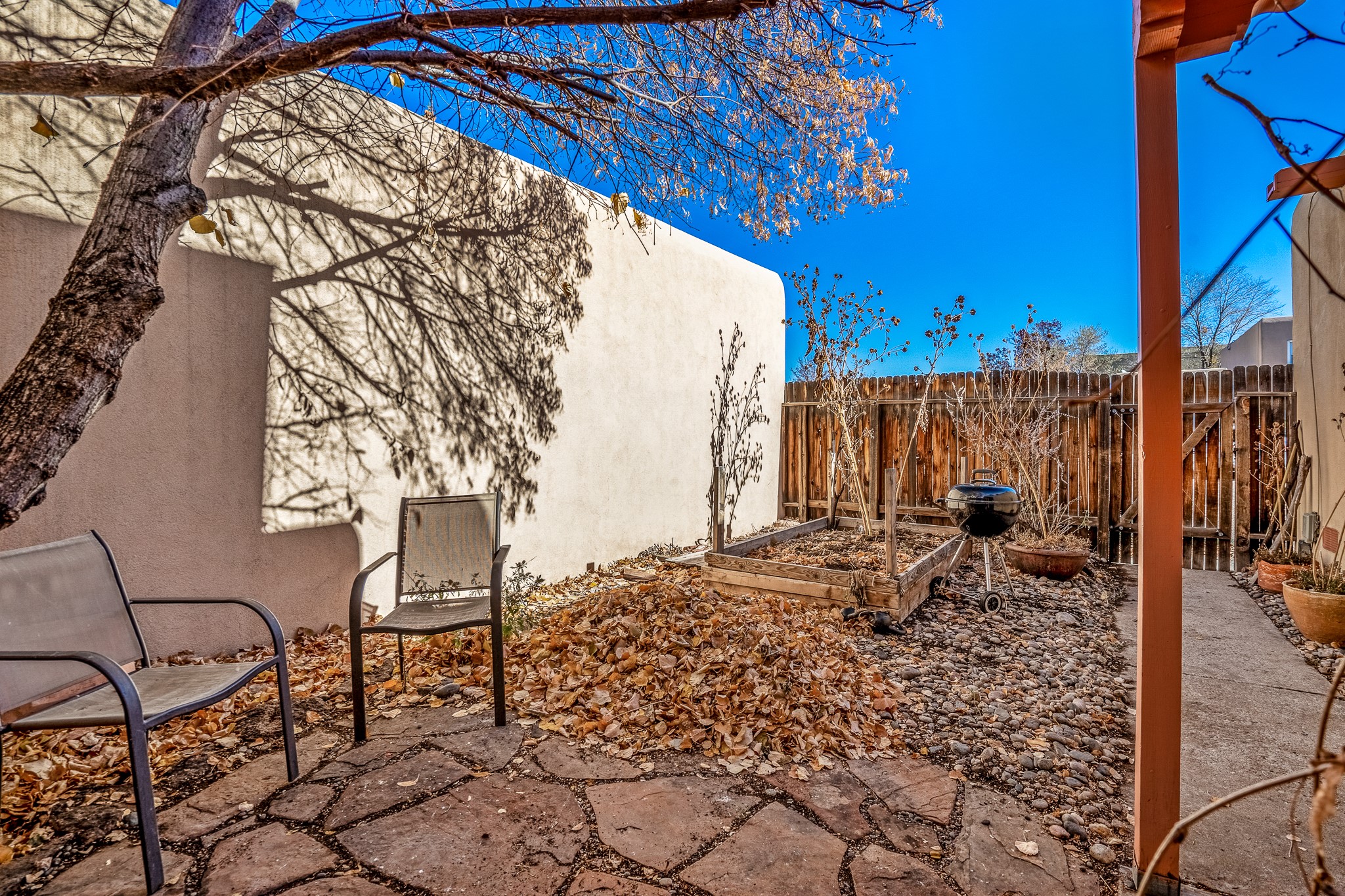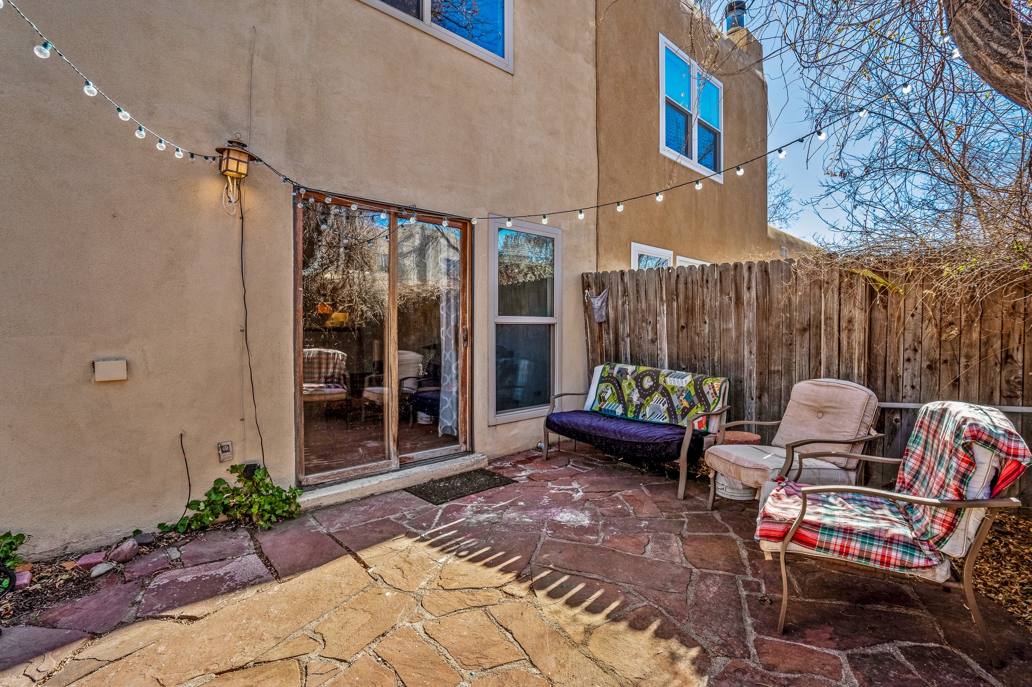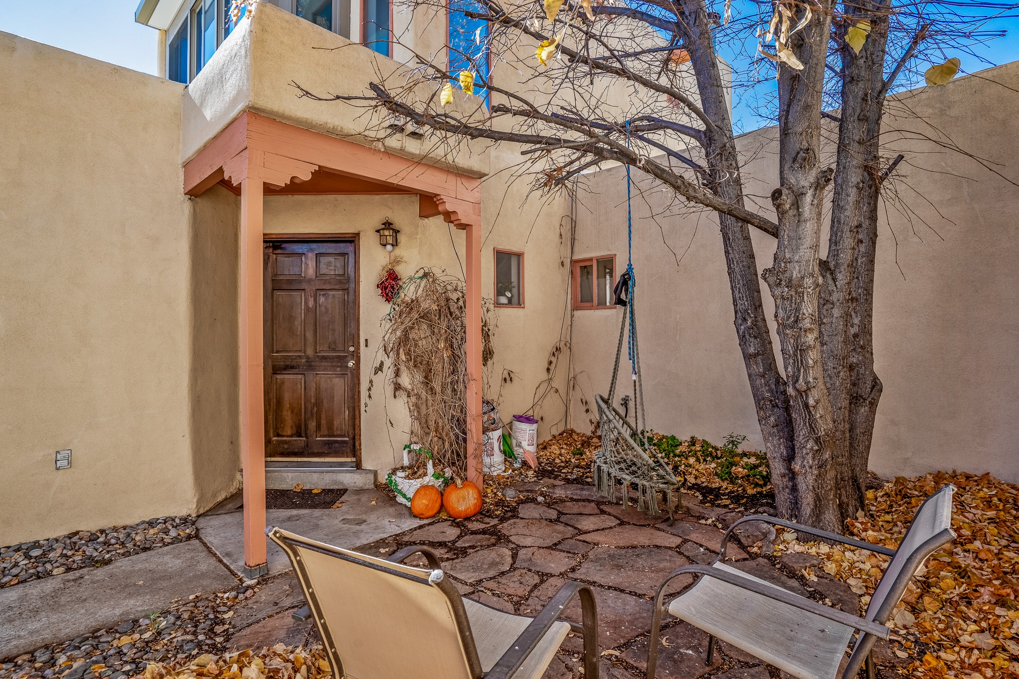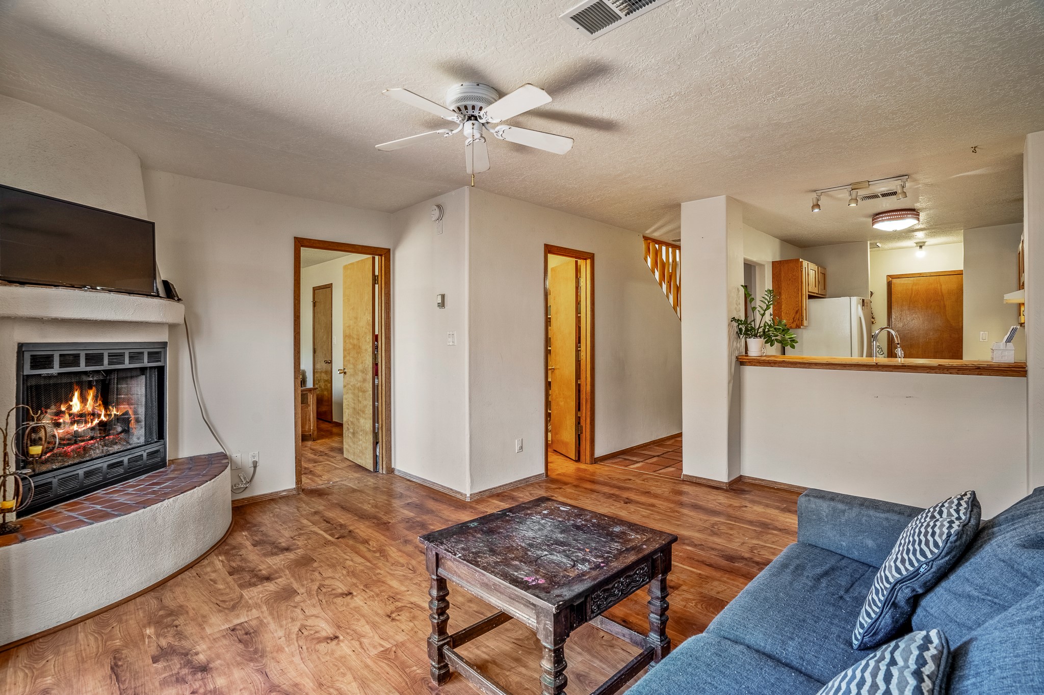 Sweet and charming 2 story, 2 bedroom, 2 bath, 1 car garage home in Plaza de Castillo with mountain views minutes from the Arroyo Chamisos Trail, close to the hospital, amenities and 15 minutes to the Santa Fe Plaza. Enter this gem of a home from the private enclosed and gated front courtyard. On the main level, you will find a bedroom with a full bath, saltillo tile and wood laminate flooring, kitchen with new range and dishwasher, breakfast bar, laundry room with washer and dryer and living room with wood burning fireplace. Upstairs, there is also a bedroom and full bath plus a versatile light and bright bonus room with mountain views perfect as an additional bedroom, office, study, playroom etc. From the living room you can access the cute rear patio with gardens, mature landscaping and sitting area. Features and amenities: Walk-in closet-Plenty of closets/storage-Forced air heat-Wood floor on the stairs-Ceiling fans-Transferrable roof coating warranty until January 2028 and more!