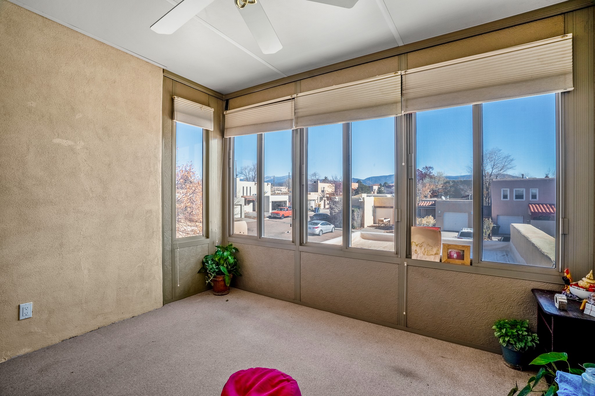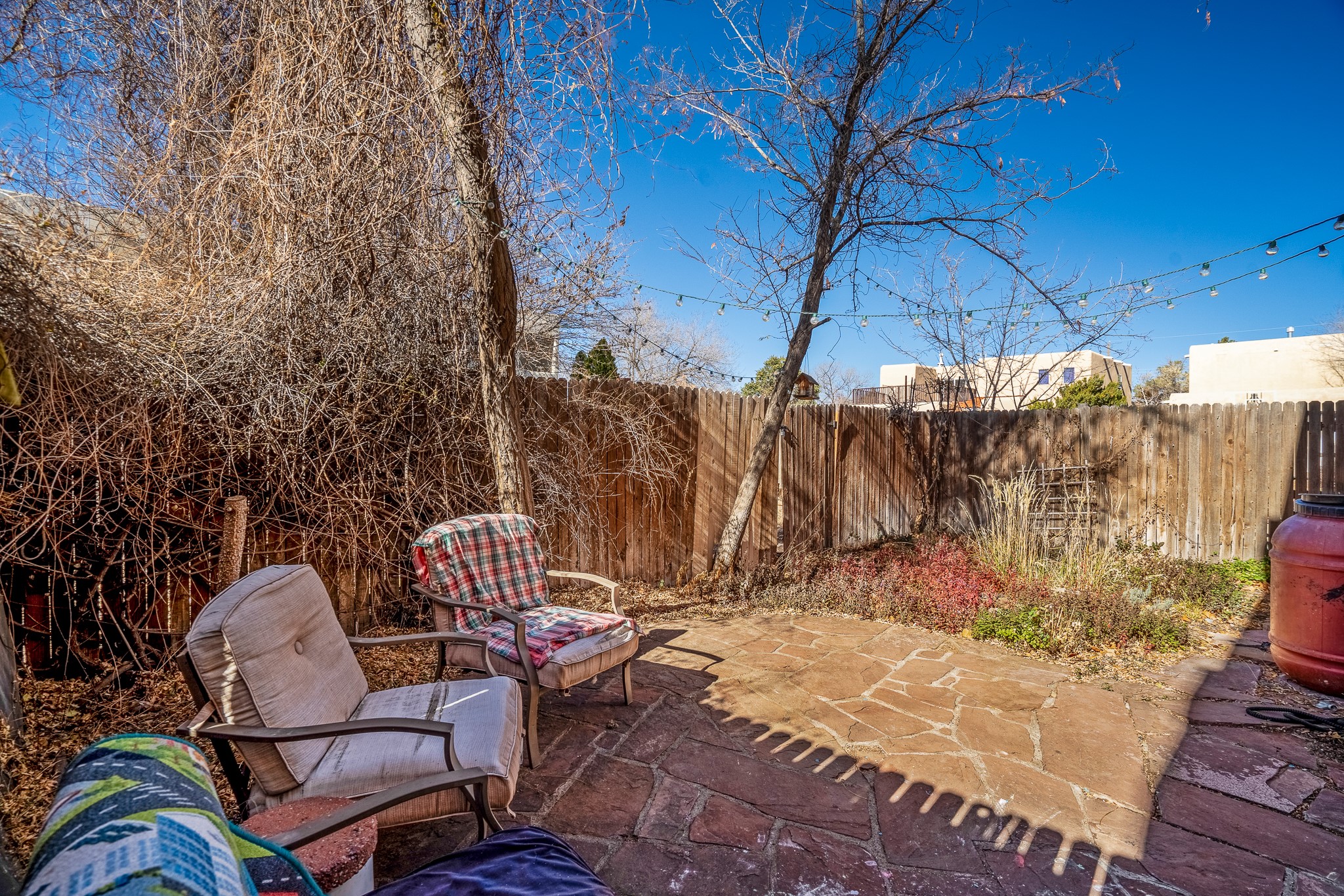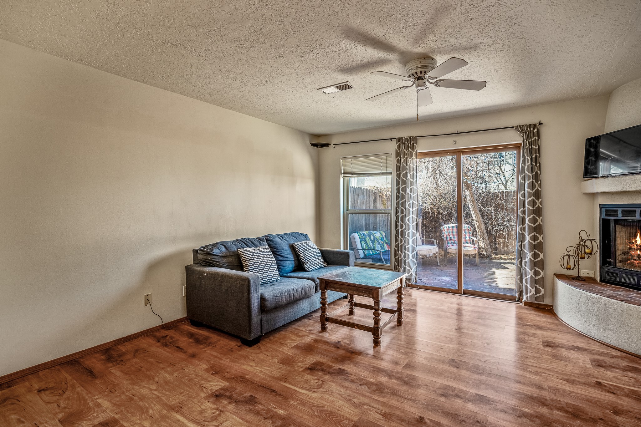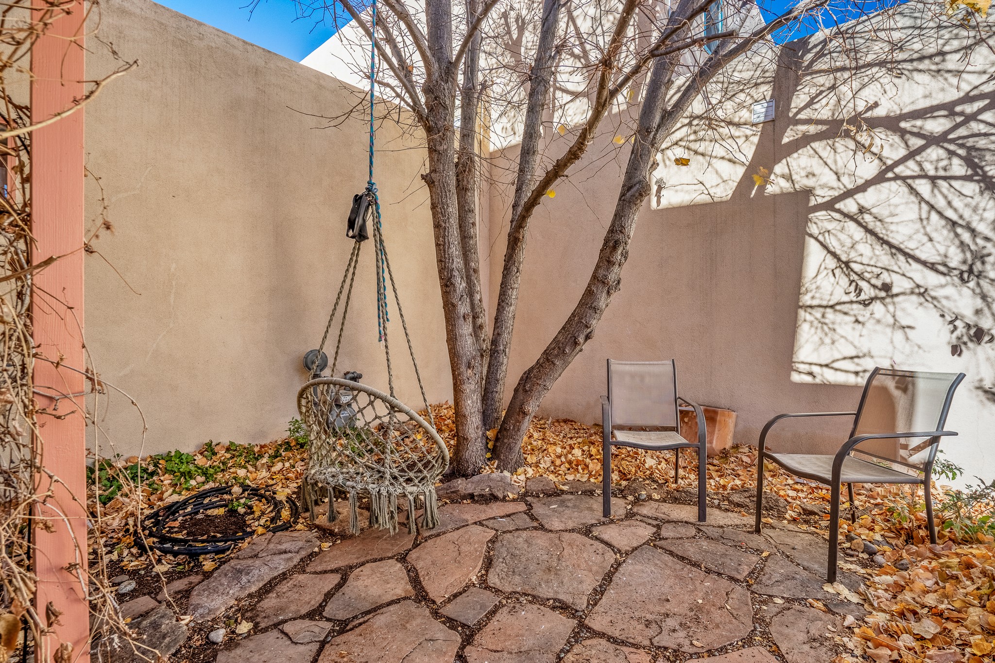 Sweet and charming 2 story, 2 bedroom, 2 bath, 1 car garage home in Plaza de Castillo with mountain views minutes from the Arroyo Chamisos Trail, close to the hospital, amenities and 15 minutes to the Santa Fe Plaza. Enter this gem of a home from the private enclosed and gated front courtyard. On the main level, you will find a bedroom with a full bath, saltillo tile and wood laminate flooring, kitchen with new range and dishwasher, breakfast bar, laundry room with washer and dryer and living room with wood burning fireplace. Upstairs, there is also a bedroom and full bath plus a versatile light and bright bonus room with mountain views perfect as an additional bedroom, office, study, playroom etc. From the living room you can access the cute rear patio with gardens, mature landscaping and sitting area. Features and amenities: Walk-in closet-Plenty of closets/storage-Forced air heat-Wood floor on the stairs-Ceiling fans-Transferrable roof coating warranty until January 2028 and more!