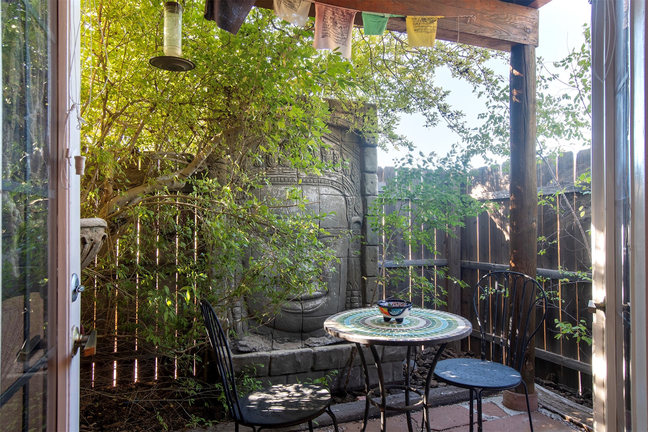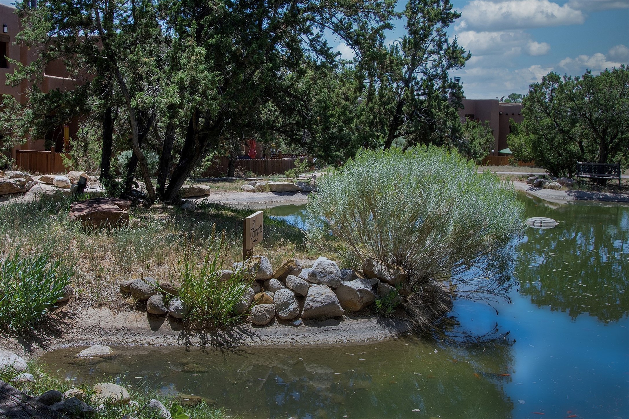 This Sweet Ground floor condo has plenty of Southwestern Charm, Saltillo like tile, and a kiva Fireplace. 1 bedroom, one bath, Stainless steel refrigerator and stove. The lovely grounds offer walking paths and Foliage throughout the Compound, a swimming pool Sauna, and Laundry Room round out the amenities. The fountain for the Compound is visible right outside this corner unit. The Big Fountain in the Courtyard does not convey!Available alone or with the Unit above L-2.