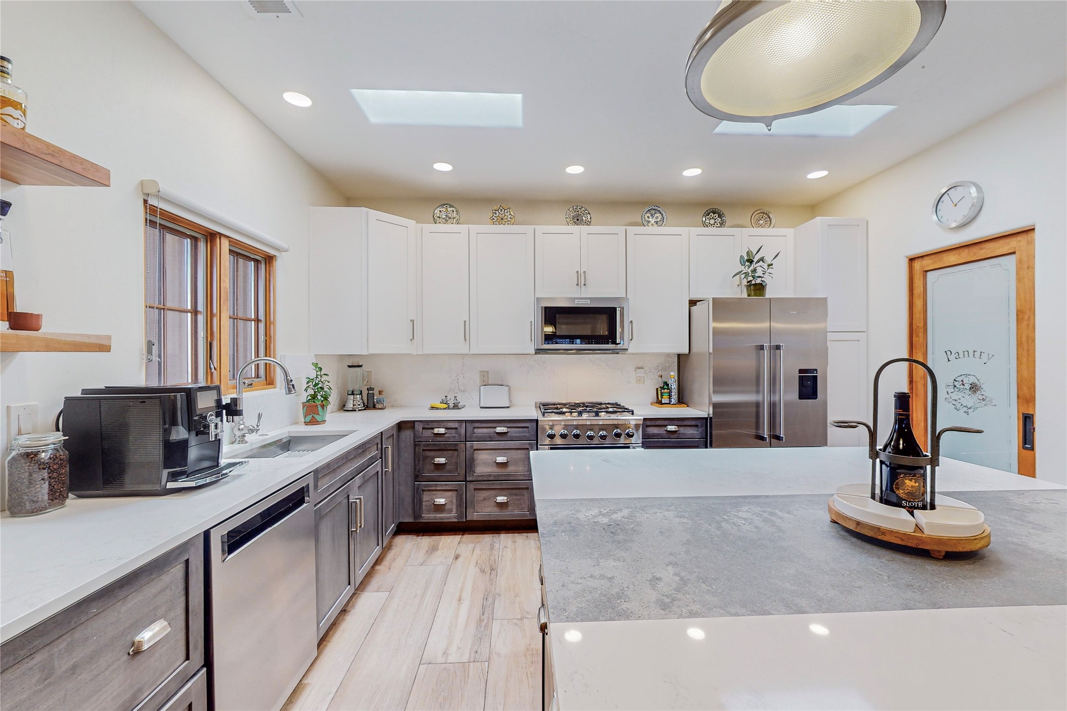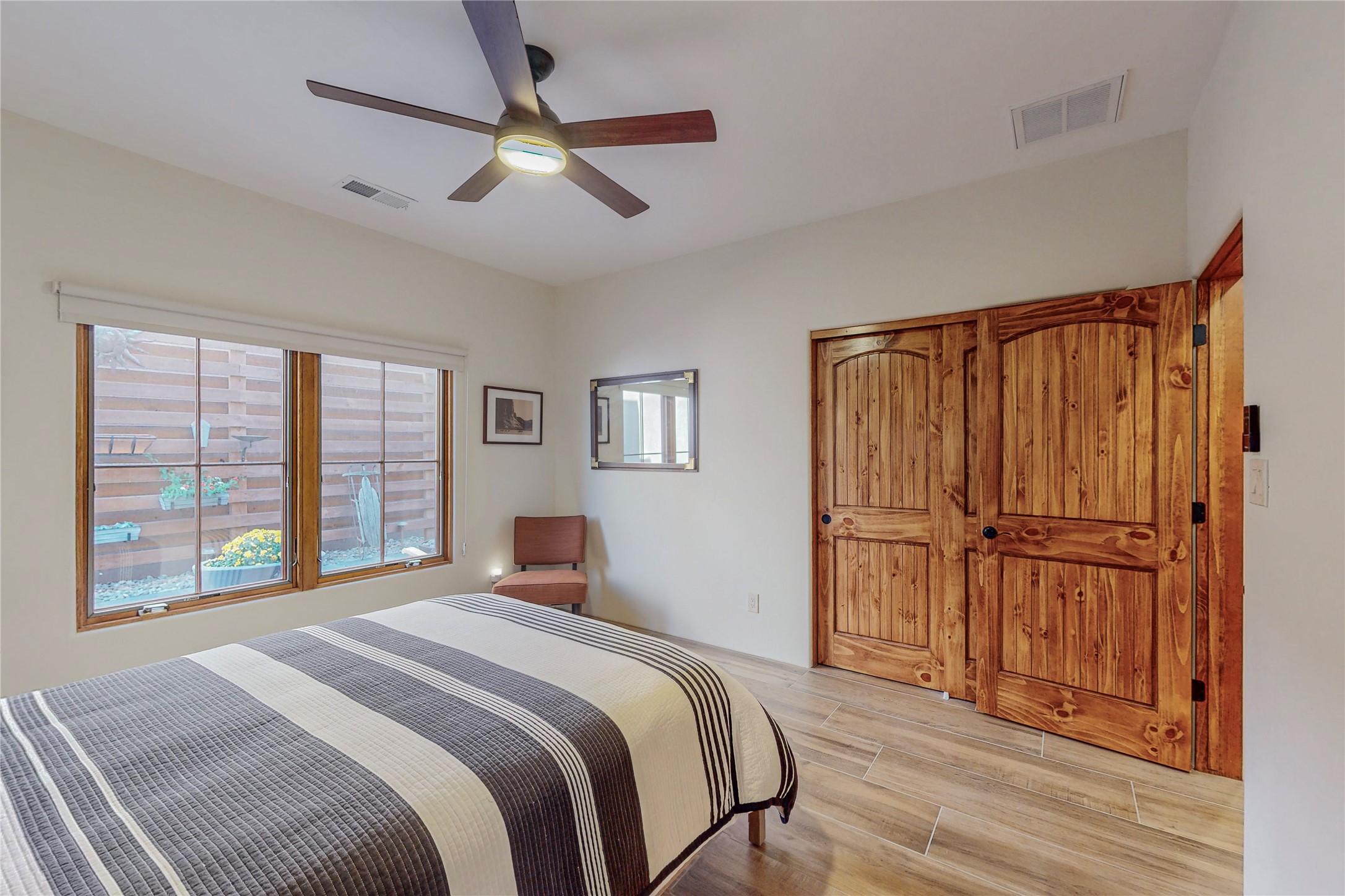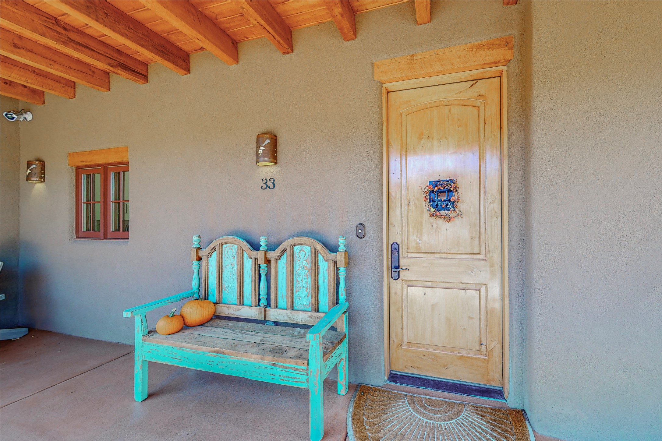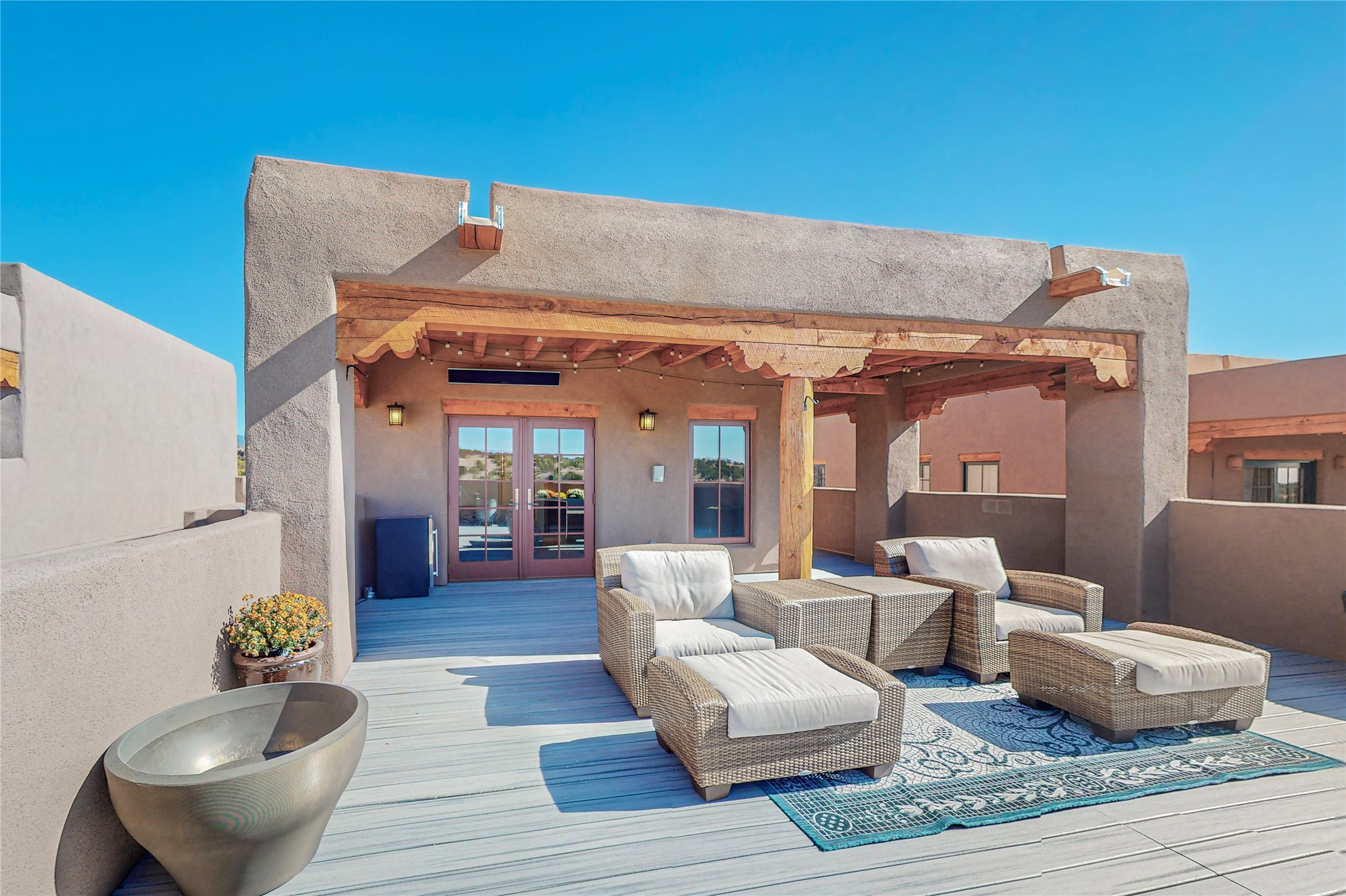 This newly built single family paito home with central heating and air conditioning, a tankless water heater, TPO roof, and energy efficient. All interior walls are insulated for better comfort and sound absorption. The owners have upgraded nearly everything. From the large plank tile flooring to the premium appliances to designer plumbing, California Closets systems, and custom cabinets. Elegant primary retreat with walk-through shower, custom California Closets, and large his and hers spaces. Entertain in your kitchen with an oversized quartz island, inviting stone paver yard, or enjoy spectacular sunsets. This home is pre-wired for home theater. The real star of the show is an expansive west facing view from the deck off of the primary bedroom with approximately 500+/-sf of Trex decking. Enjoy the monsoon storms, gorgeous sunsets, and the snow covered ridge that is protected open space. Aldea de Santa Fe is a National Wildlife Federation "Certified Wildlife Habitat Community." This is the only such designated community in New Mexico. Aldea subdivision is highly sought after for its 13 miles of trails, plus tennis, pickleball and basketball courts.